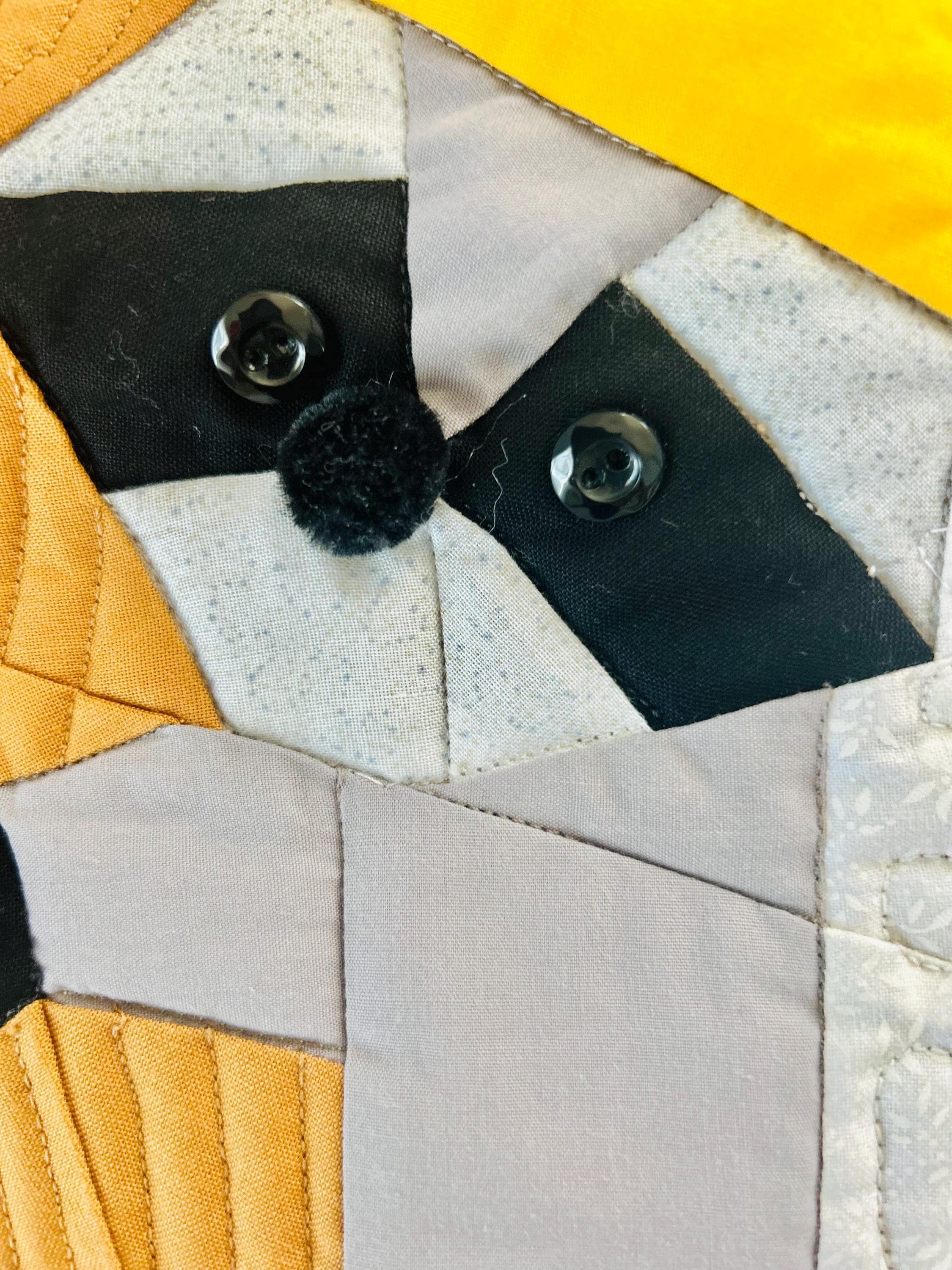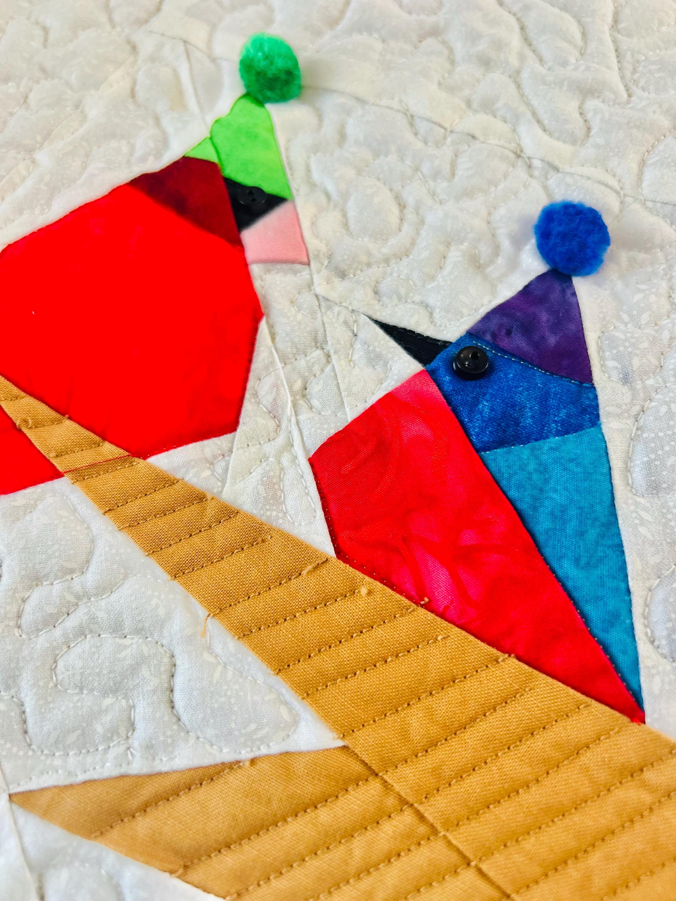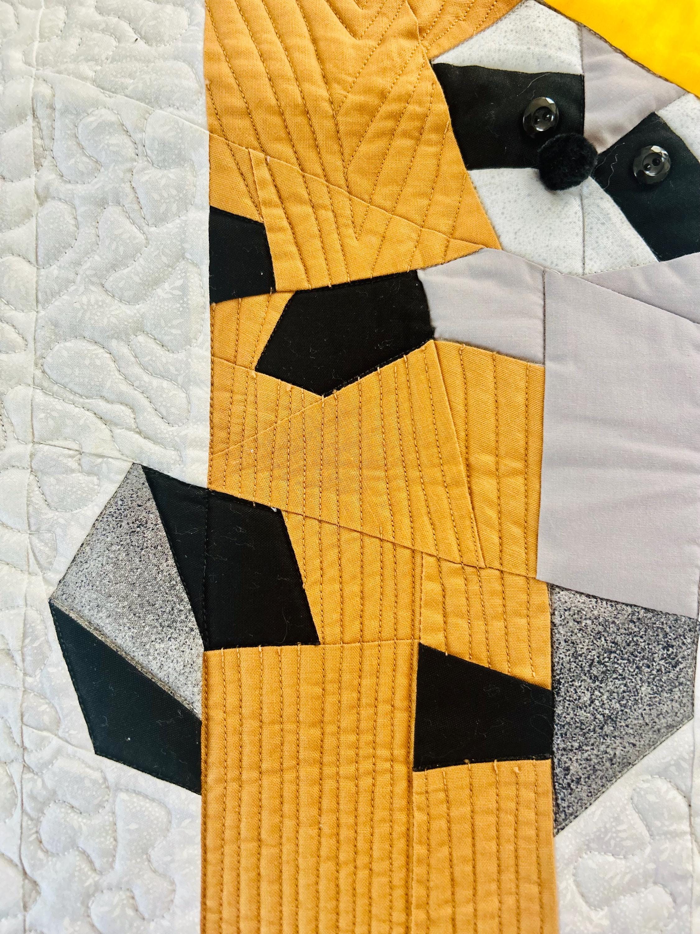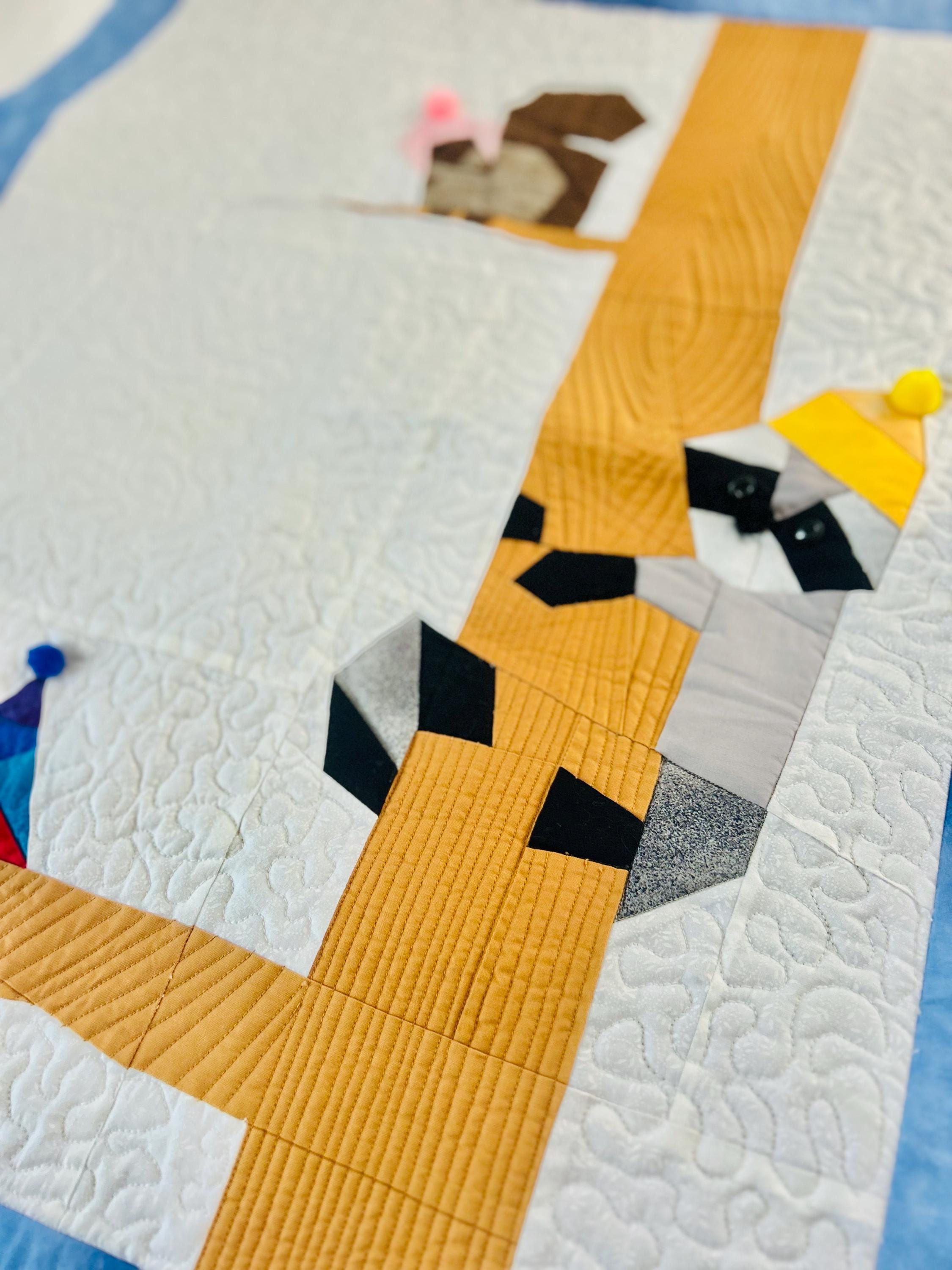 Everything about this quilt is adorable and well done, from the Raccoon, Squirrel and Cardinals with pom-pom hats and button eyes, to the intricate long-arm quilting and the realistic bark on the tree.