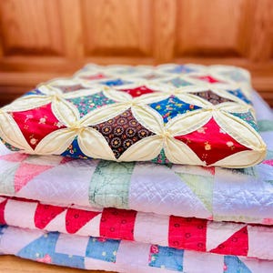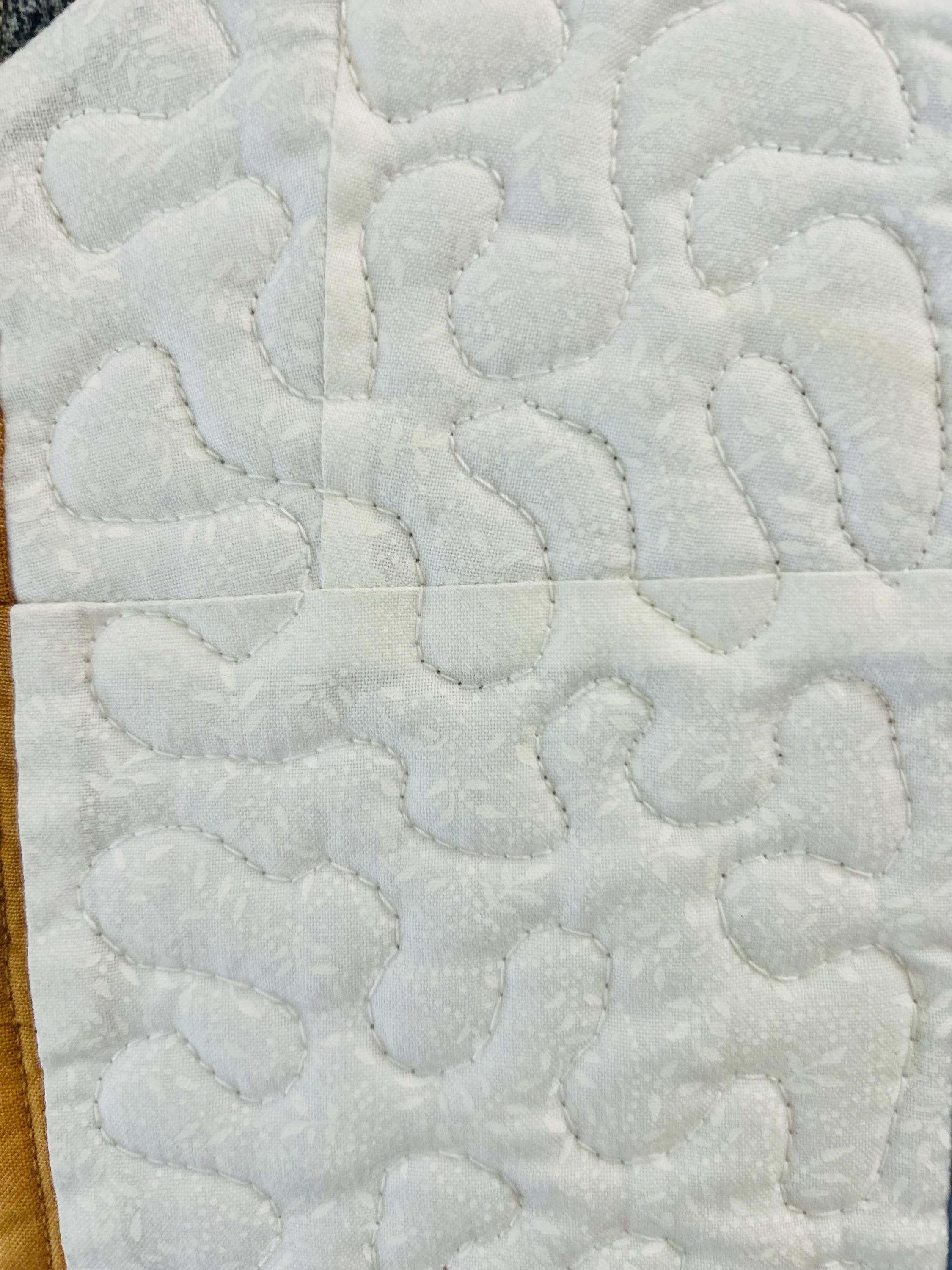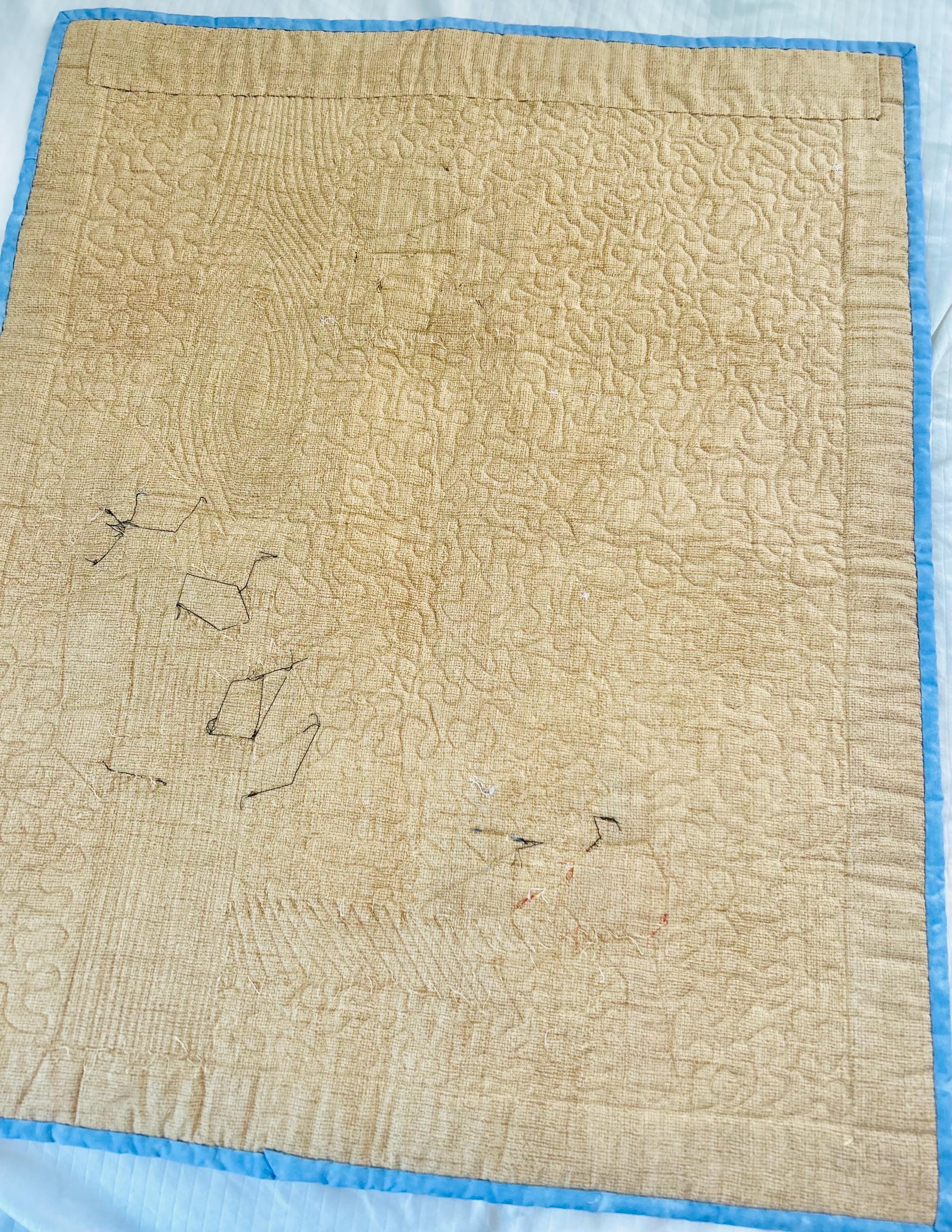 The back is a dark tan, textured cotton while the binding is blue cotton that has been machine stitched to the front and hand-stitched to the back. The batting is lightweight.