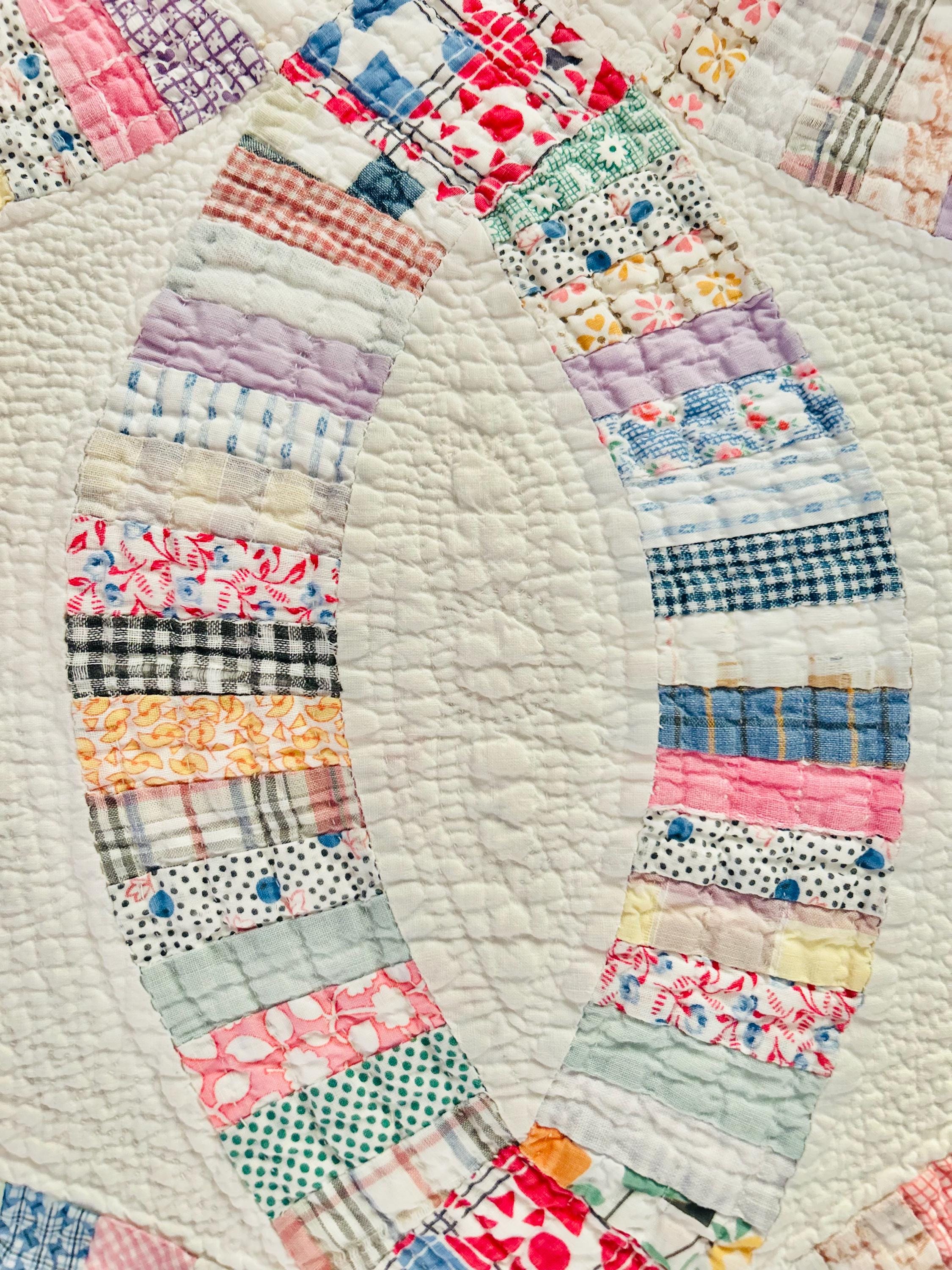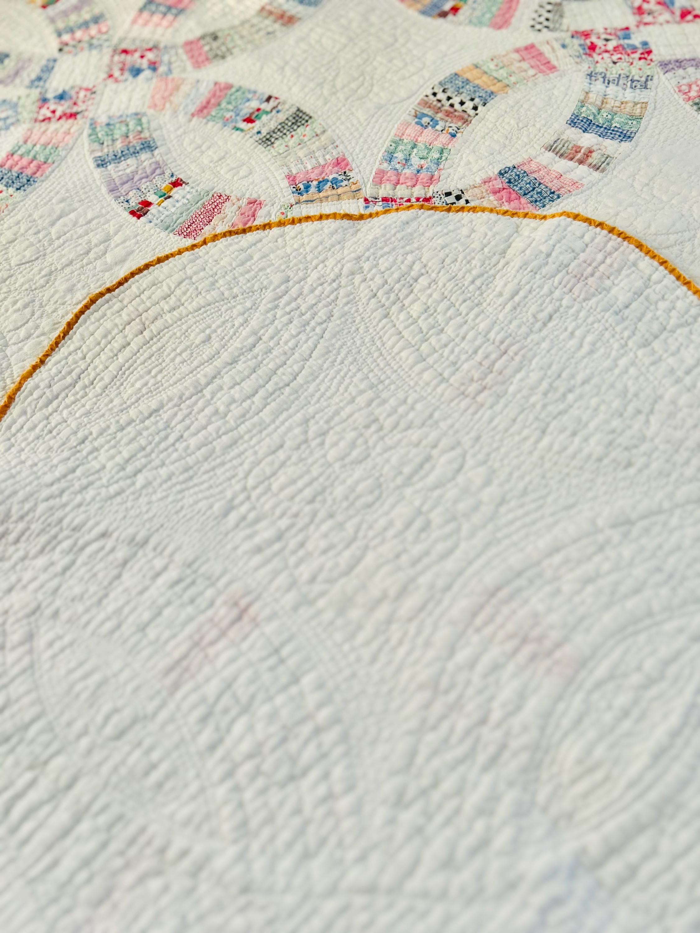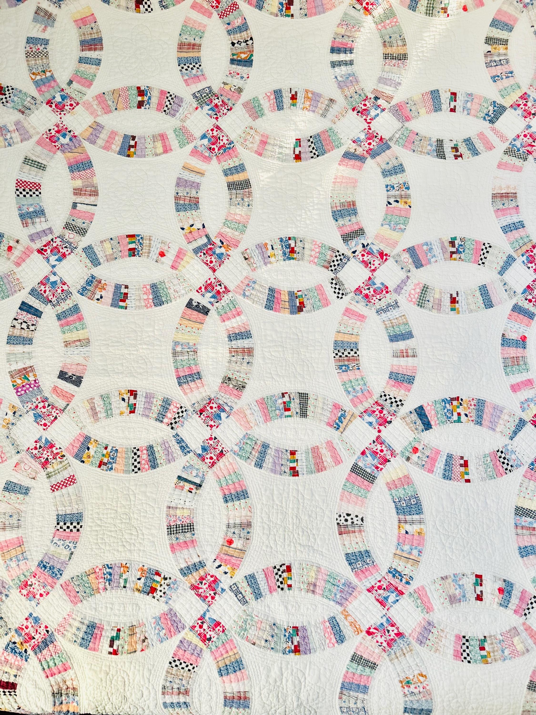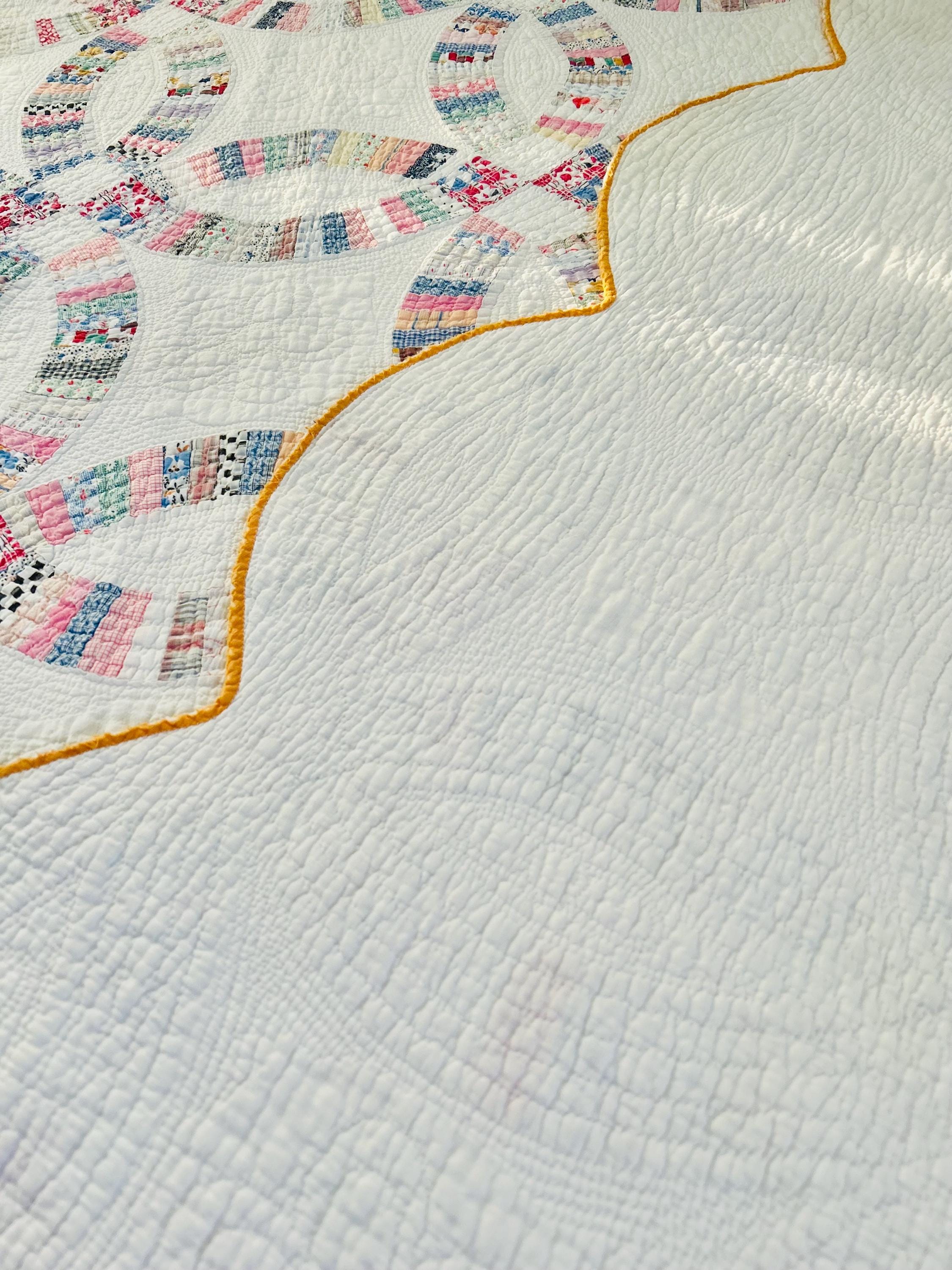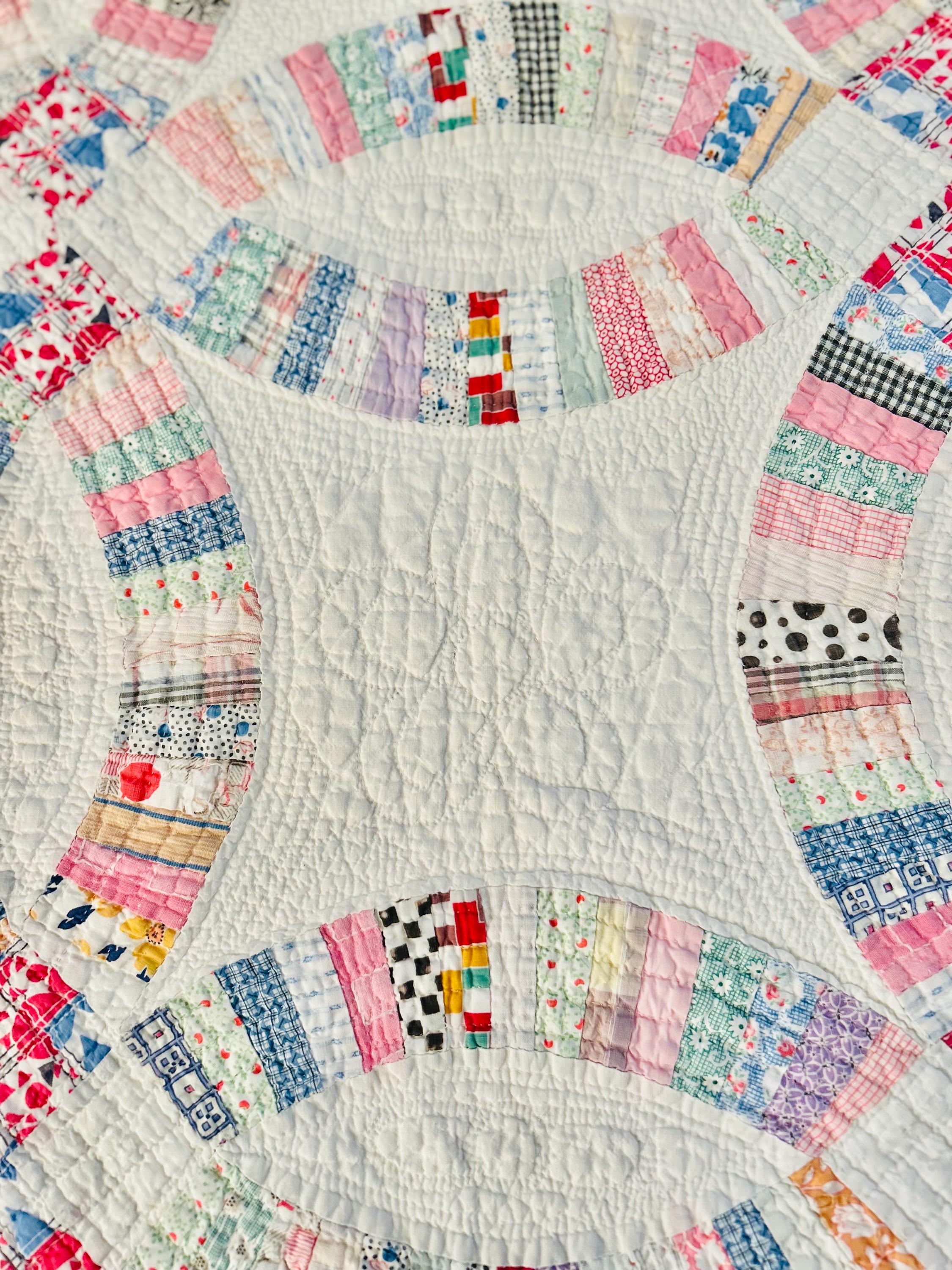 This Double Wedding Ring Quilt, circa 1930-1940, is a real beauty. The hand-quilting is so dense in some areas it is stipple quilted. The rest of the quilting is in concentric arcs through the rings and in the white areas it is in flowers and bows and in outlines of those flowers and bows.