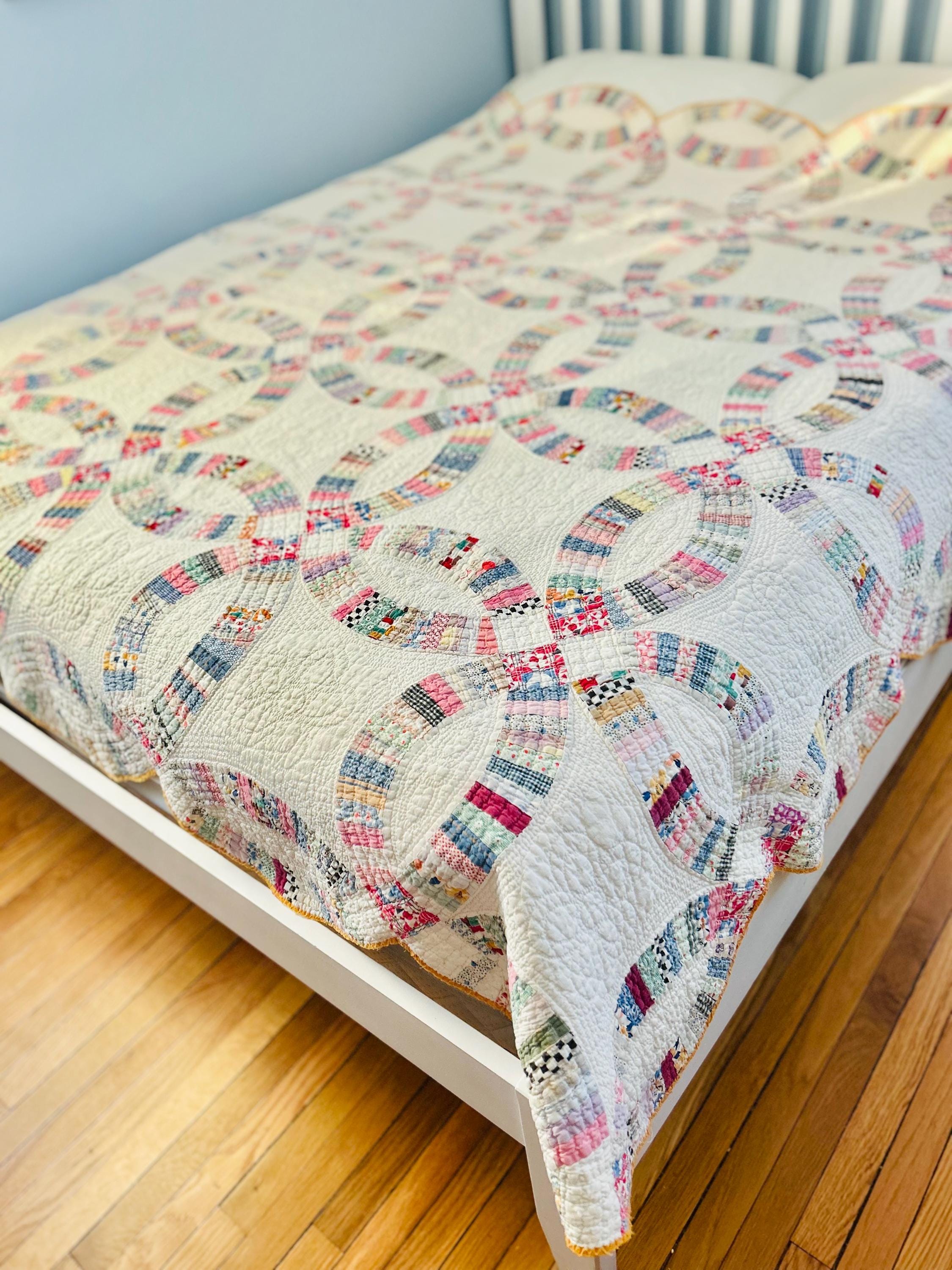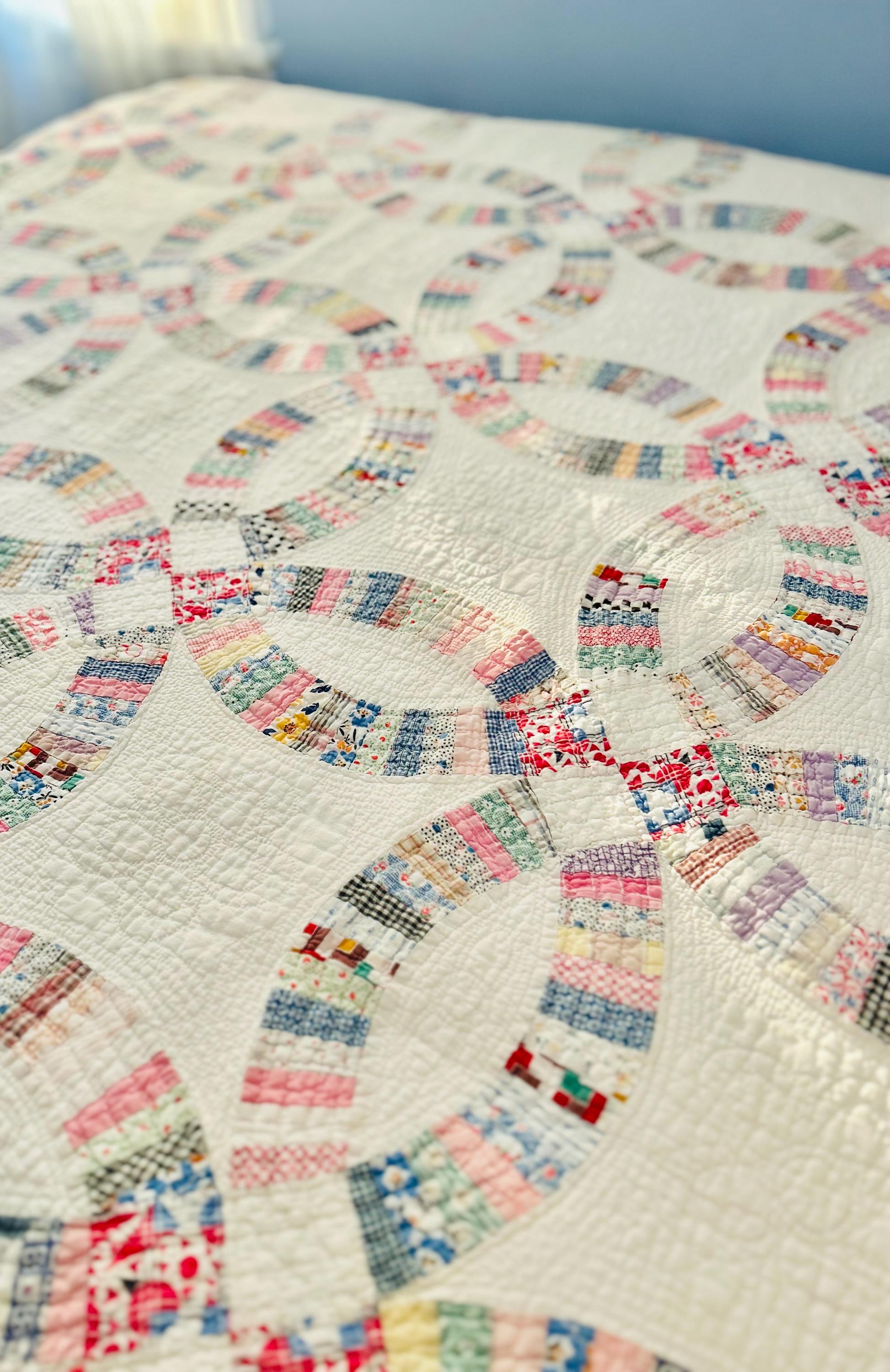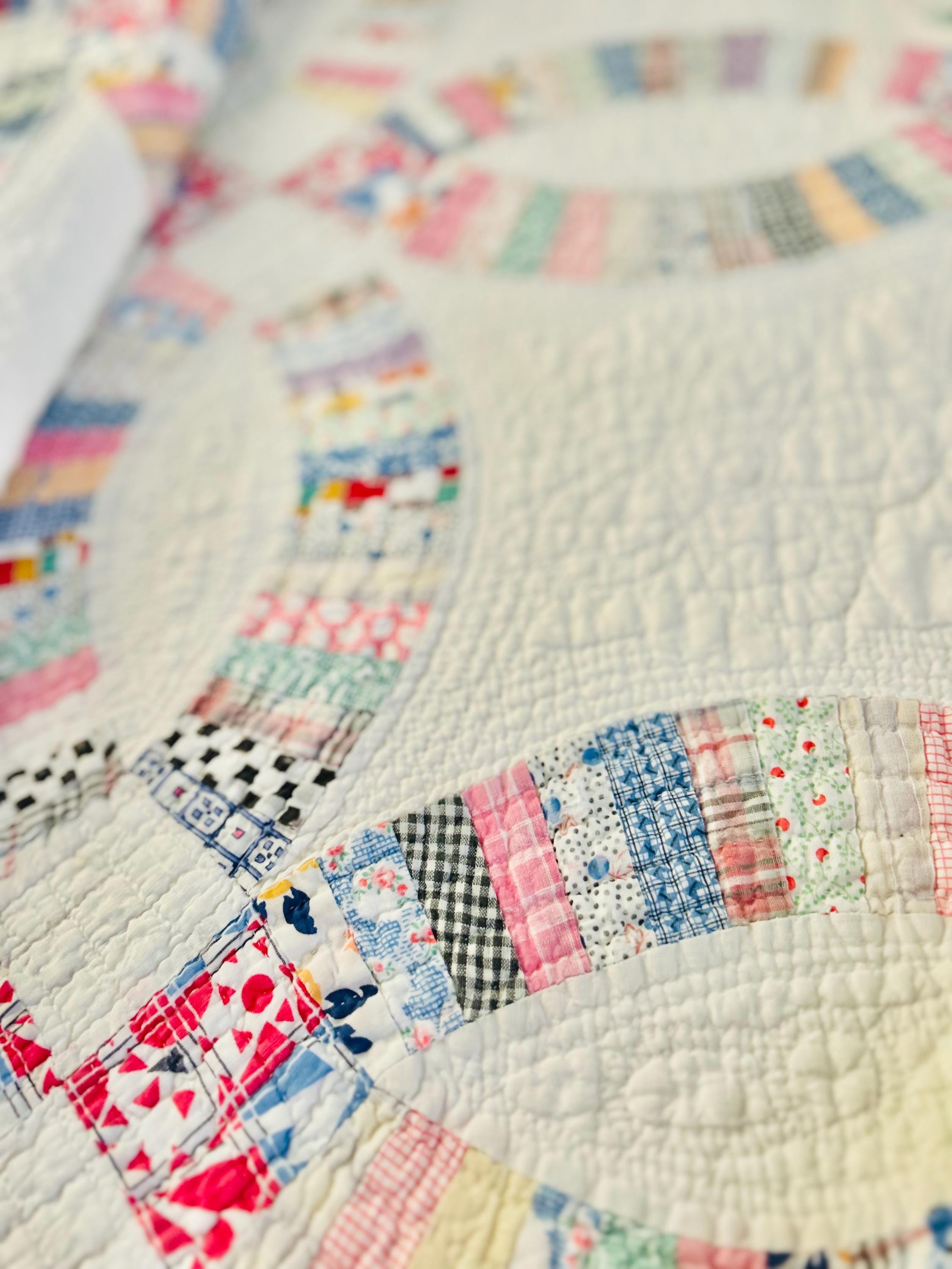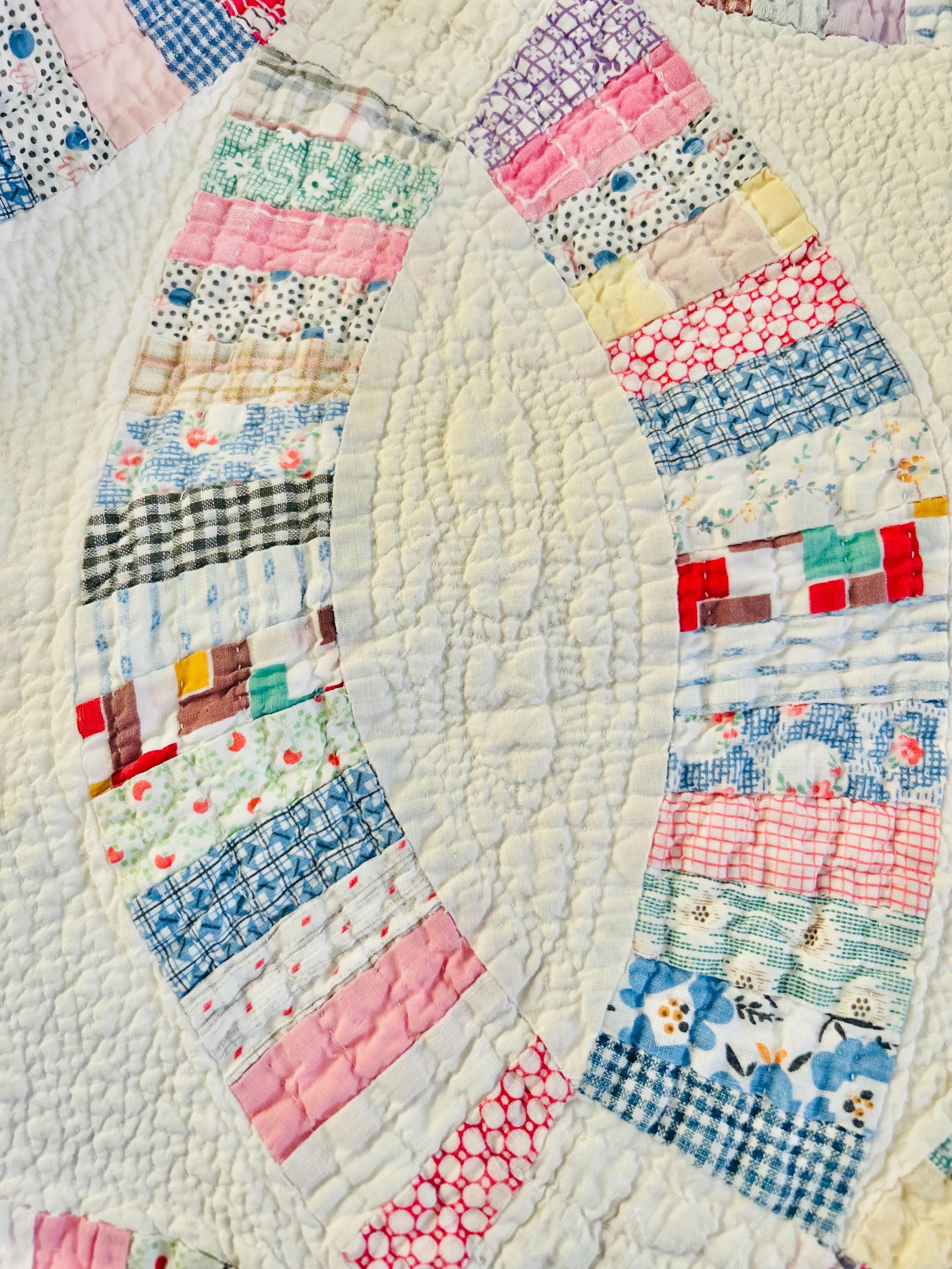 This Double Wedding Ring Quilt, circa 1930-1940, is a real beauty. The hand-quilting is so dense in some areas it is stipple quilted. The rest of the quilting is in concentric arcs through the rings and in the white areas it is in flowers and bows and in outlines of those flowers and bows.