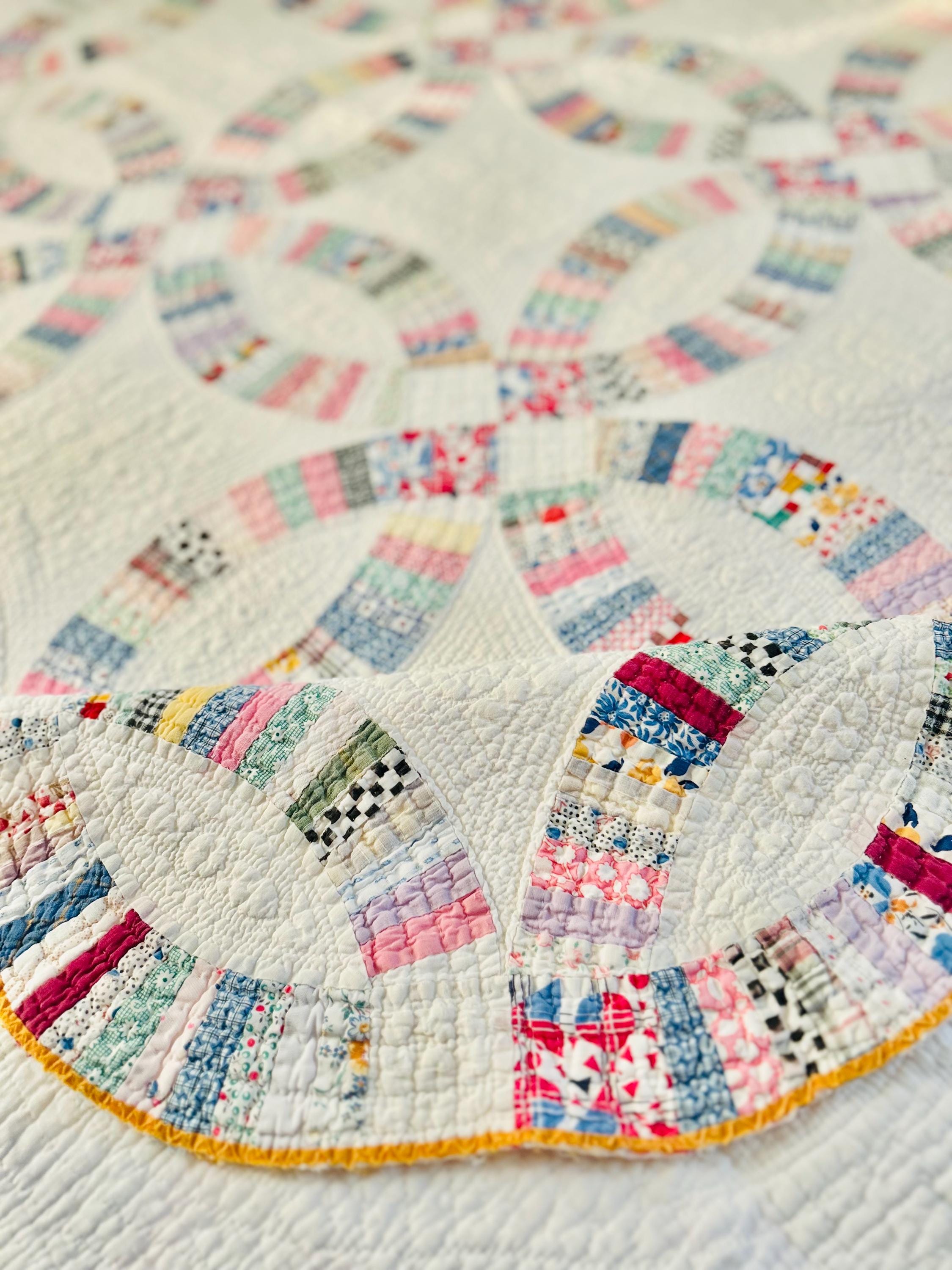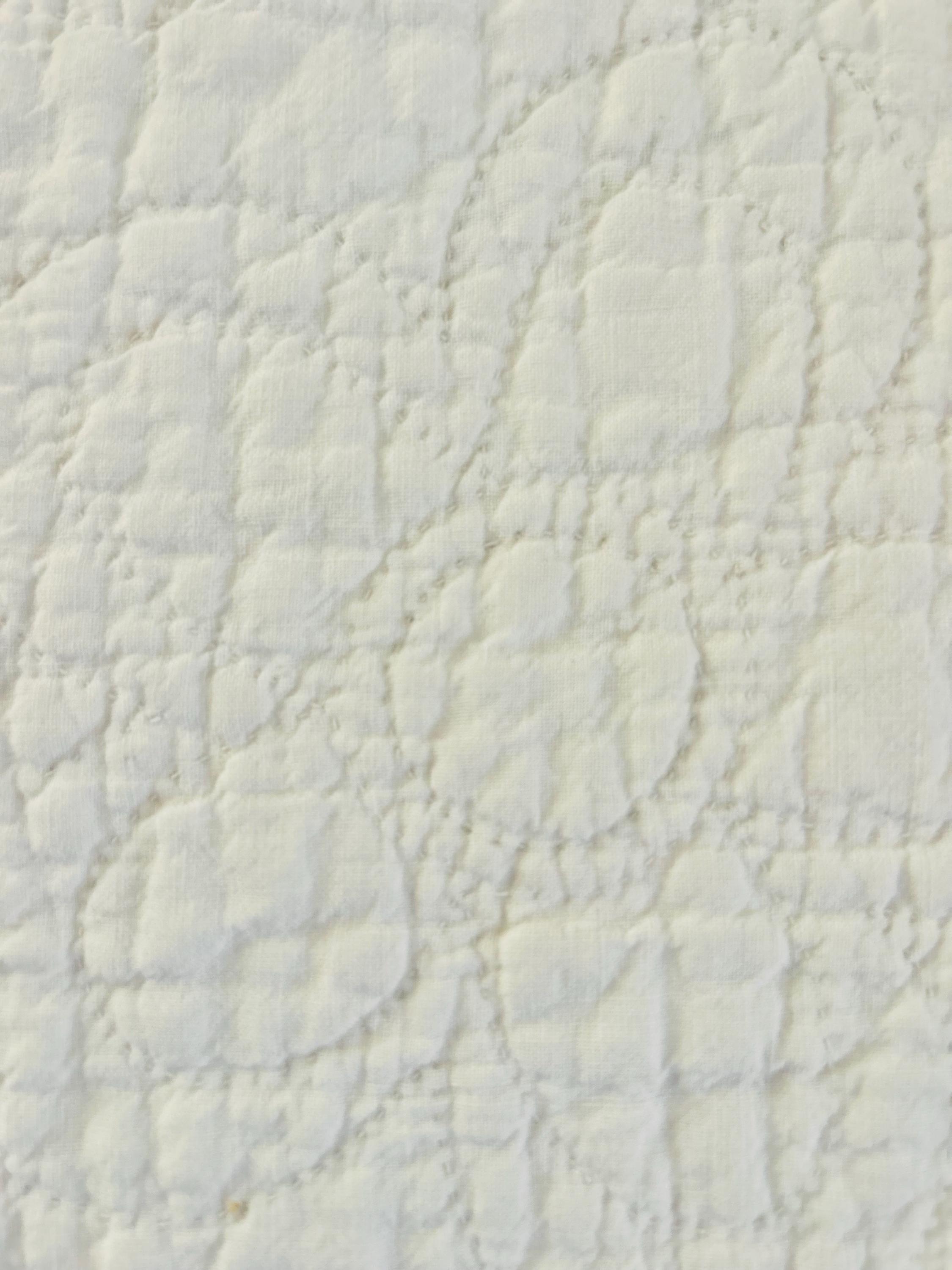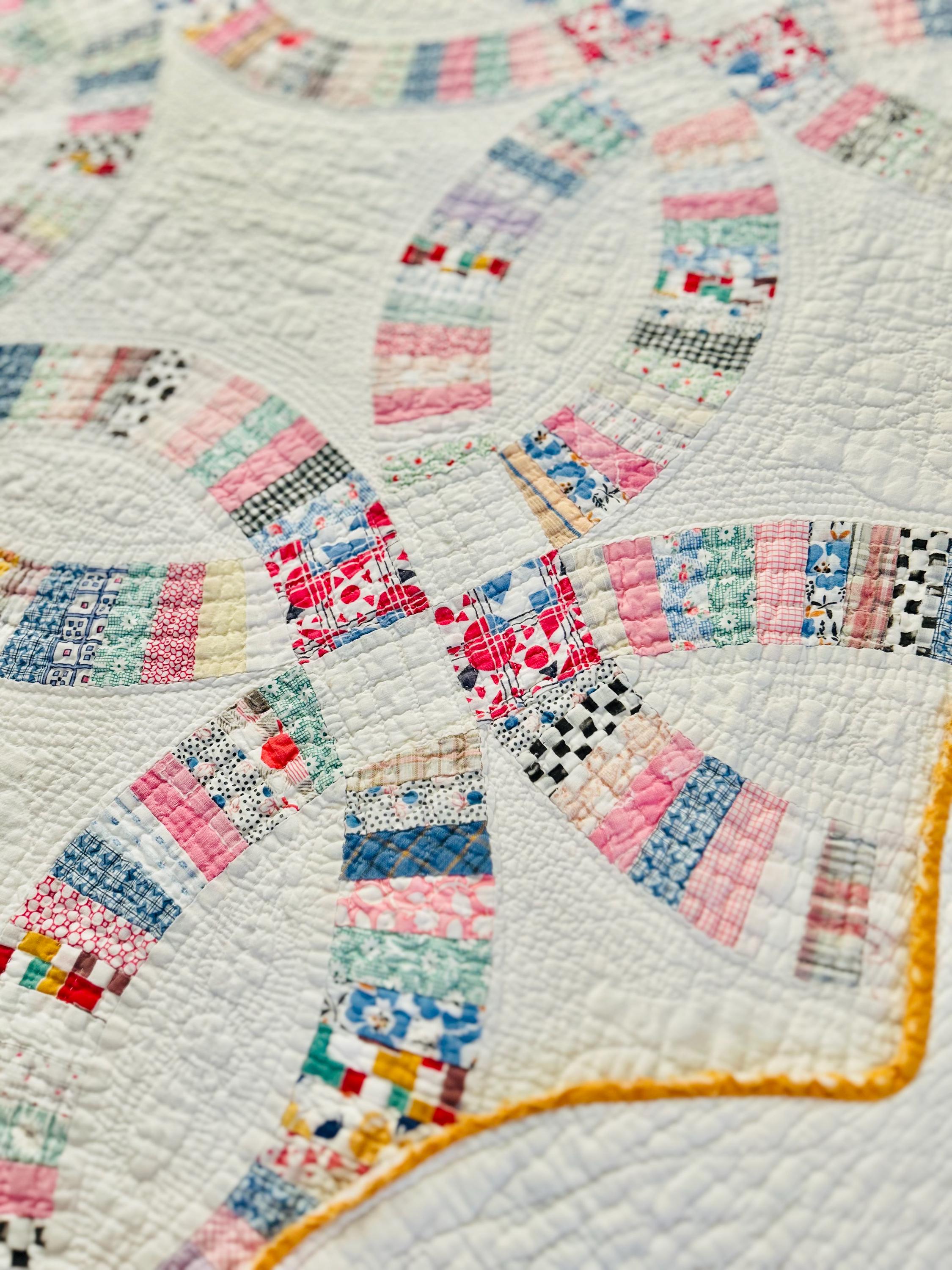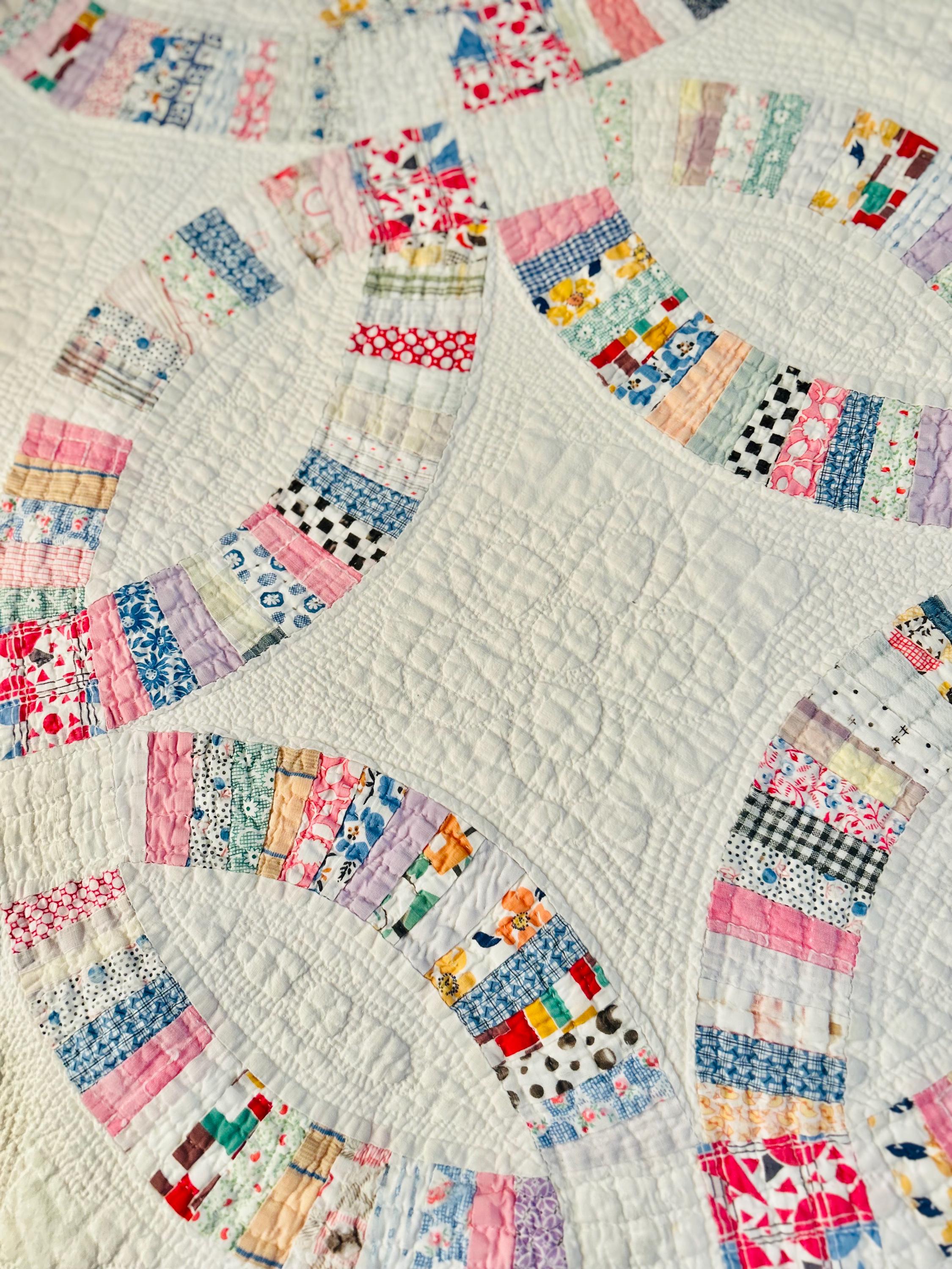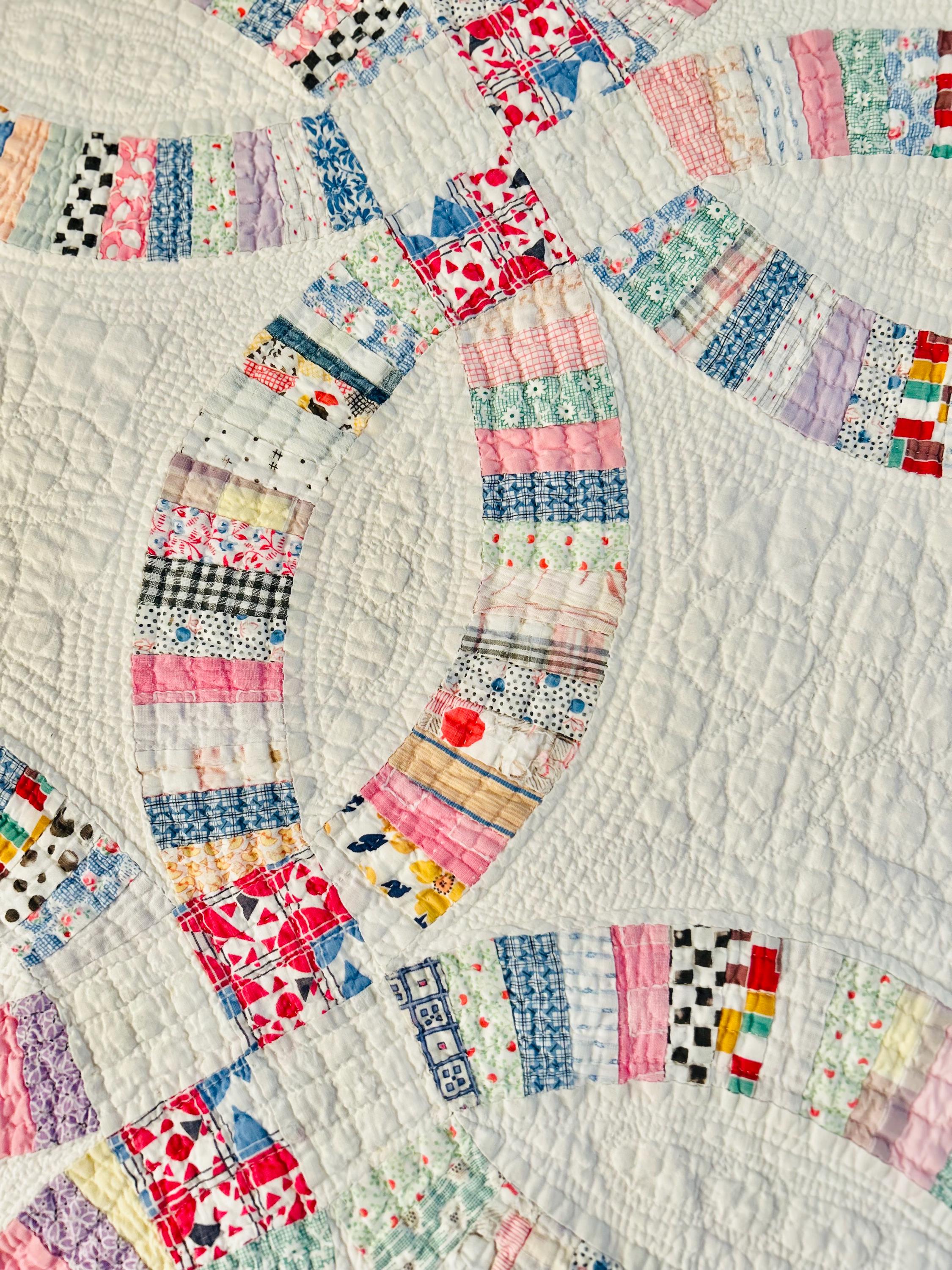 This Double Wedding Ring Quilt, circa 1930-1940, is a real beauty. The hand-quilting is so dense in some areas it is stipple quilted. The rest of the quilting is in concentric arcs through the rings and in the white areas it is in flowers and bows and in outlines of those flowers and bows.