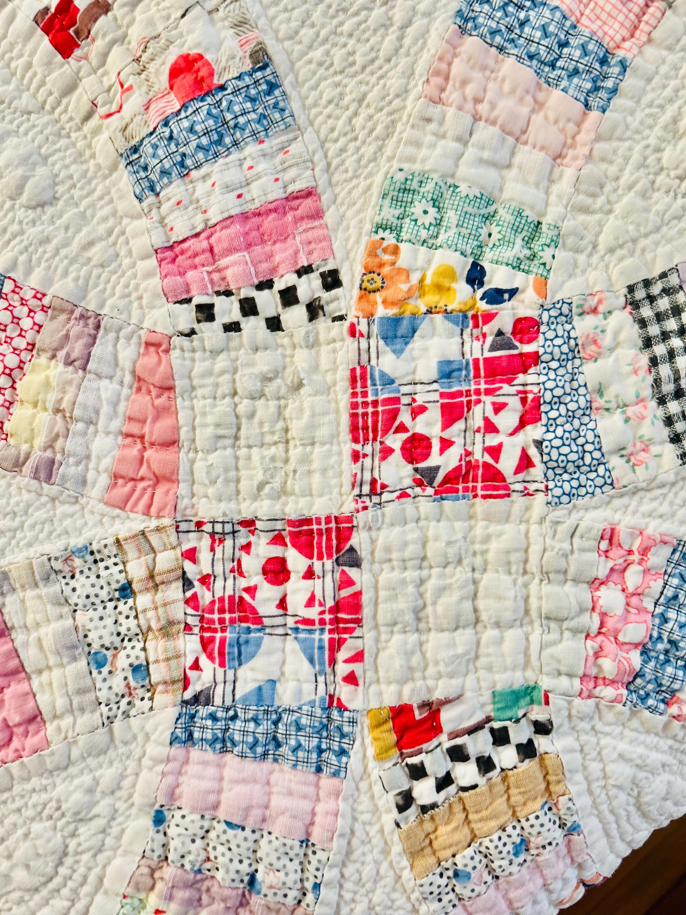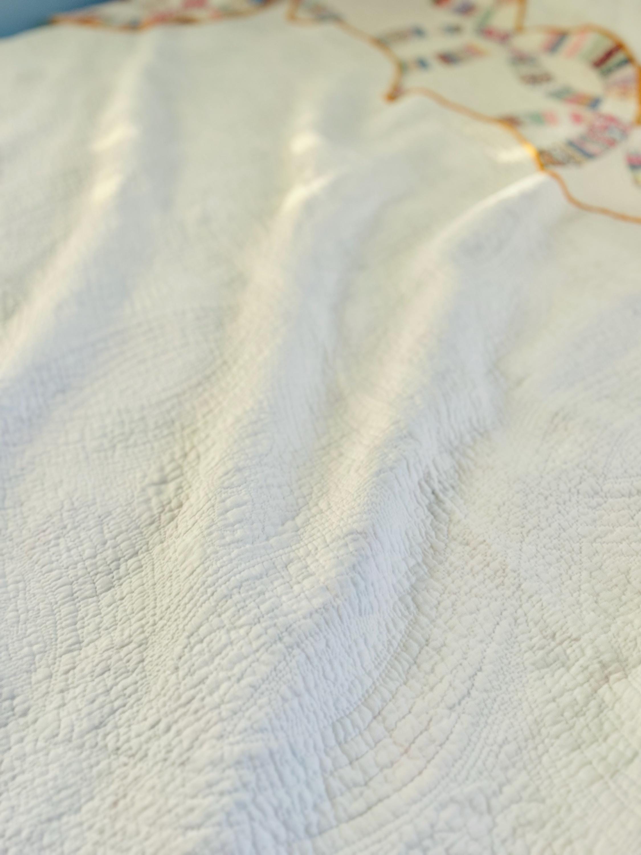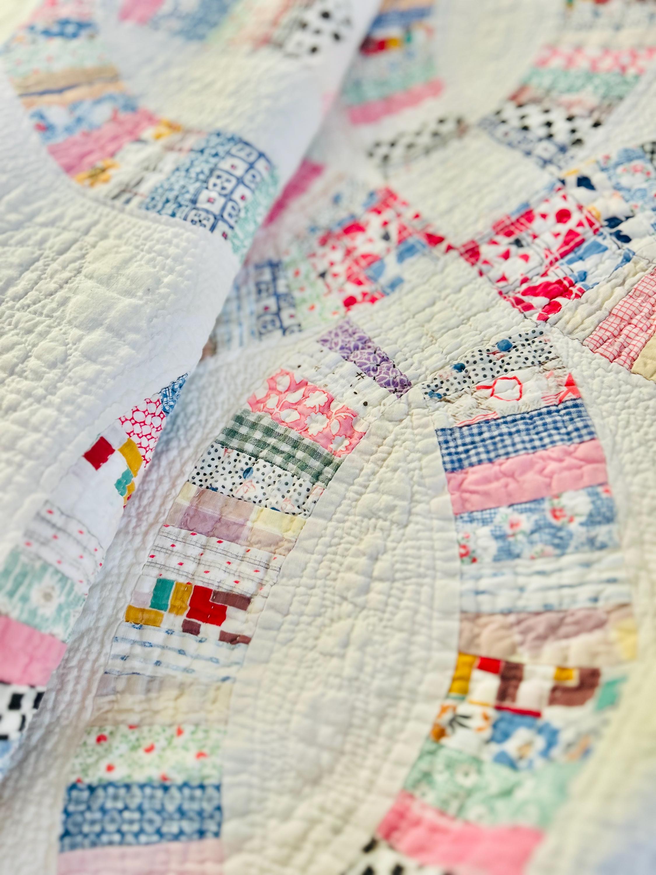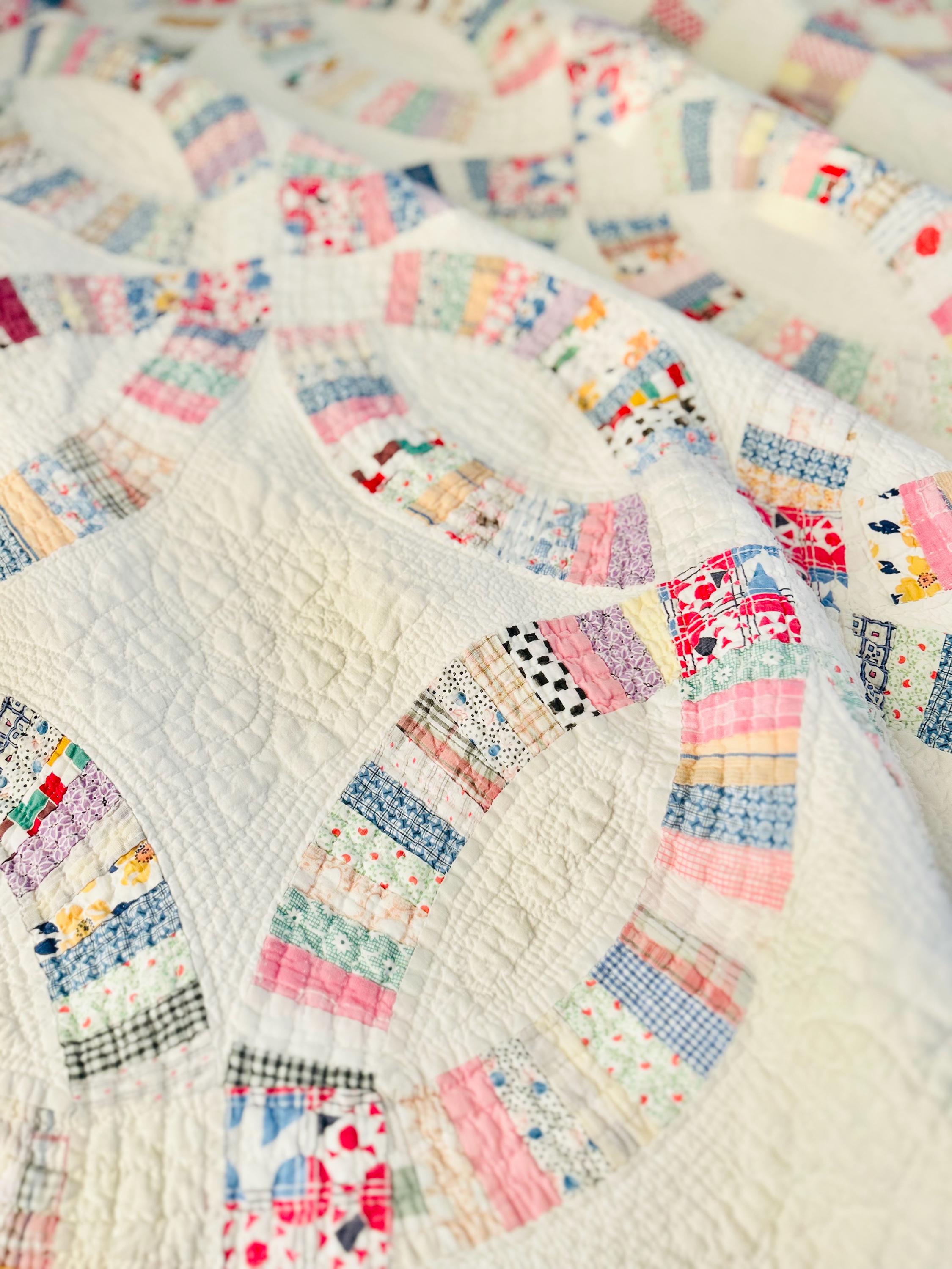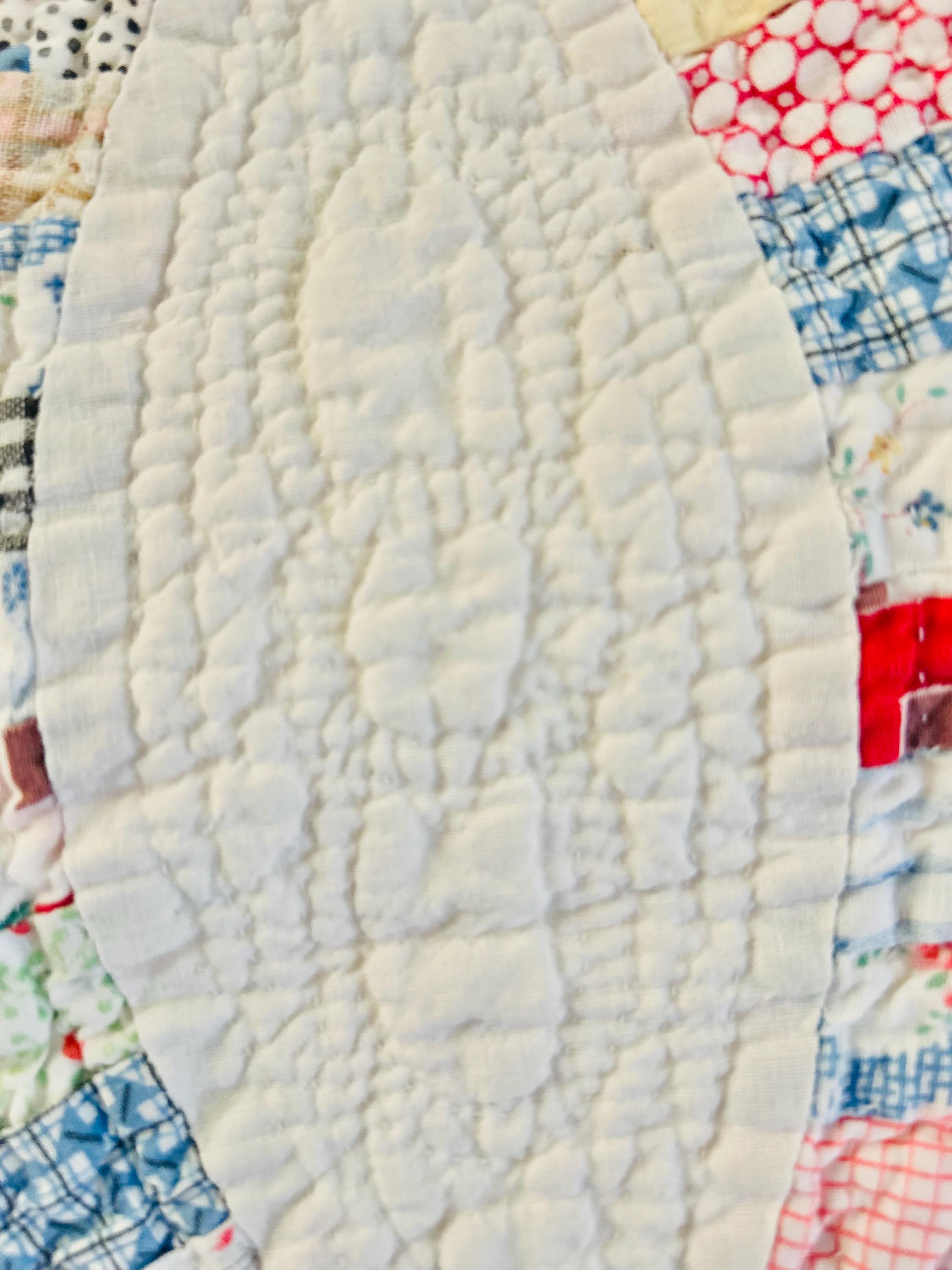 This Double Wedding Ring Quilt, circa 1930-1940, is a real beauty. The hand-quilting is so dense in some areas it is stipple quilted. The rest of the quilting is in concentric arcs through the rings and in the white areas it is in flowers and bows and in outlines of those flowers and bows.