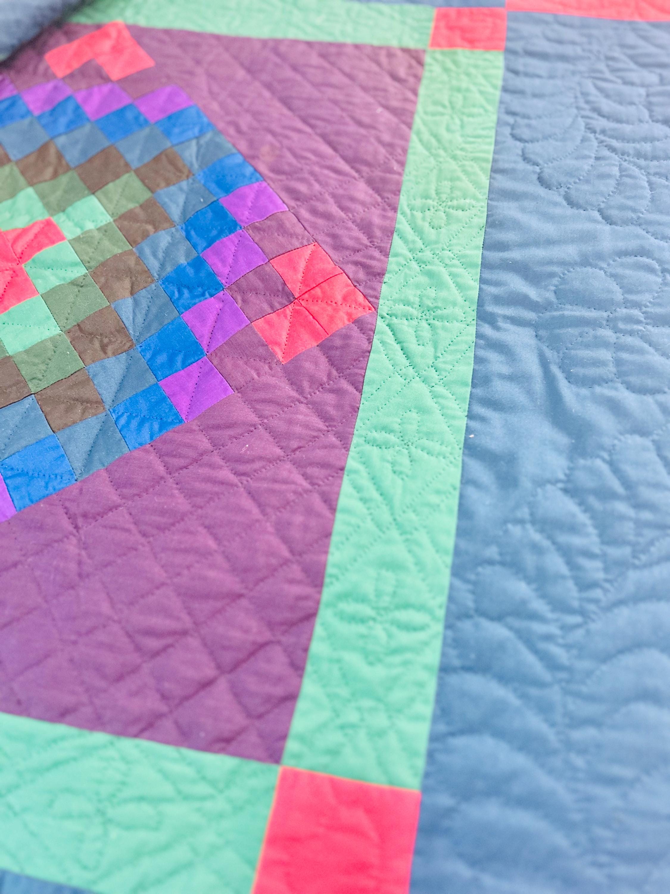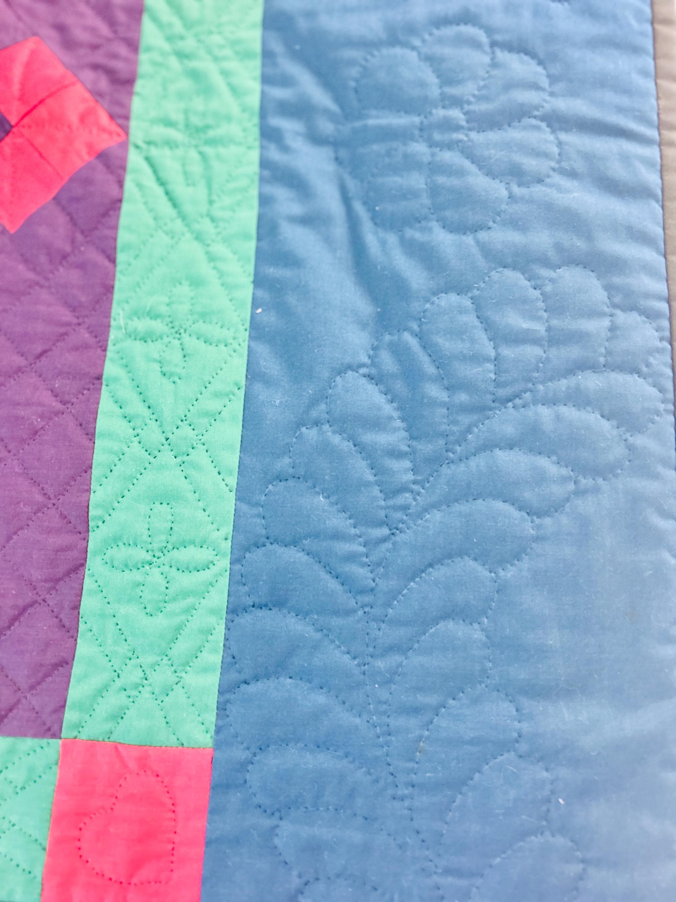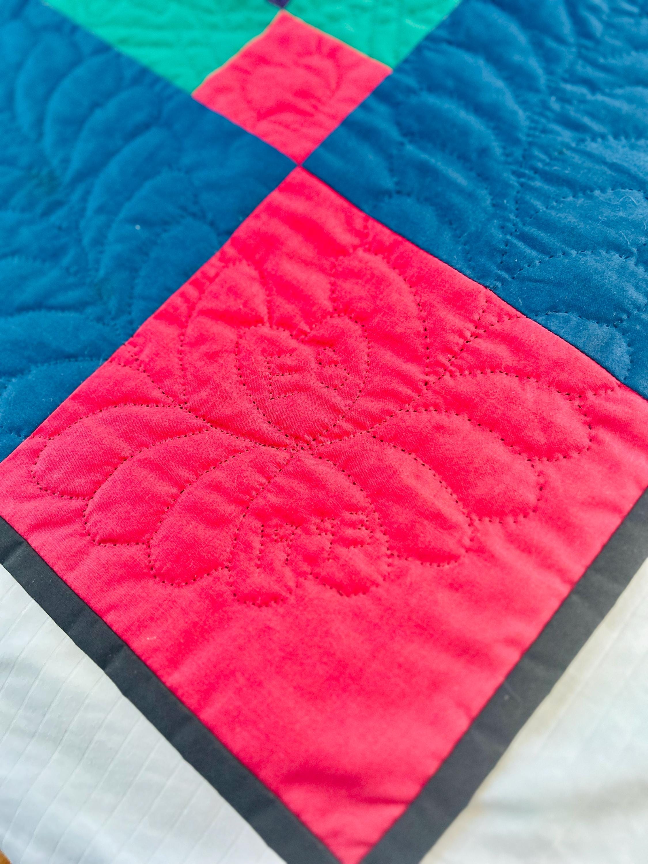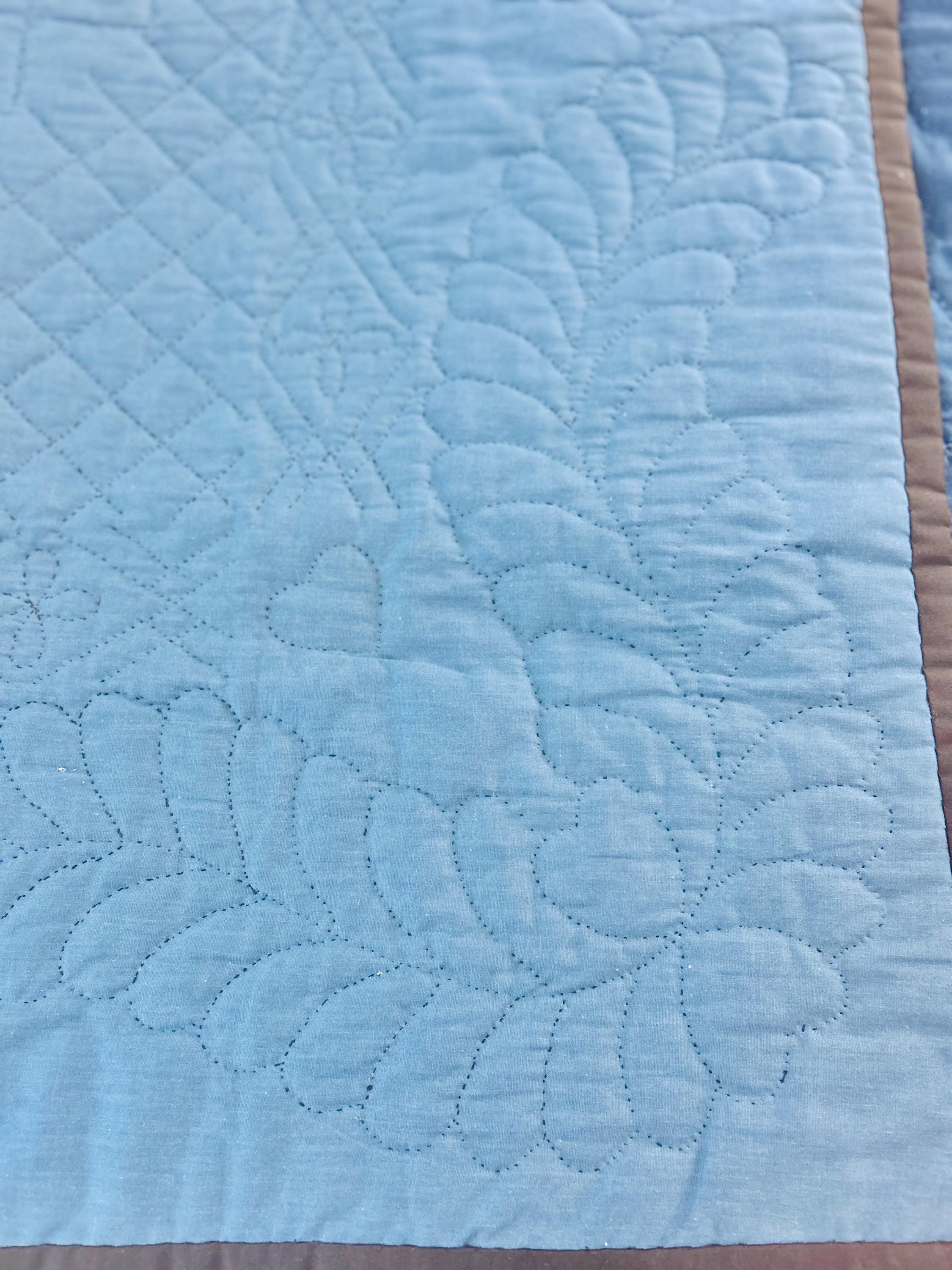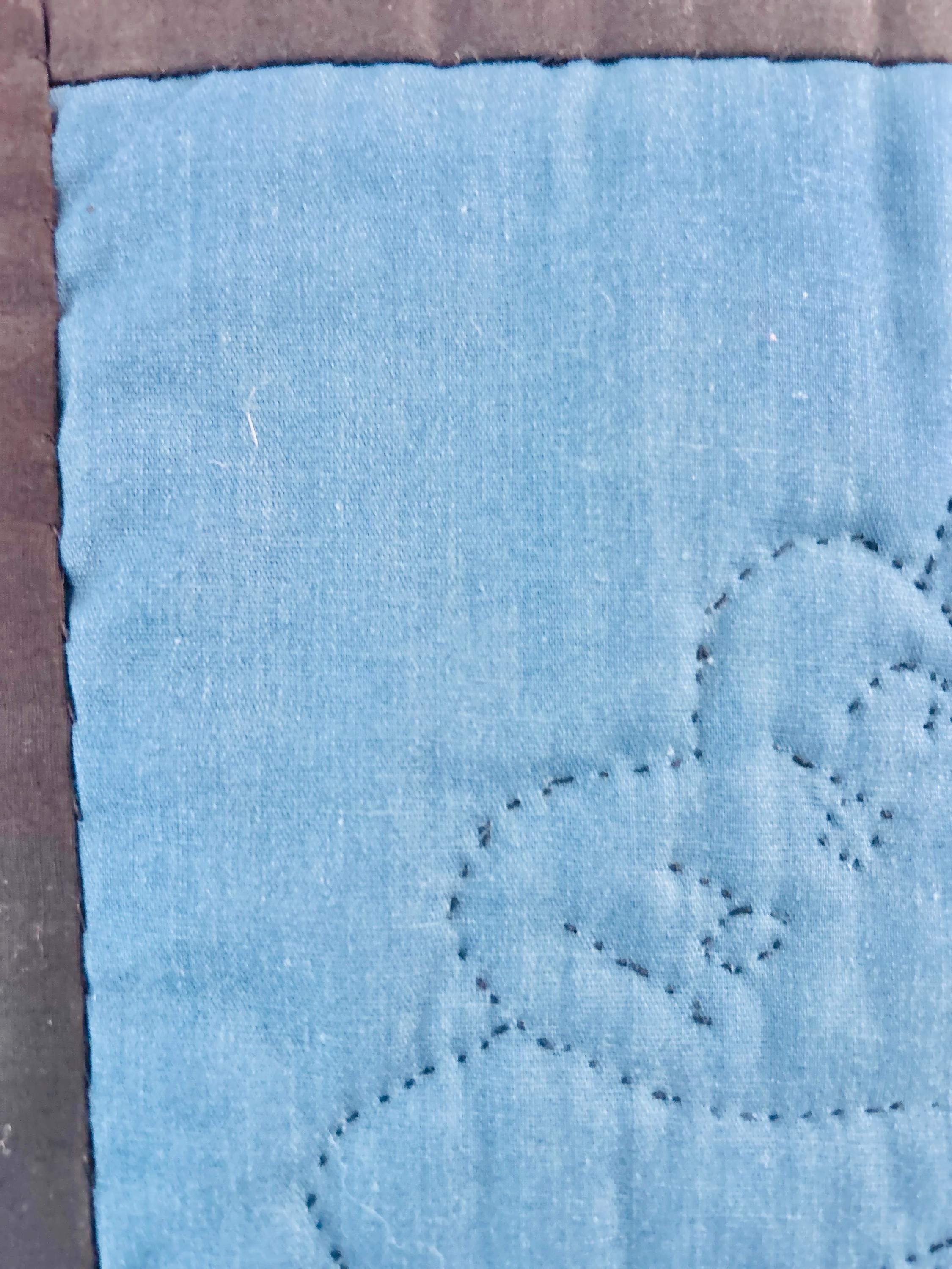 The back is a utility blue cotton which highlights the black quilting stitches, while the binding is black cotton that has been hand-stitched to both sides. The batting is lightweight.