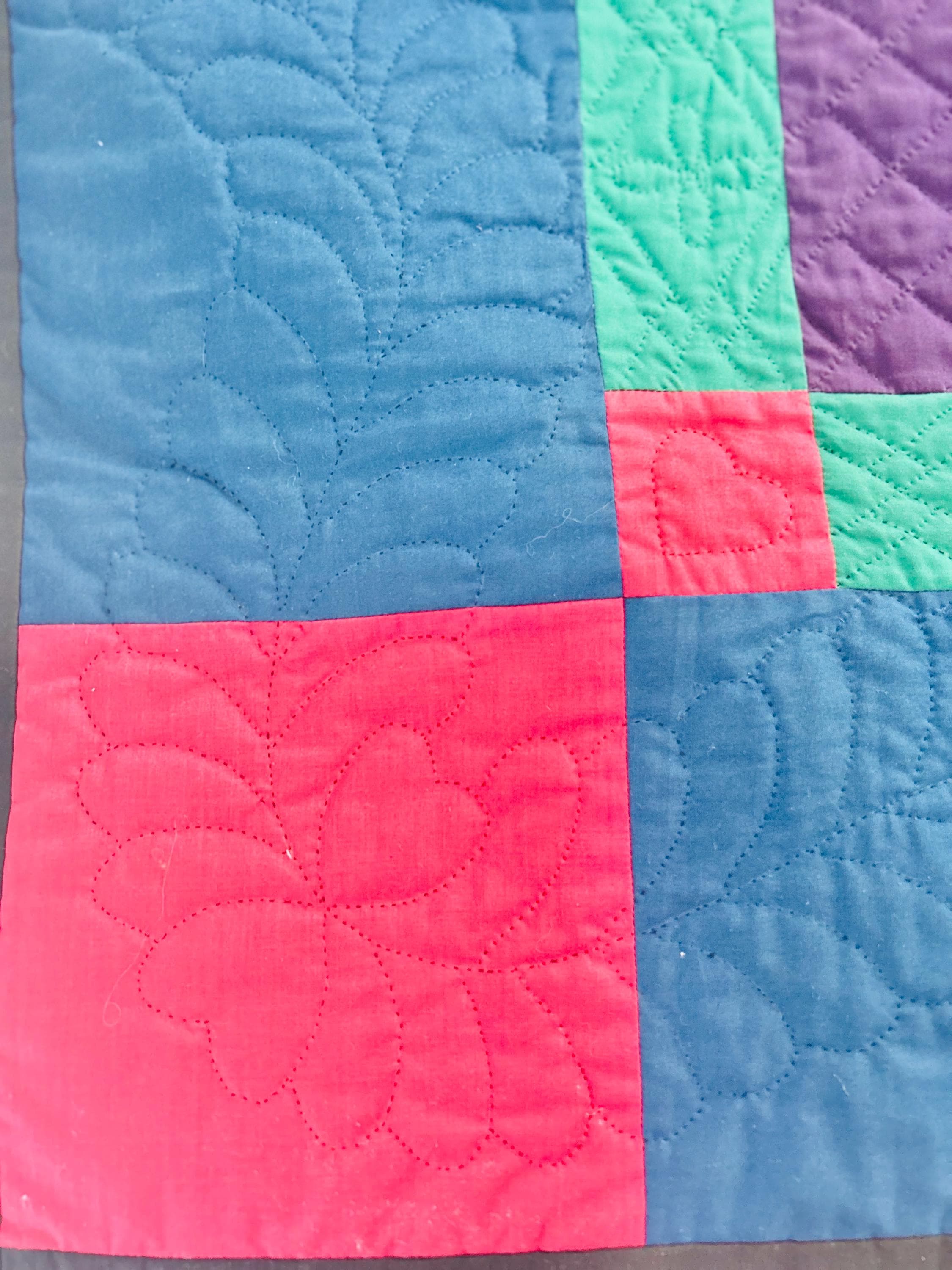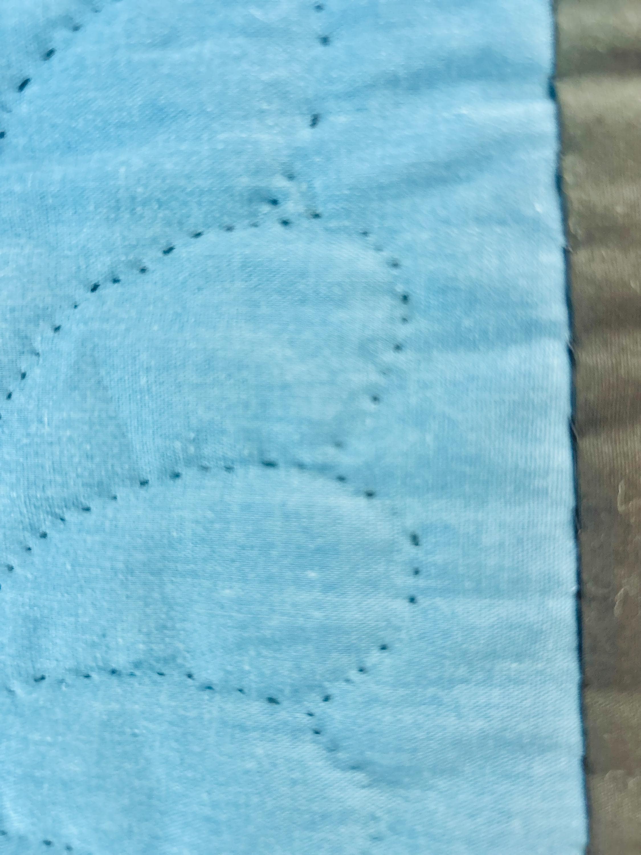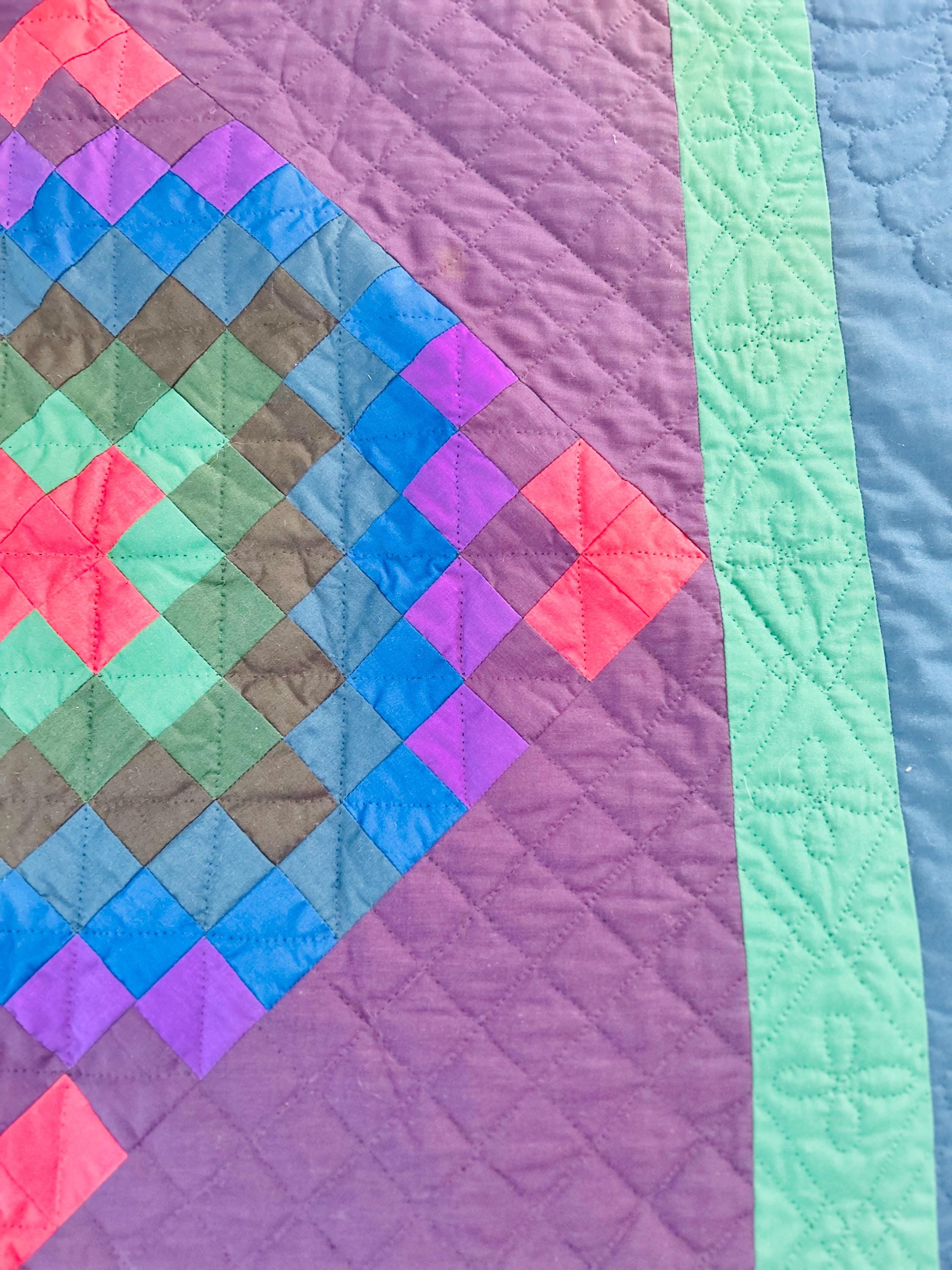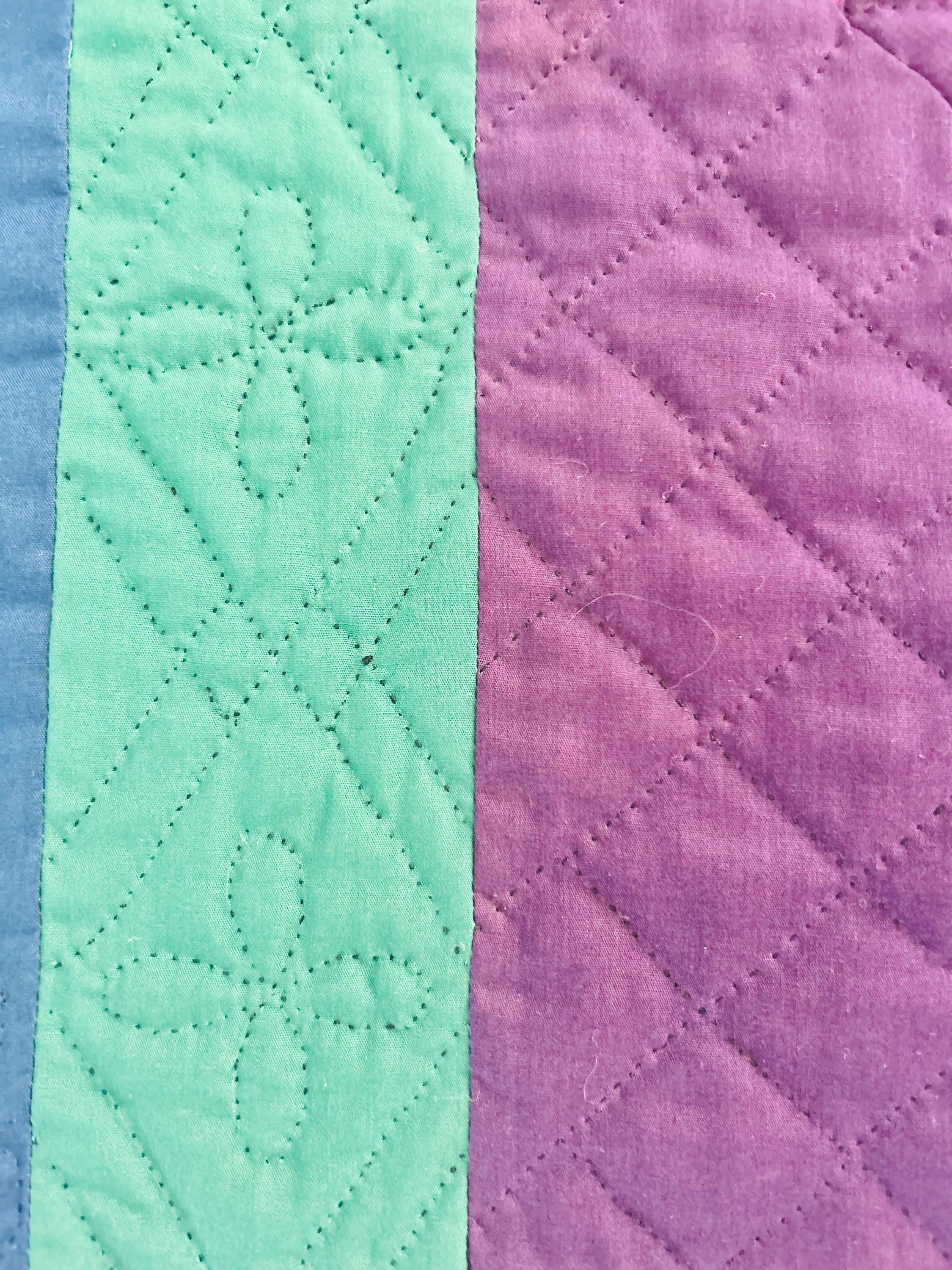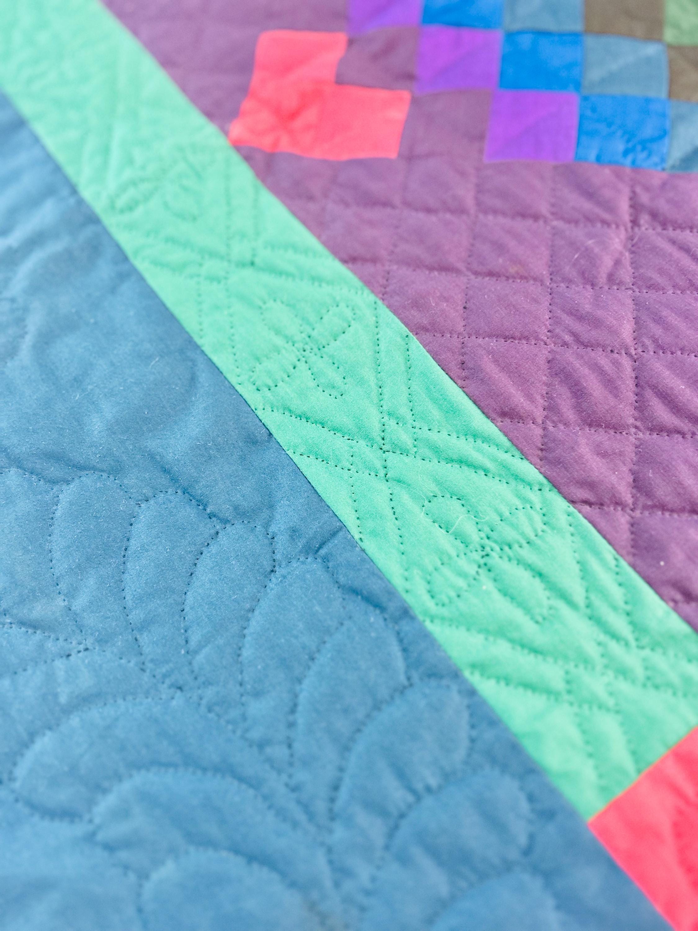 The back is a utility blue cotton which highlights the black quilting stitches, while the binding is black cotton that has been hand-stitched to both sides. The batting is lightweight.