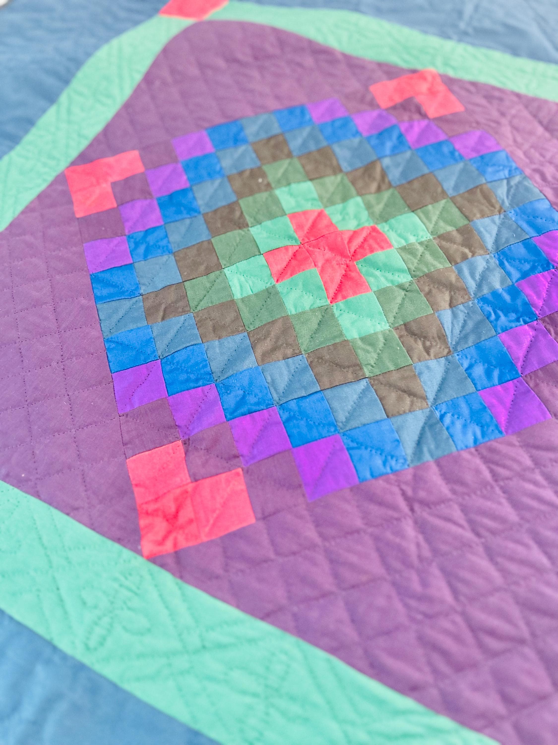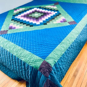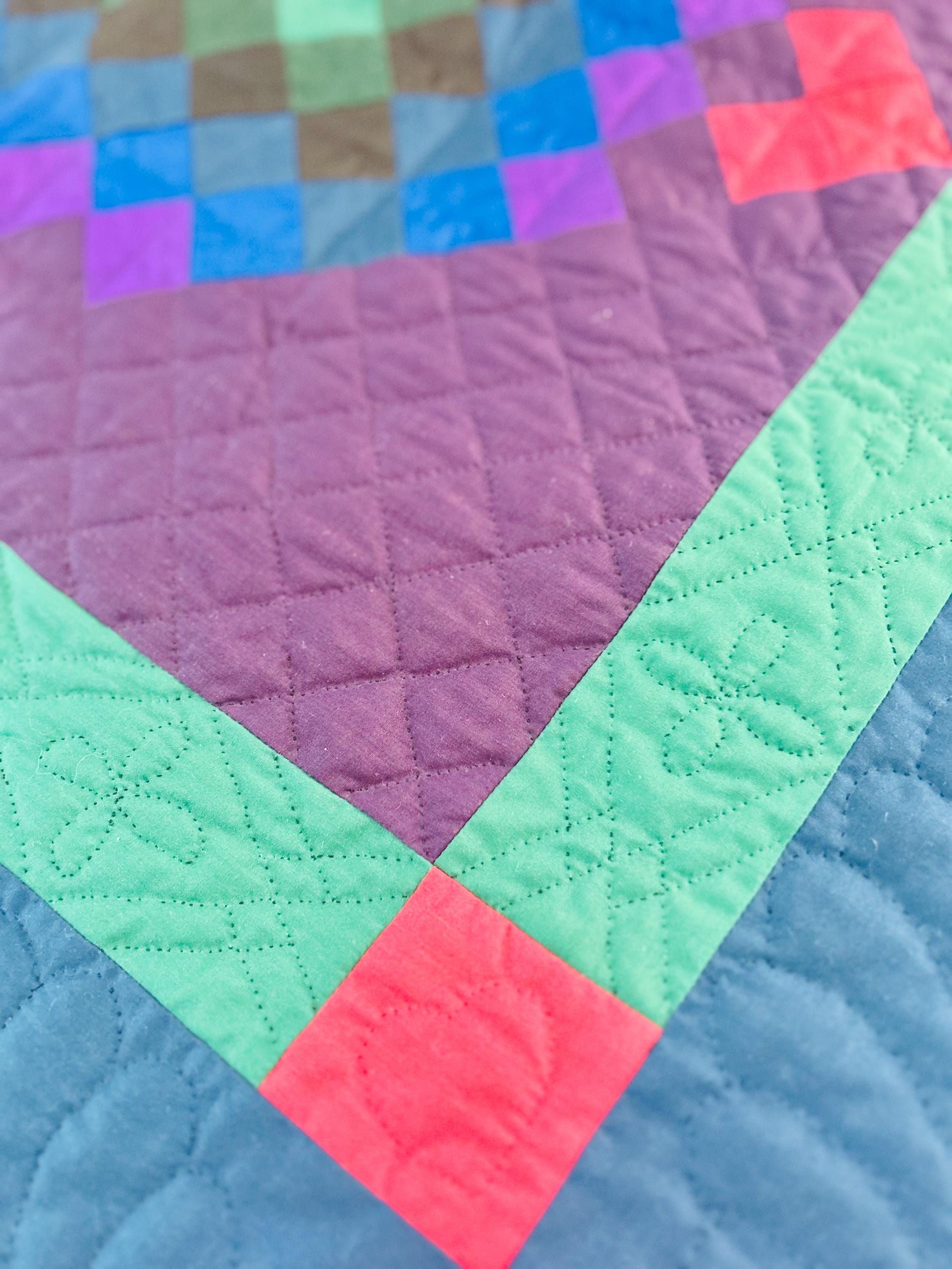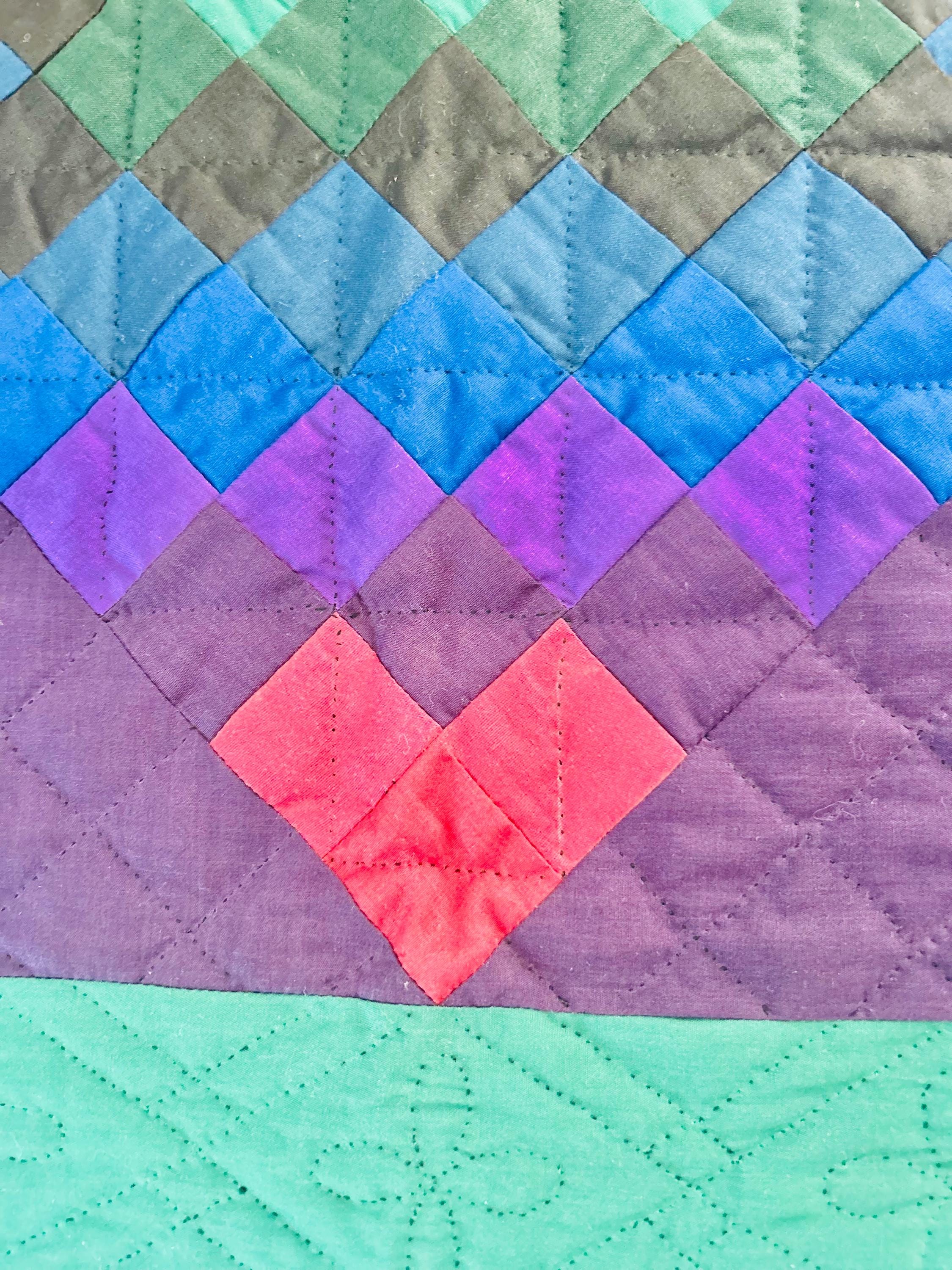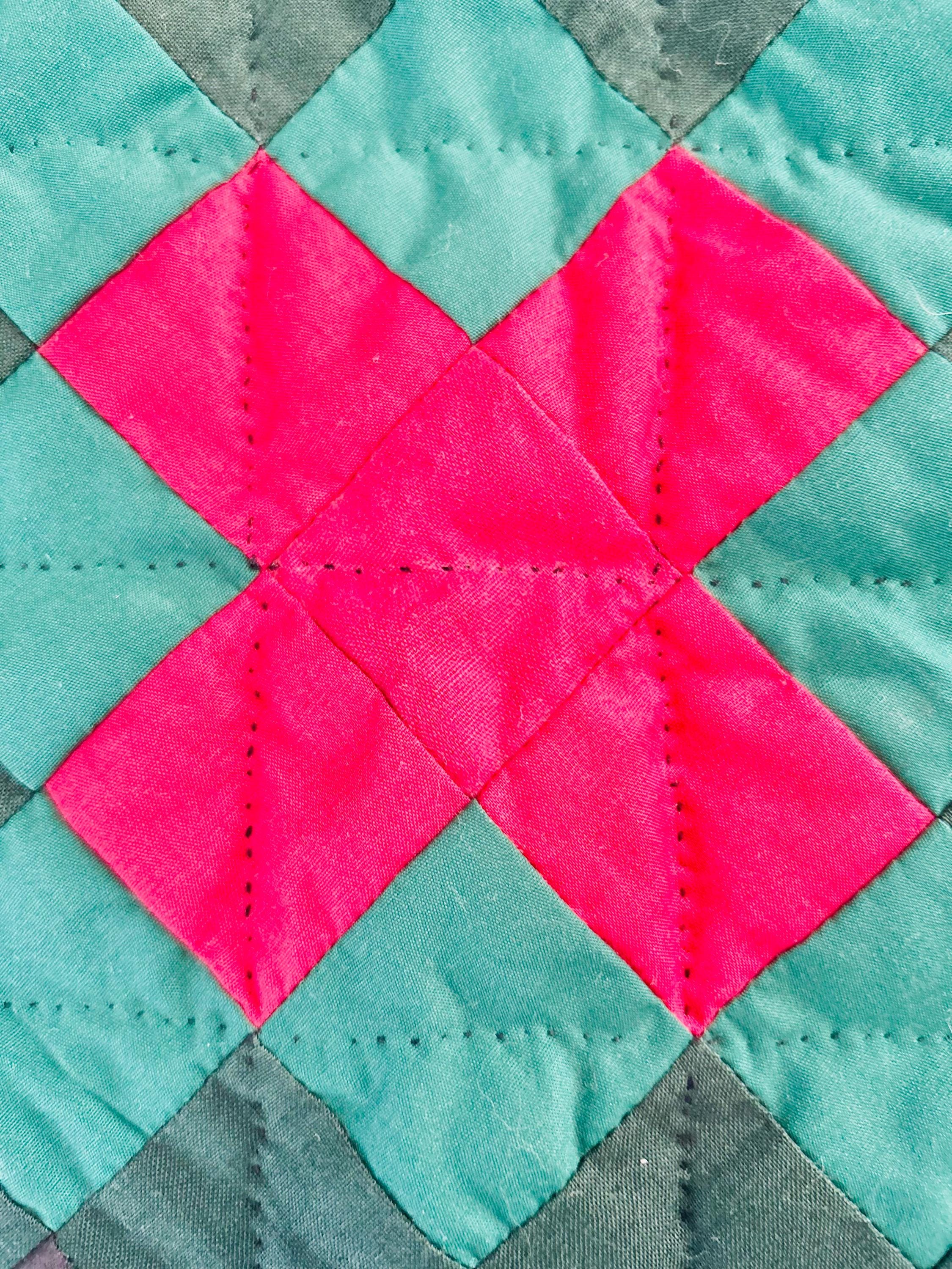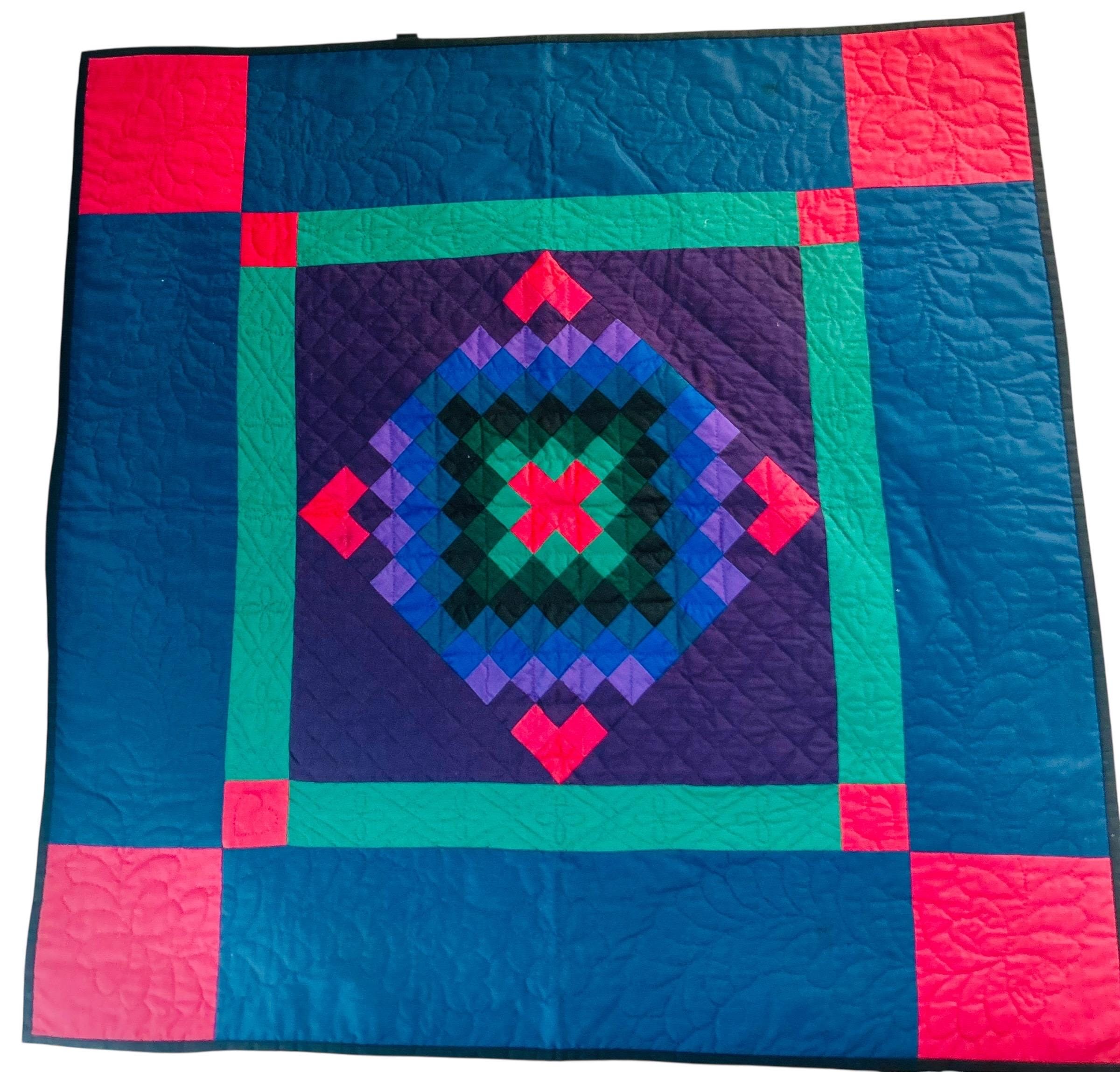 The back is a utility blue cotton which highlights the black quilting stitches, while the binding is black cotton that has been hand-stitched to both sides. The batting is lightweight.