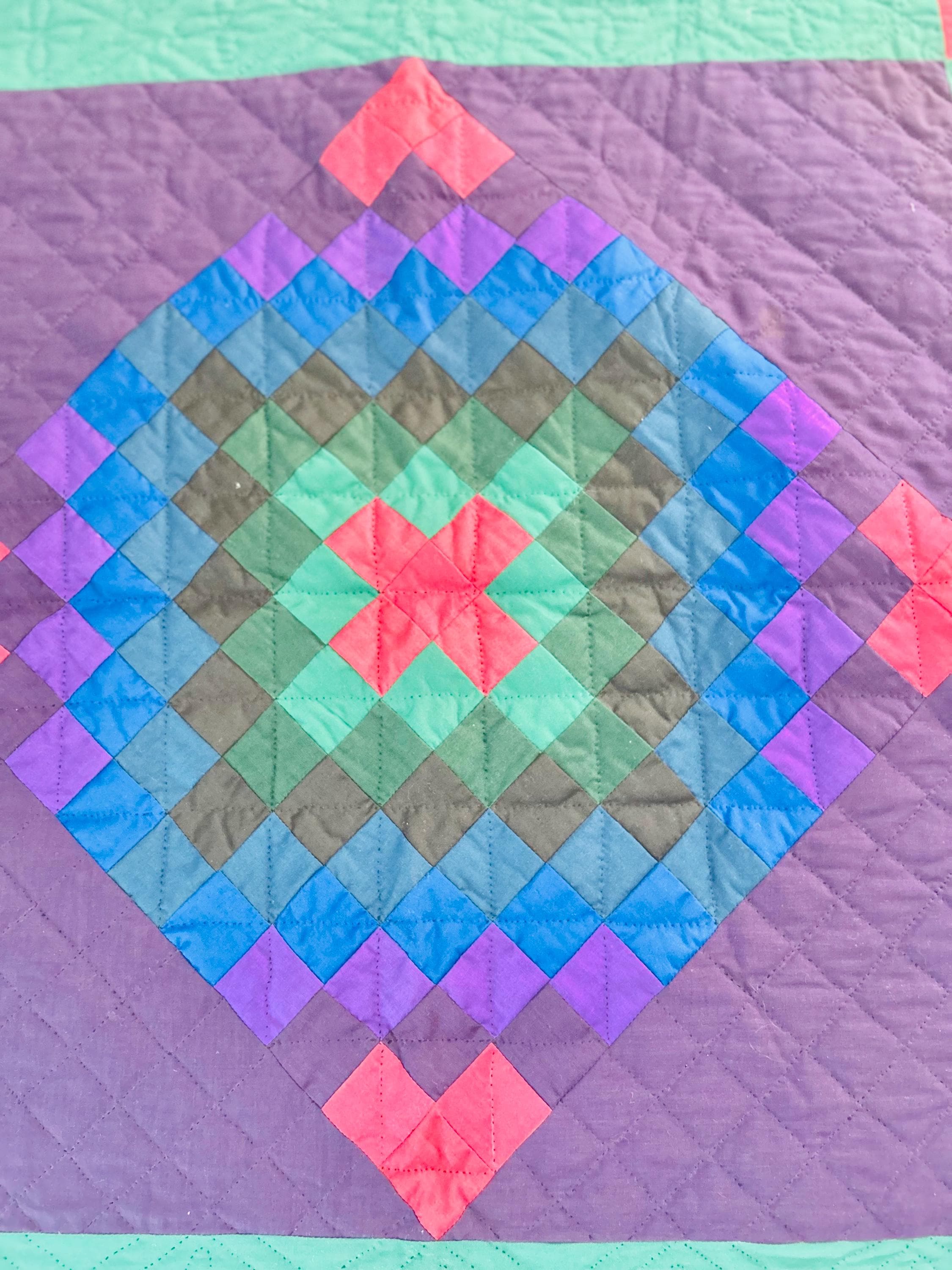 This beautiful crib-size Amish Center Diamond Quilt with a striking Trip Around the World center has been initialed L.S. and dated 1993. It is densely hand-quilted in feathers, diamonds, florals, hearts and crosshatches.