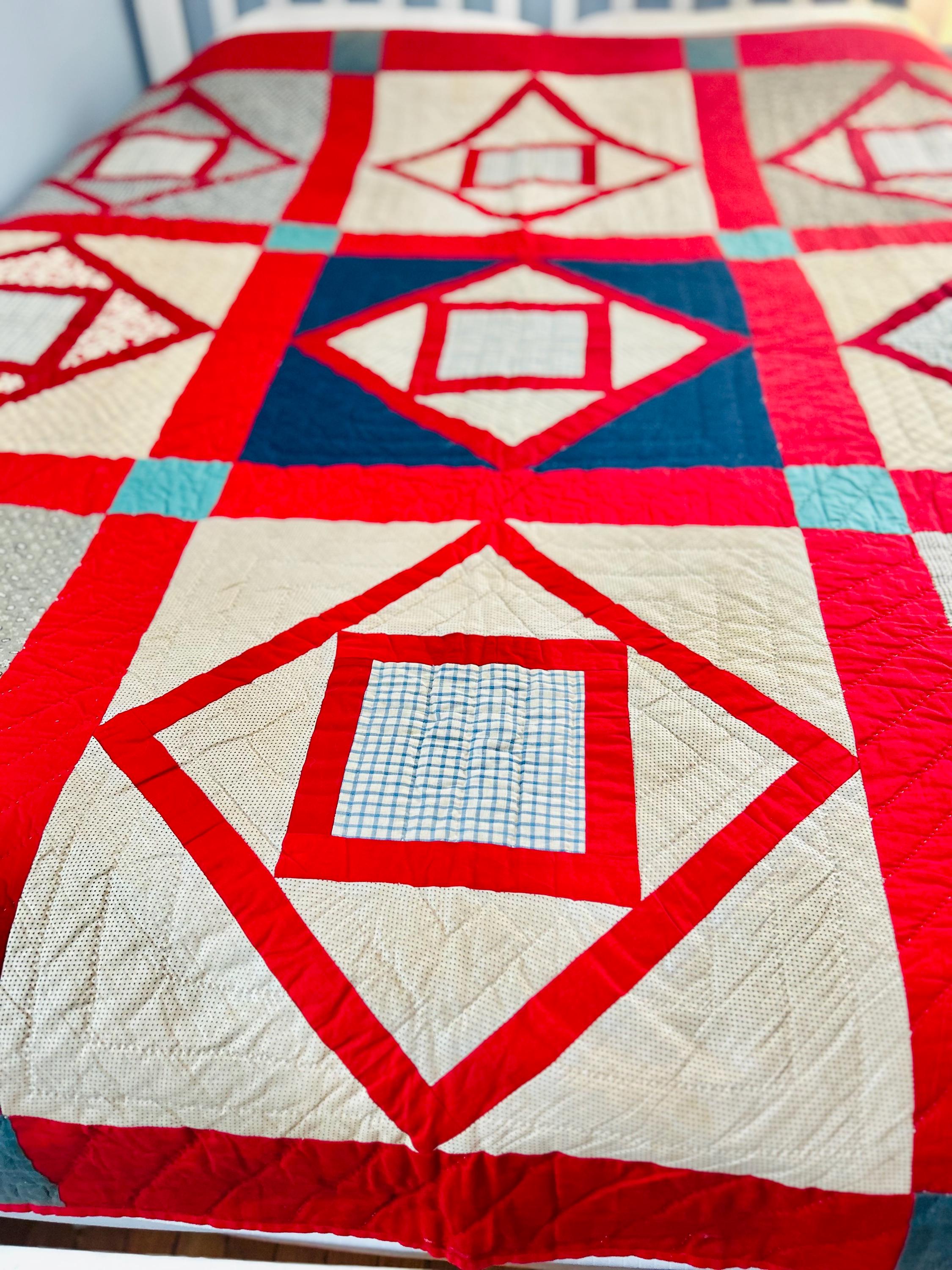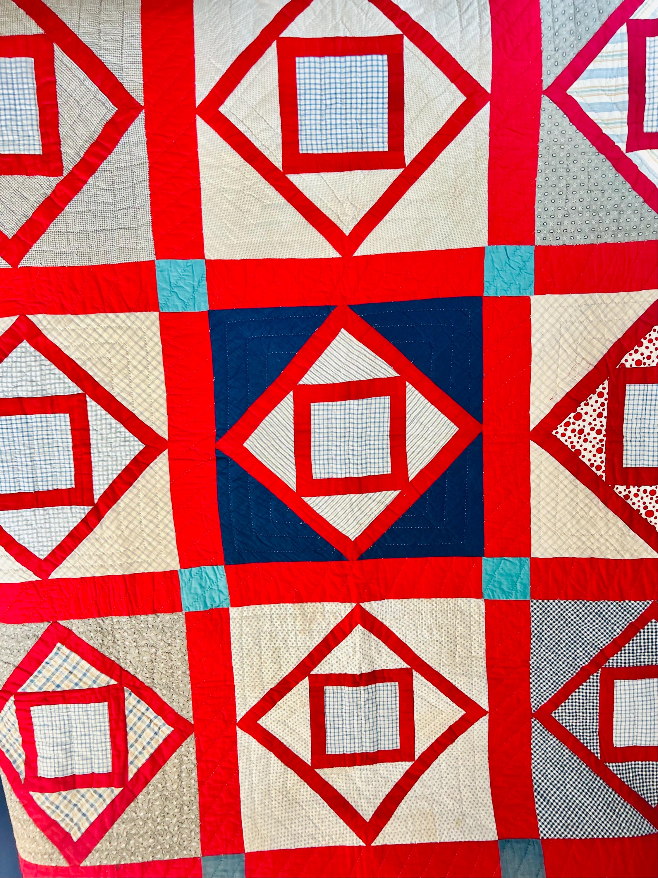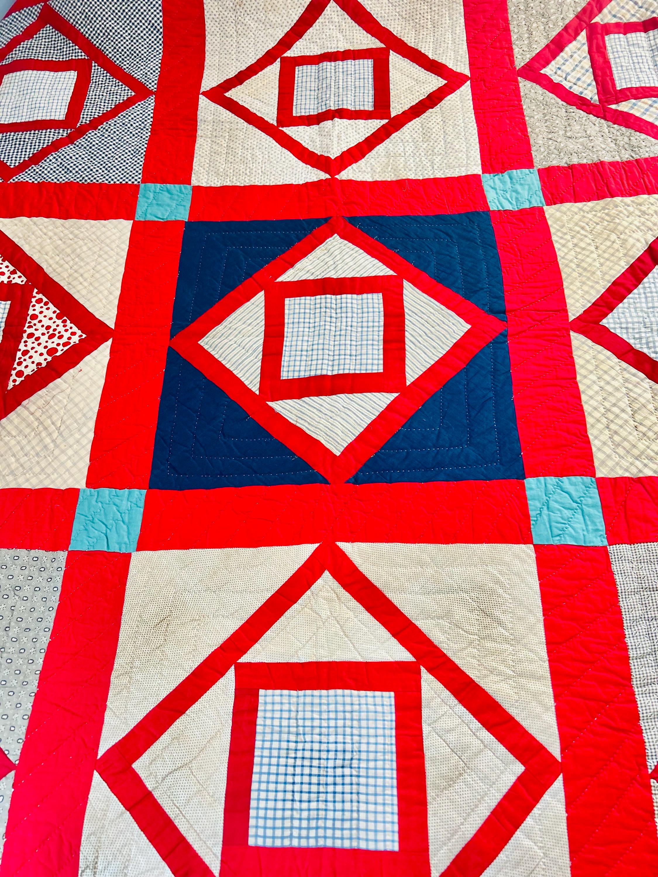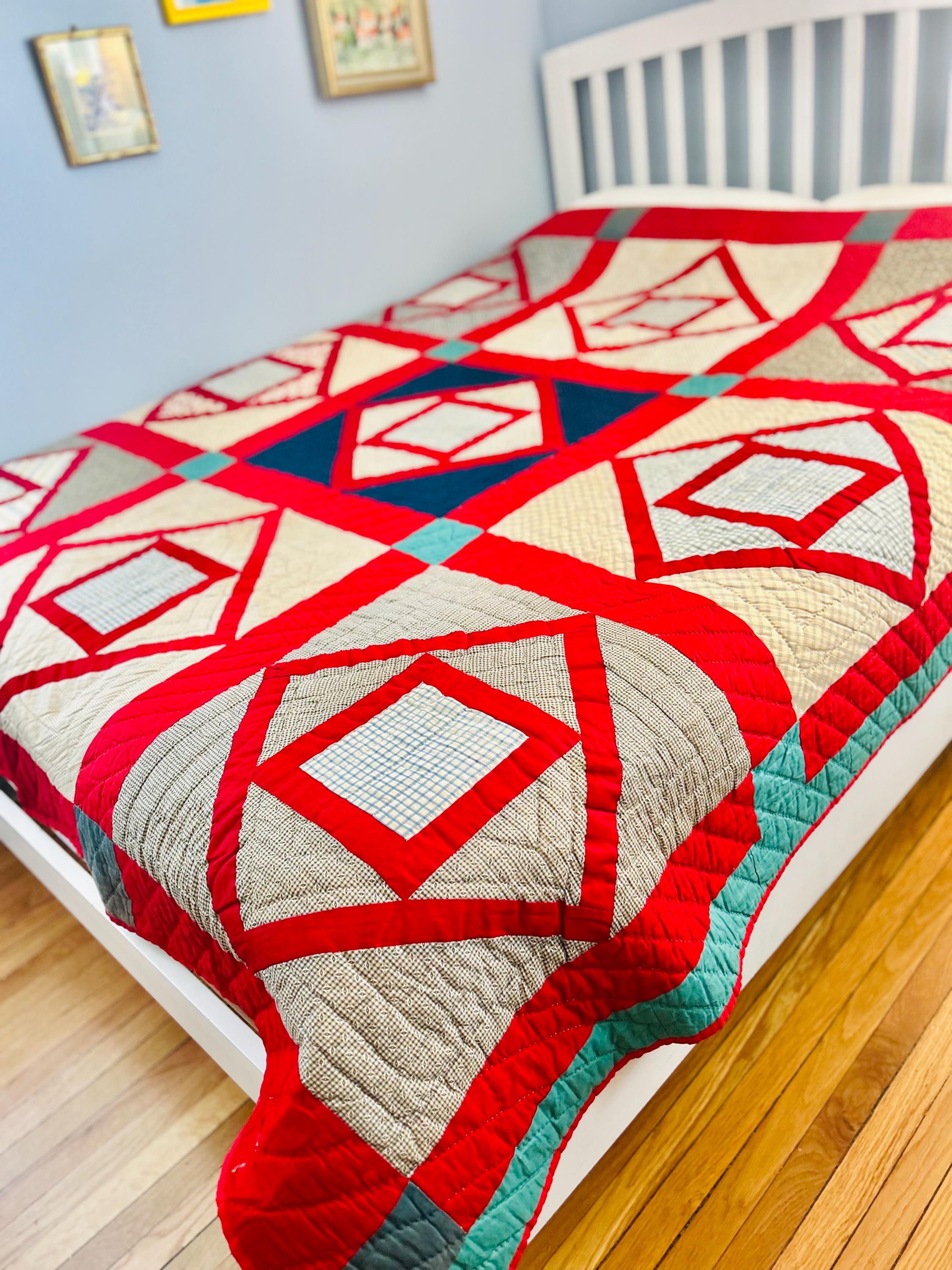 This very bold Diamond in a Square Quilt, circa late 1930s-1940s, has beautiful and bright red sashing mixed with shirting prints and calicos punctuated by the turquoise/teal cornerstones and four-sided teal/turquoise border. It's a stunning quilt that has been hand-quilted in diagonals and repeating pyramid patterns.