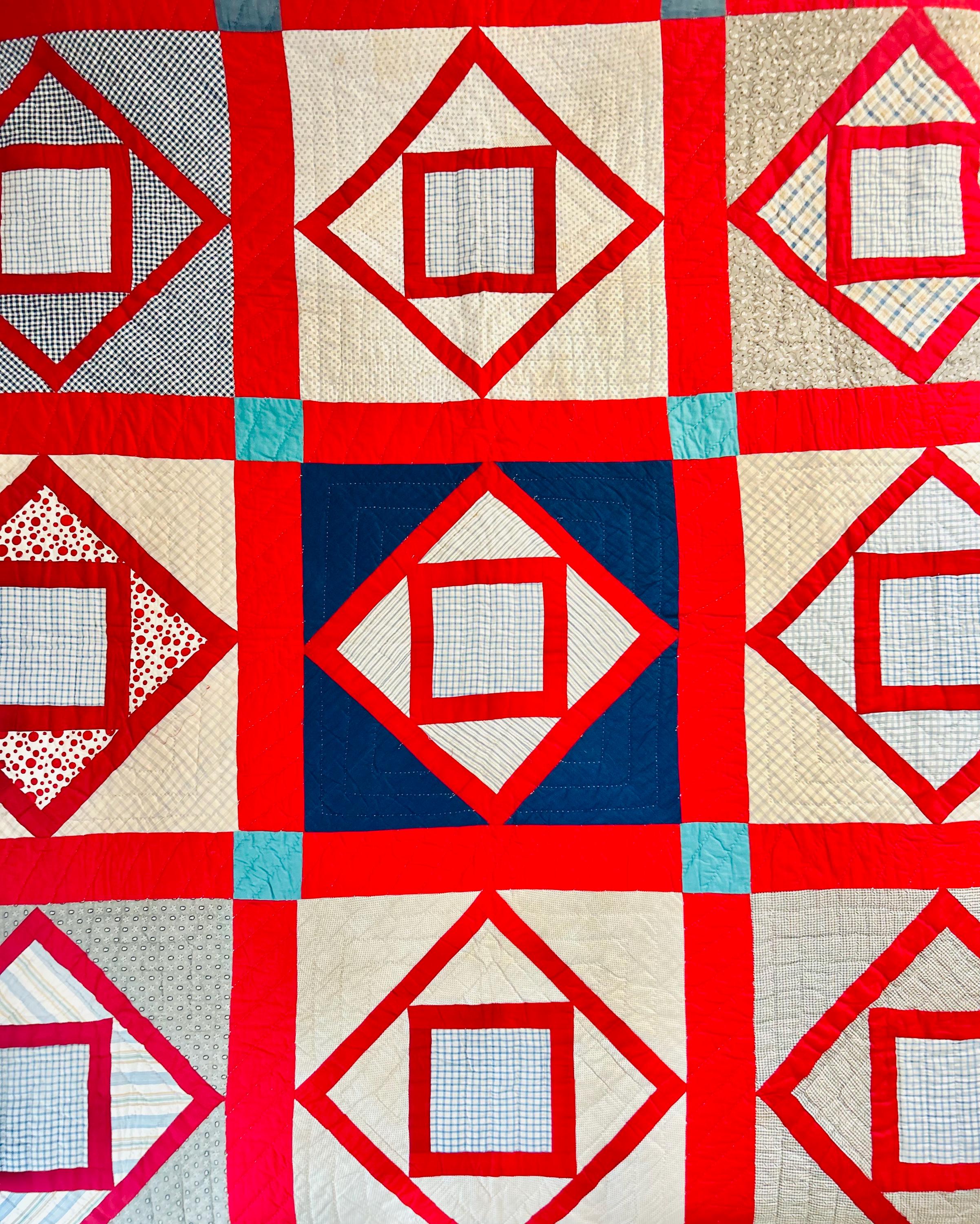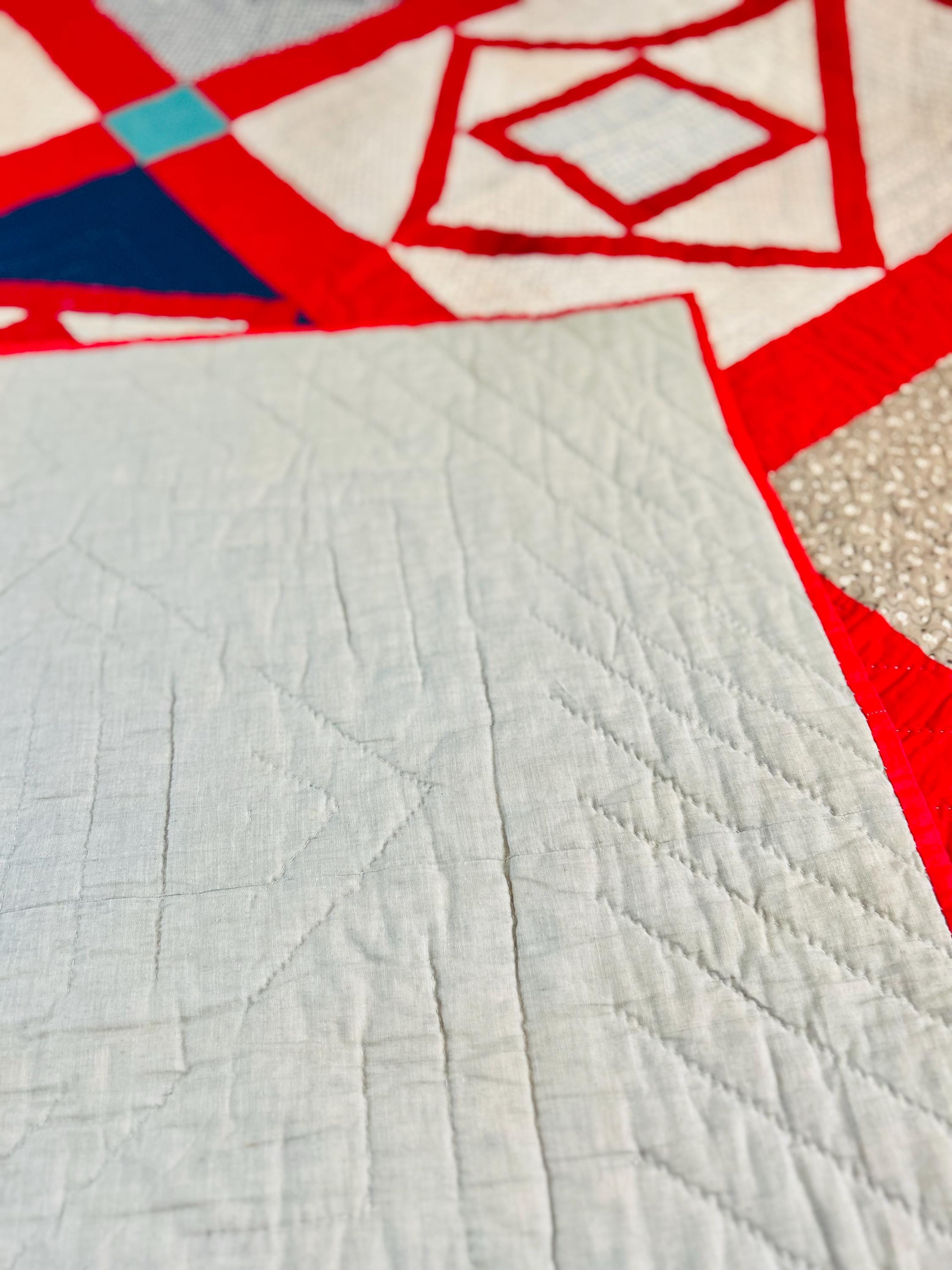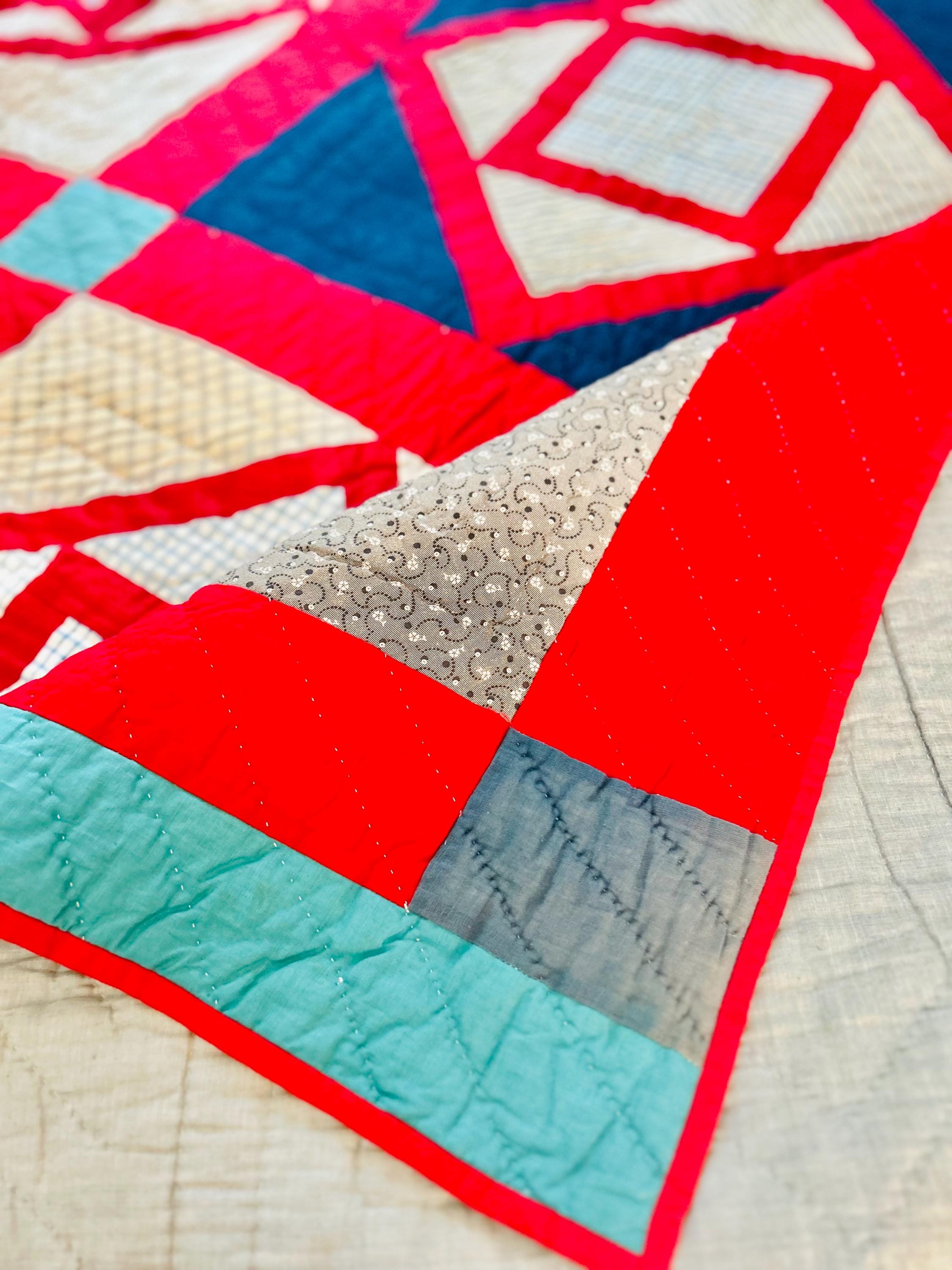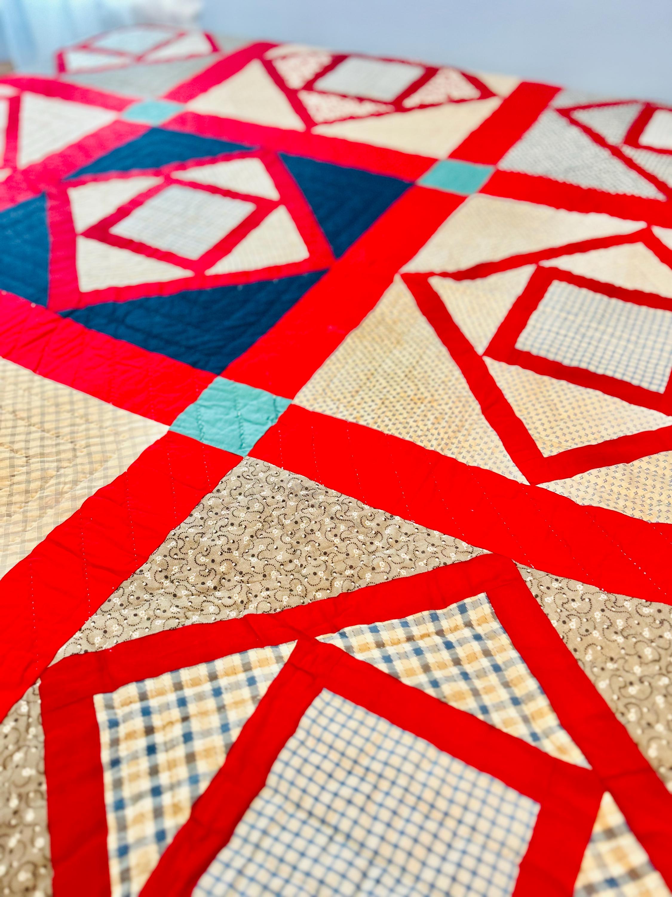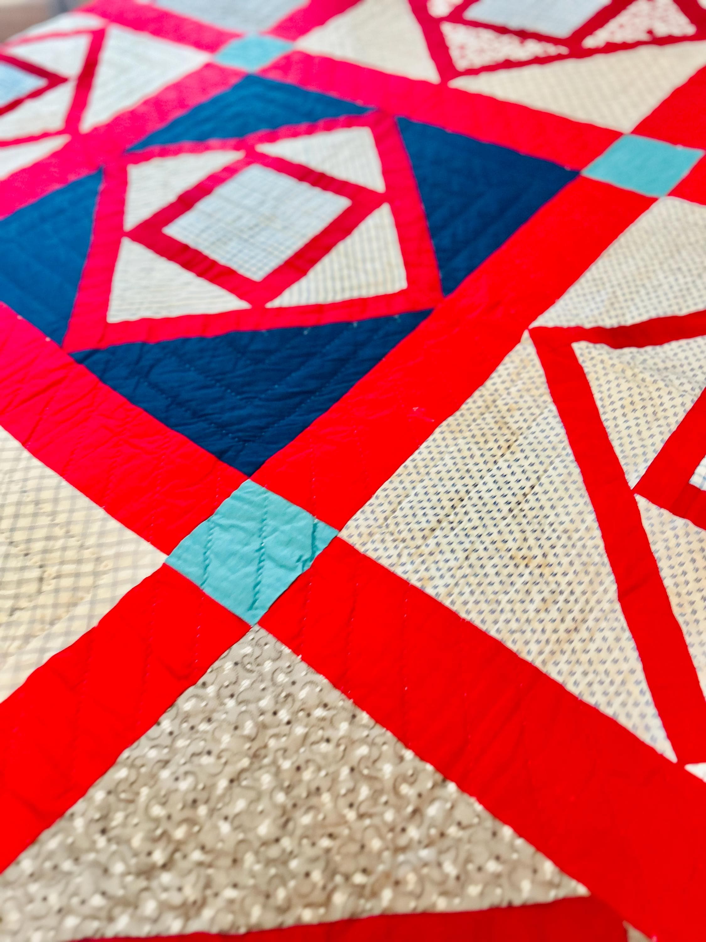 This very bold Diamond in a Square Quilt, circa late 1930s-1940s, has beautiful and bright red sashing mixed with shirting prints and calicos punctuated by the turquoise/teal cornerstones and four-sided teal/turquoise border. It's a stunning quilt that has been hand-quilted in diagonals and repeating pyramid patterns.