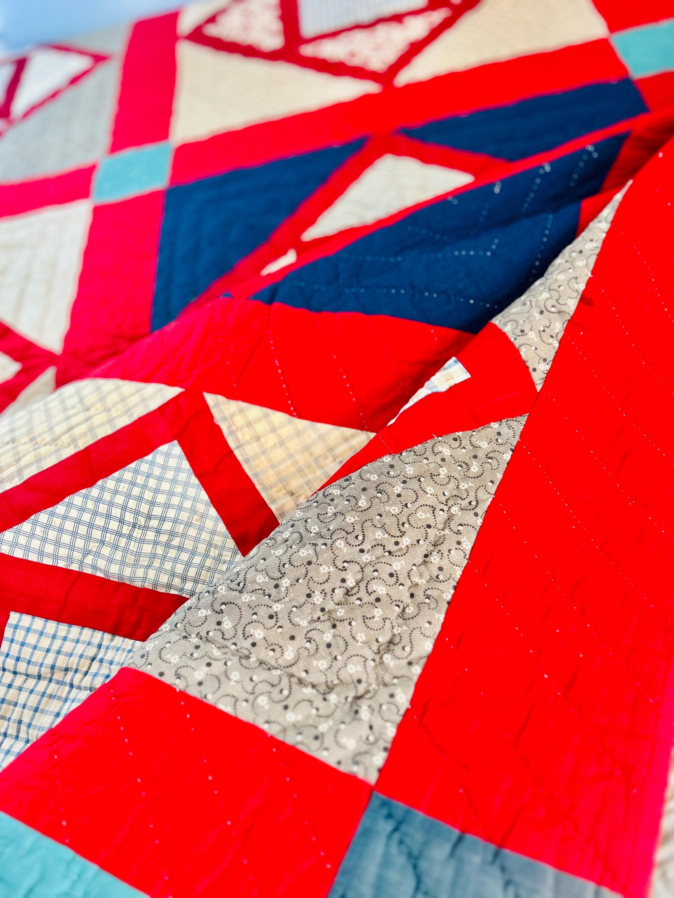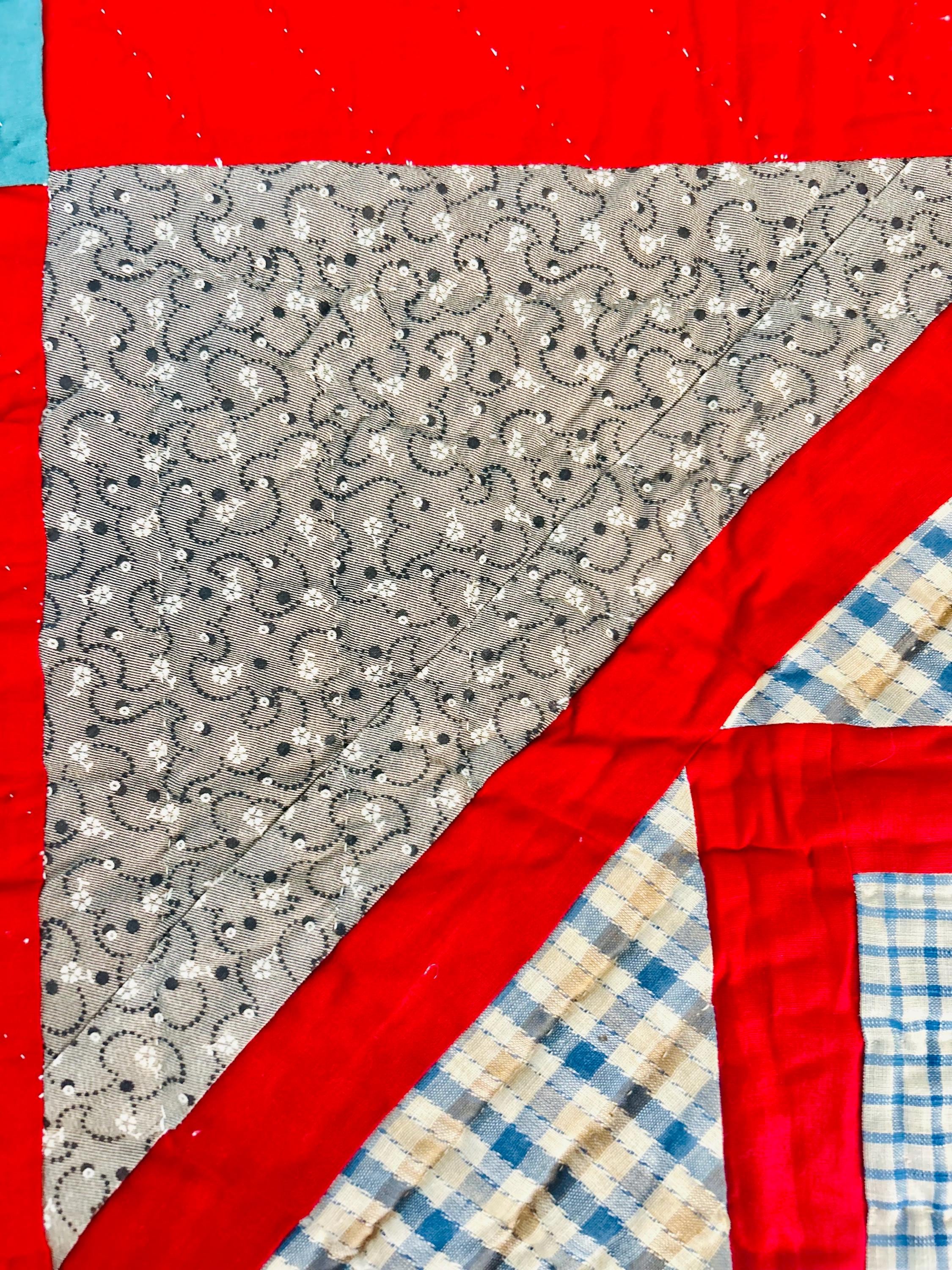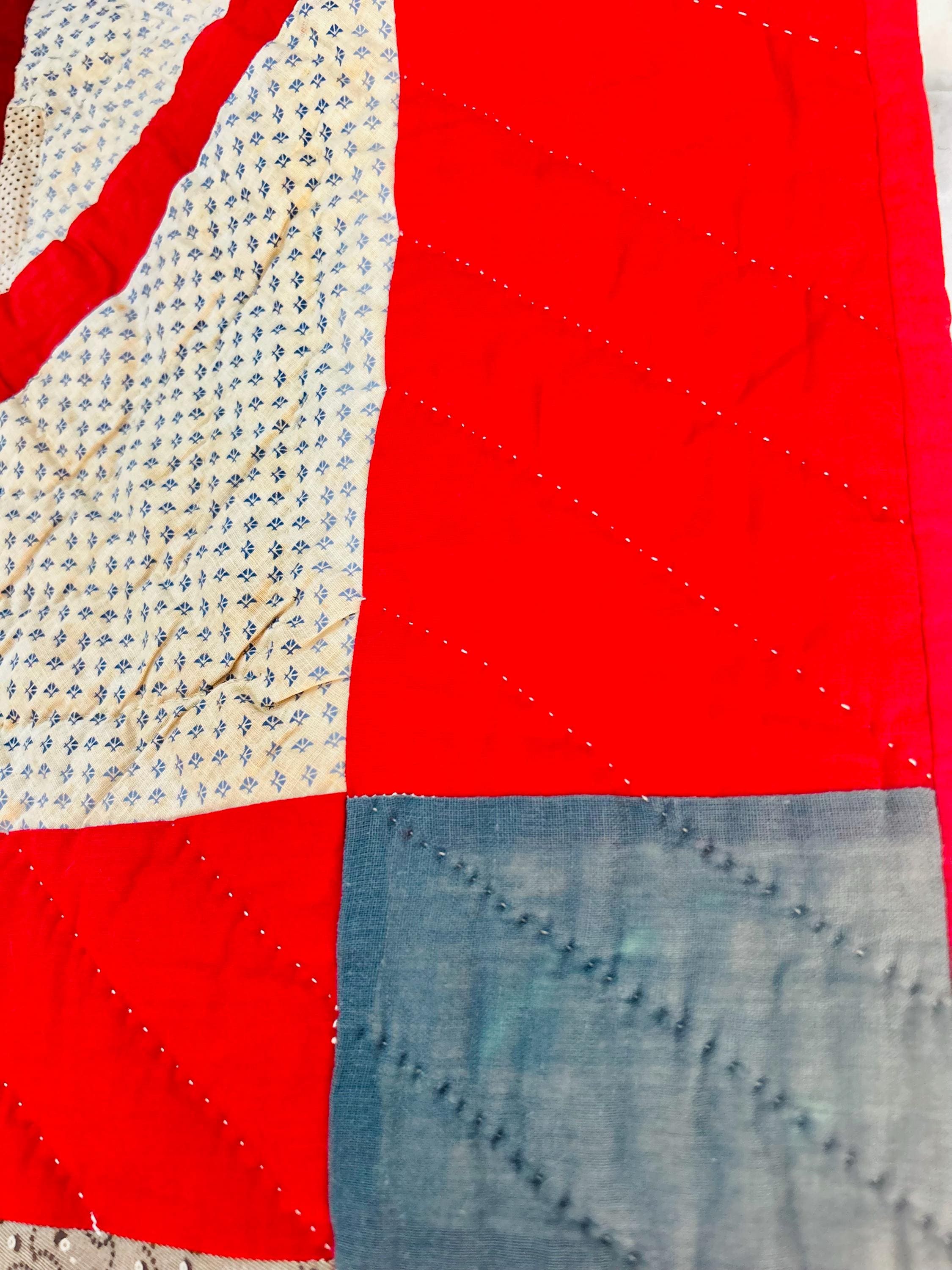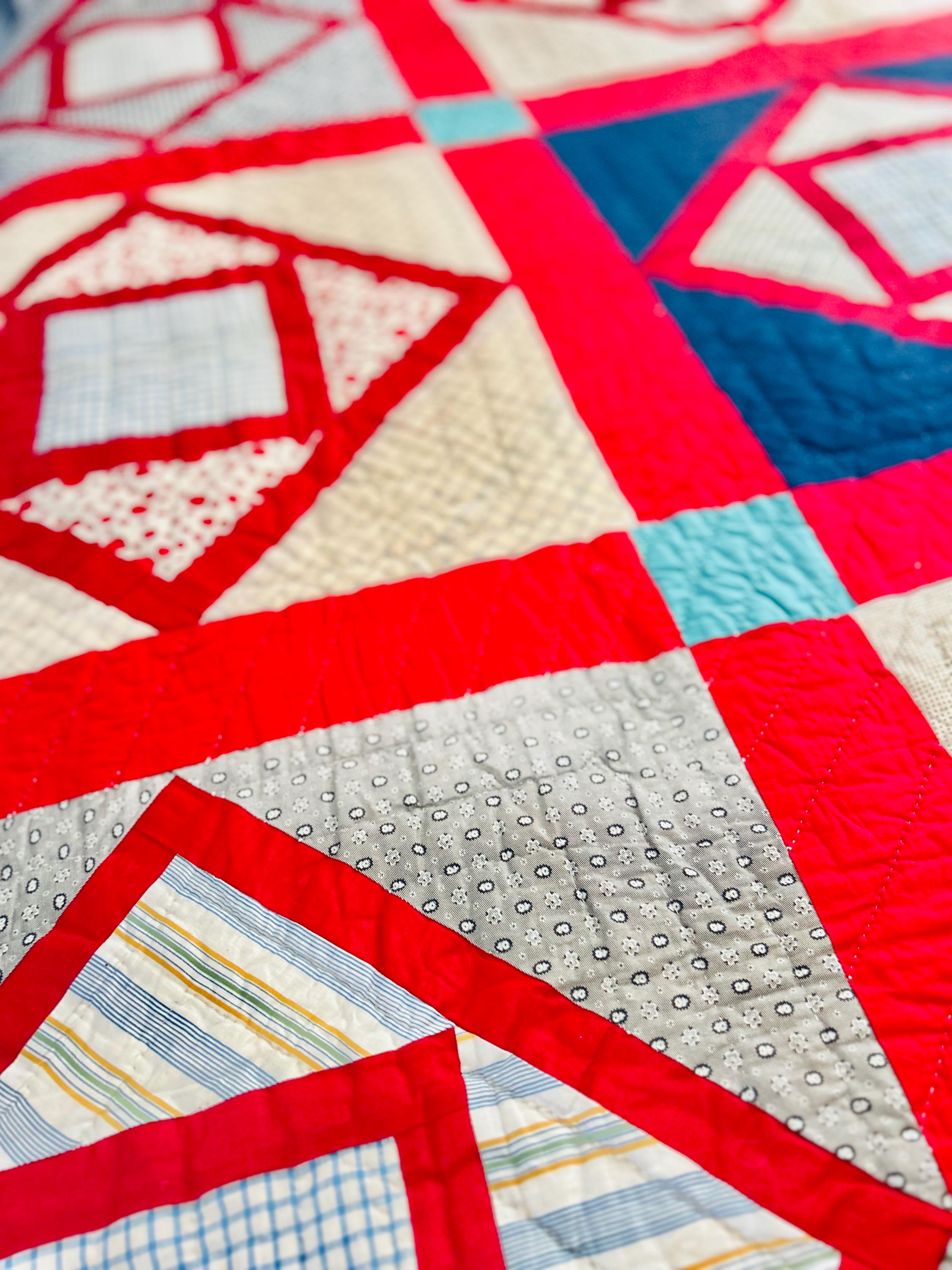 This very bold Diamond in a Square Quilt, circa late 1930s-1940s, has beautiful and bright red sashing mixed with shirting prints and calicos punctuated by the turquoise/teal cornerstones and four-sided teal/turquoise border. It's a stunning quilt that has been hand-quilted in diagonals and repeating pyramid patterns.