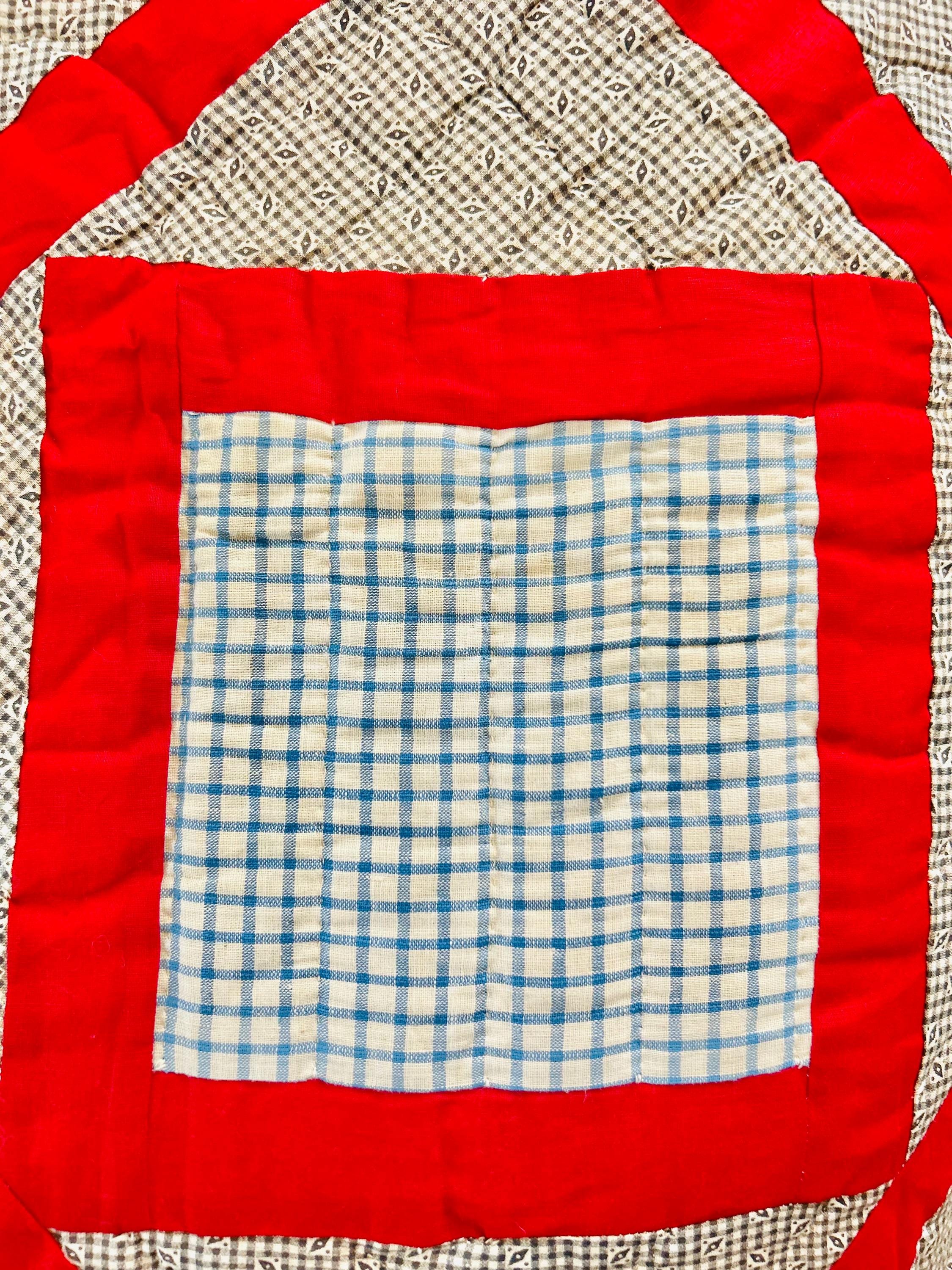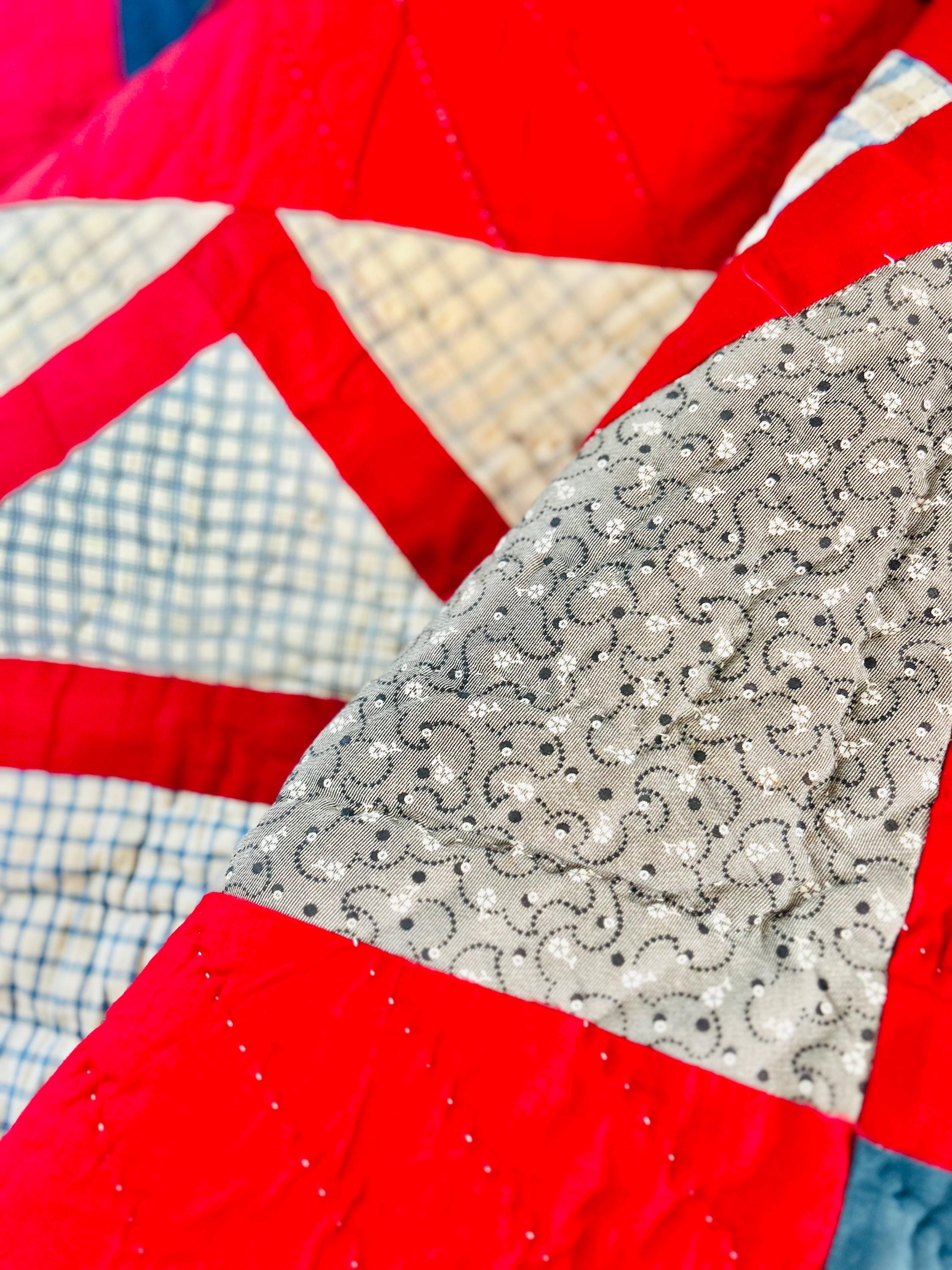 The back is grey cotton while the binding is red cotton that has been machine stitched to the front and hand-stitched to the back. The cotton batting is lightweight.