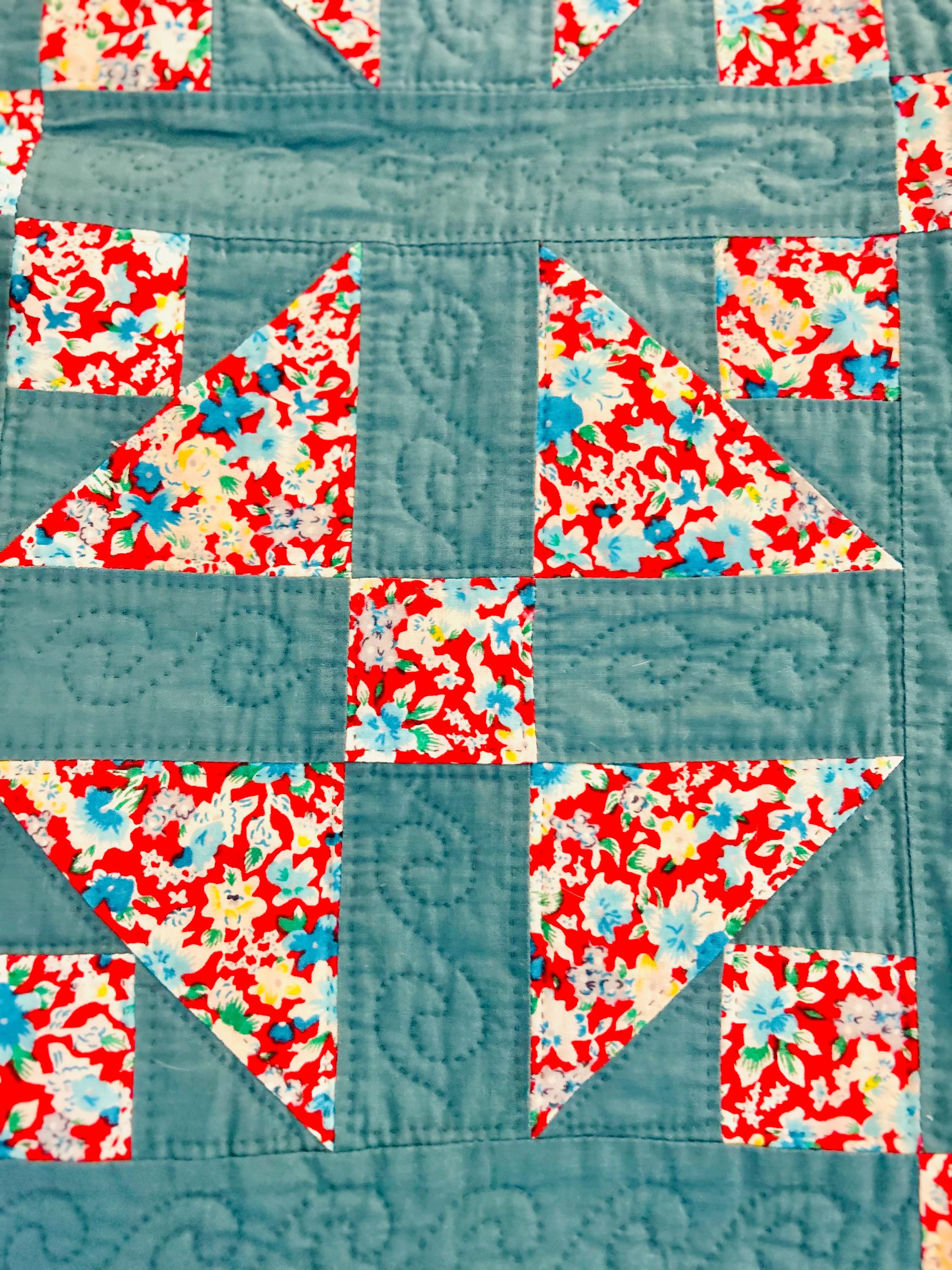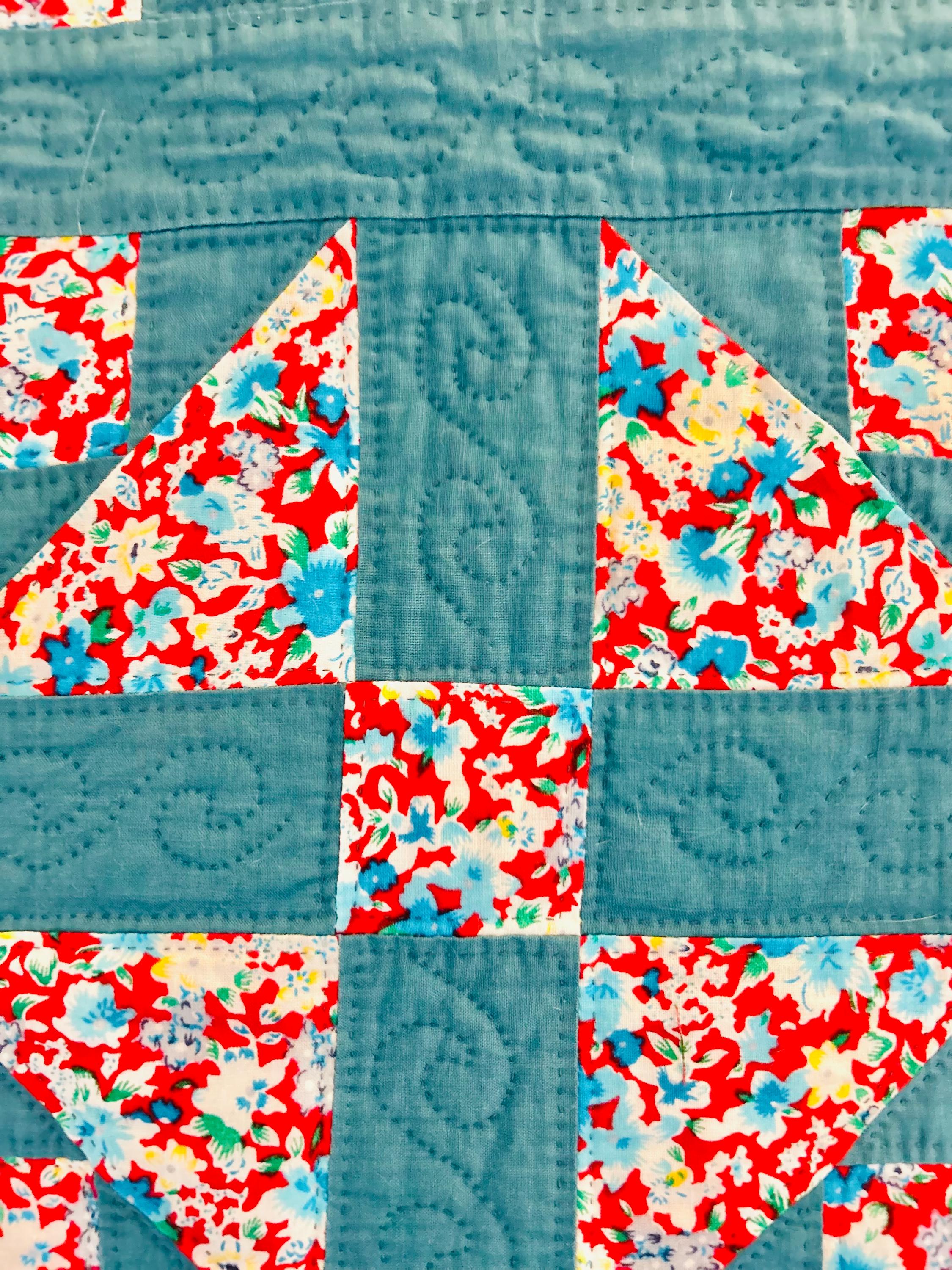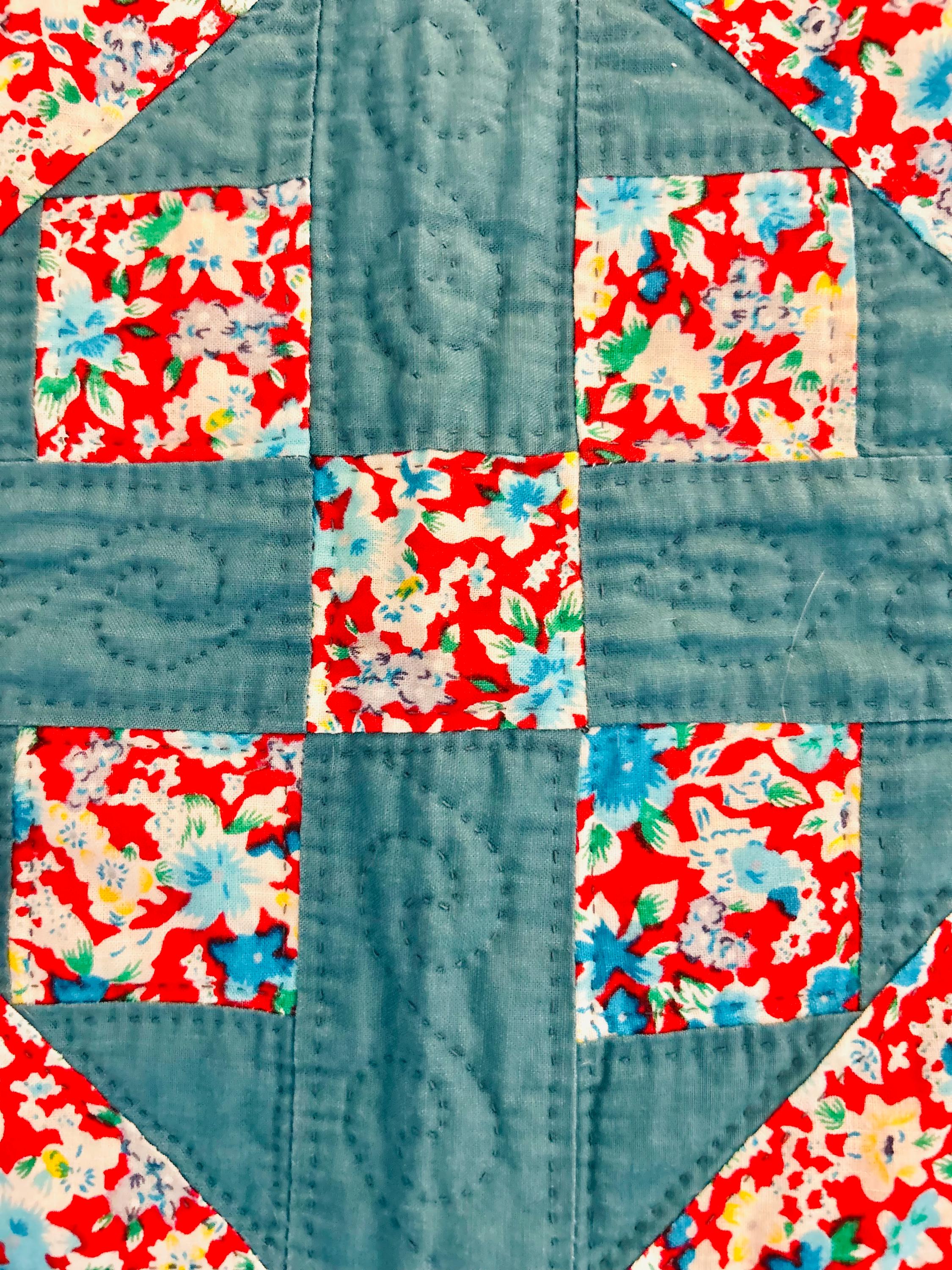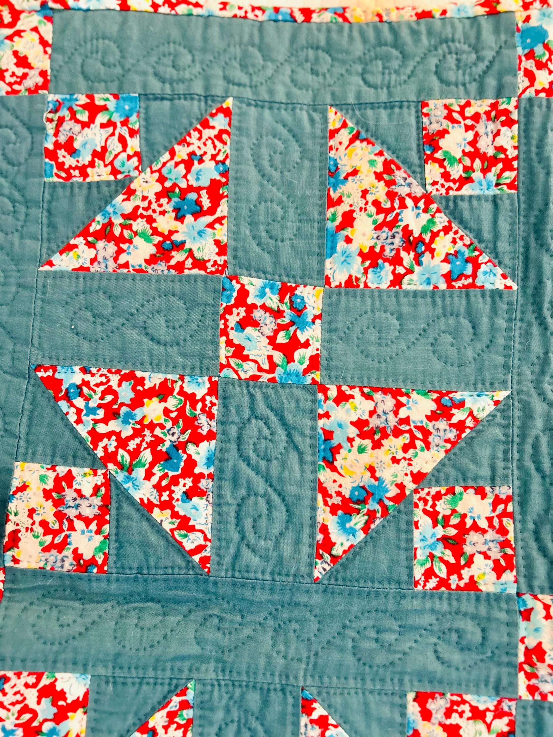 The quilting is wonderful in this small Grandmother's Favorite Quilt (circa early 2000s) which has been hand-quilted in waves and spirals as well as in outlines of the patchwork. The back is a beautiful red, blue and white floral, as is the binding that has been machine stitched to the front and hand-stitched to the back. The batting is lightweight.