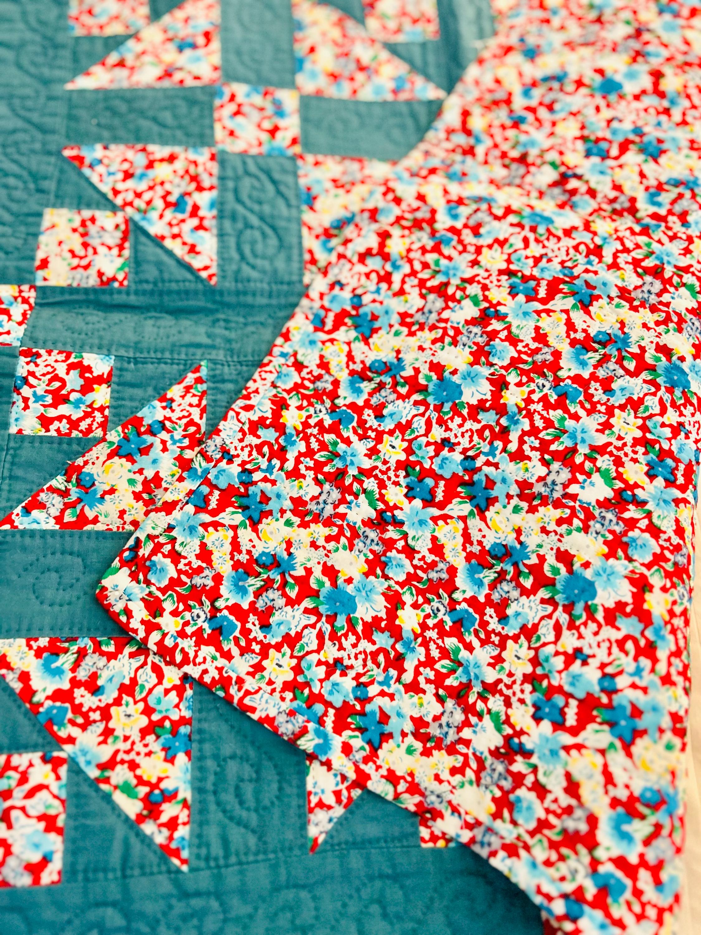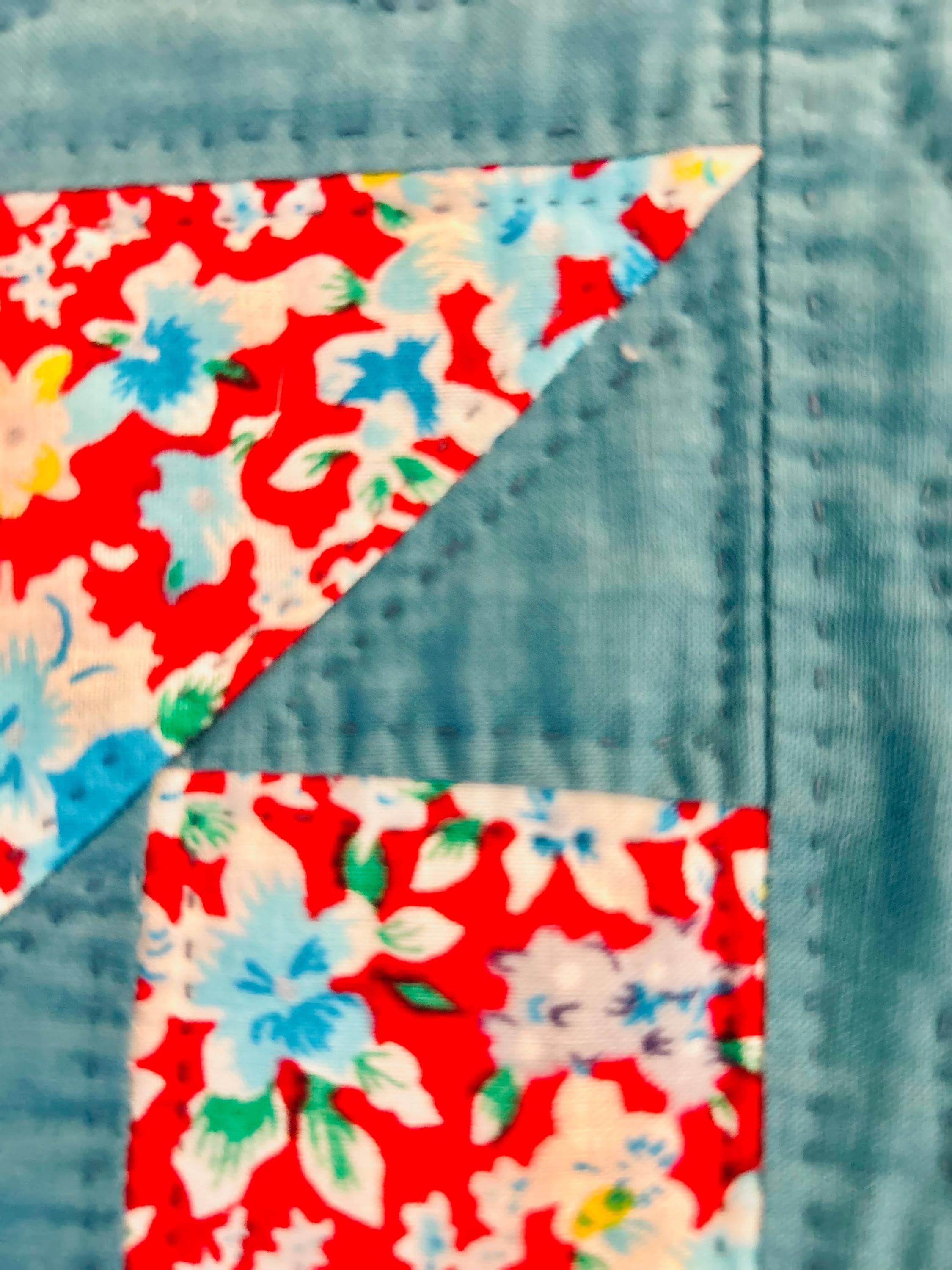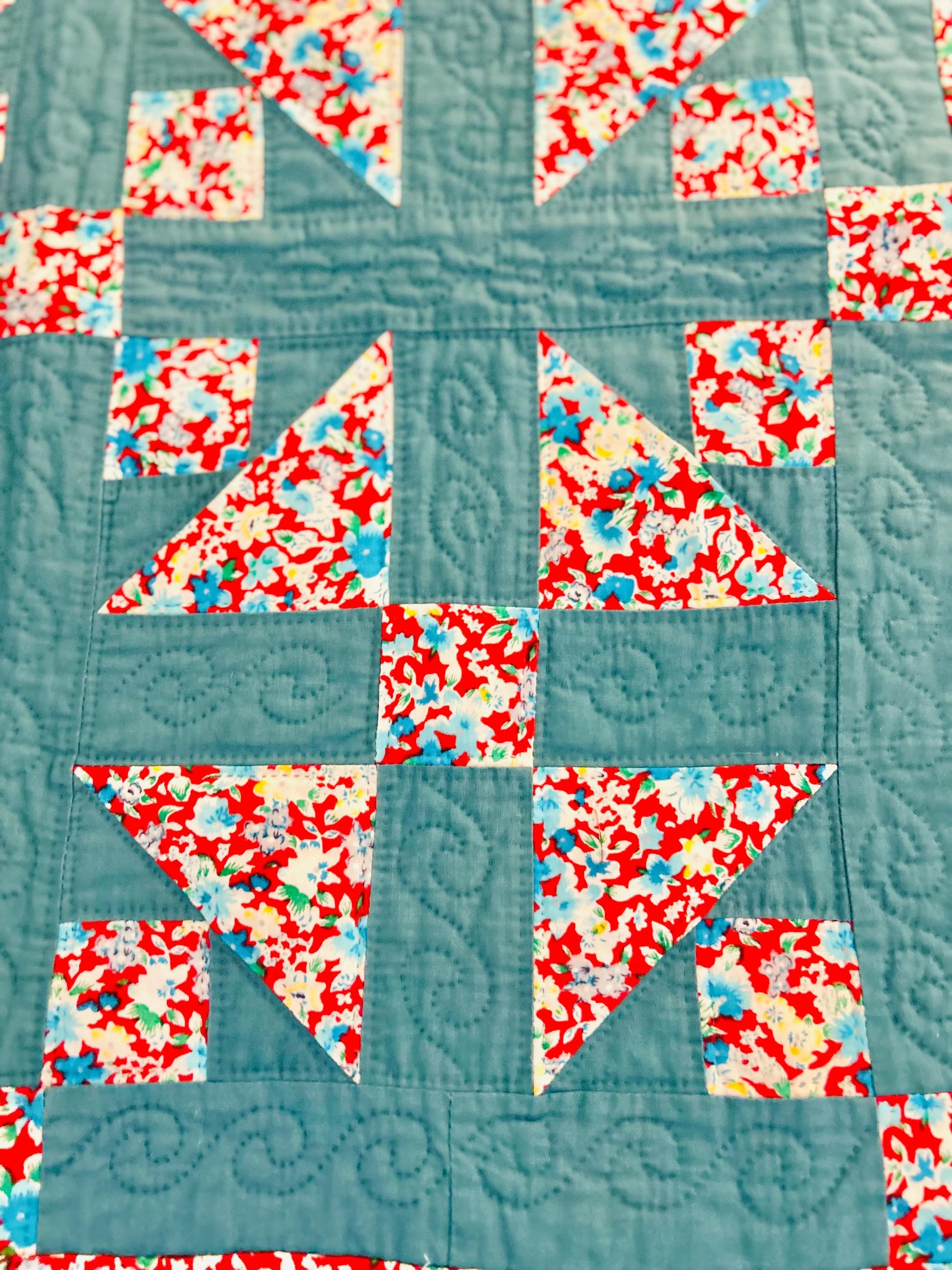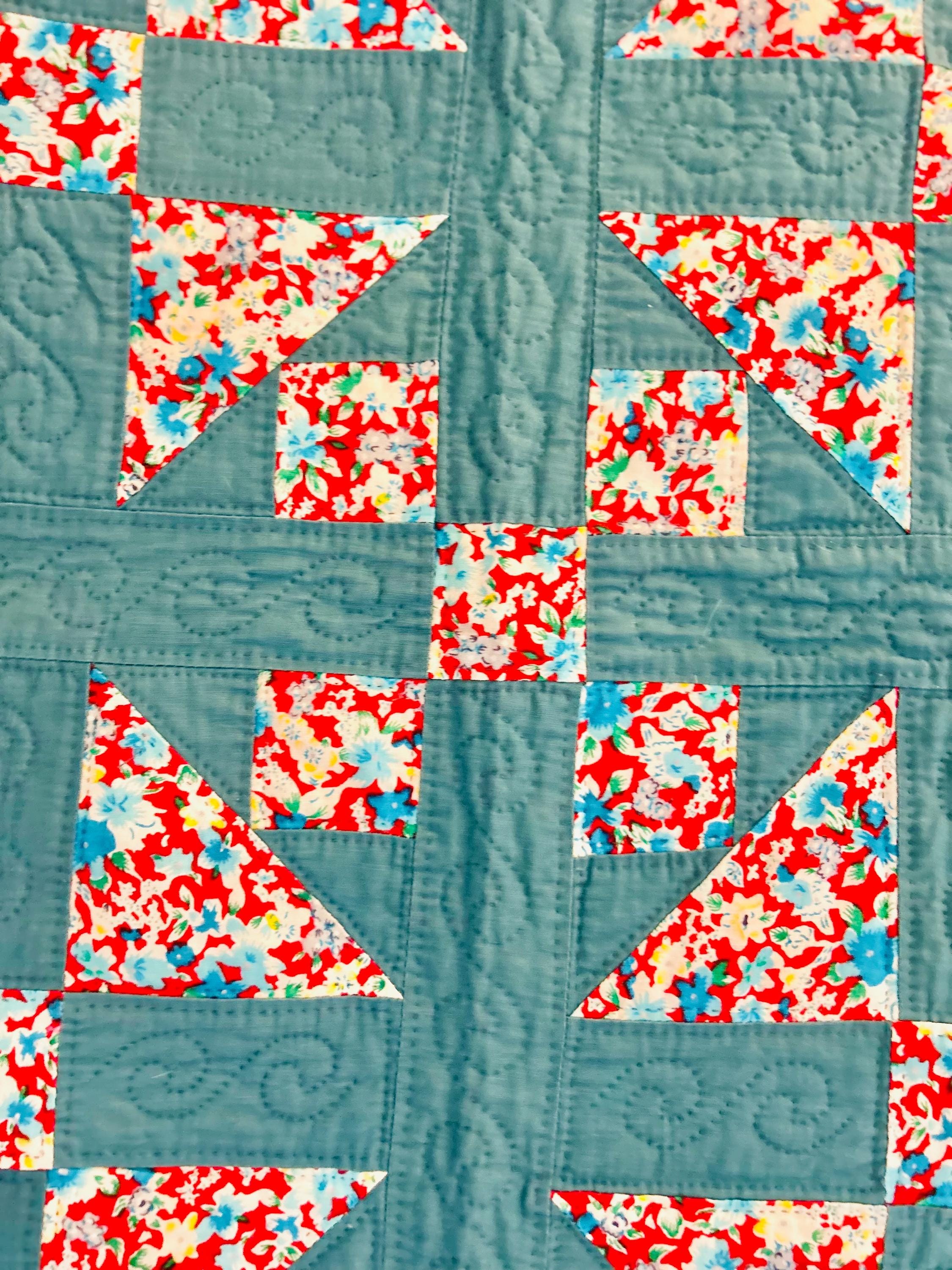 The quilting is wonderful in this small Grandmother's Favorite Quilt (circa early 2000s) which has been hand-quilted in waves and spirals as well as in outlines of the patchwork. The back is a beautiful red, blue and white floral, as is the binding that has been machine stitched to the front and hand-stitched to the back. The batting is lightweight.