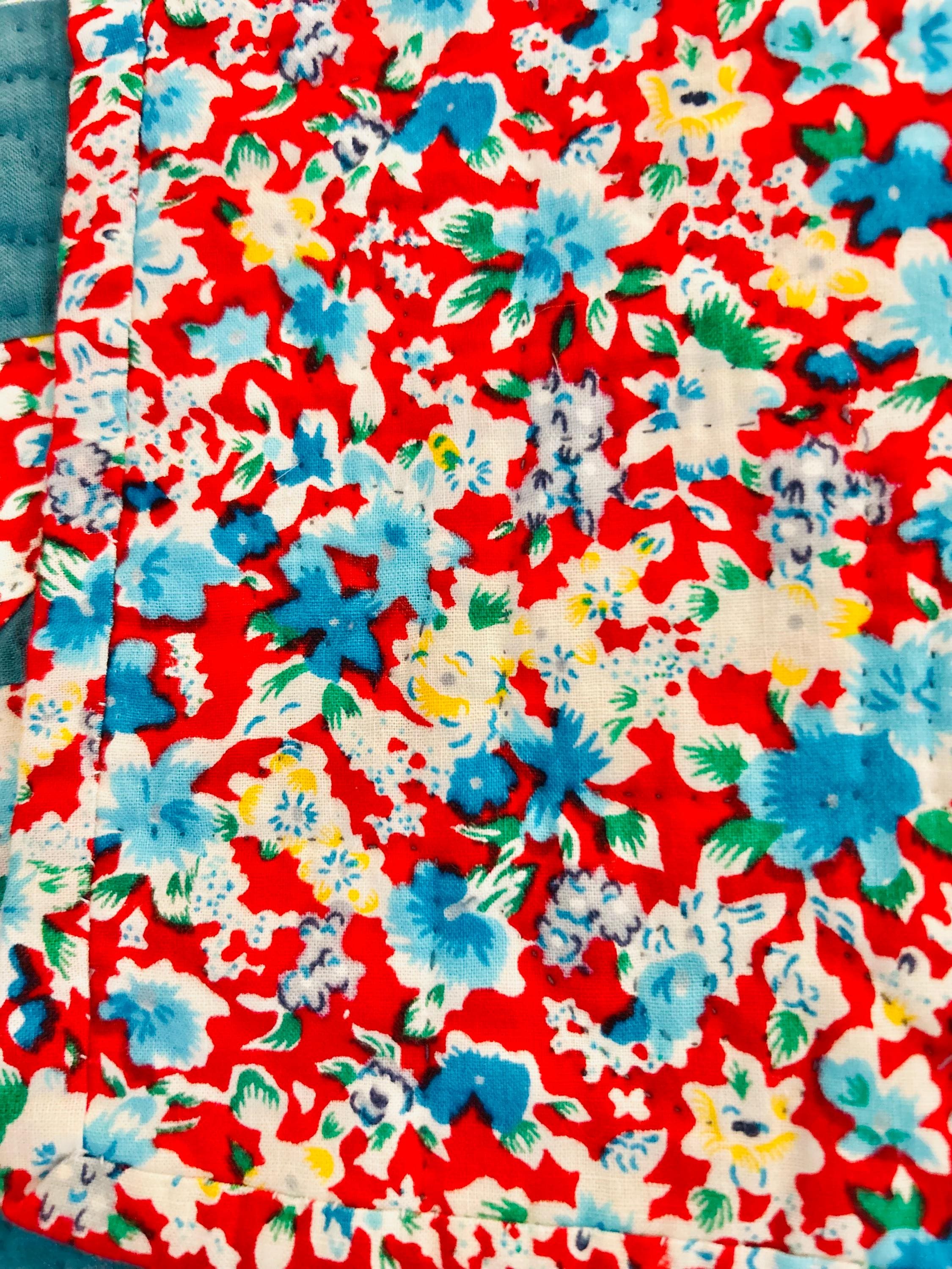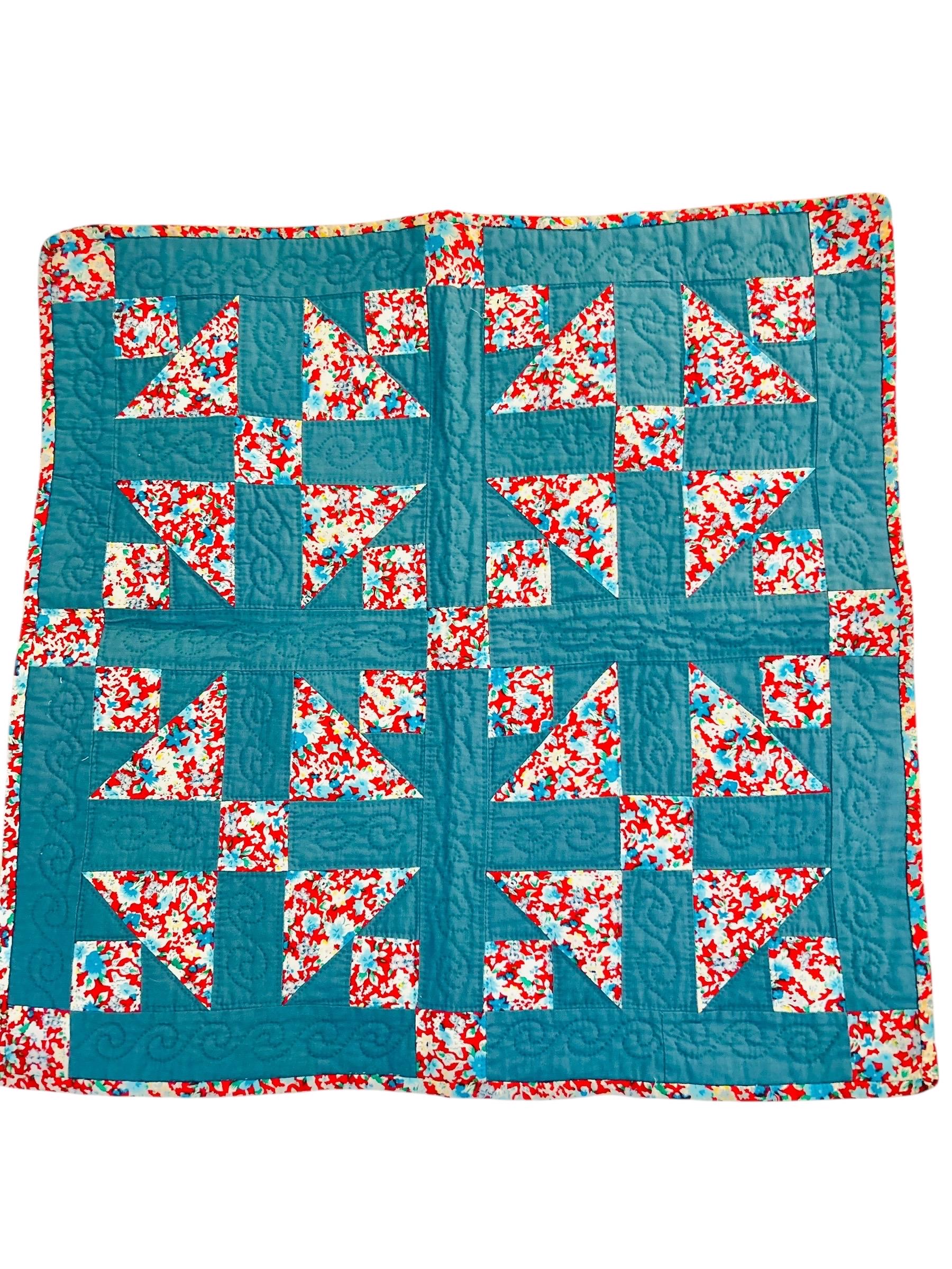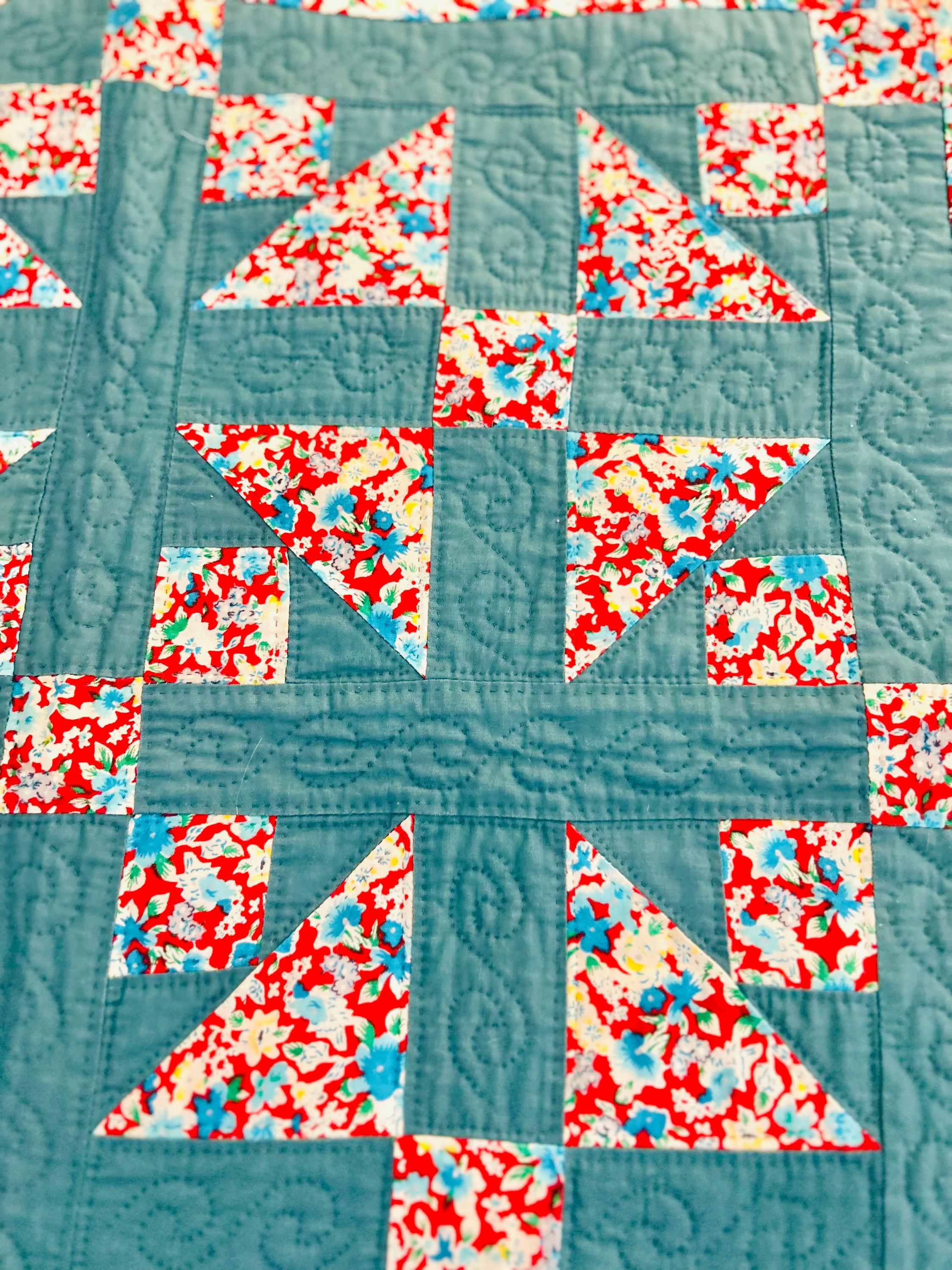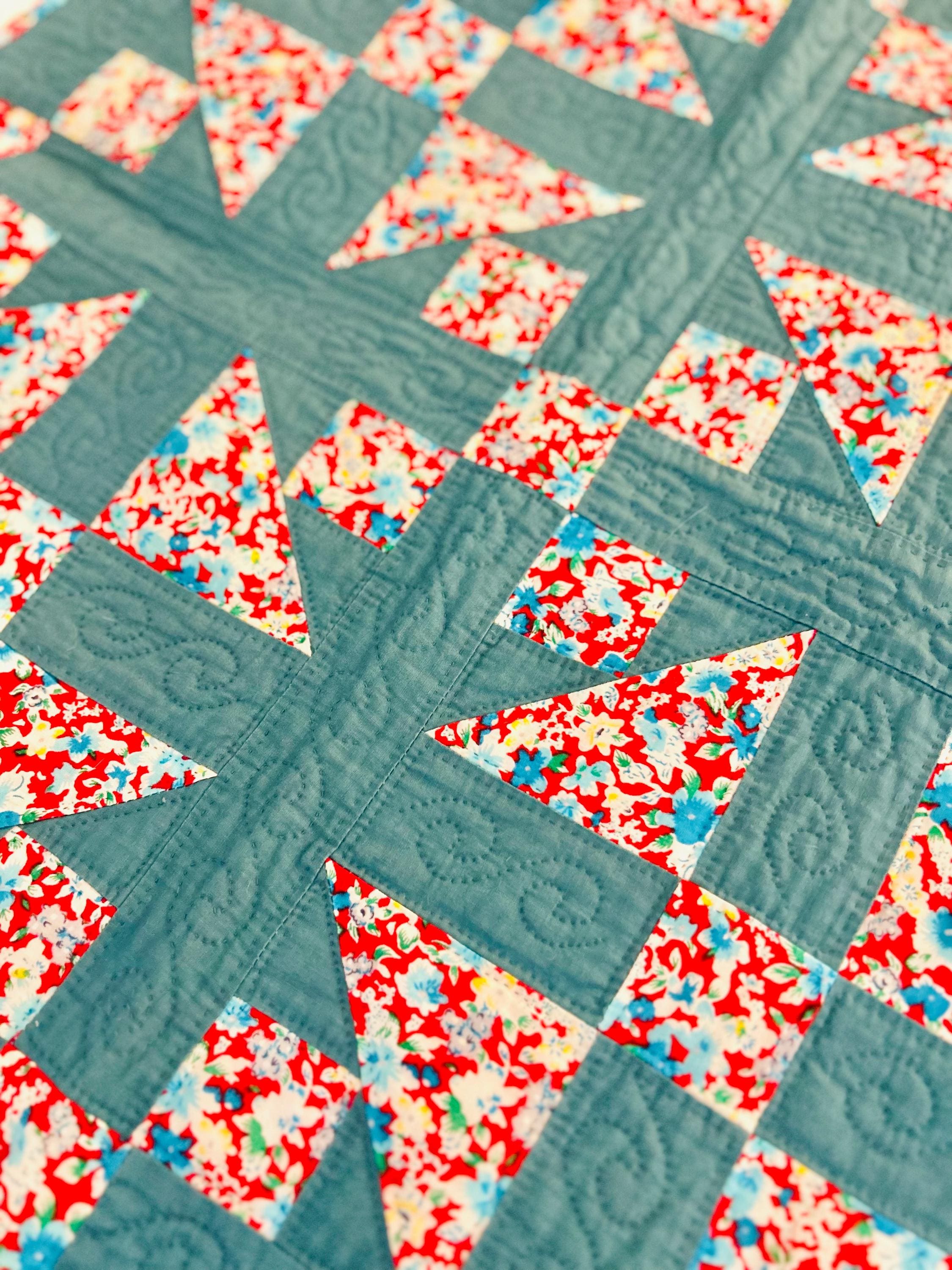 The quilting is wonderful in this small Grandmother's Favorite Quilt (circa early 2000s) which has been hand-quilted in waves and spirals as well as in outlines of the patchwork. The back is a beautiful red, blue and white floral, as is the binding that has been machine stitched to the front and hand-stitched to the back. The batting is lightweight.