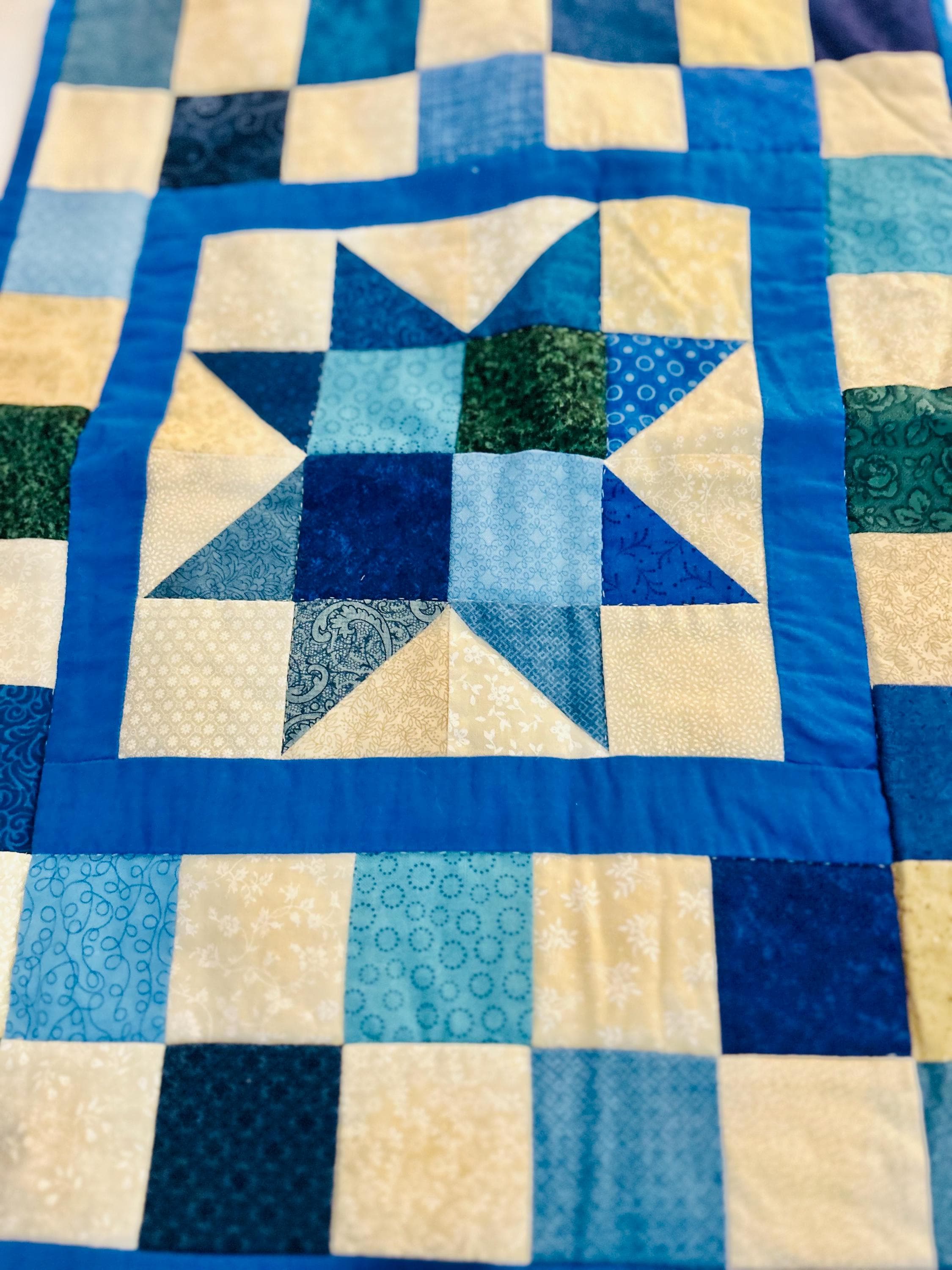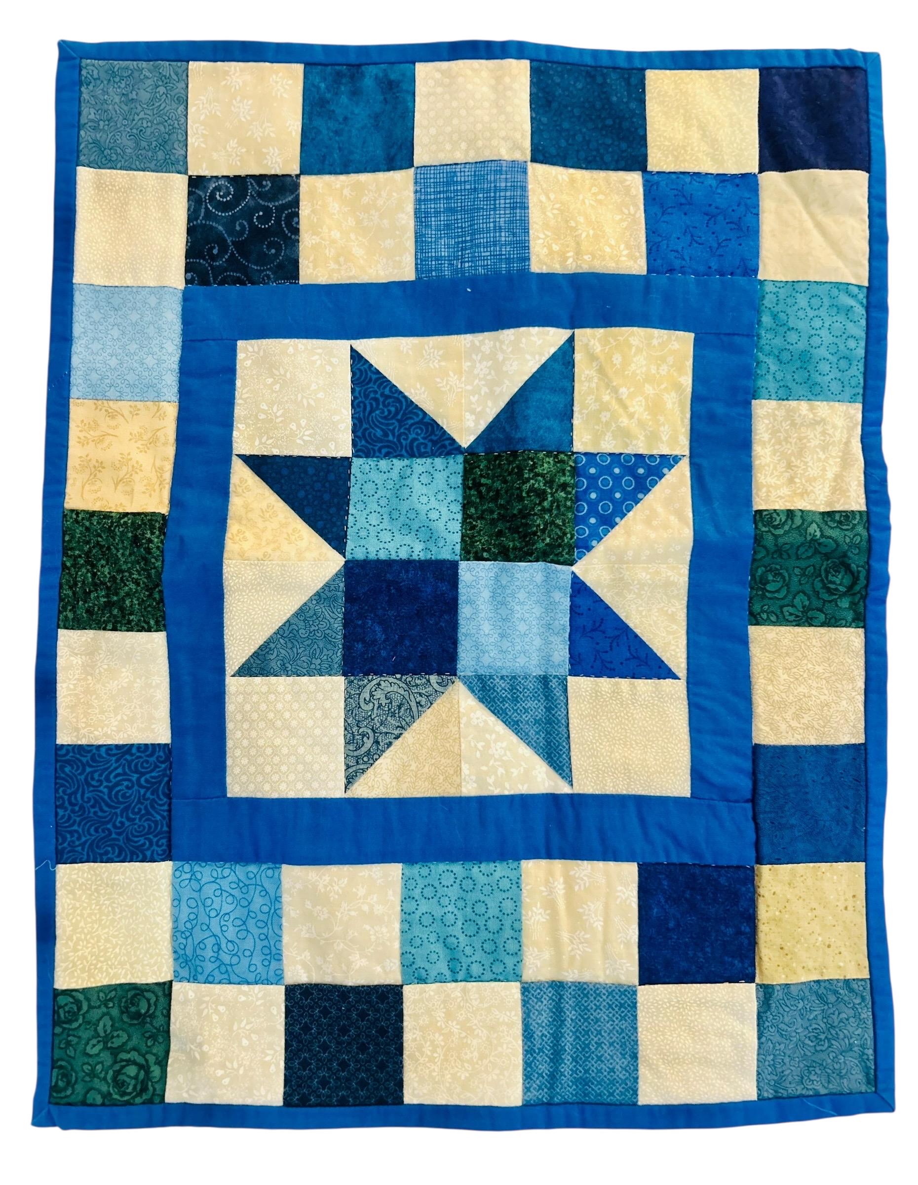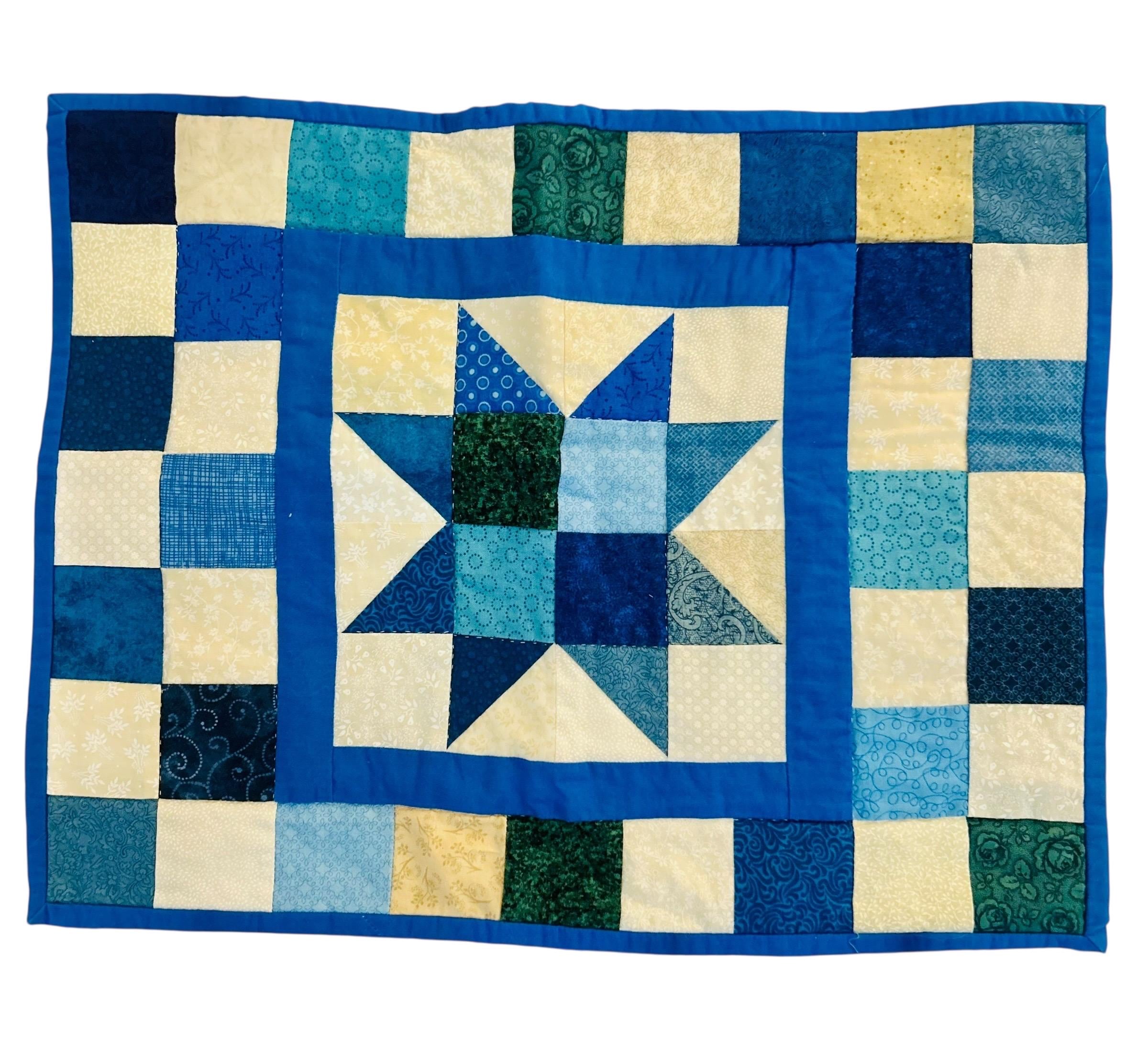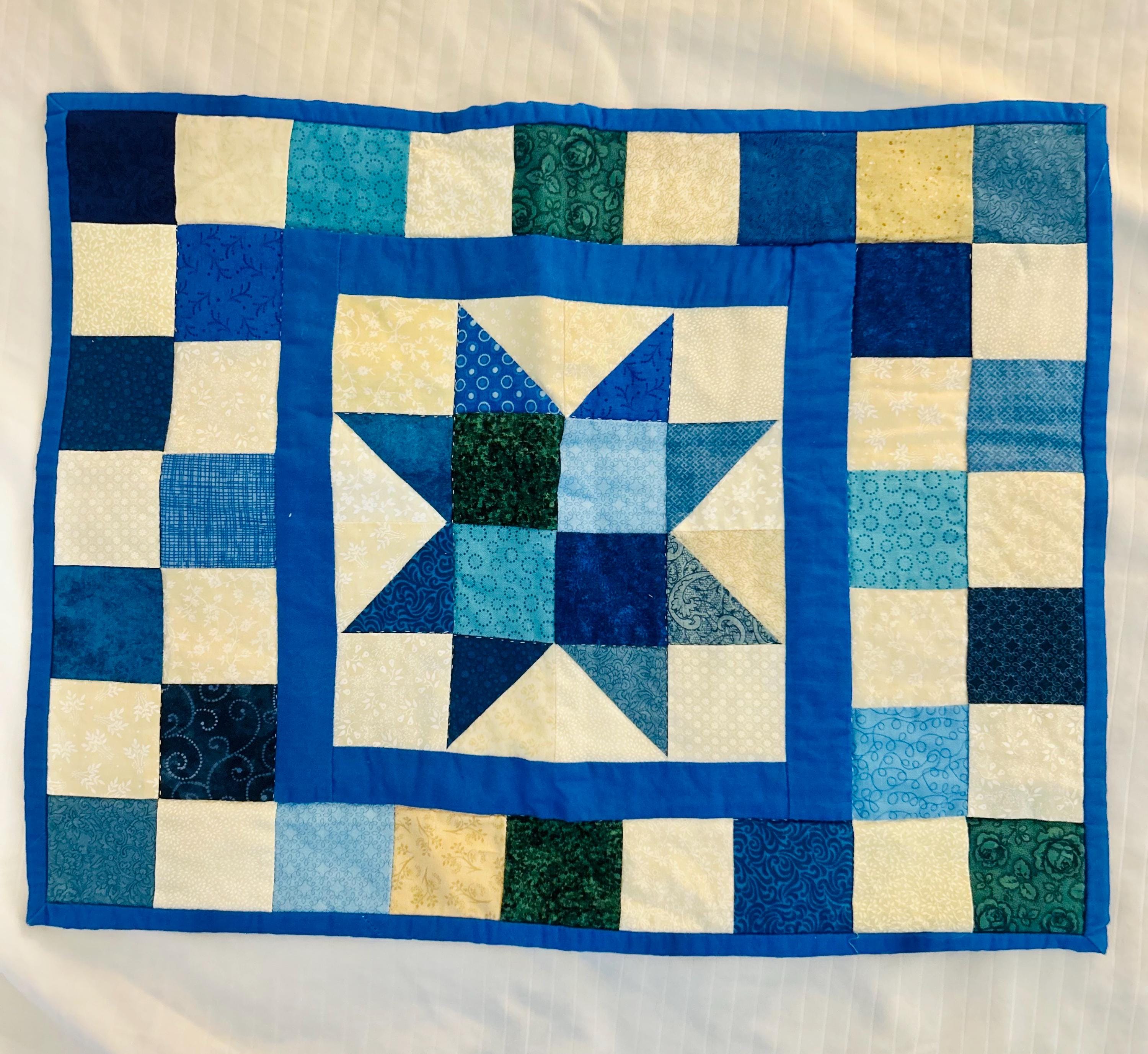 Vintage Star Quilt that can be a table mat or just add a splash of color to your Holiday decor. It is machine stitched and hand-quilted. The back is white cotton and the batting is lightweight.