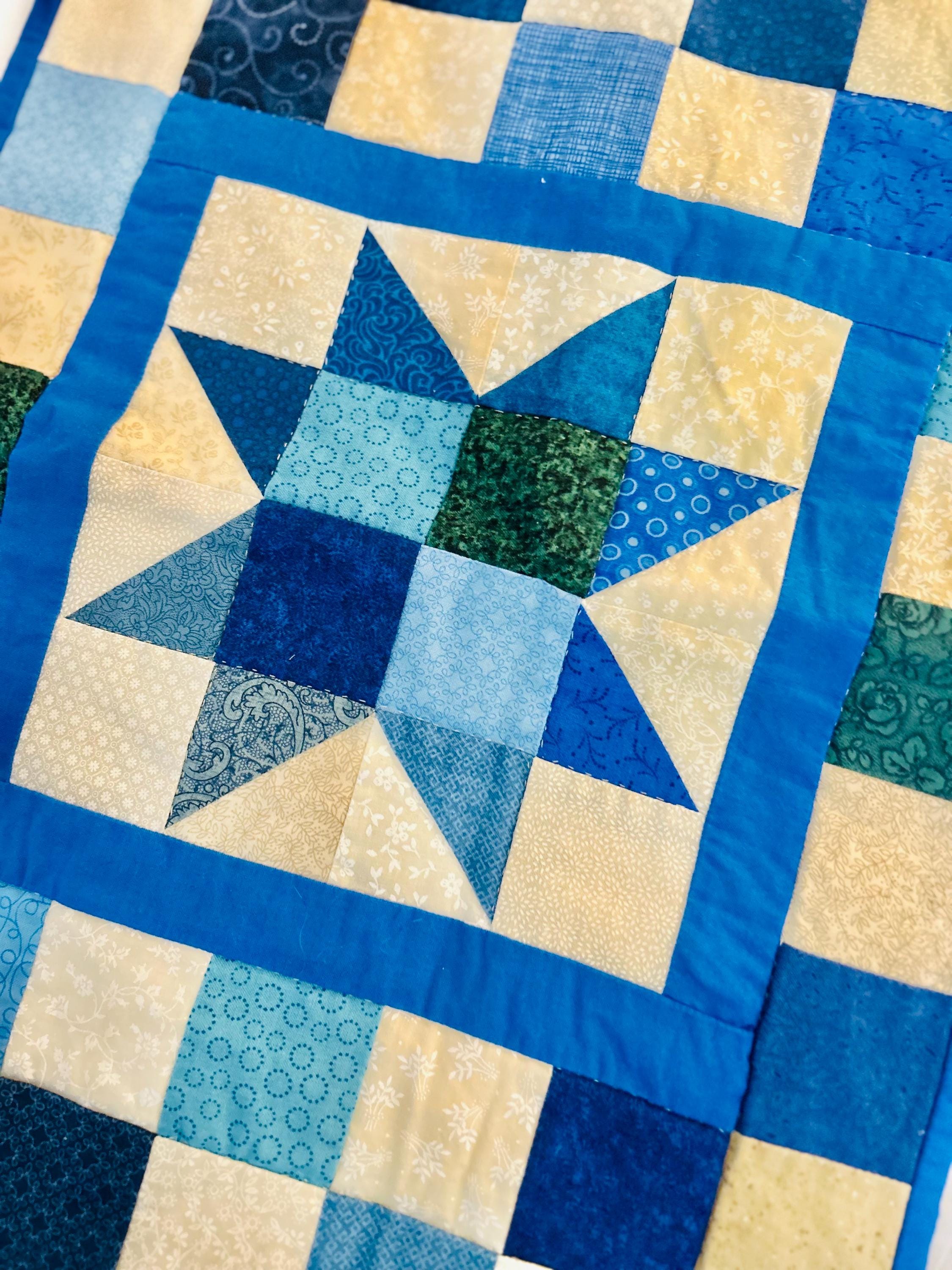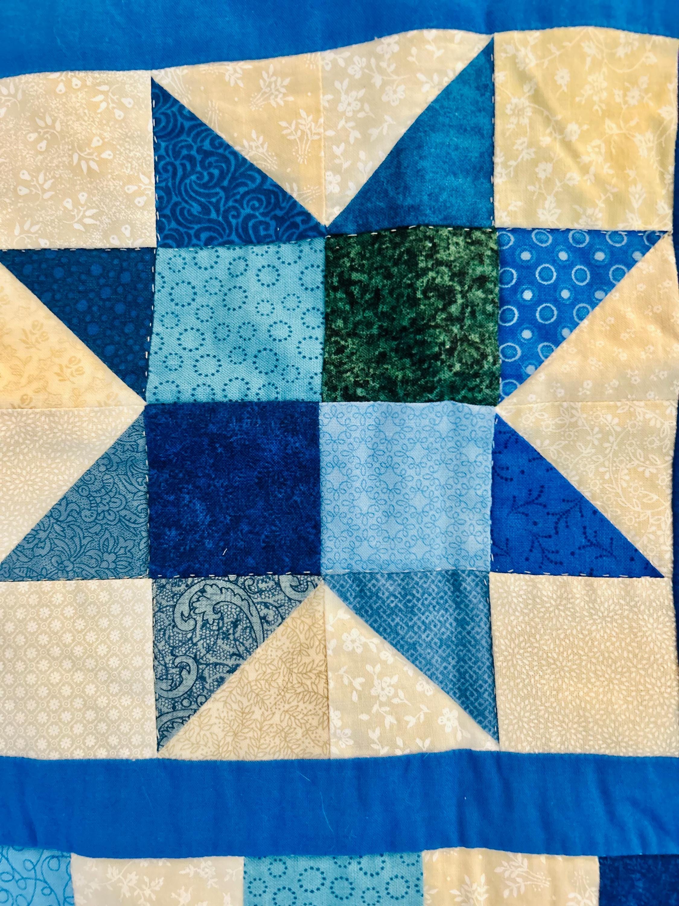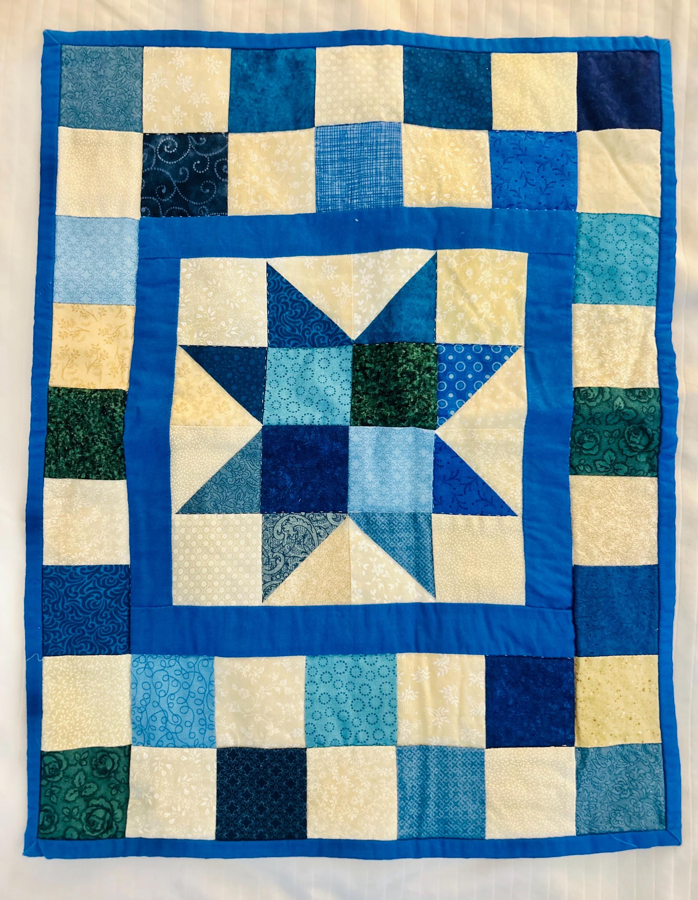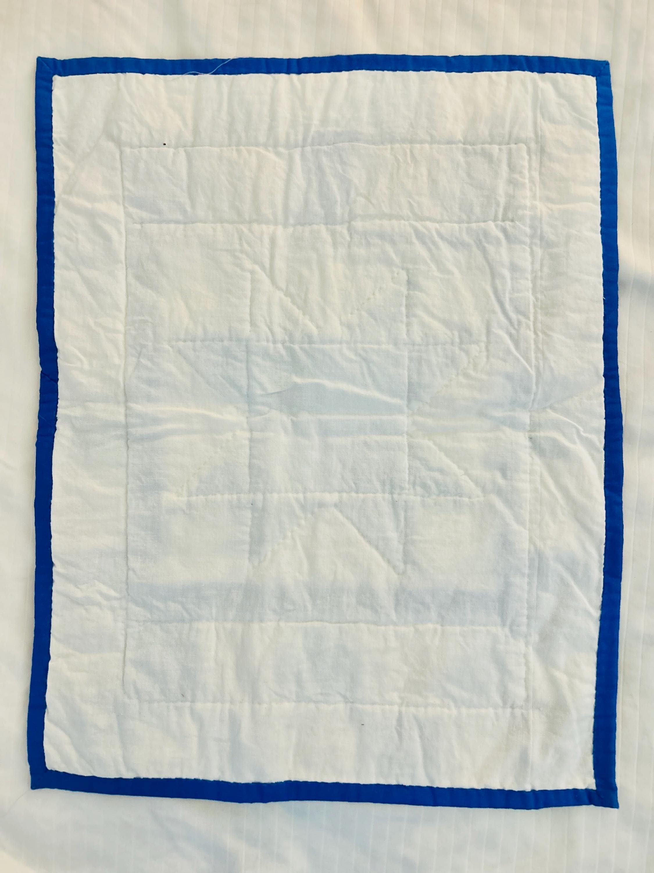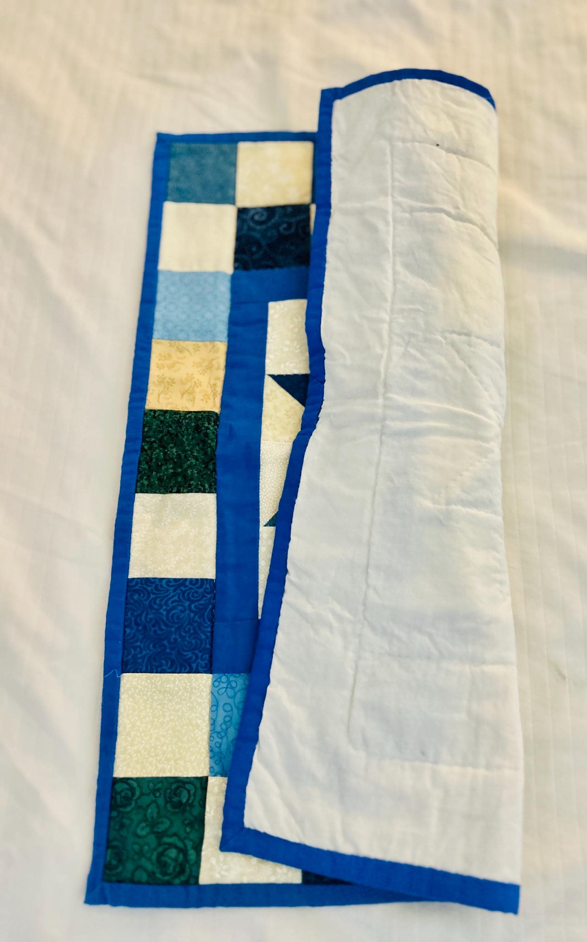 Vintage Star Quilt that can be a table mat or just add a splash of color to your Holiday decor. It is machine stitched and hand-quilted. The back is white cotton and the batting is lightweight.