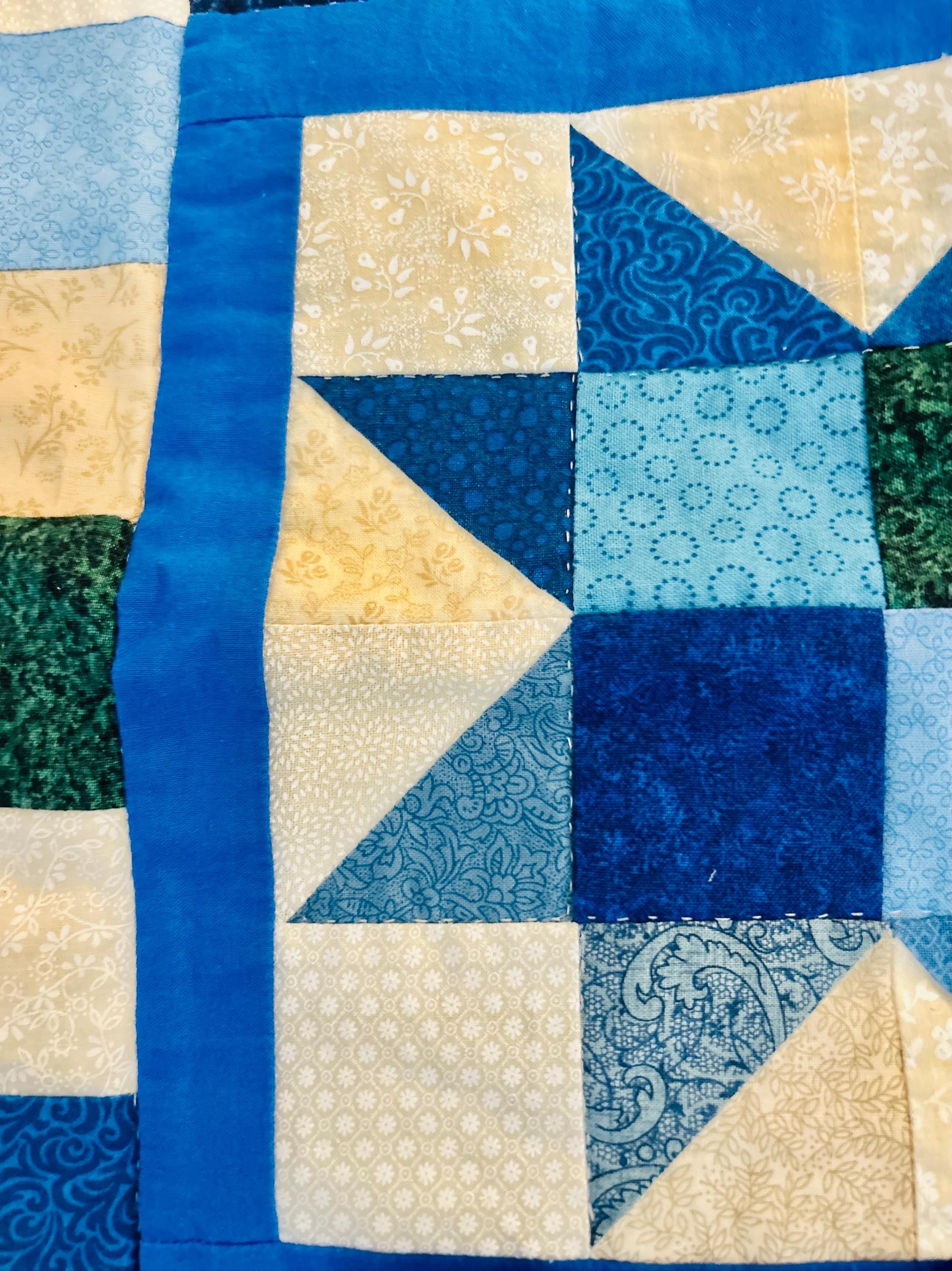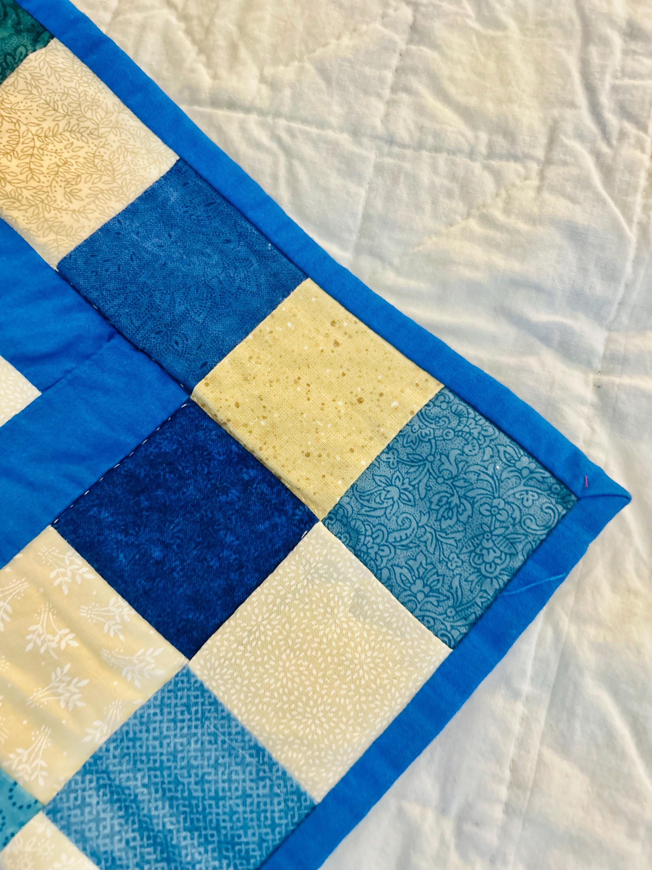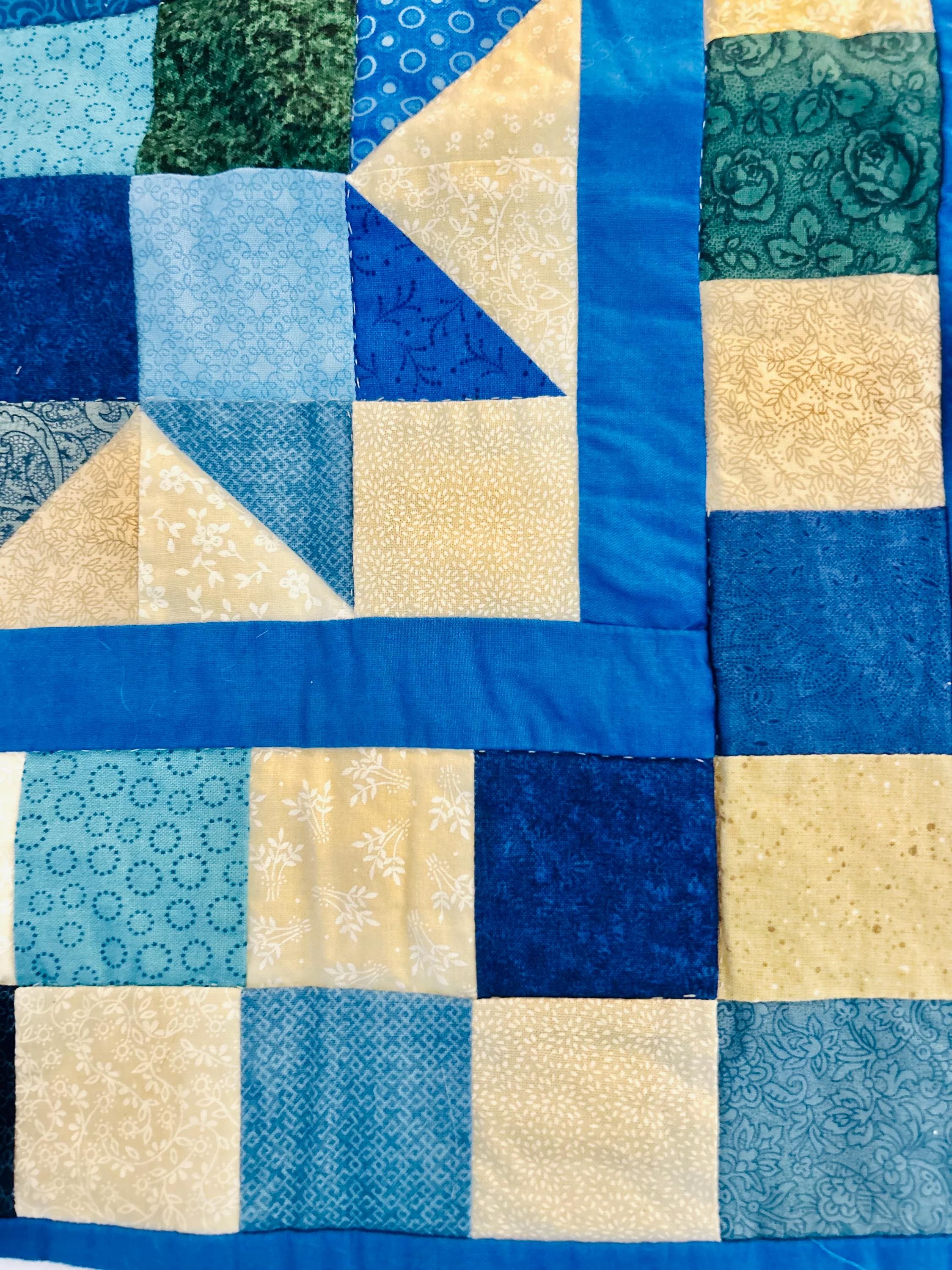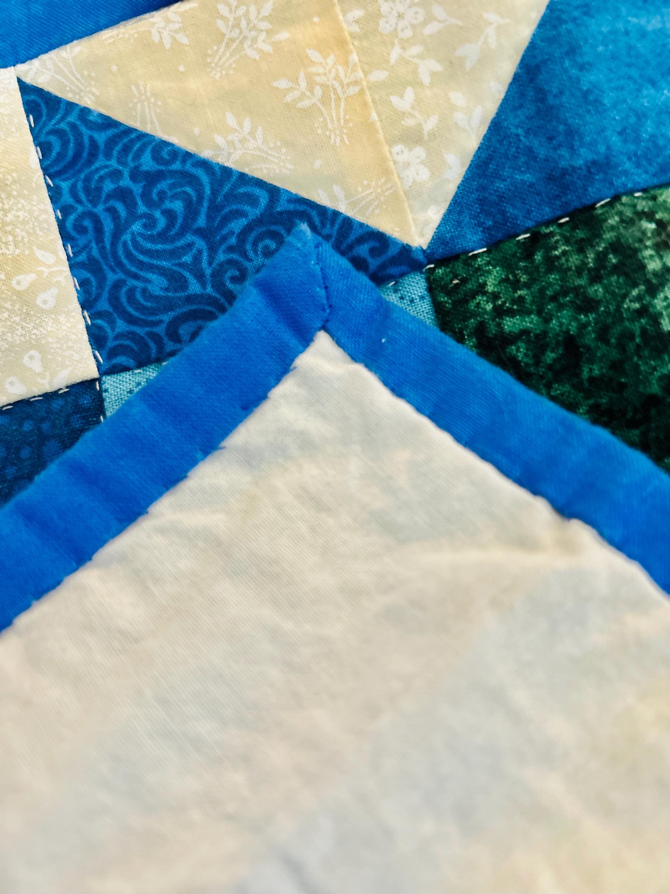 Vintage Star Quilt that can be a table mat or just add a splash of color to your Holiday decor. It is machine stitched and hand-quilted. The back is white cotton and the batting is lightweight.