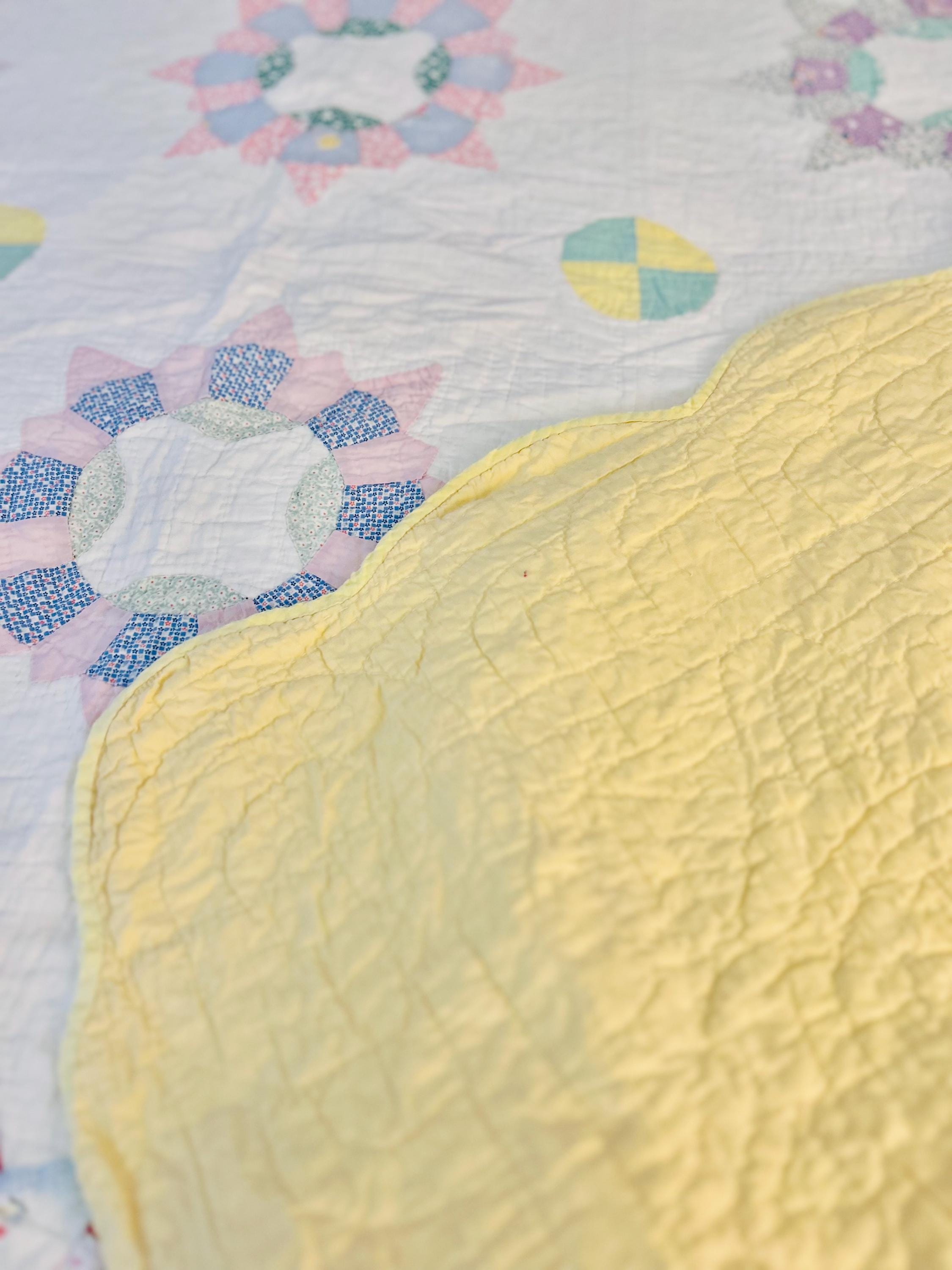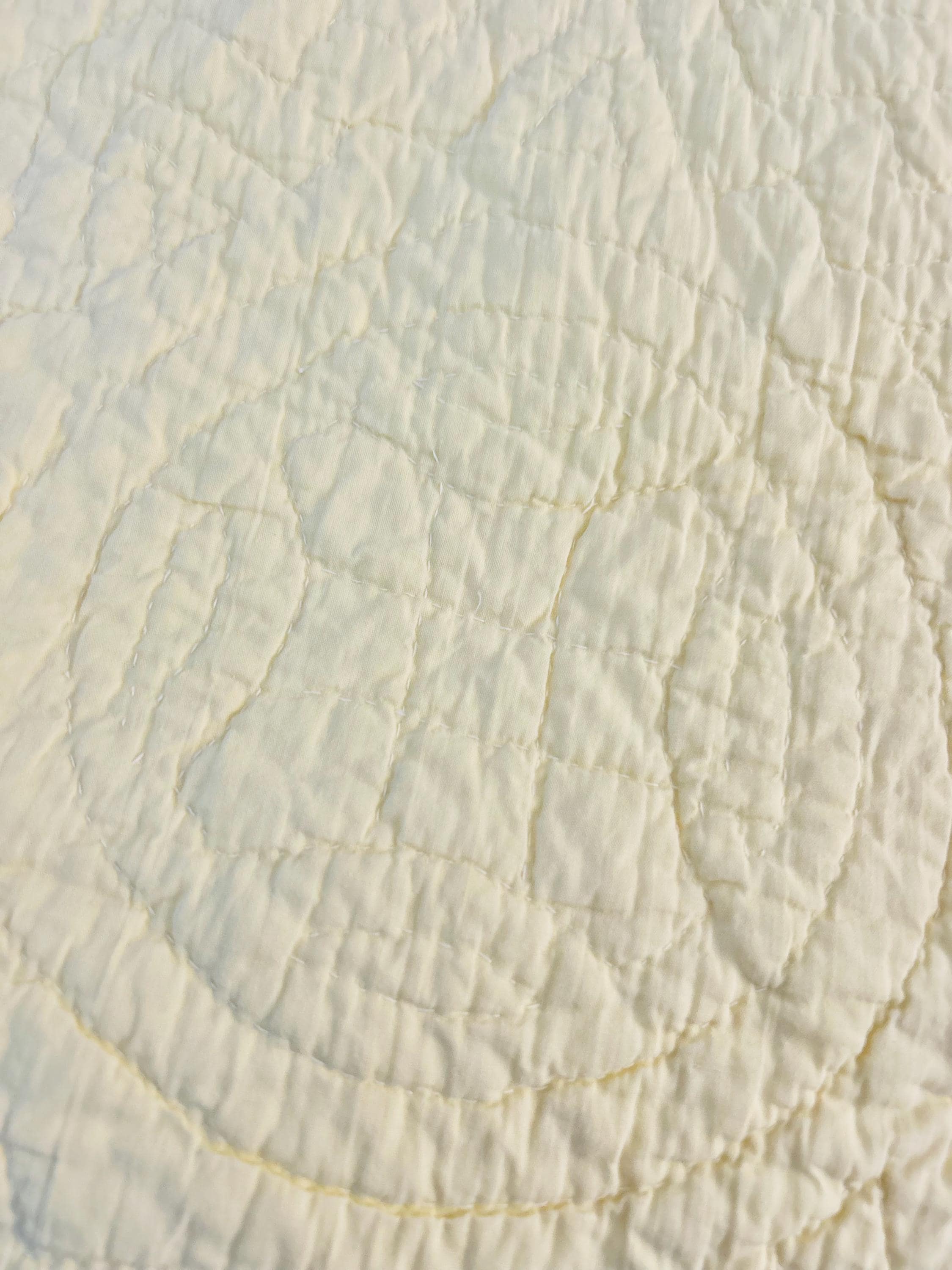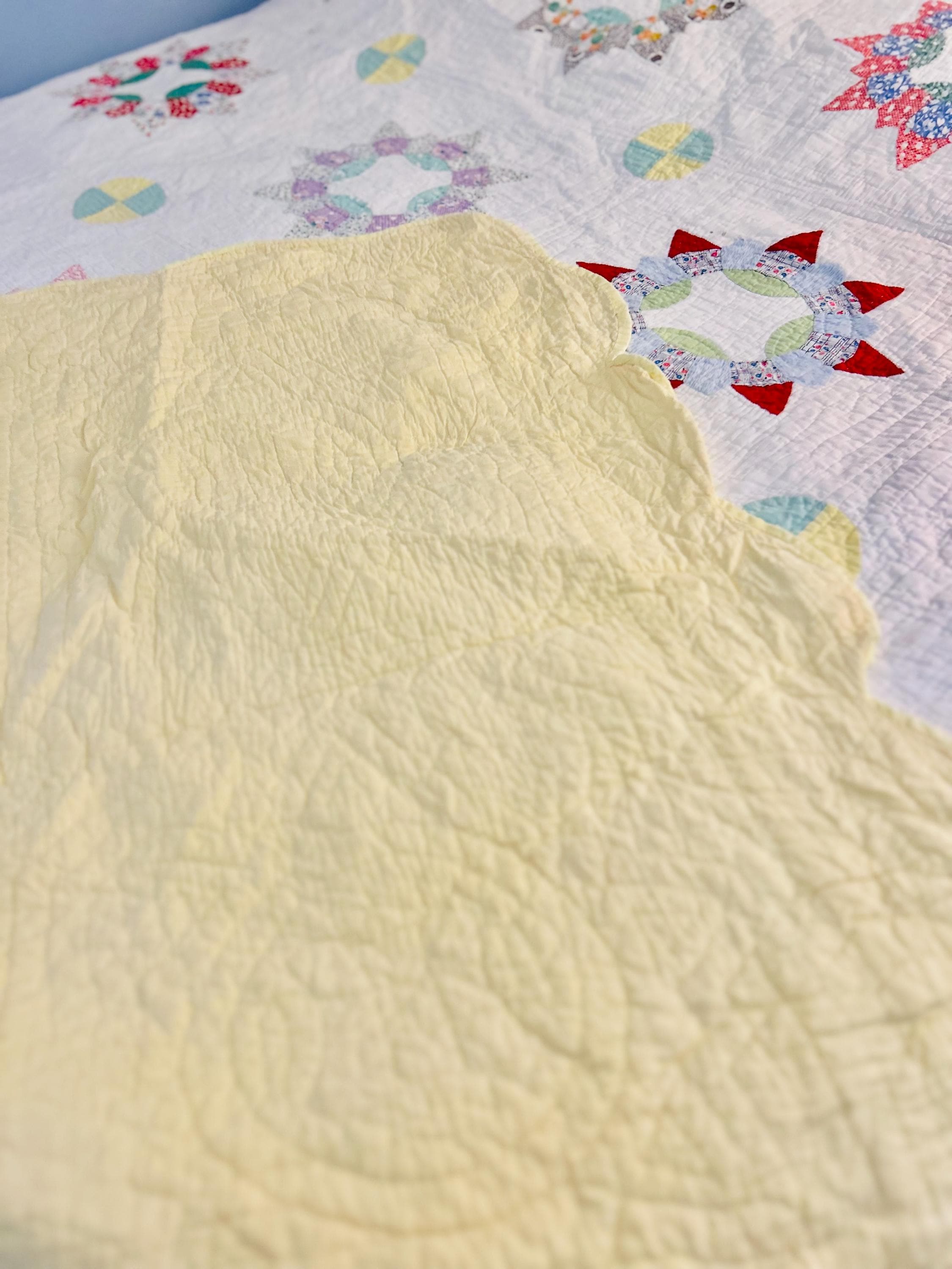 The back is pale yellow cotton as is the binding that has been machine stitched to the front and hand-stitched to the back. The cotton batting is lightweight.