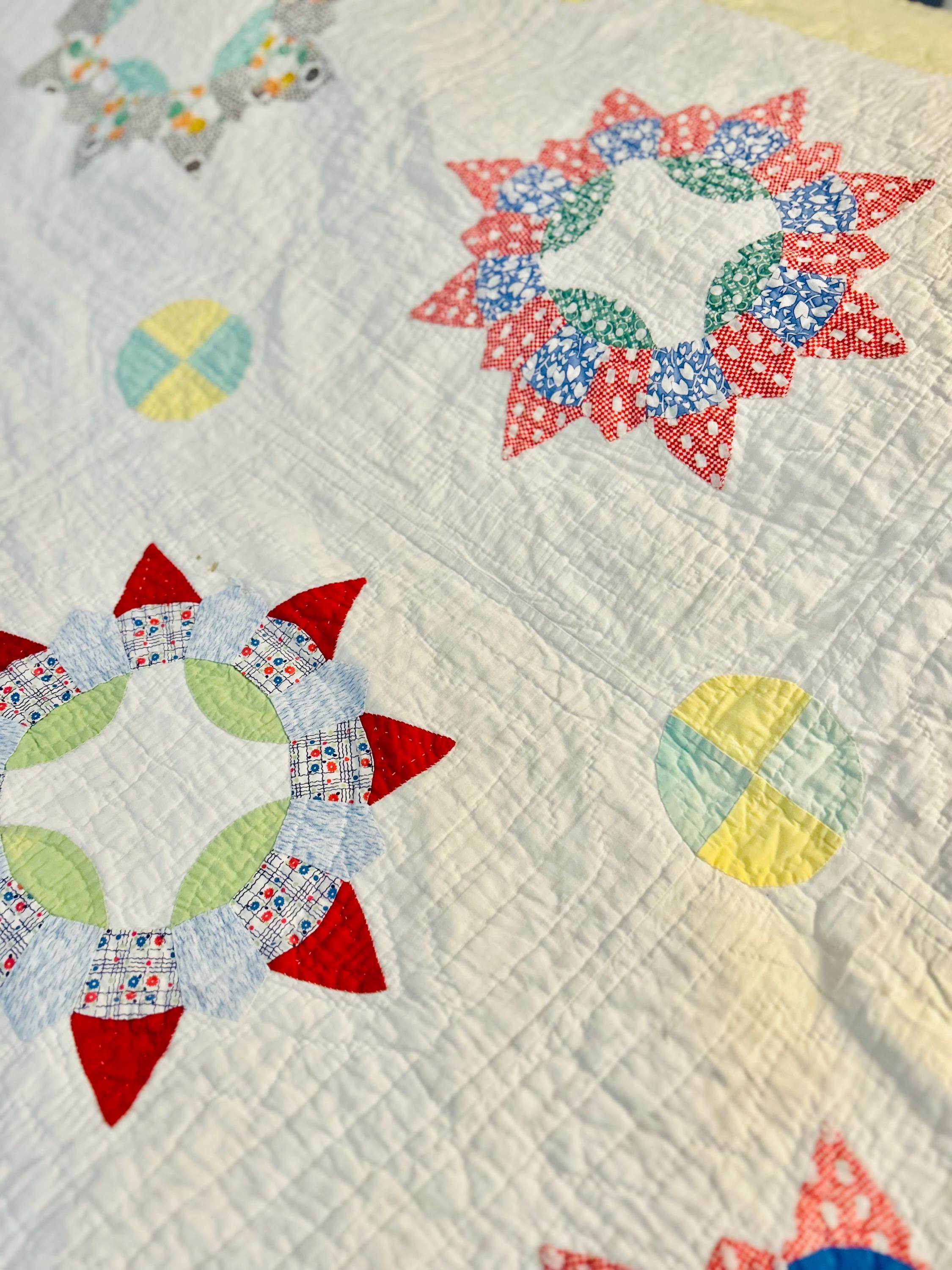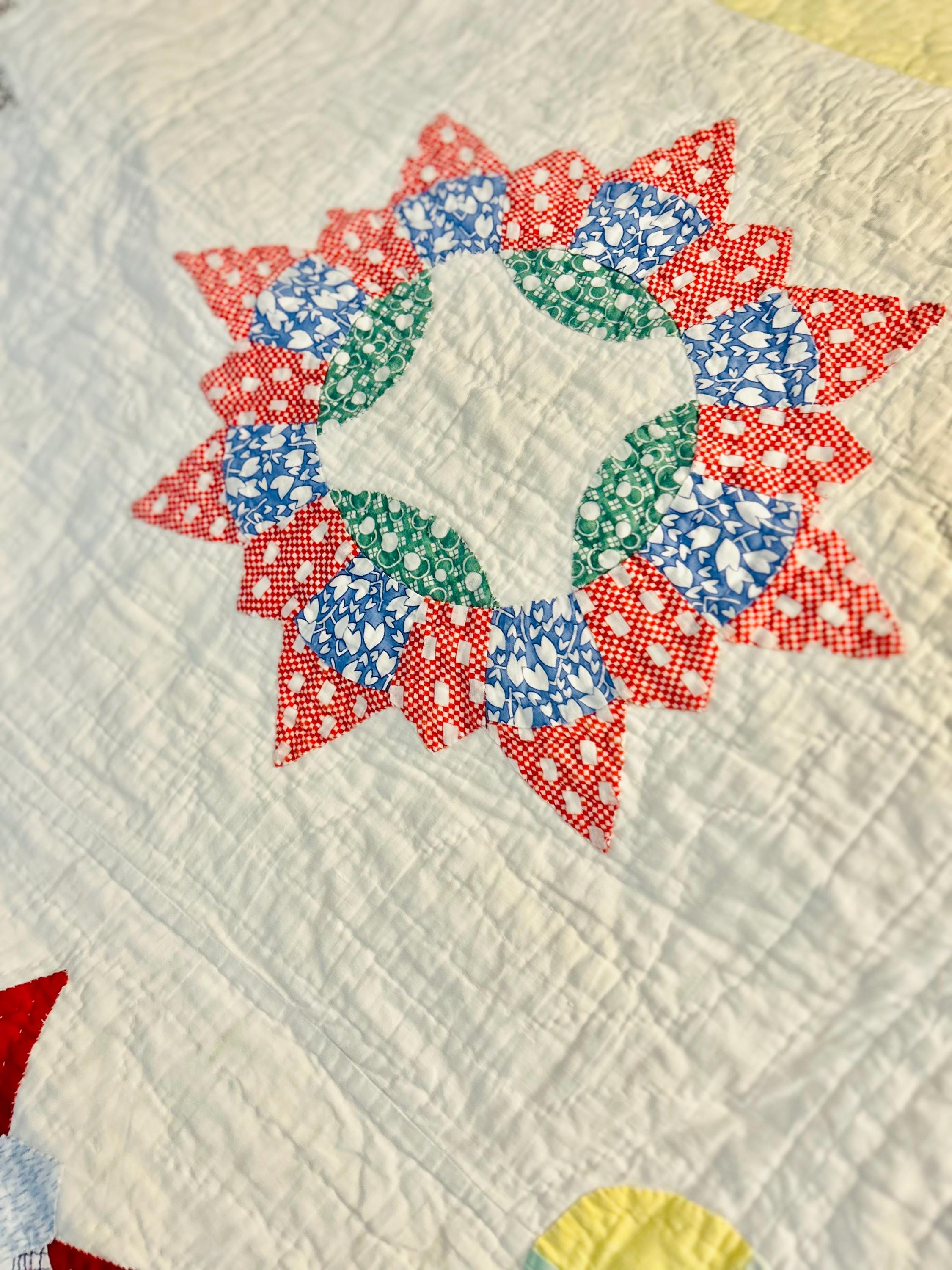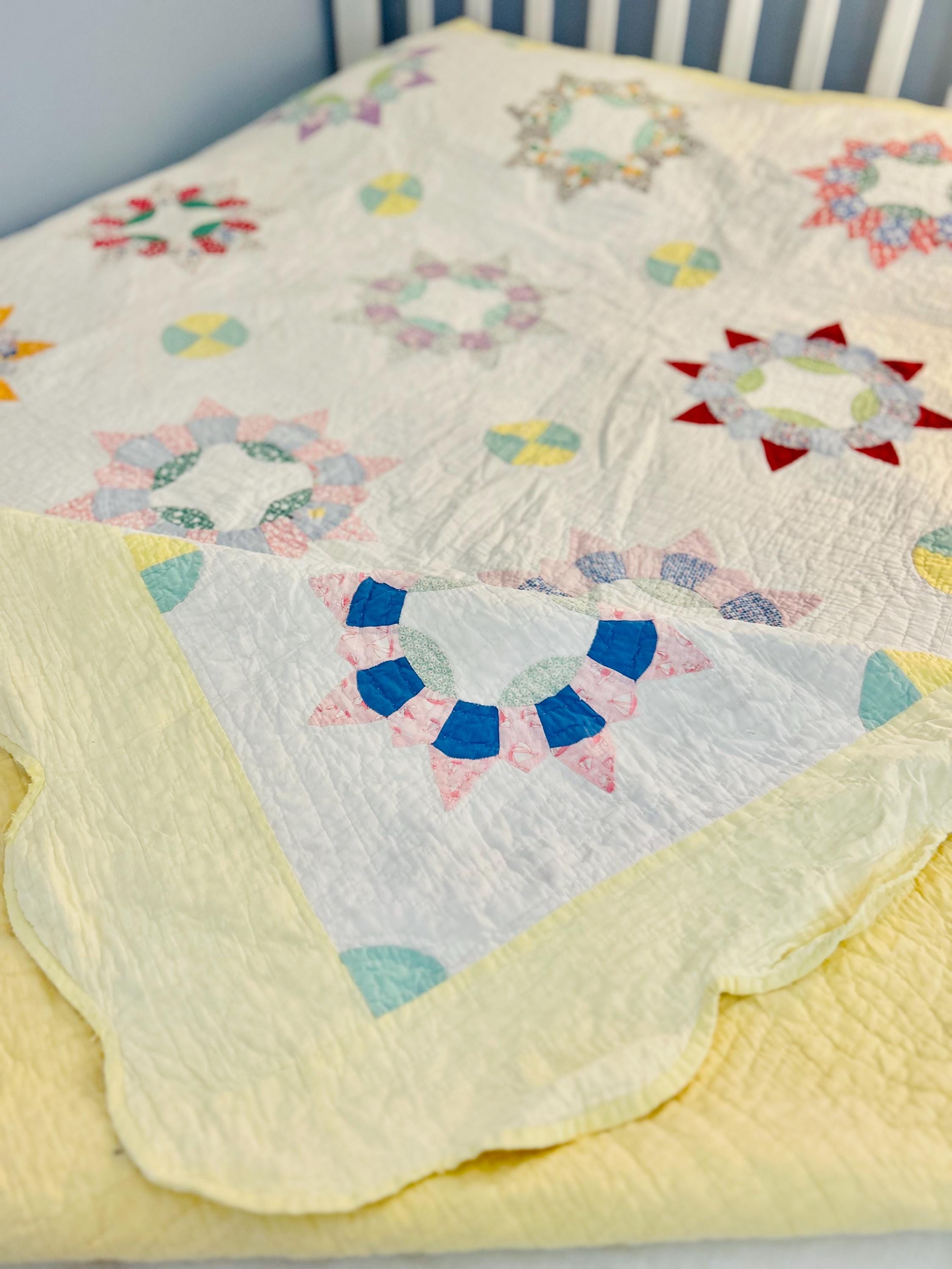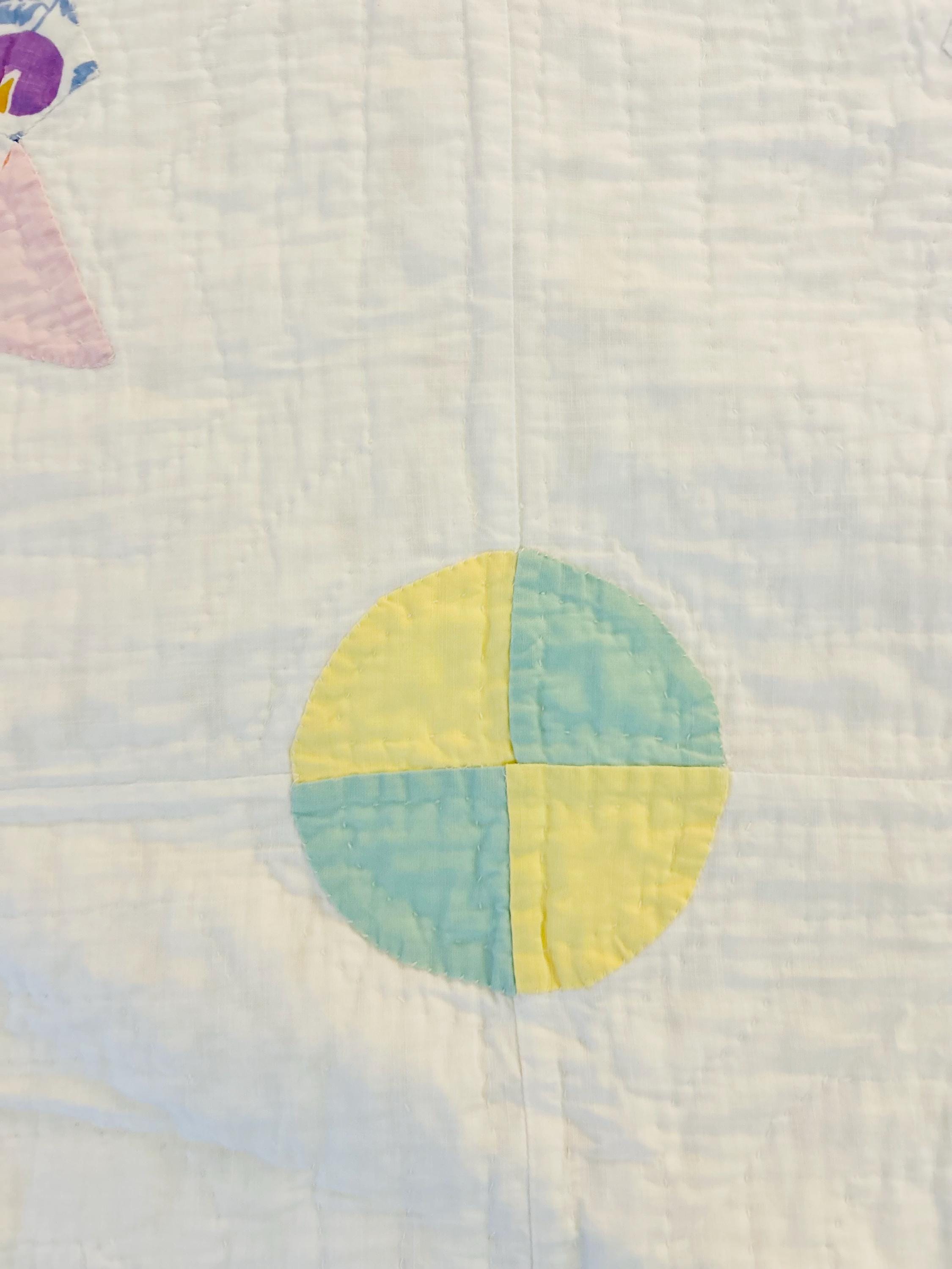 This beautiful Strawberrie Quilt, circa 1930s, features a scrappy collection of feedsack fabrics. Each "Strawberrie" is made from curved melon pieces and triangle points that have been intricately quilted in diamonds and concentric geometric patterns. Scattered between the Strawberrie motifs are cheerful little four-patch circles in yellow, mint and aqua. The four-sided yellow border is quilted in a braided rope pattern.
