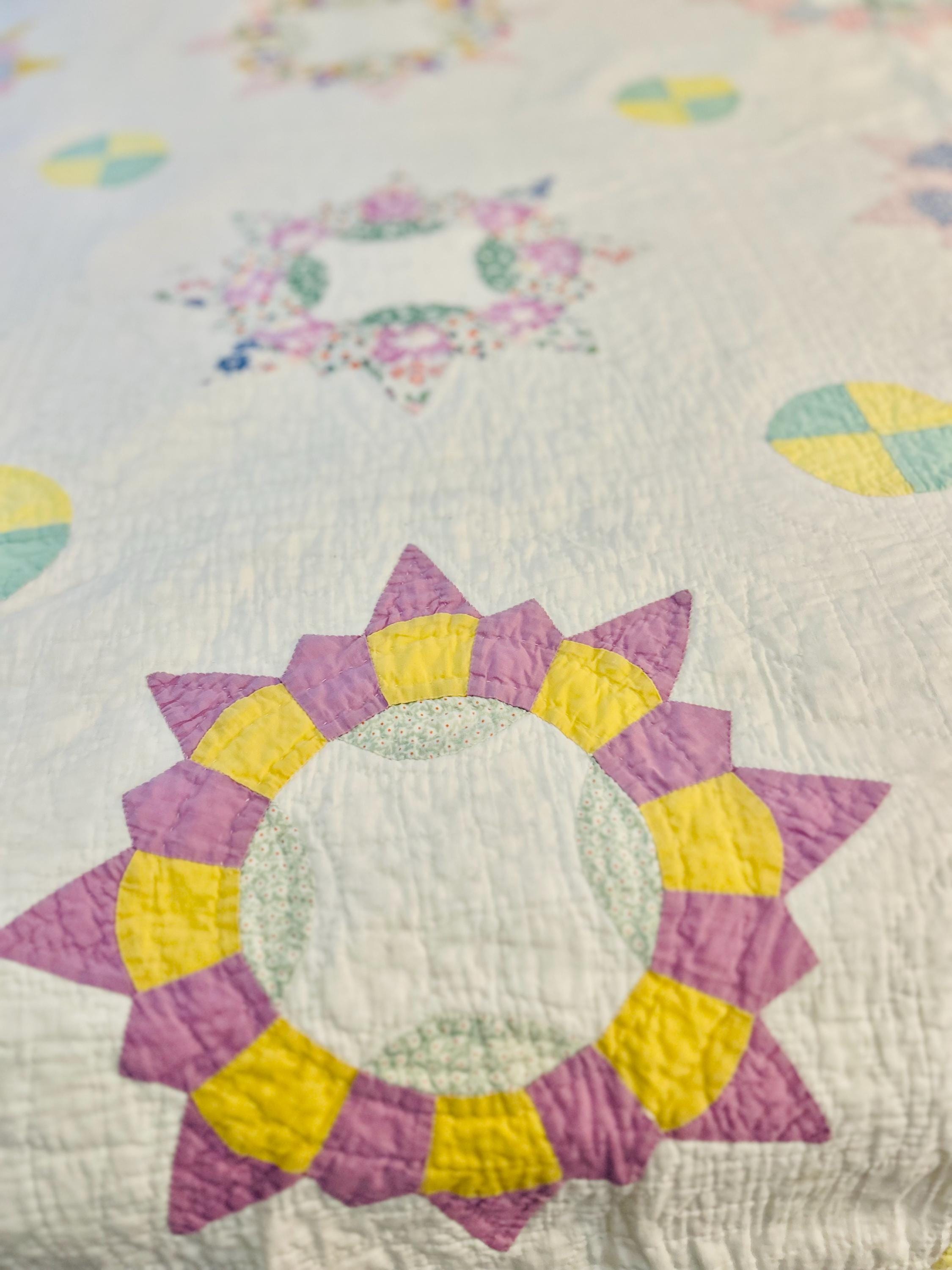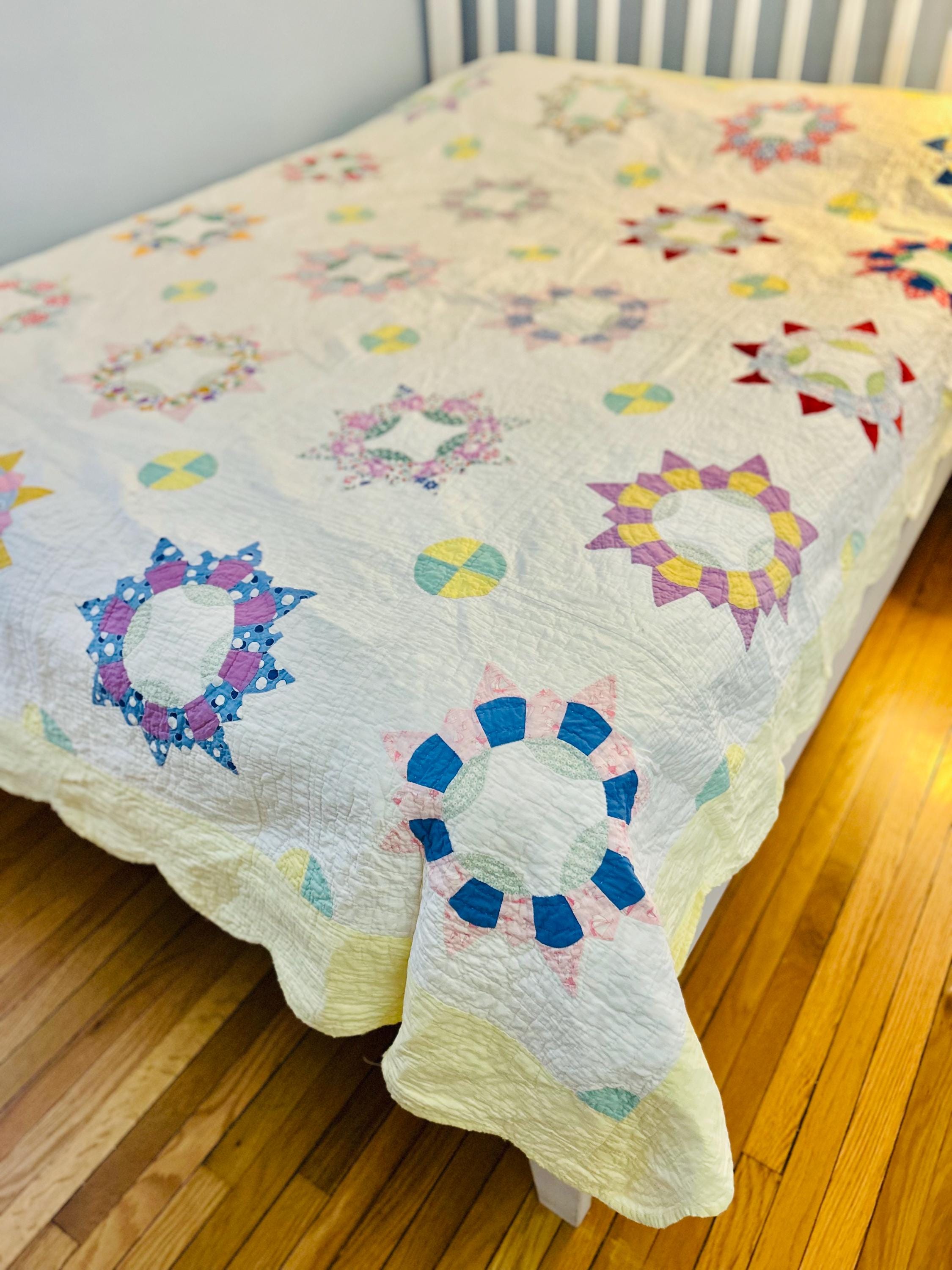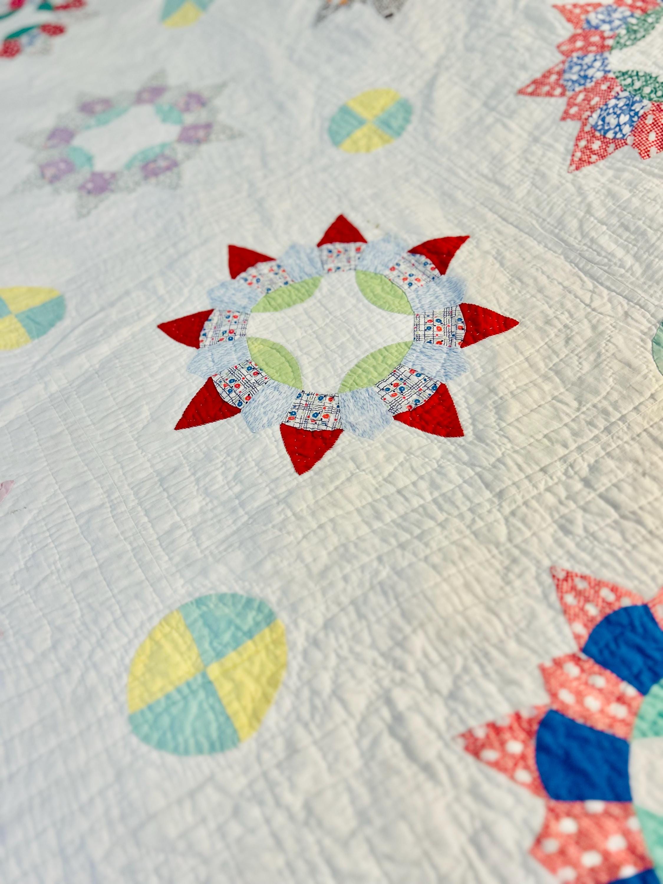 This beautiful Strawberrie Quilt, circa 1930s, features a scrappy collection of feedsack fabrics. Each "Strawberrie" is made from curved melon pieces and triangle points that have been intricately quilted in diamonds and concentric geometric patterns. Scattered between the Strawberrie motifs are cheerful little four-patch circles in yellow, mint and aqua. The four-sided yellow border is quilted in a braided rope pattern.