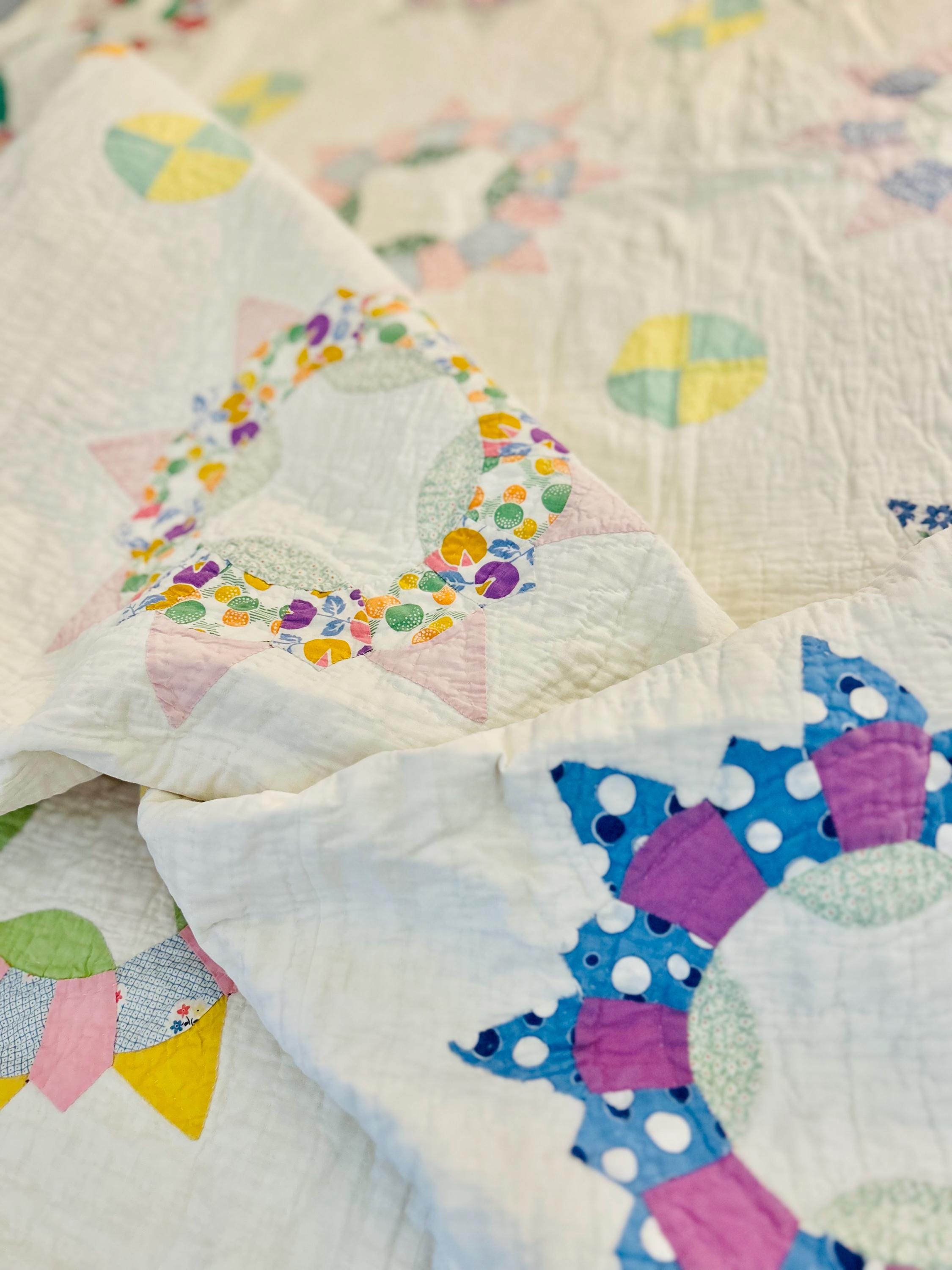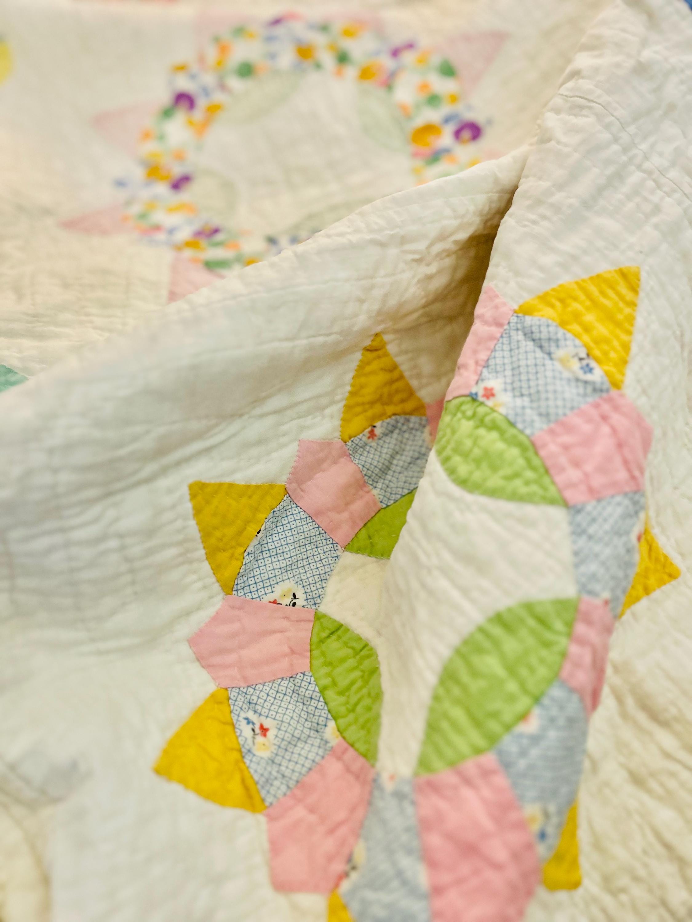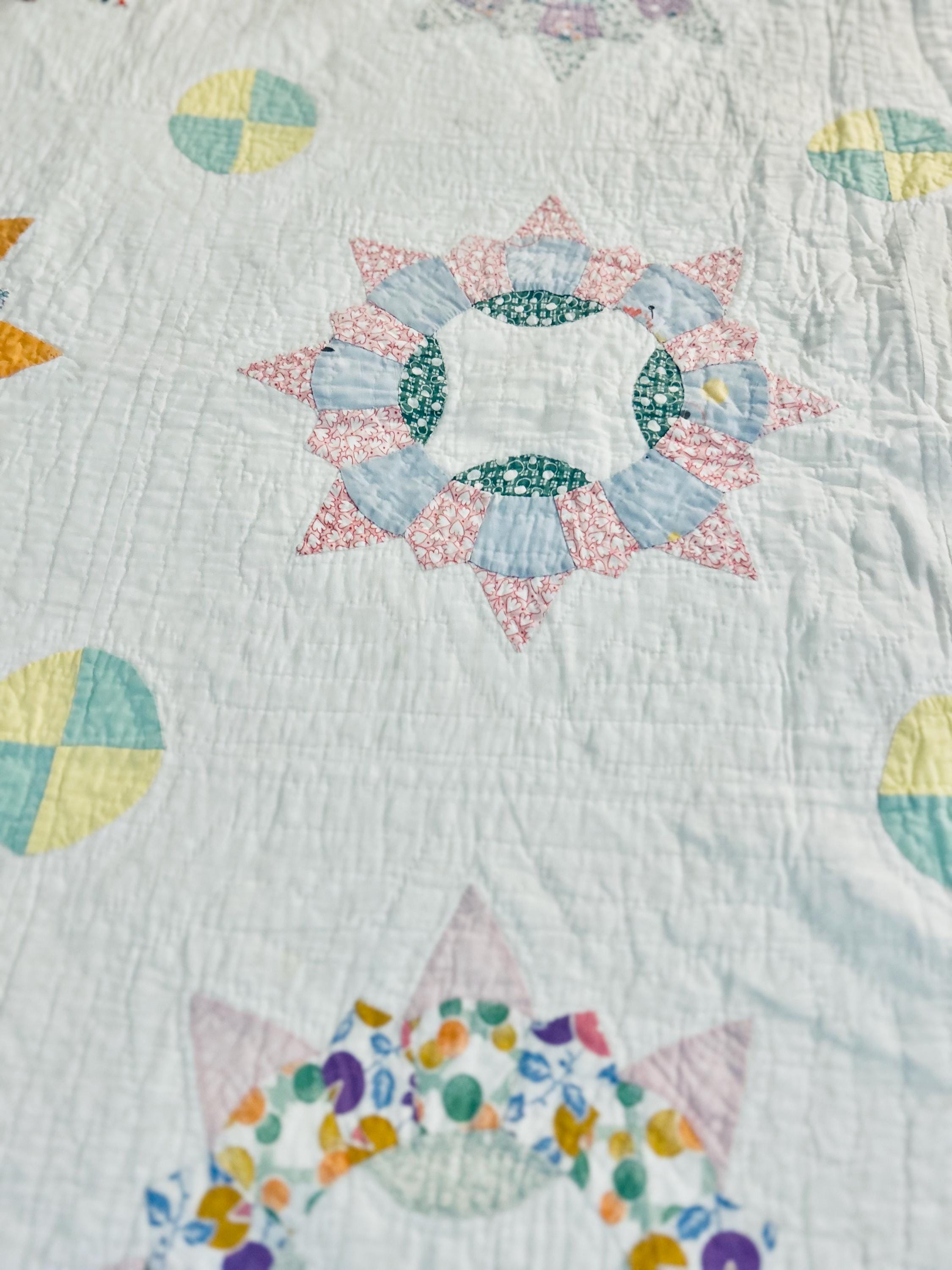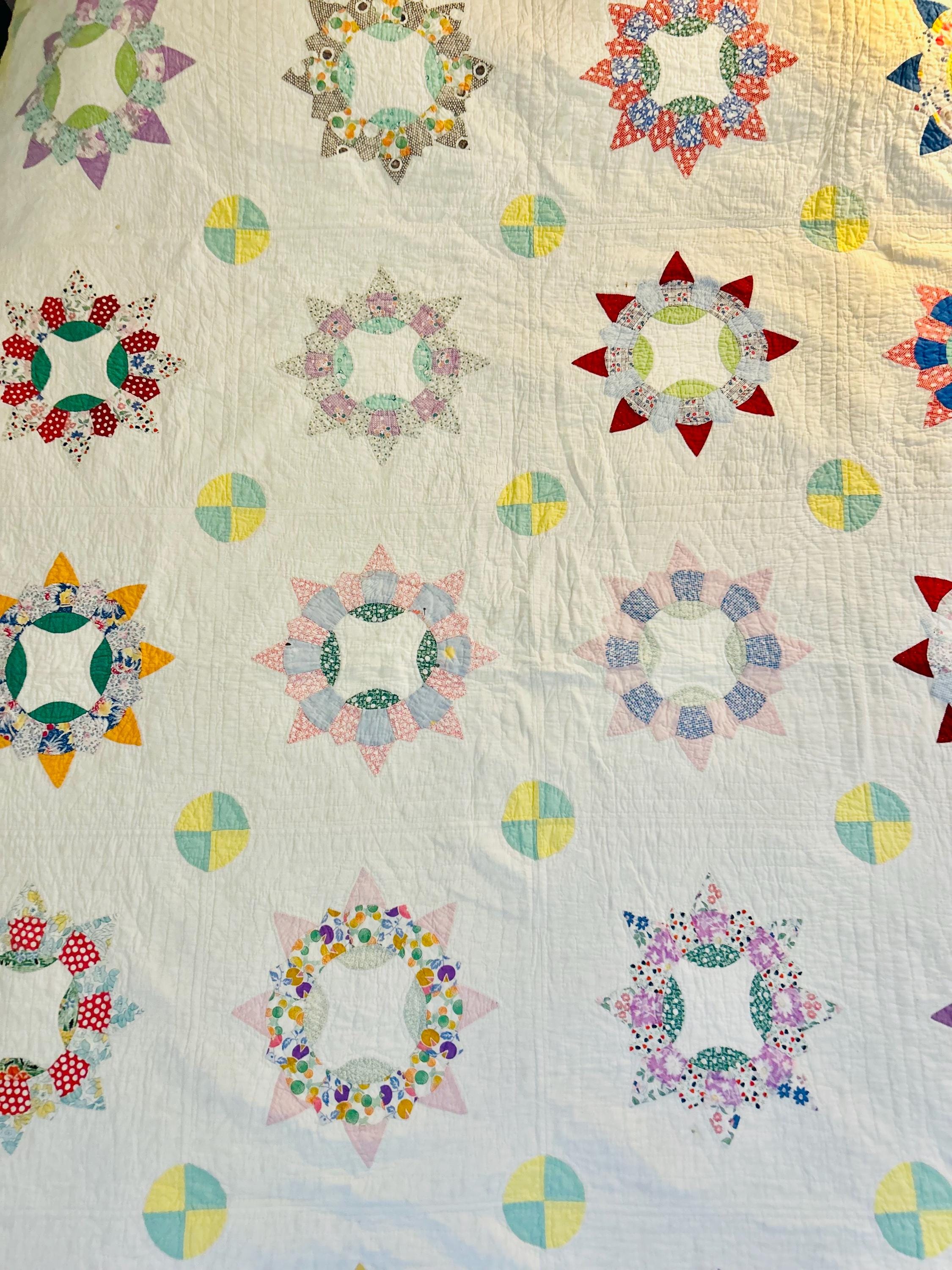 This beautiful Strawberrie Quilt, circa 1930s, features a scrappy collection of feedsack fabrics. Each "Strawberrie" is made from curved melon pieces and triangle points that have been intricately quilted in diamonds and concentric geometric patterns. Scattered between the Strawberrie motifs are cheerful little four-patch circles in yellow, mint and aqua. The four-sided yellow border is quilted in a braided rope pattern.