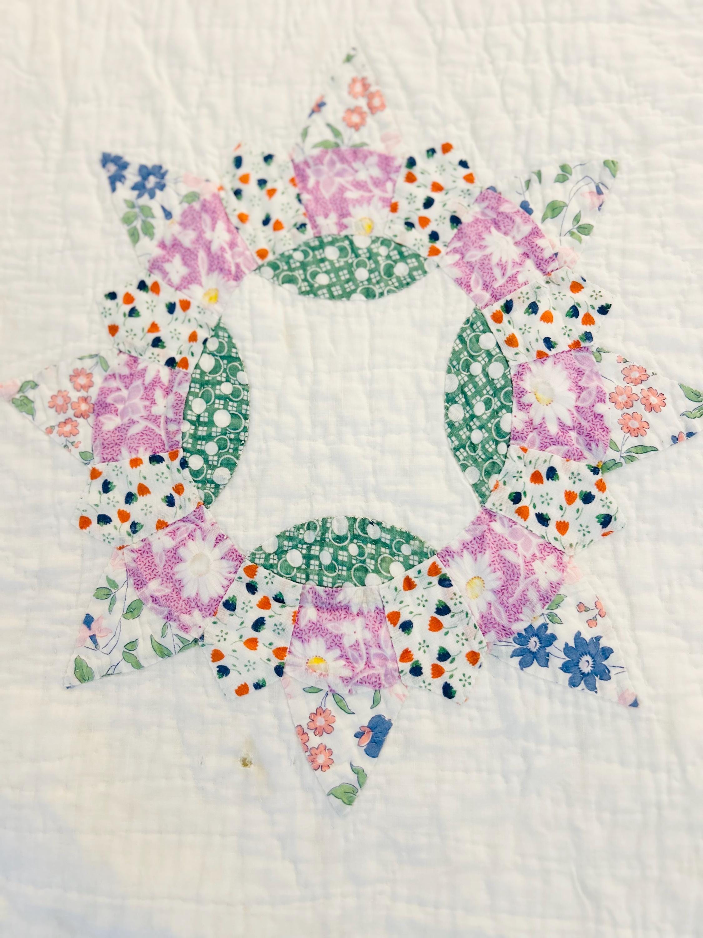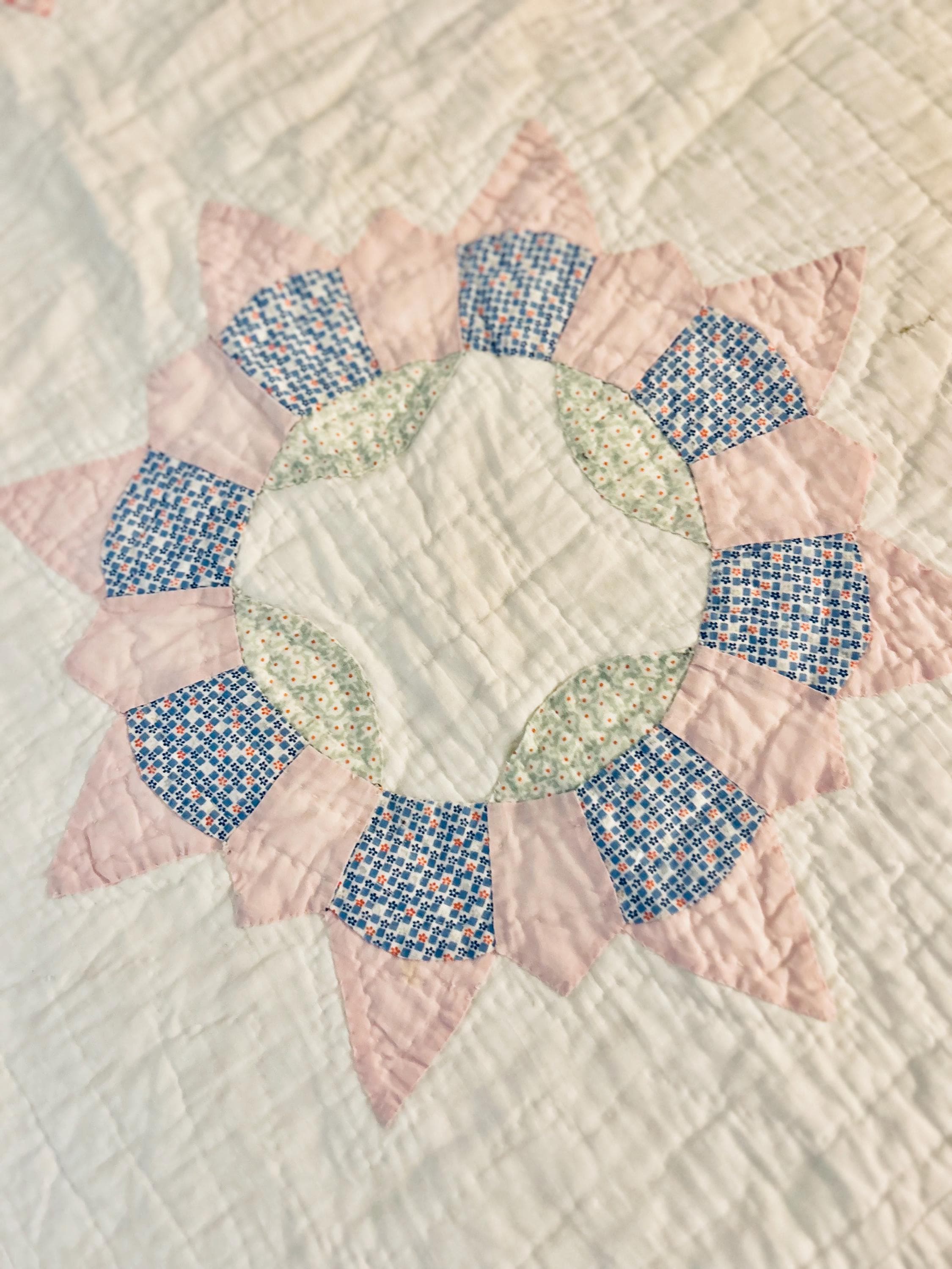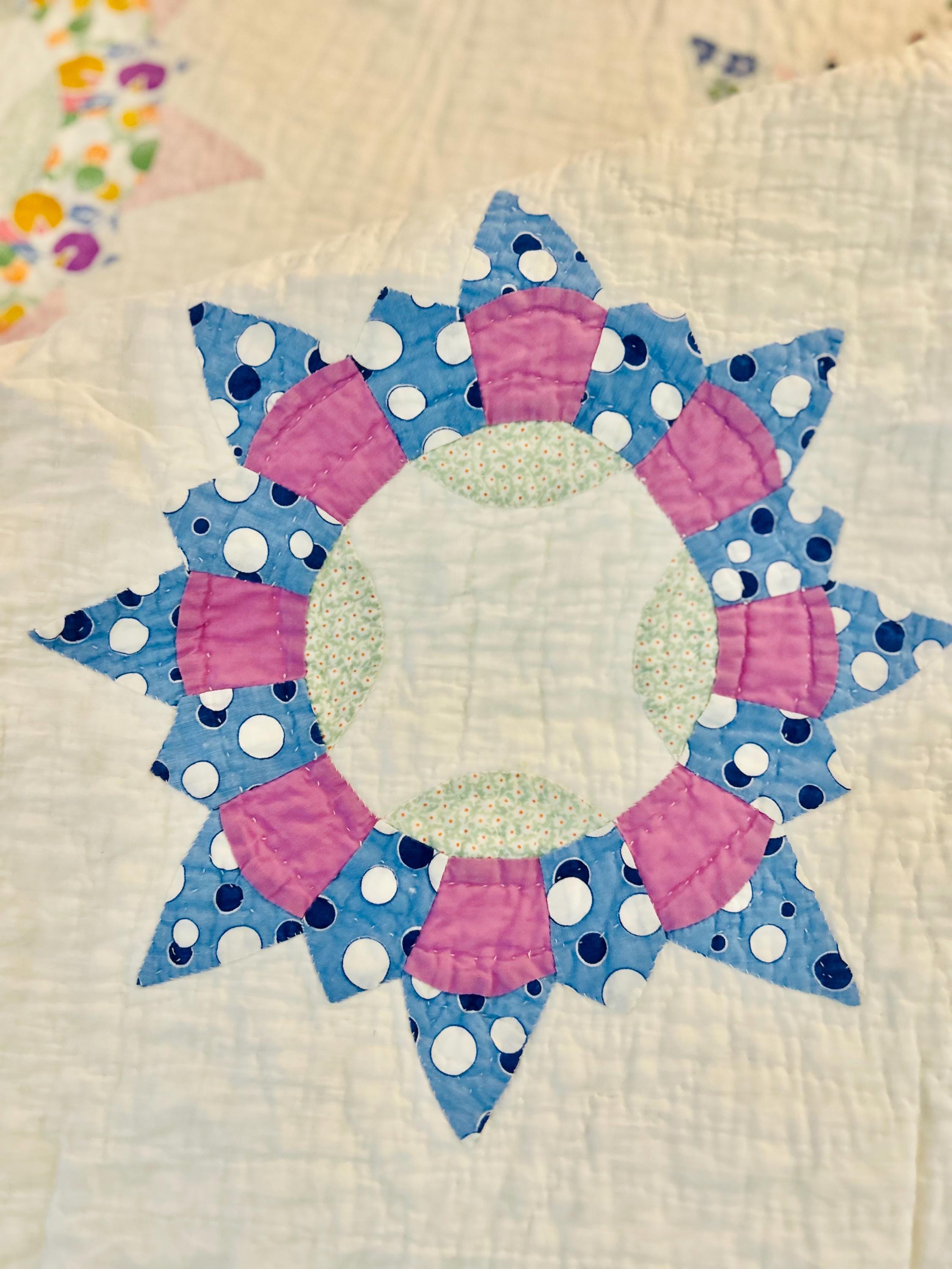 The quilt is in very good condition with age-related fading of the fabrics, two tiny (less than 1/8 inch) tan dots on the front and a fraying binding.