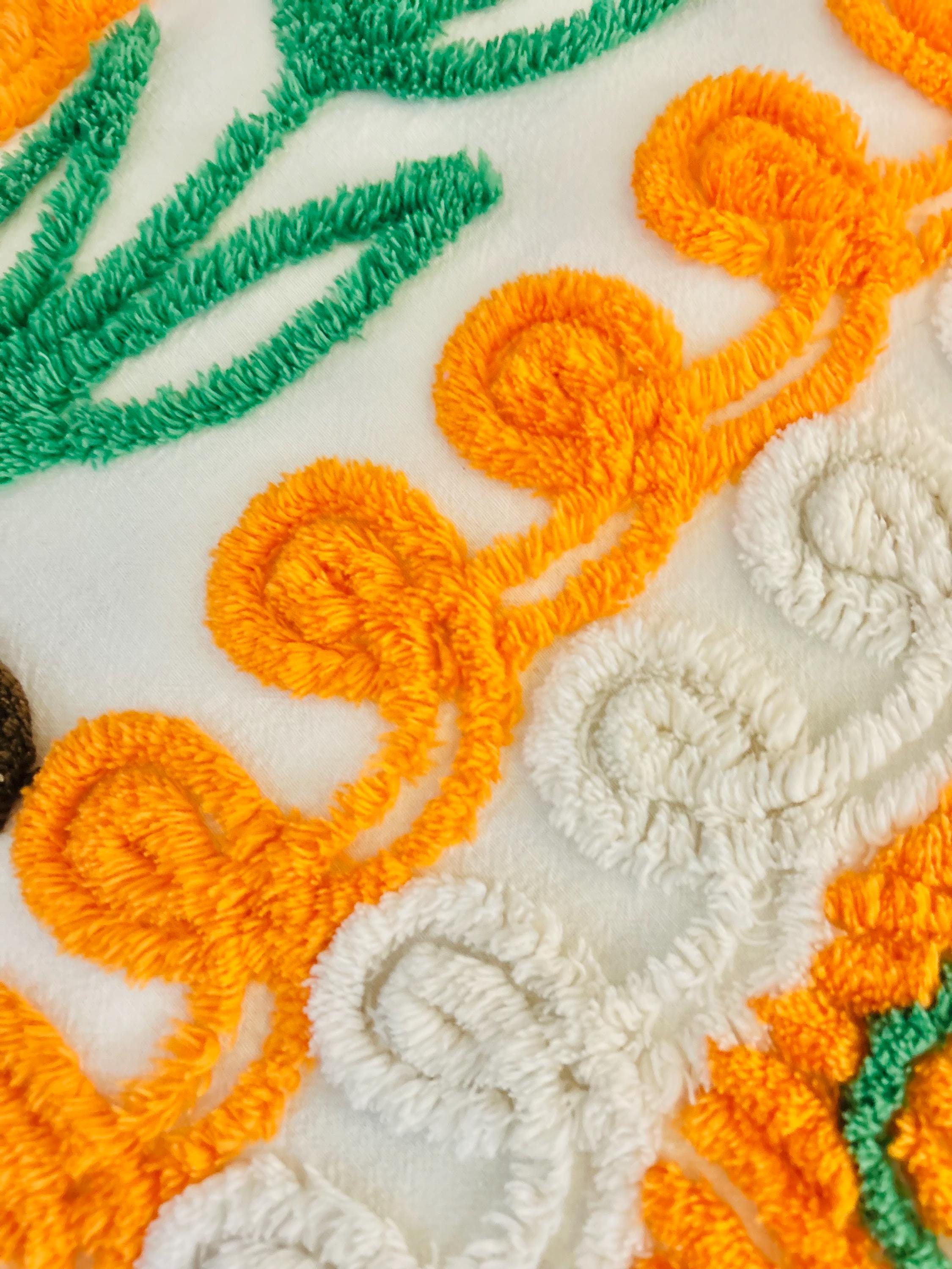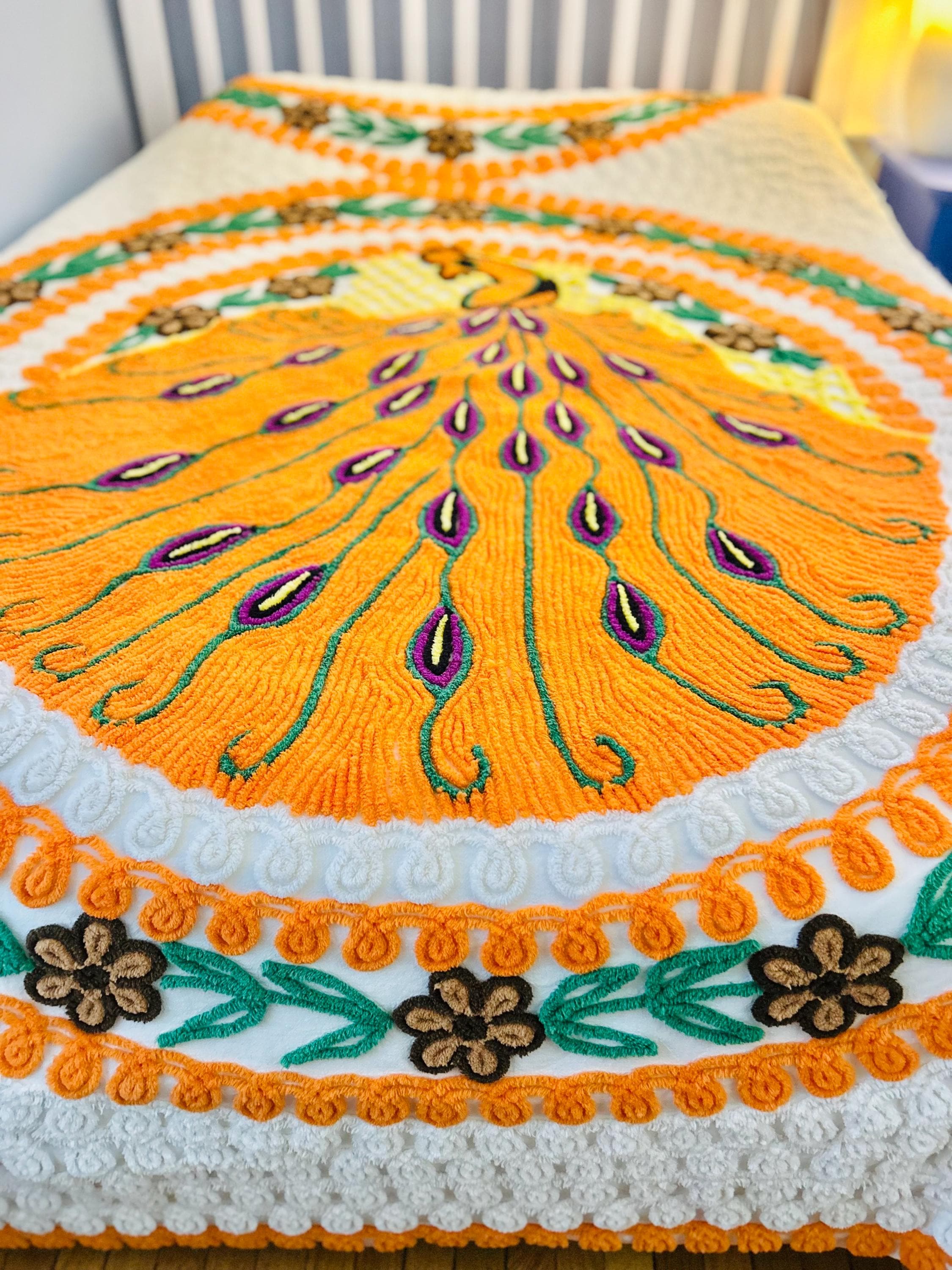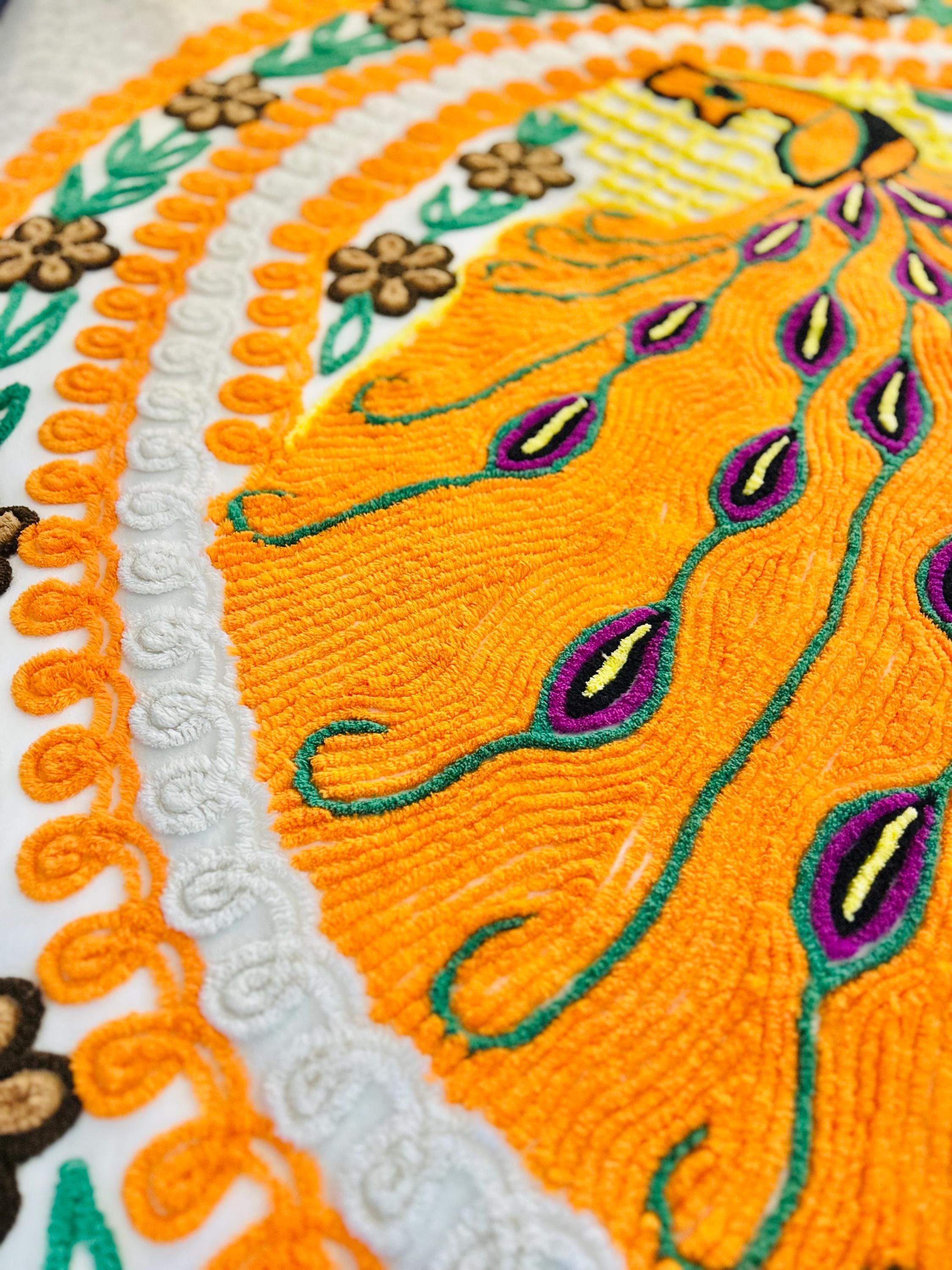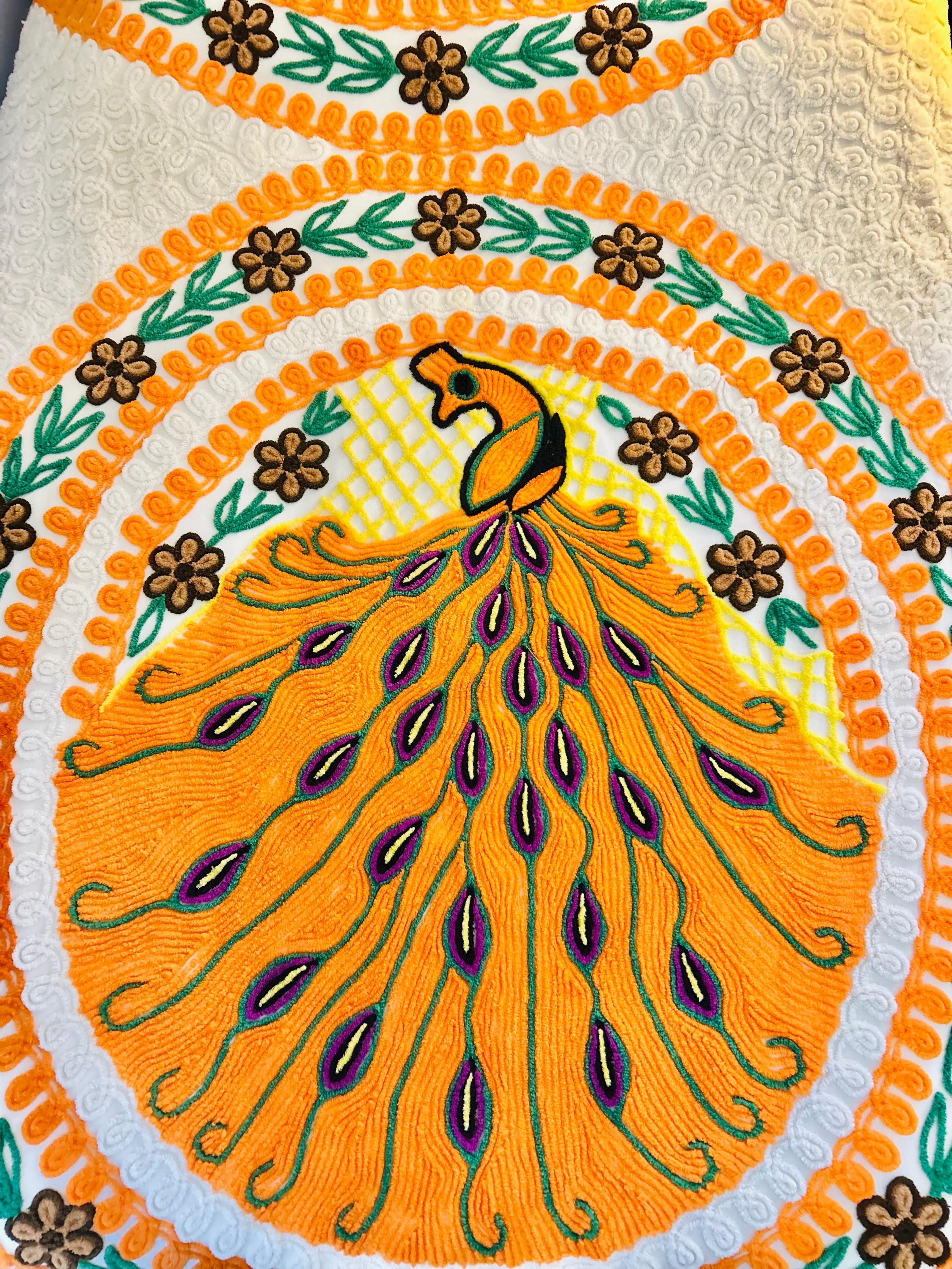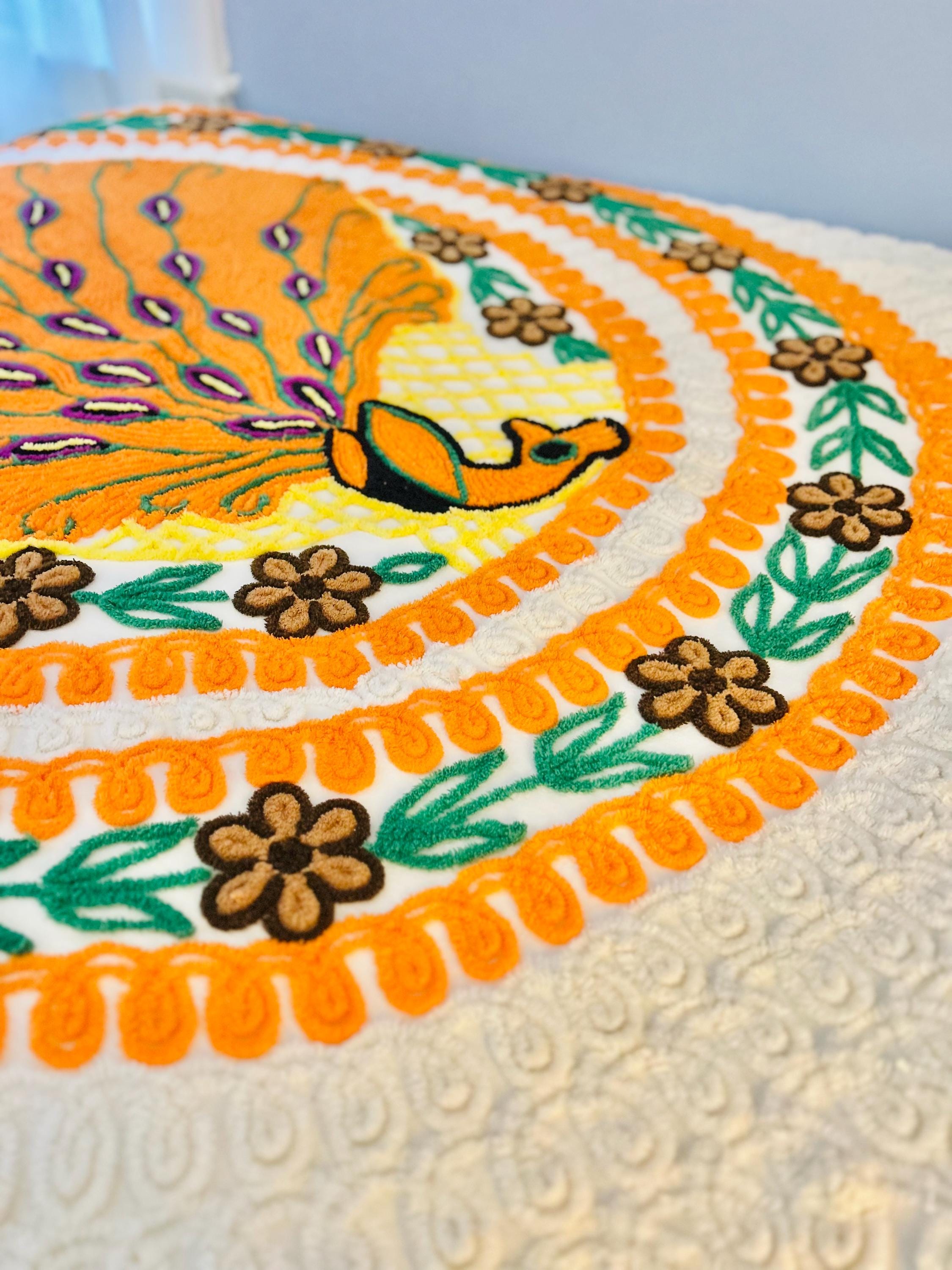 Such a soft and fluffy Peacock Chenille bedspread, circa 1950s. It is also bright all over with no bald spots, holes or stains. The top is straight across while the bottom two edges are curved (see photos).