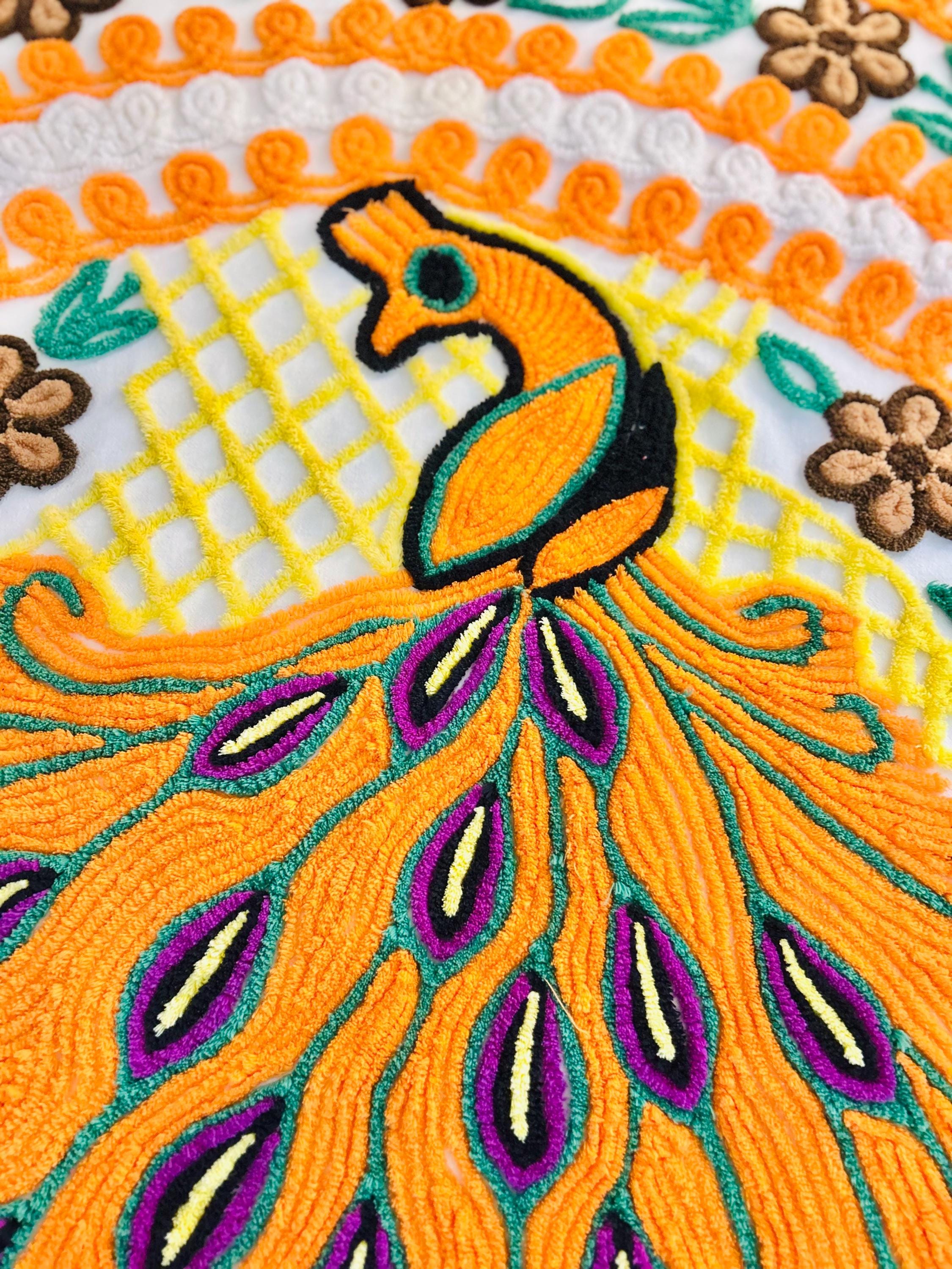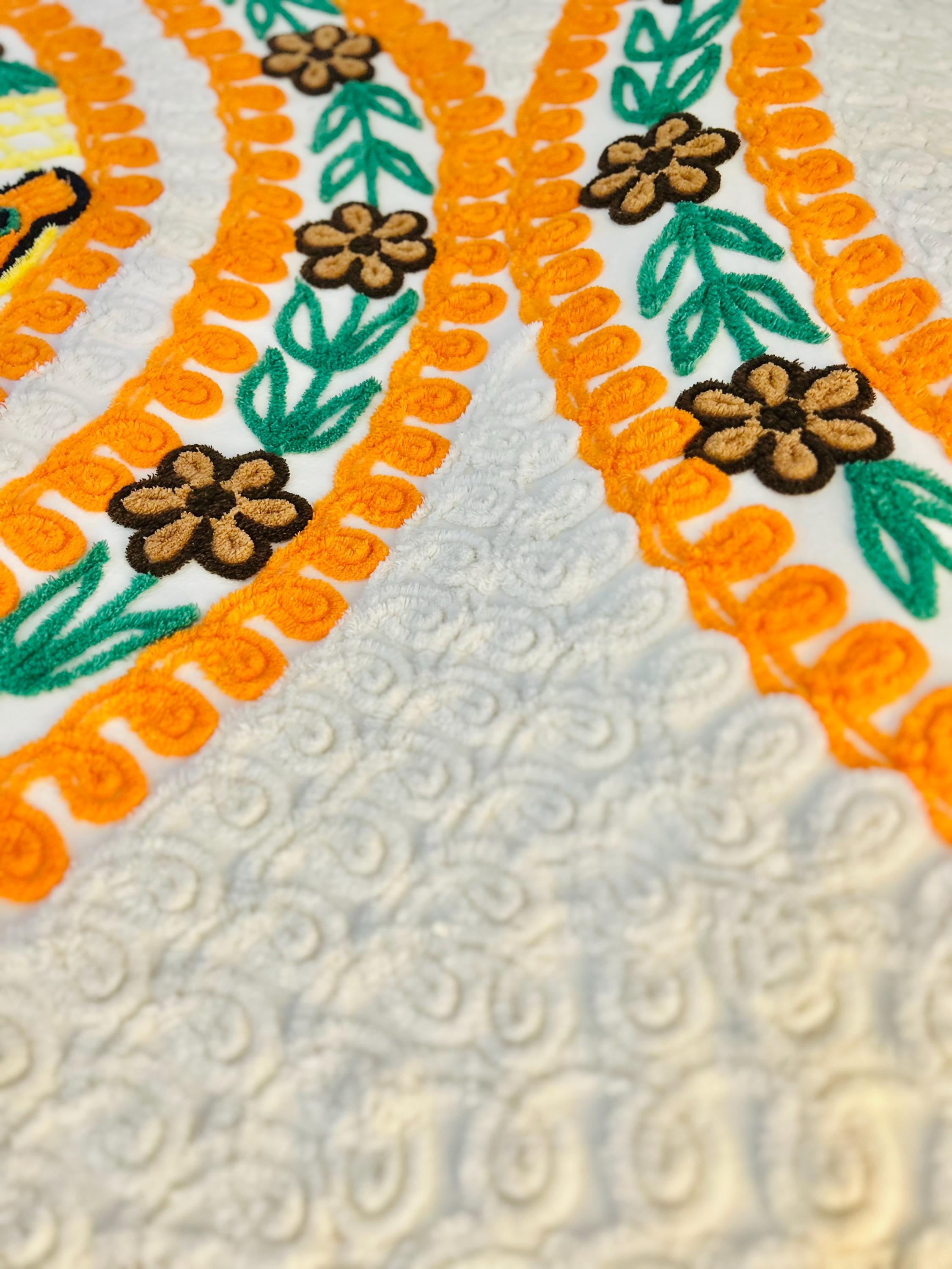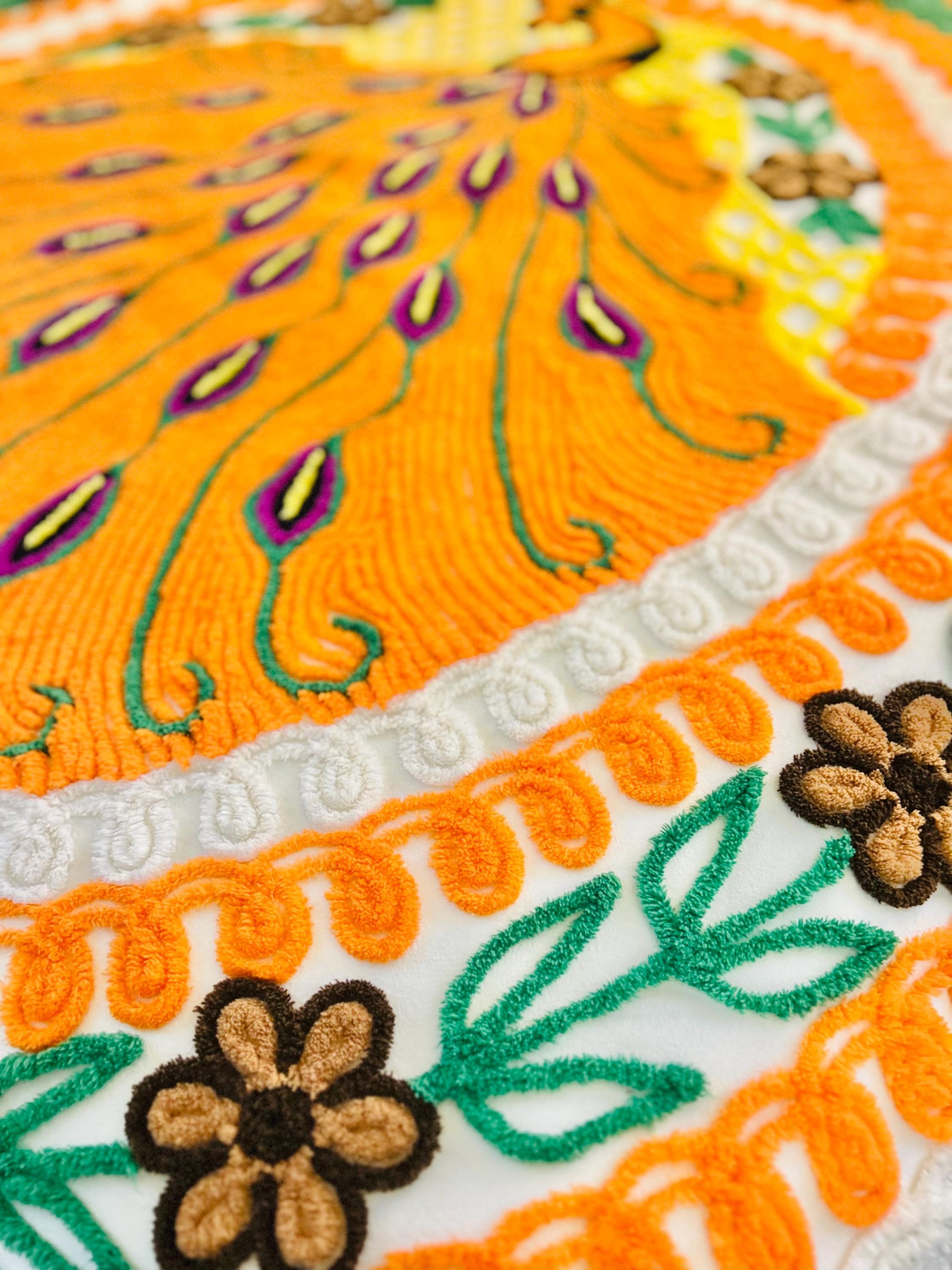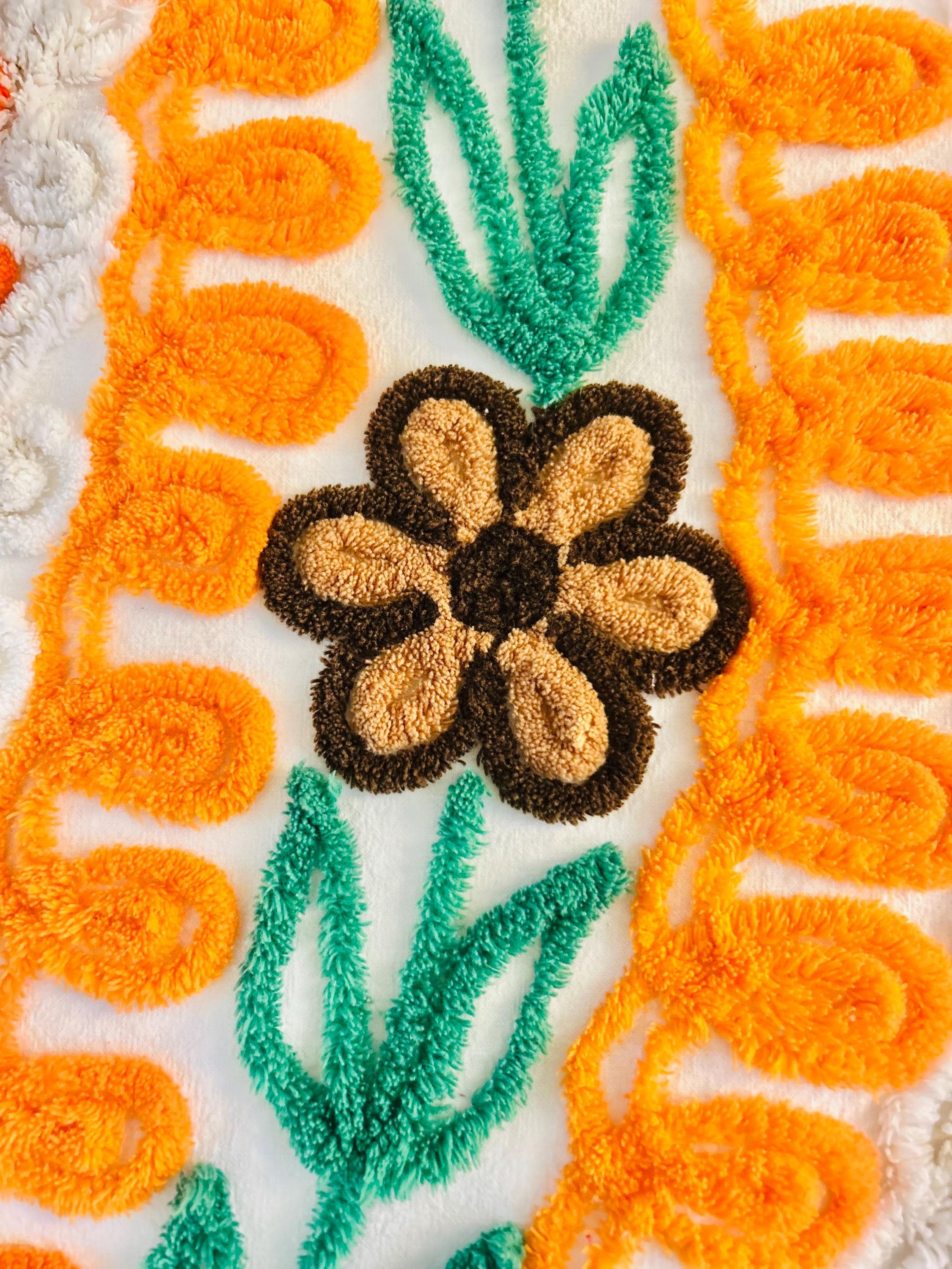 Such a soft and fluffy Peacock Chenille bedspread, circa 1950s. It is also bright all over with no bald spots, holes or stains. The top is straight across while the bottom two edges are curved (see photos).