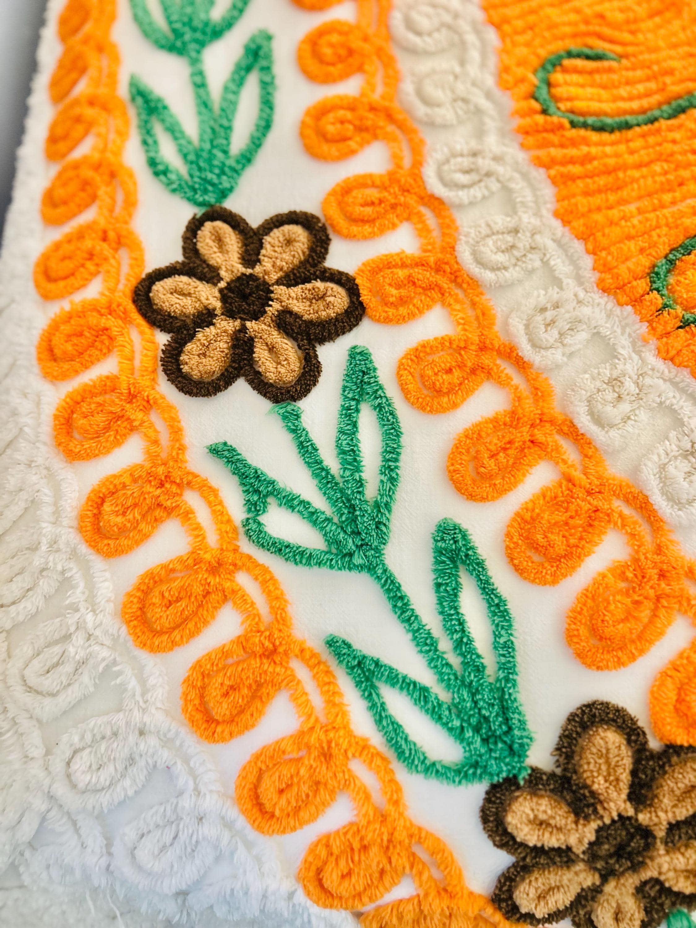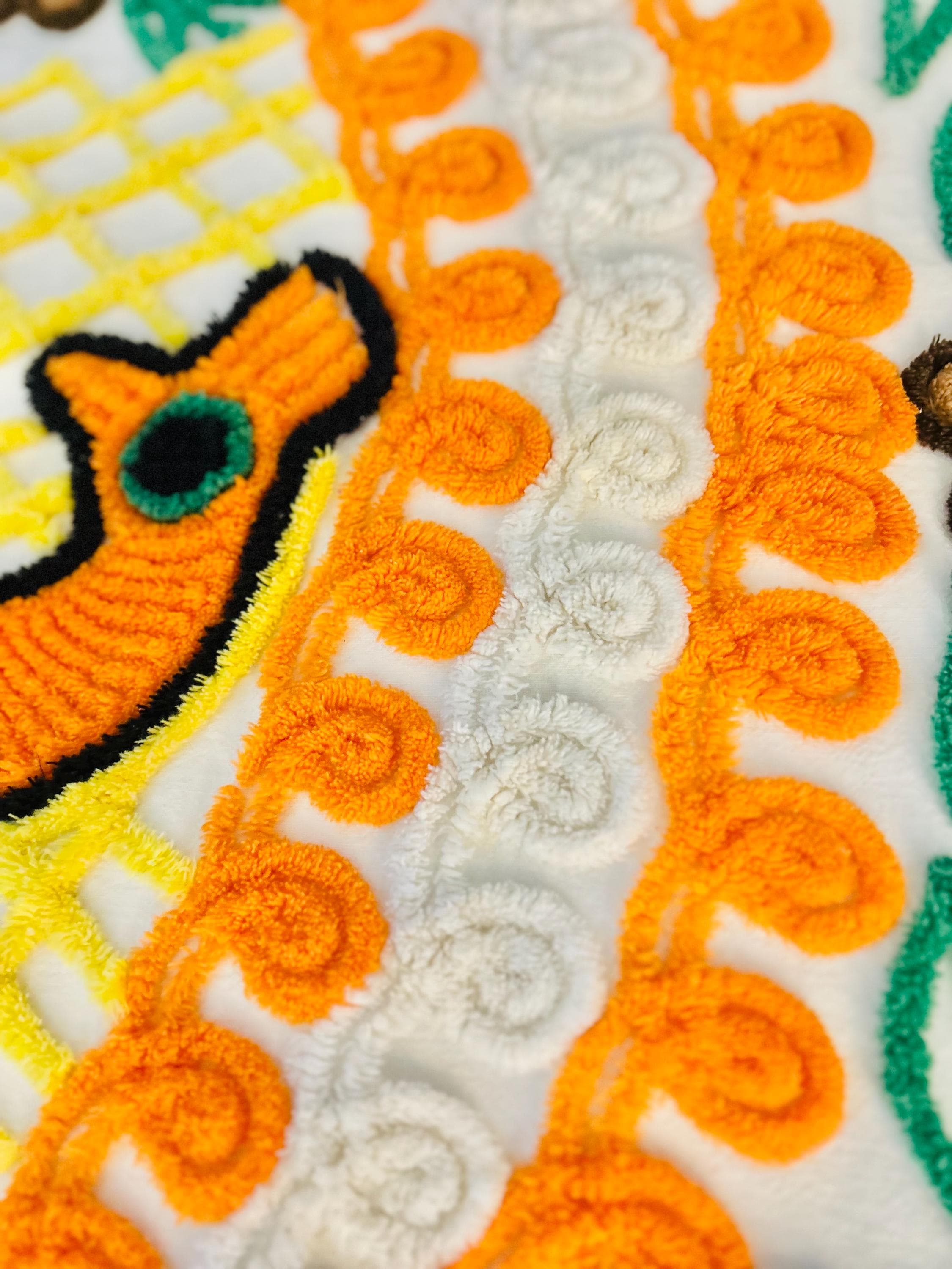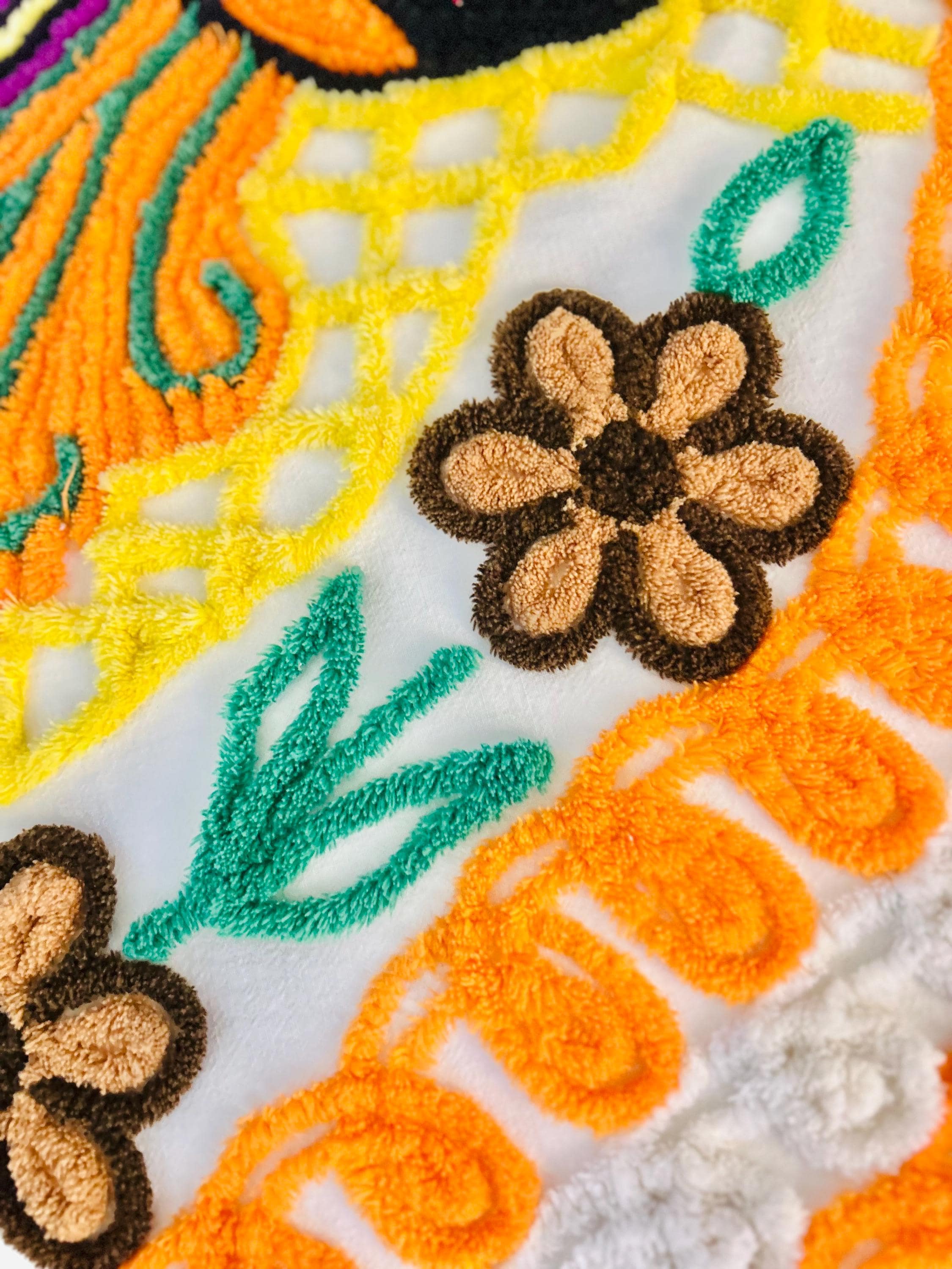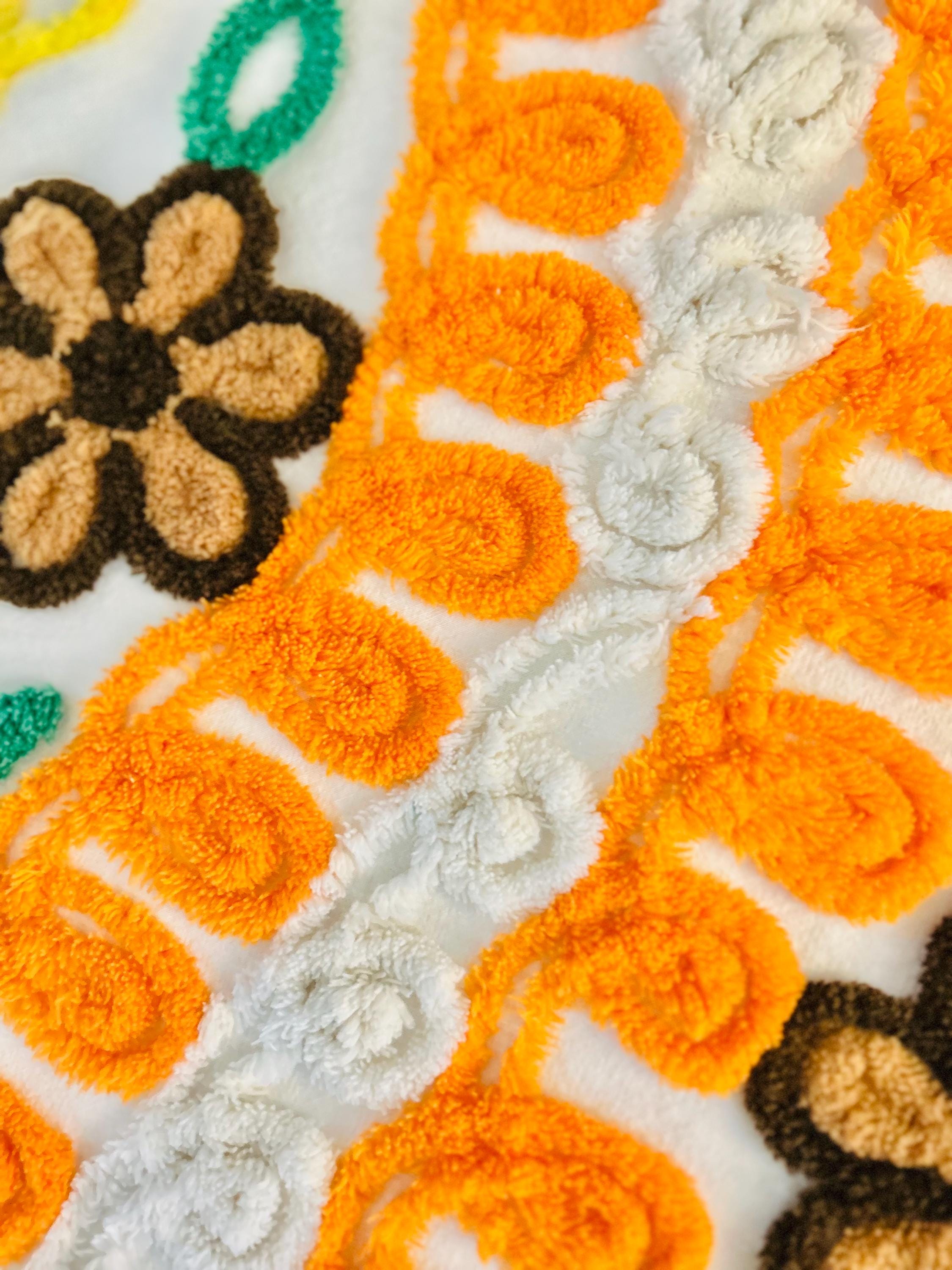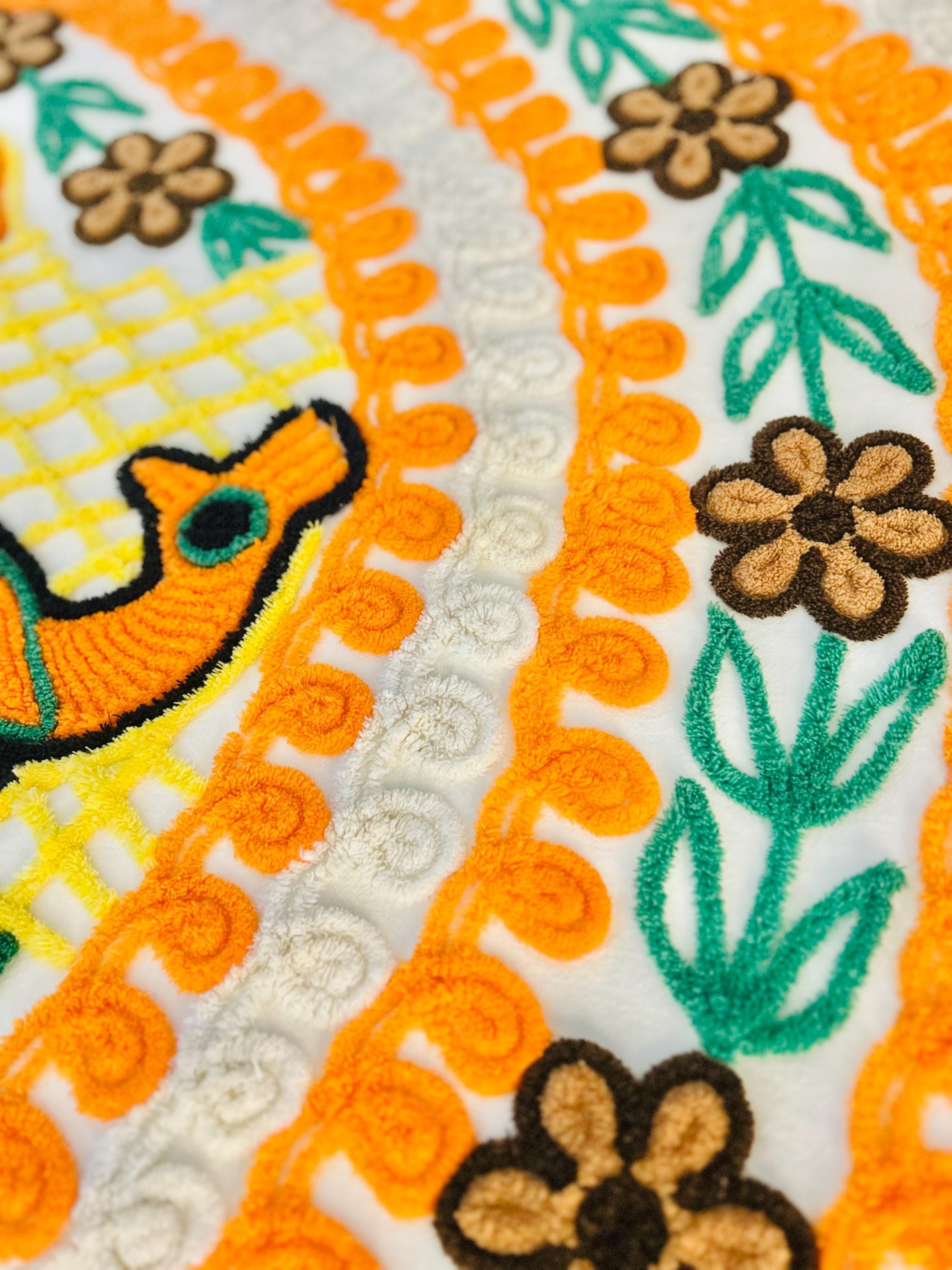 Such a soft and fluffy Peacock Chenille bedspread, circa 1950s. It is also bright all over with no bald spots, holes or stains. The top is straight across while the bottom two edges are curved (see photos).