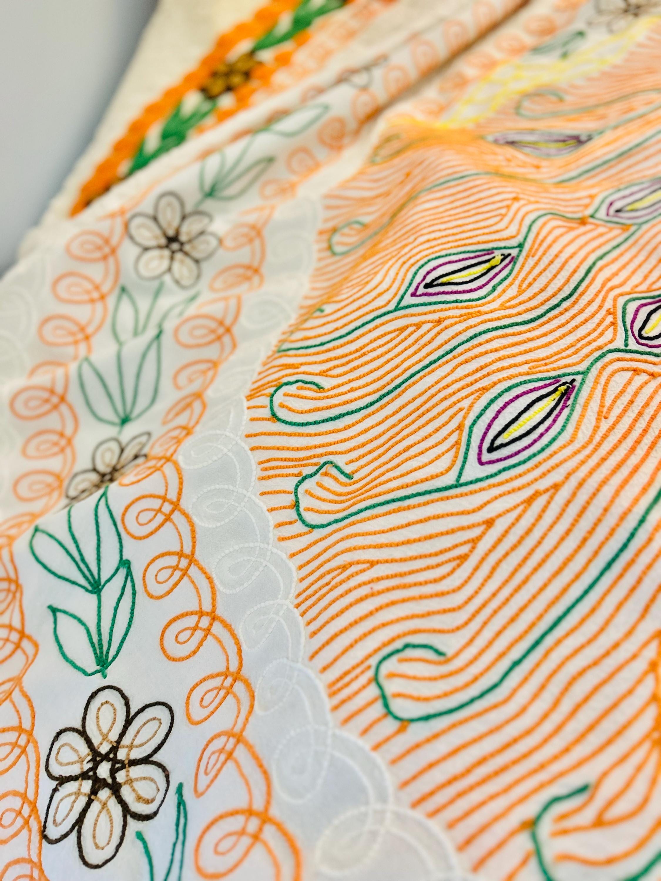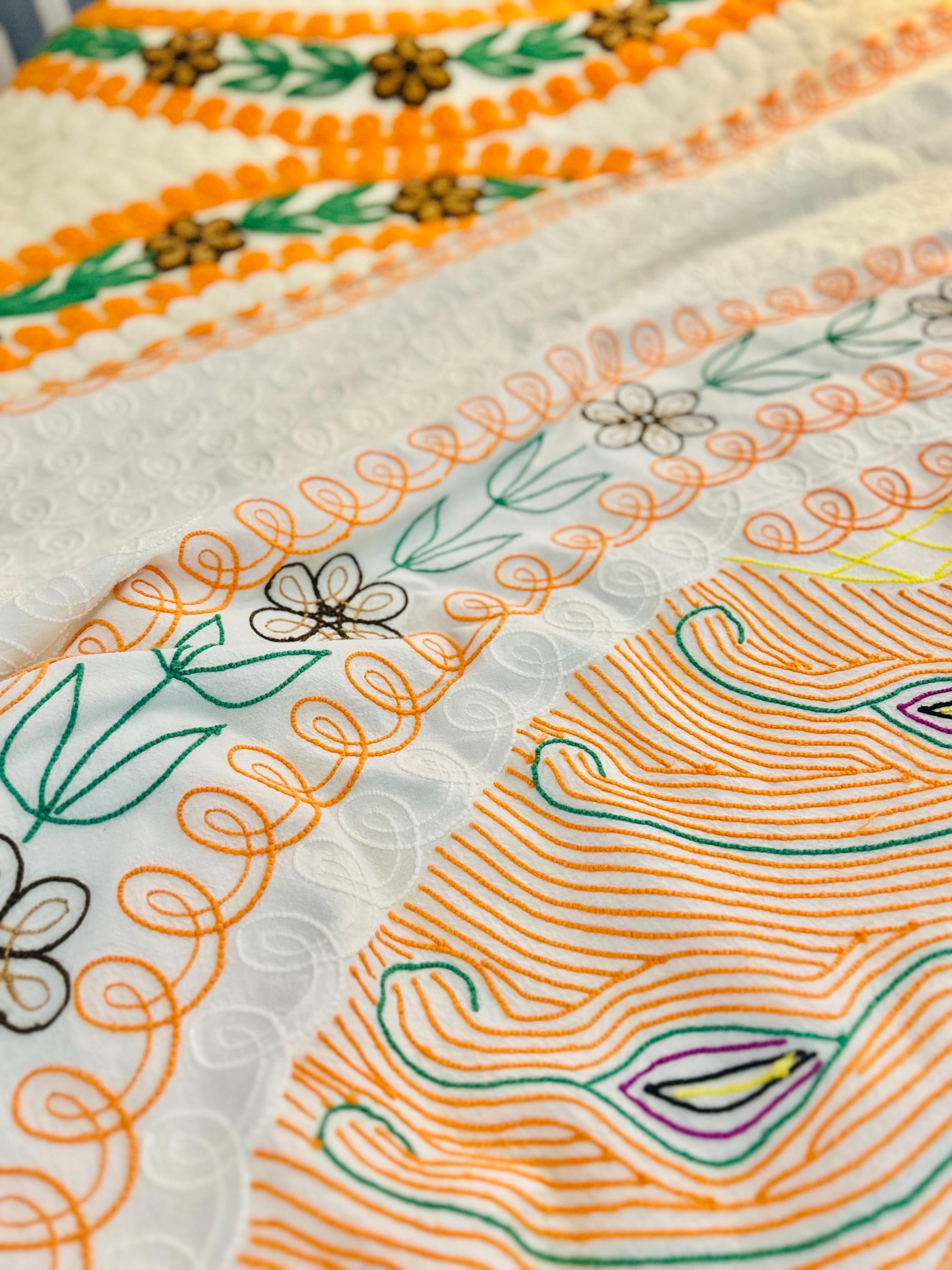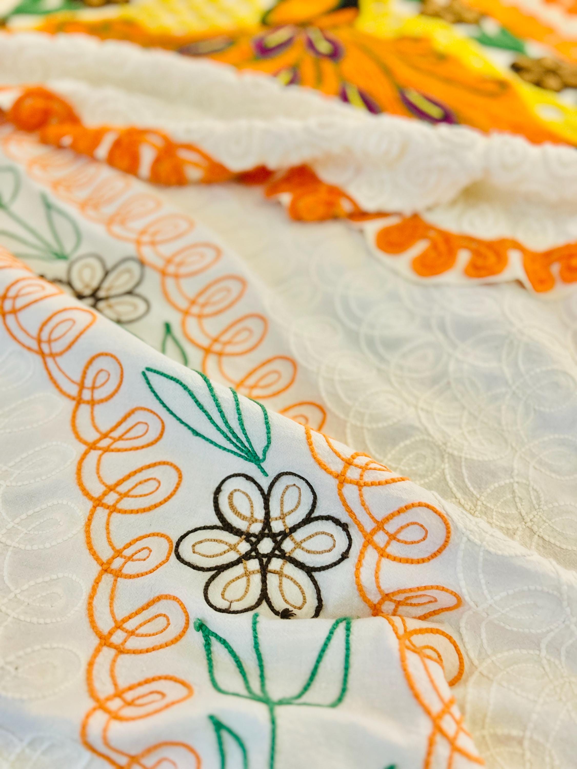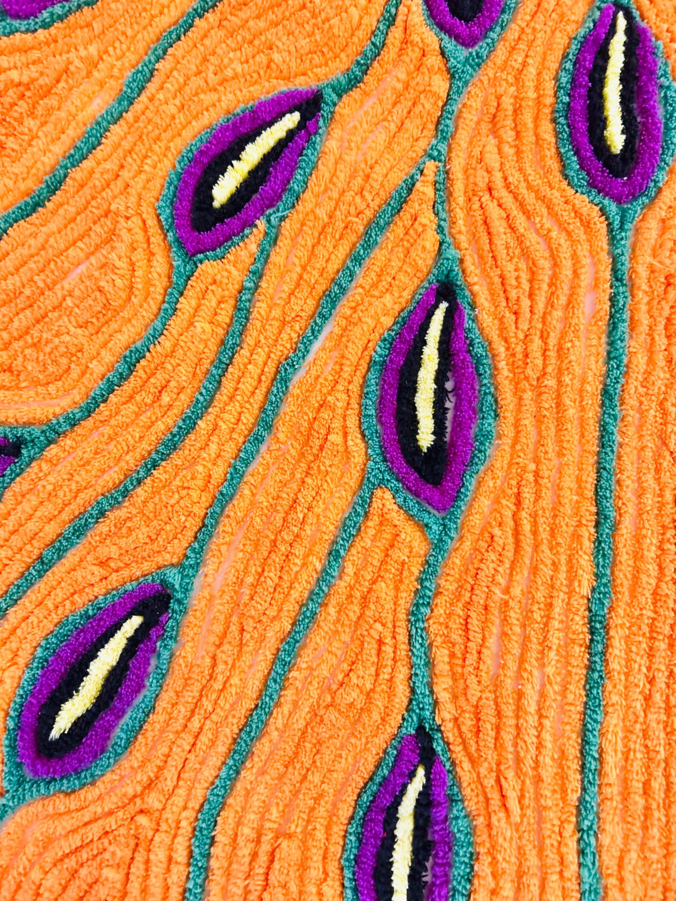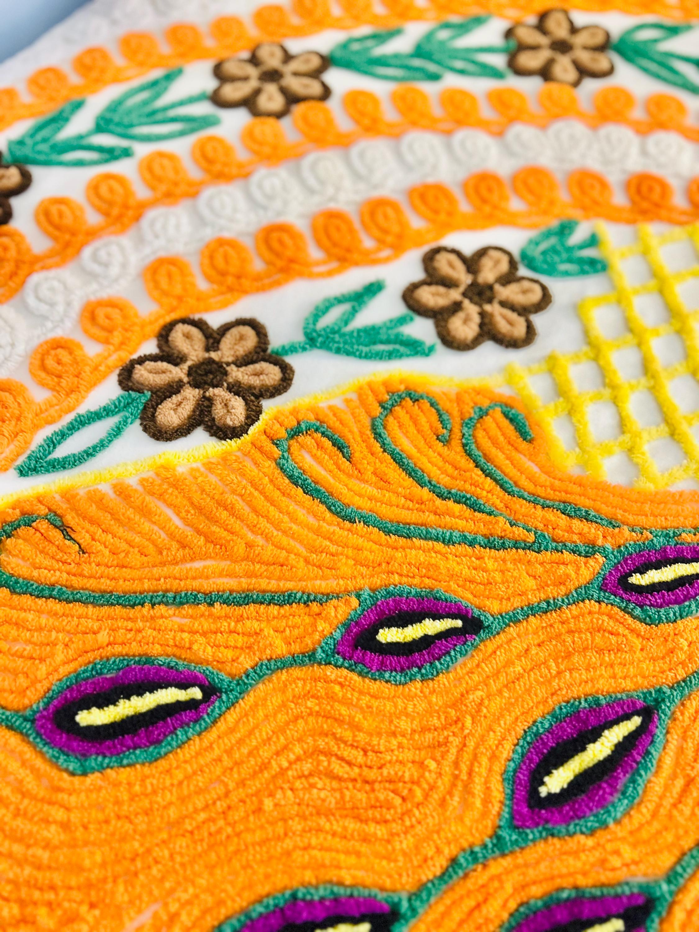 Such a soft and fluffy Peacock Chenille bedspread, circa 1950s. It is also bright all over with no bald spots, holes or stains. The top is straight across while the bottom two edges are curved (see photos).