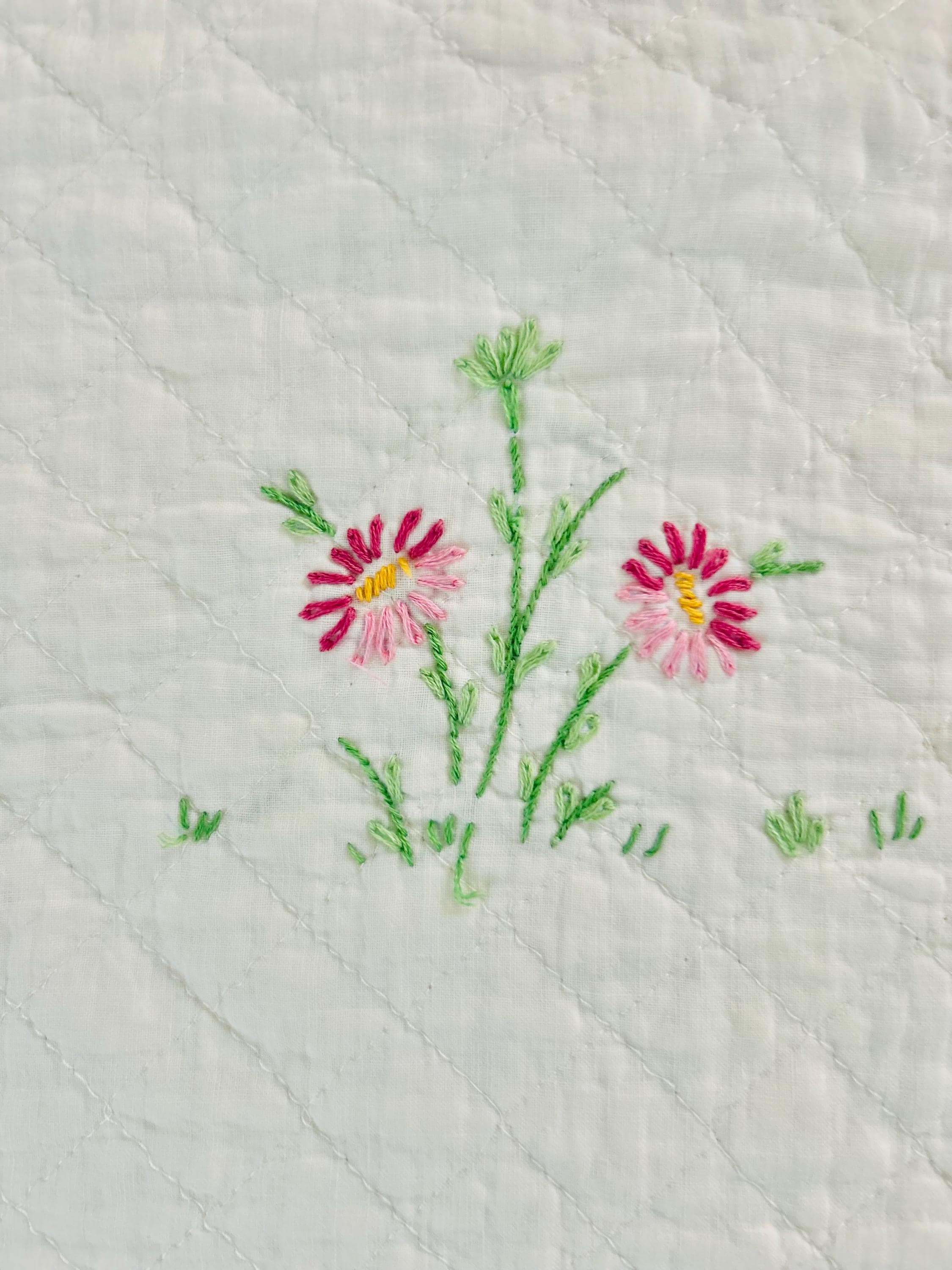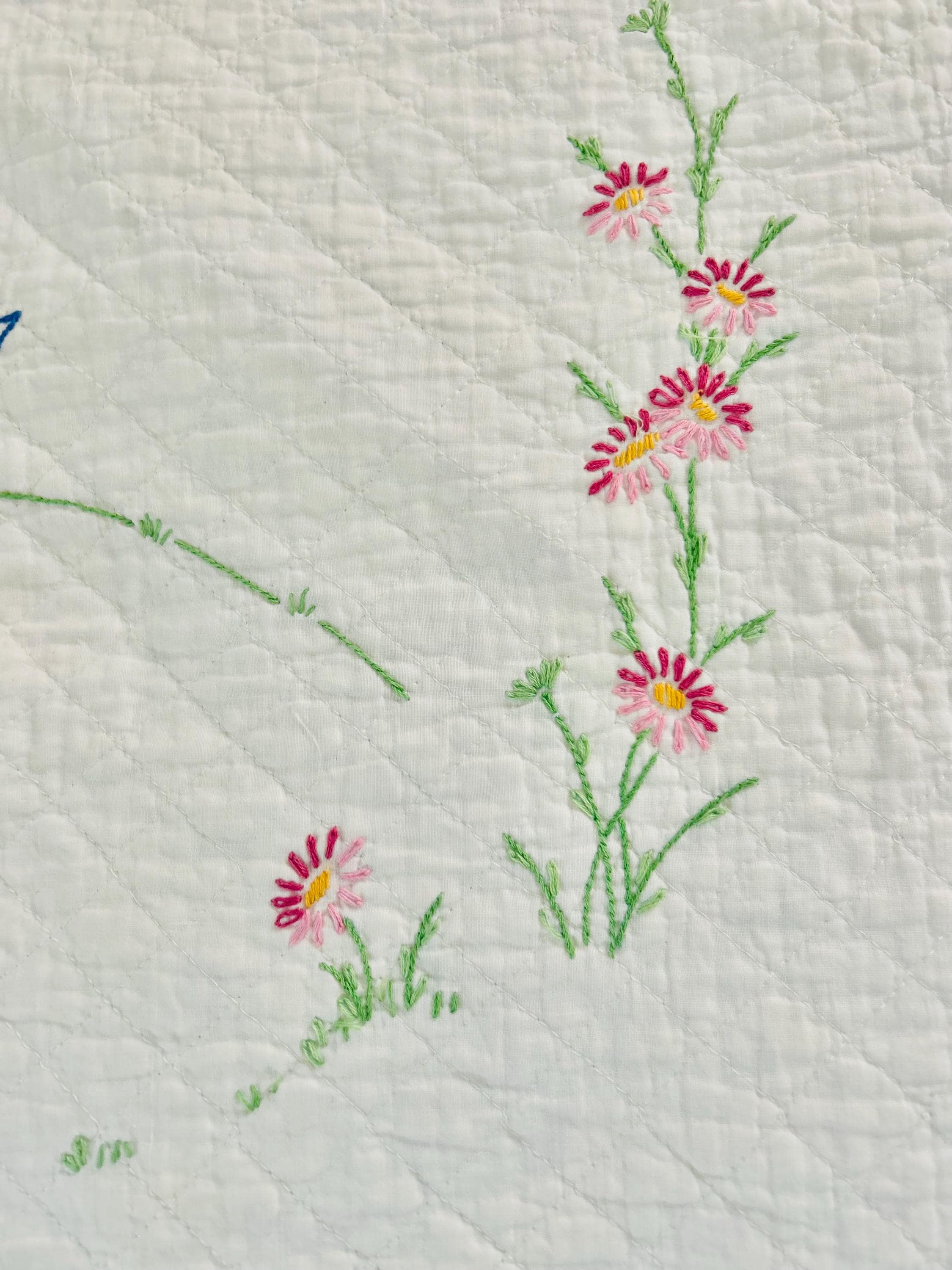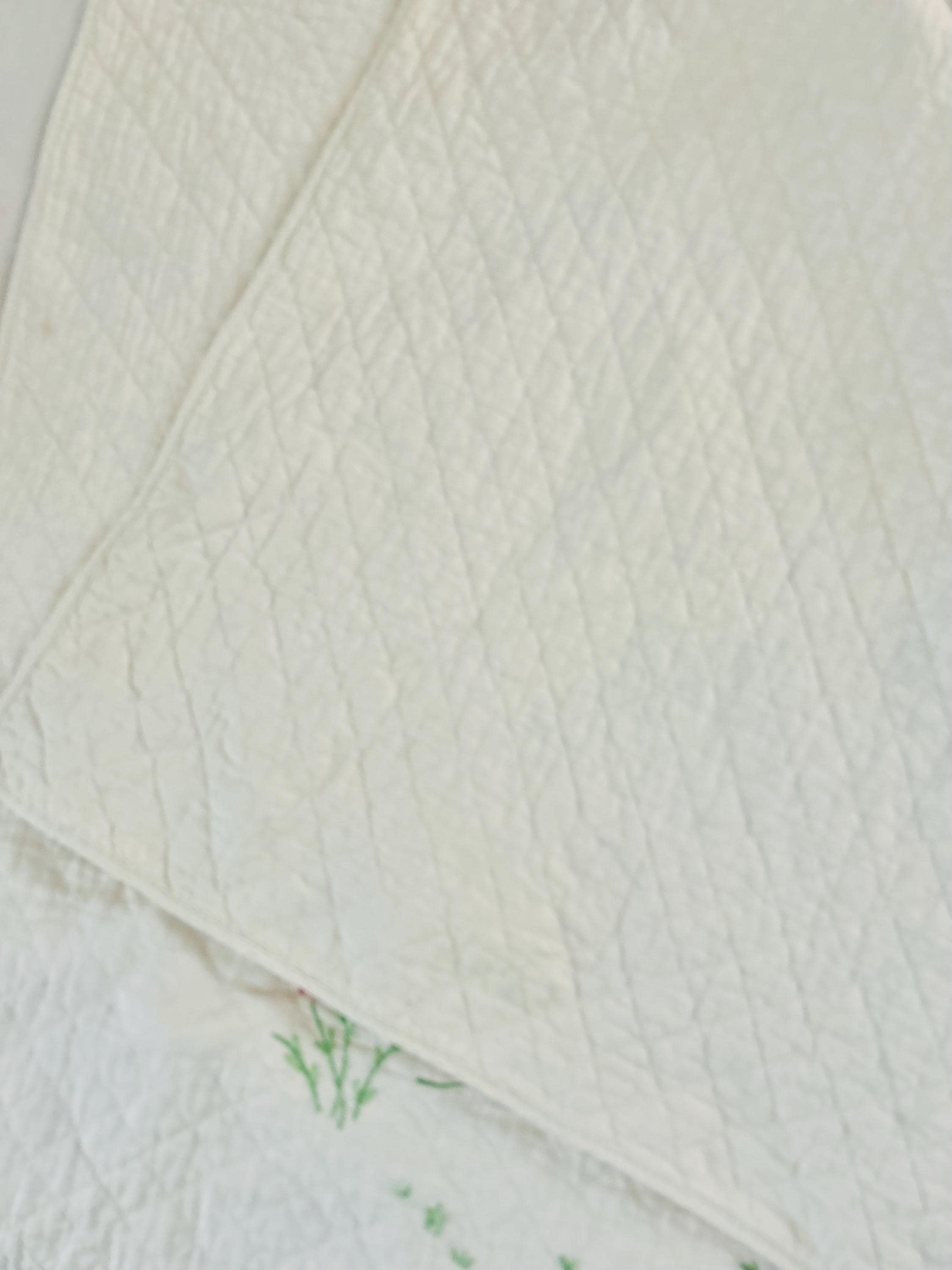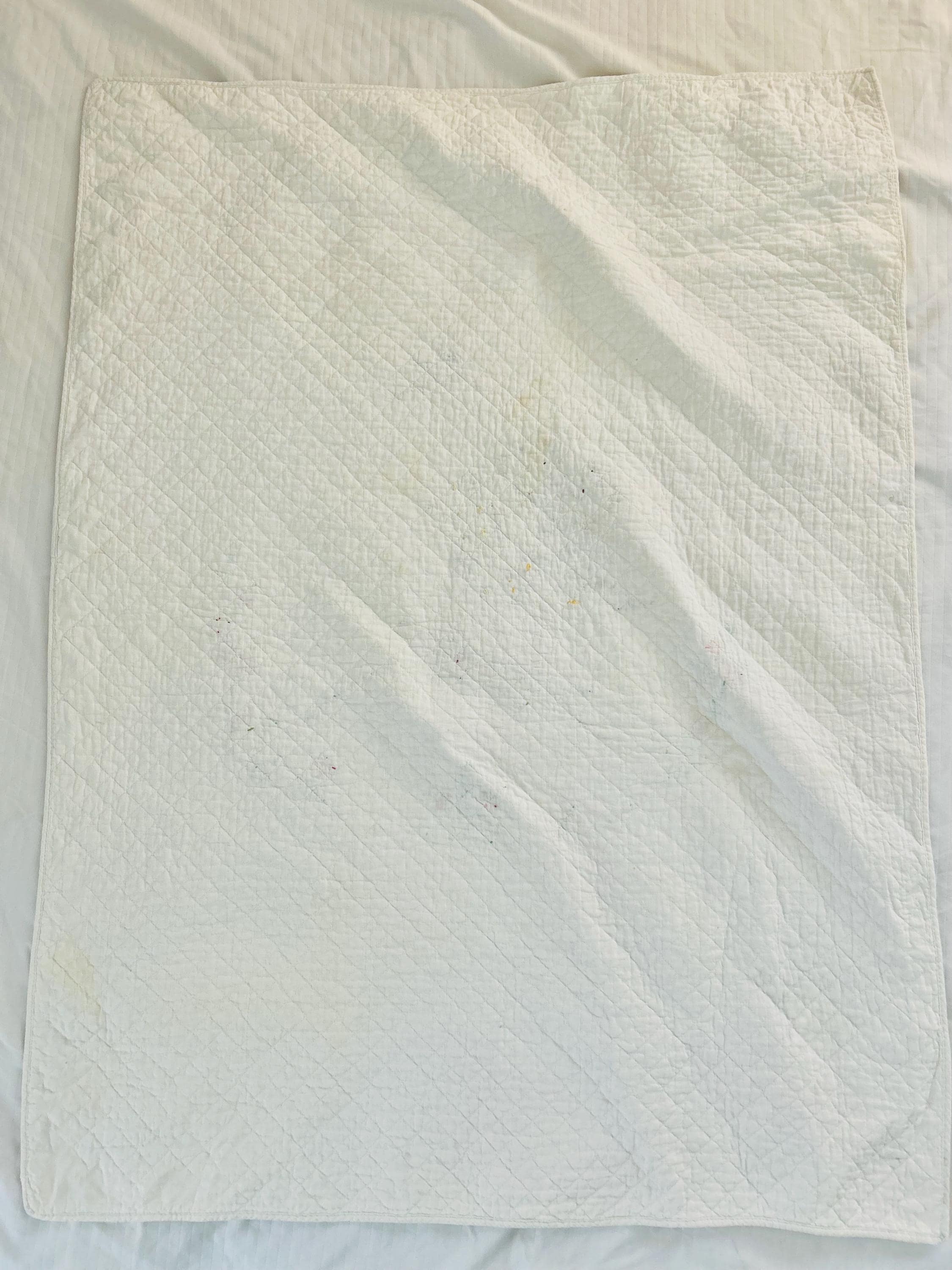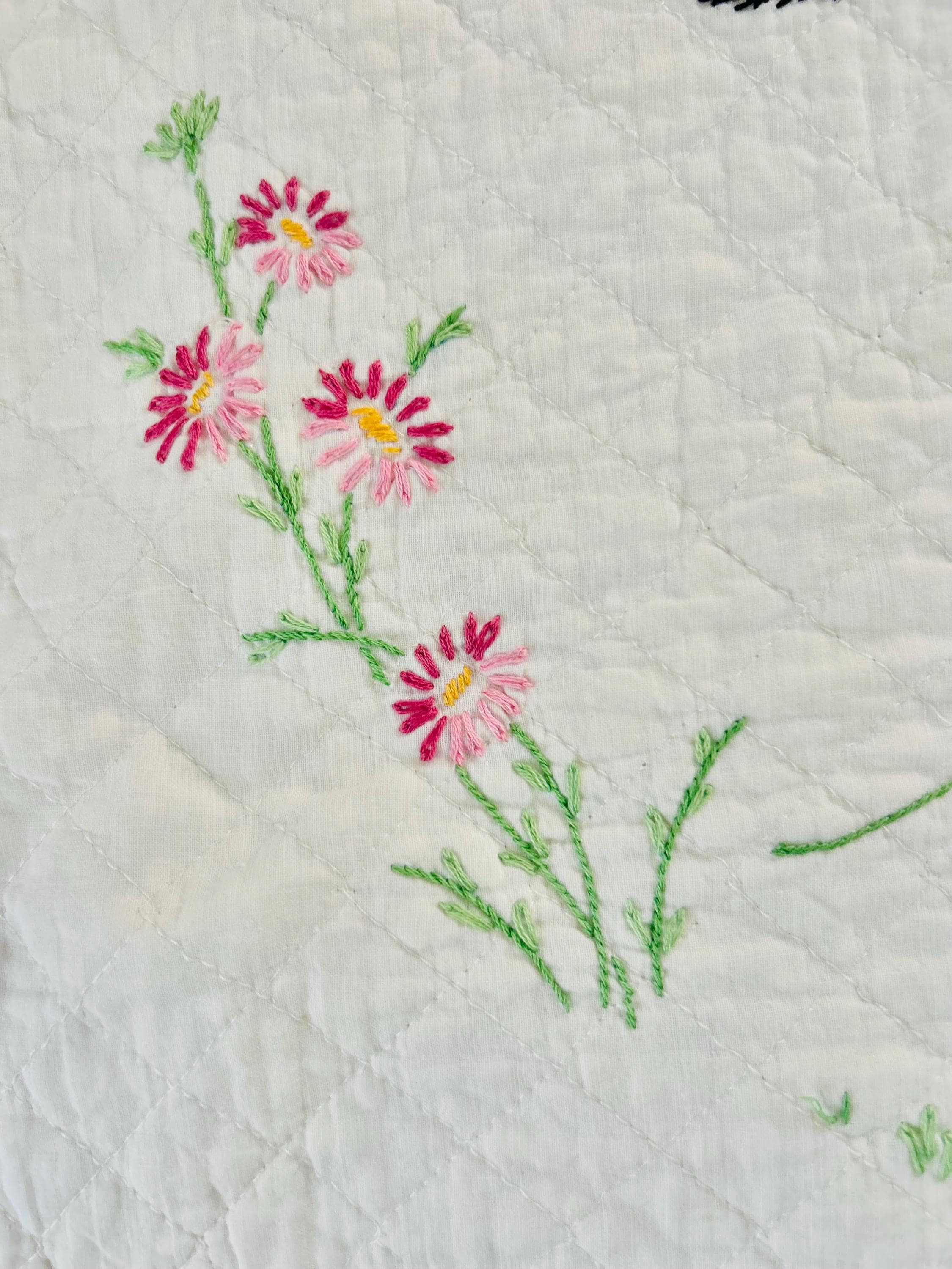 Beautifully hand-stitched in the 1950s, this little quilt was made from a Bucilla kit and is all hand-stitched with a diamond-grid quilting pattern and very lightweight cotton batting.