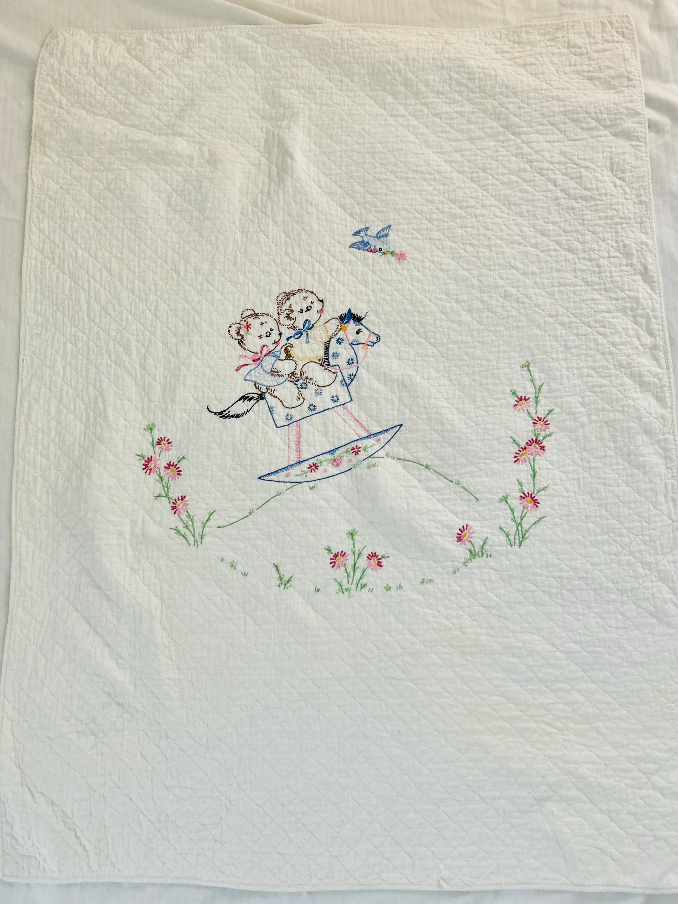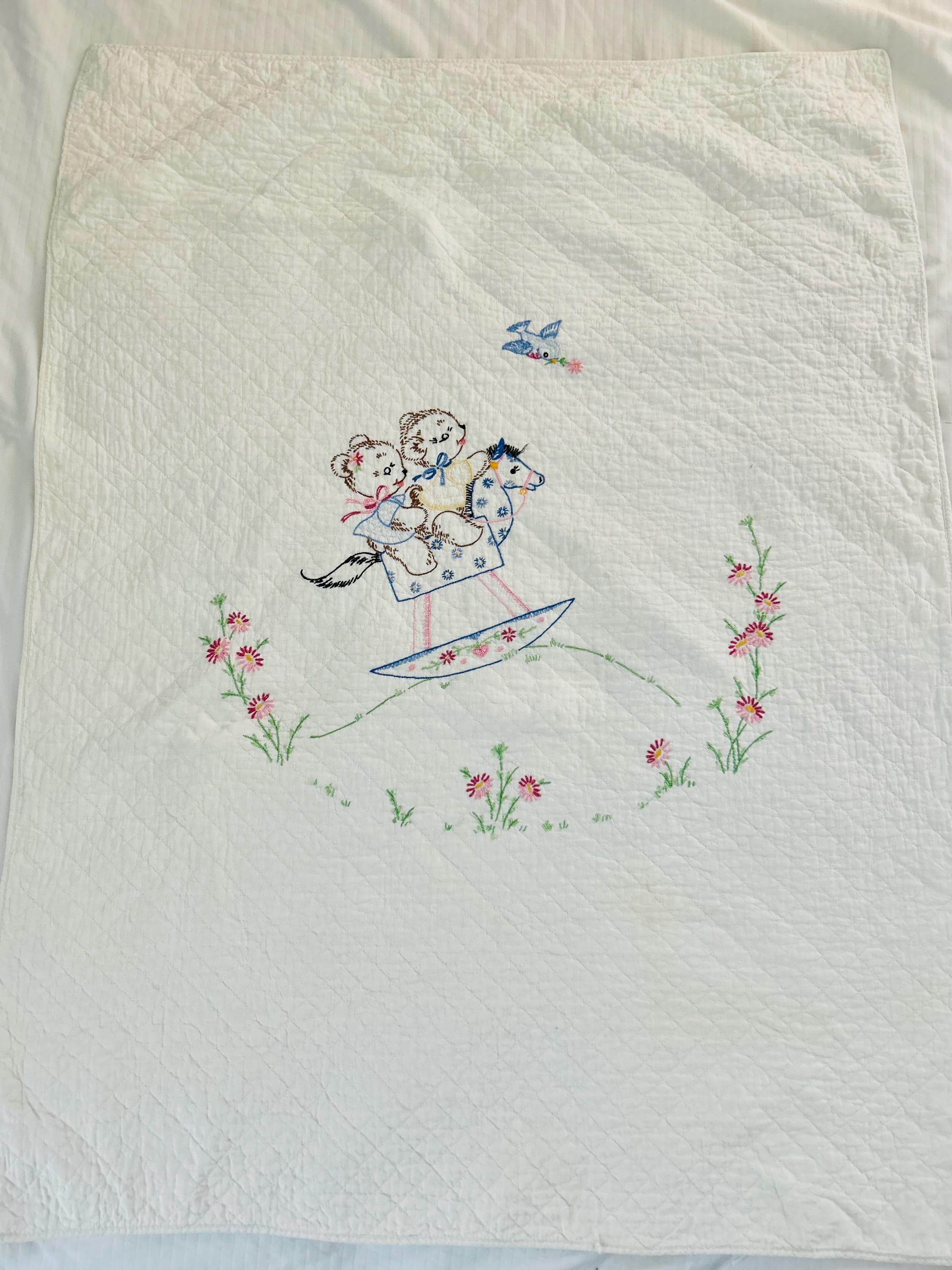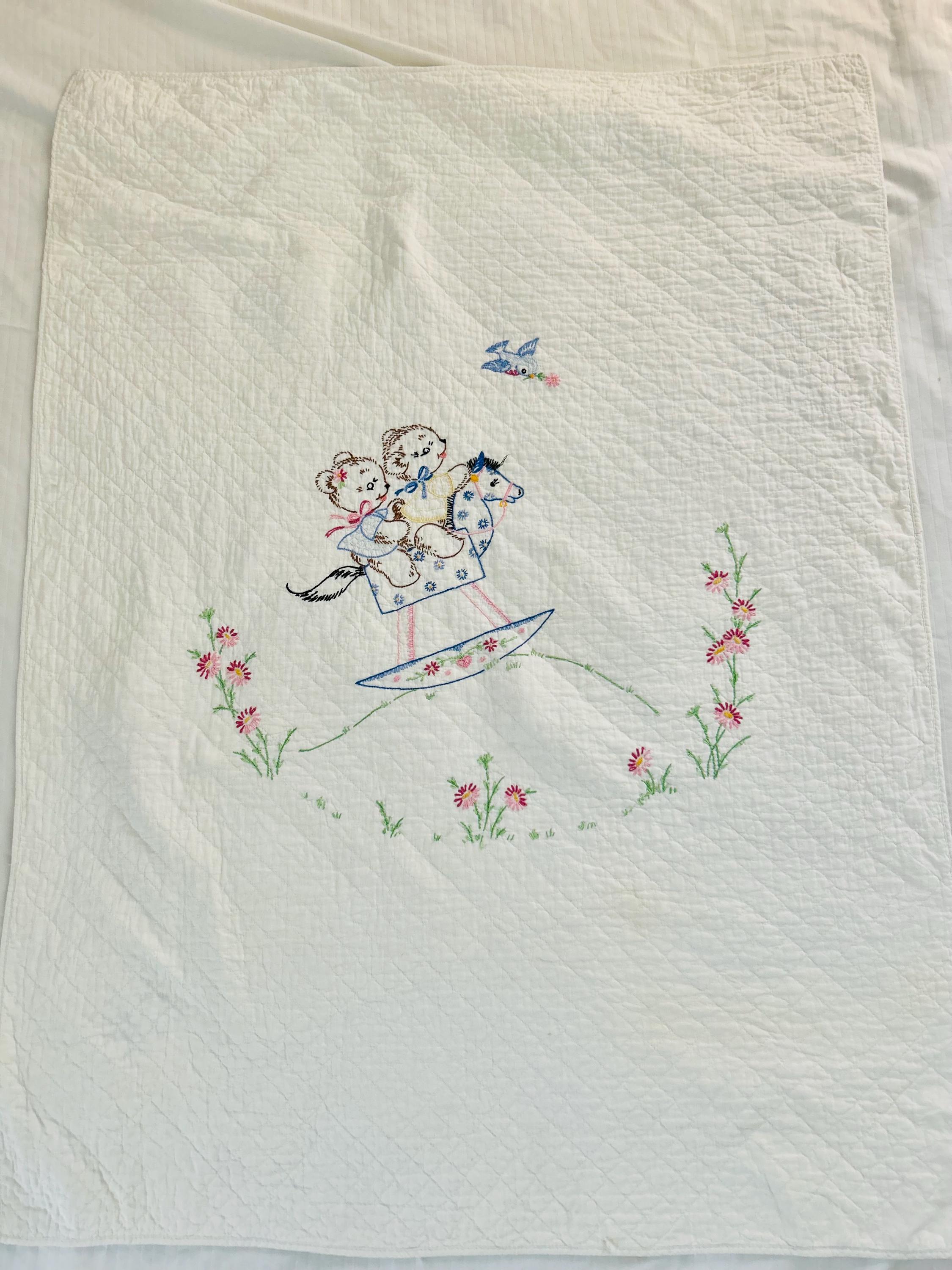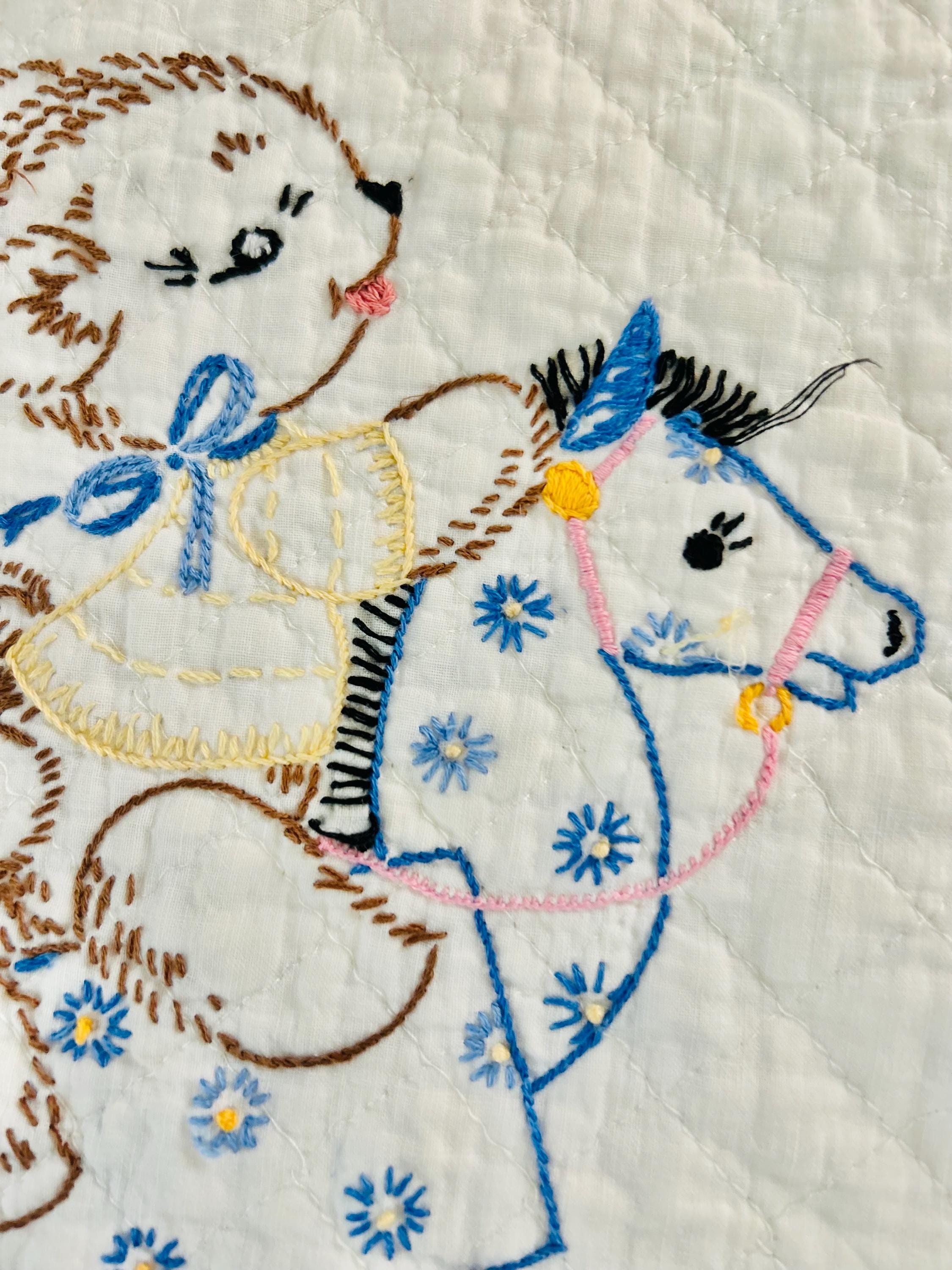 Beautifully hand-stitched in the 1950s, this little quilt was made from a Bucilla kit and is all hand-stitched with a diamond-grid quilting pattern and very lightweight cotton batting.