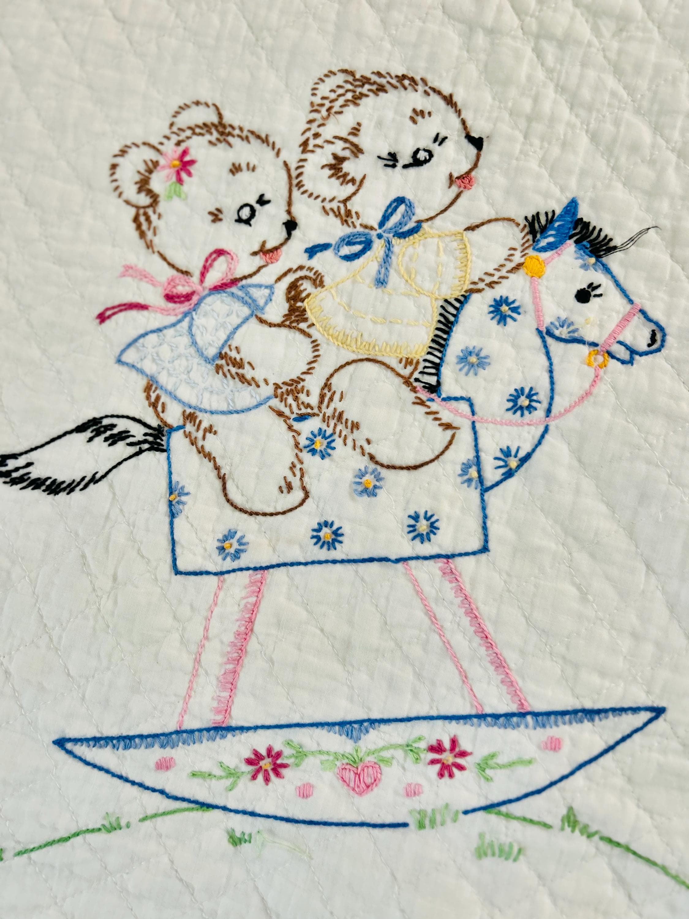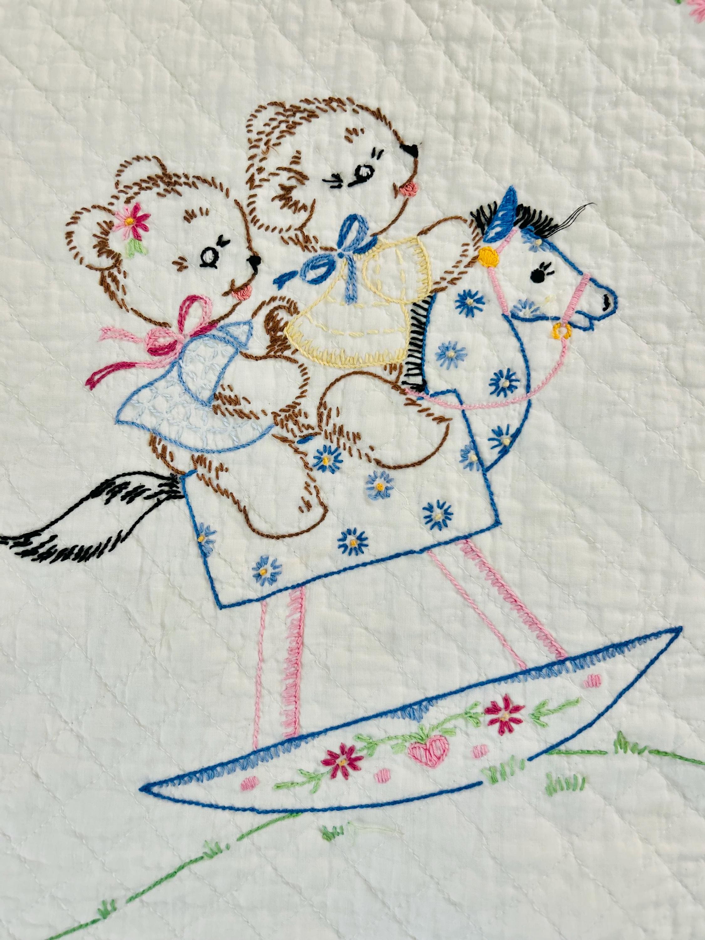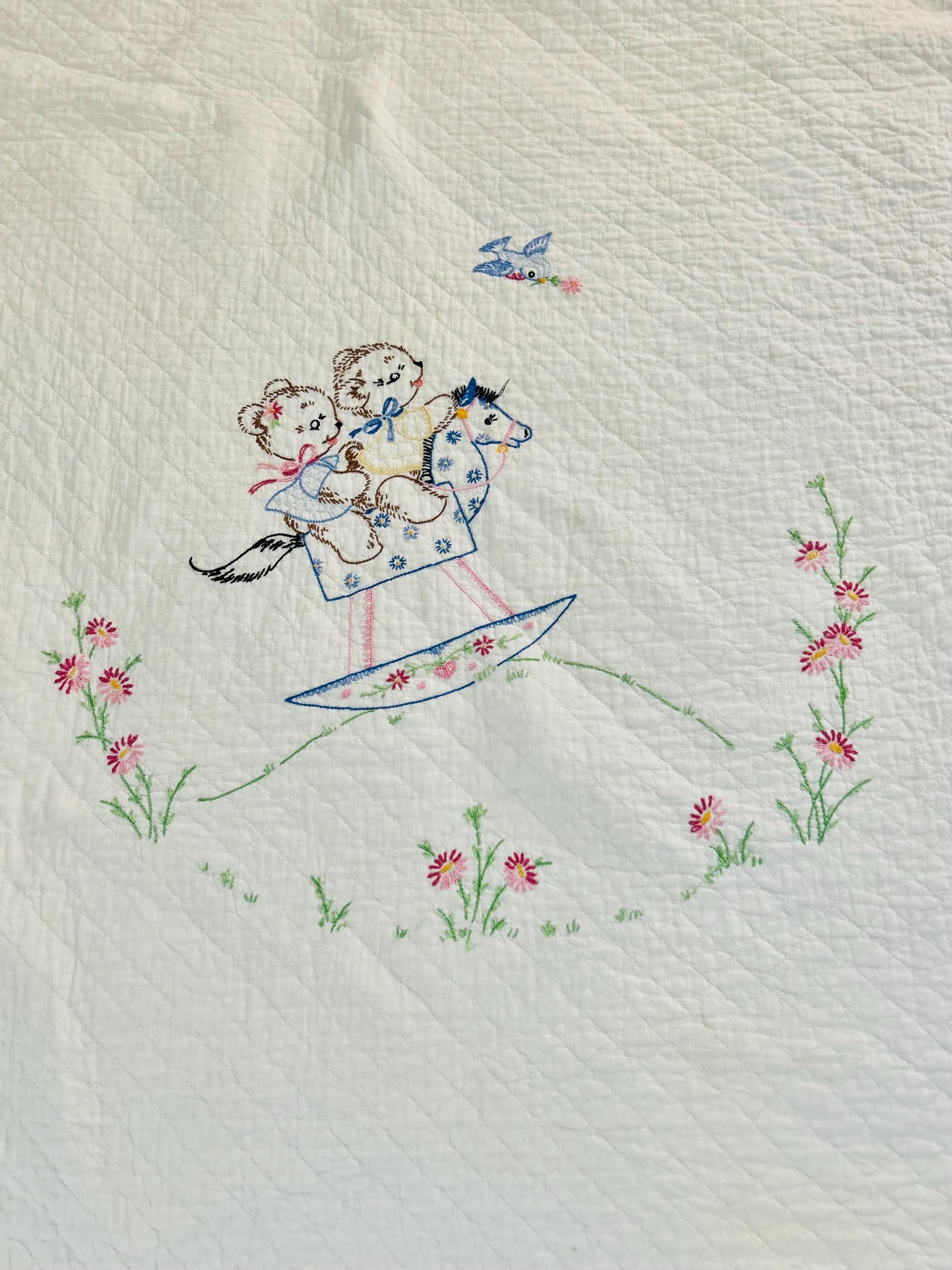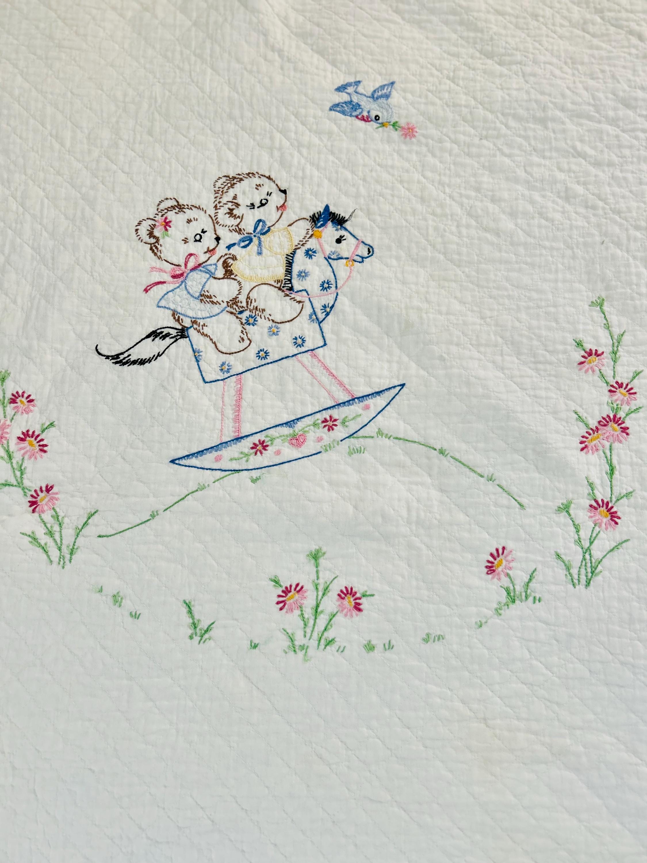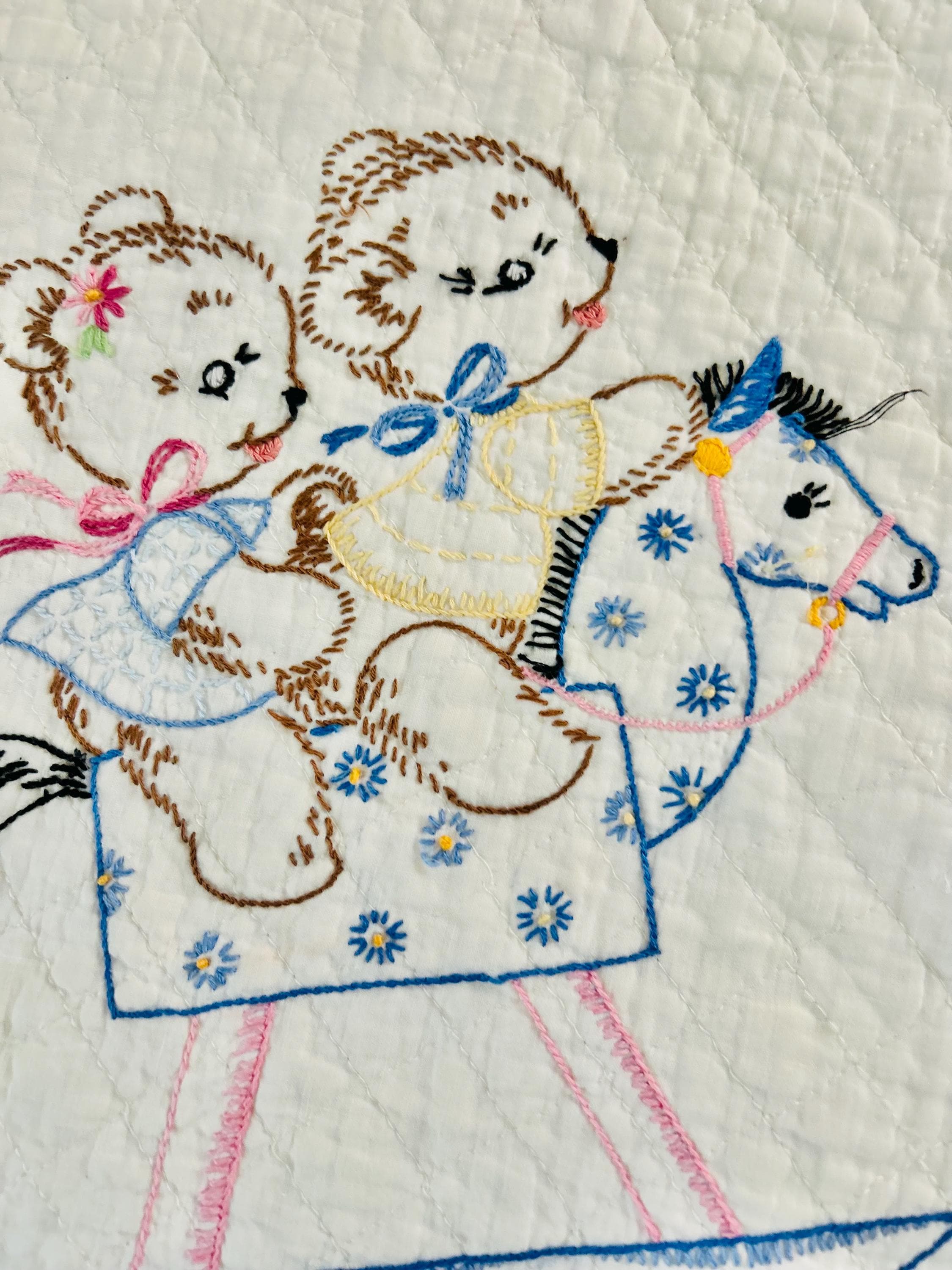 Beautifully hand-stitched in the 1950s, this little quilt was made from a Bucilla kit and is all hand-stitched with a diamond-grid quilting pattern and very lightweight cotton batting.