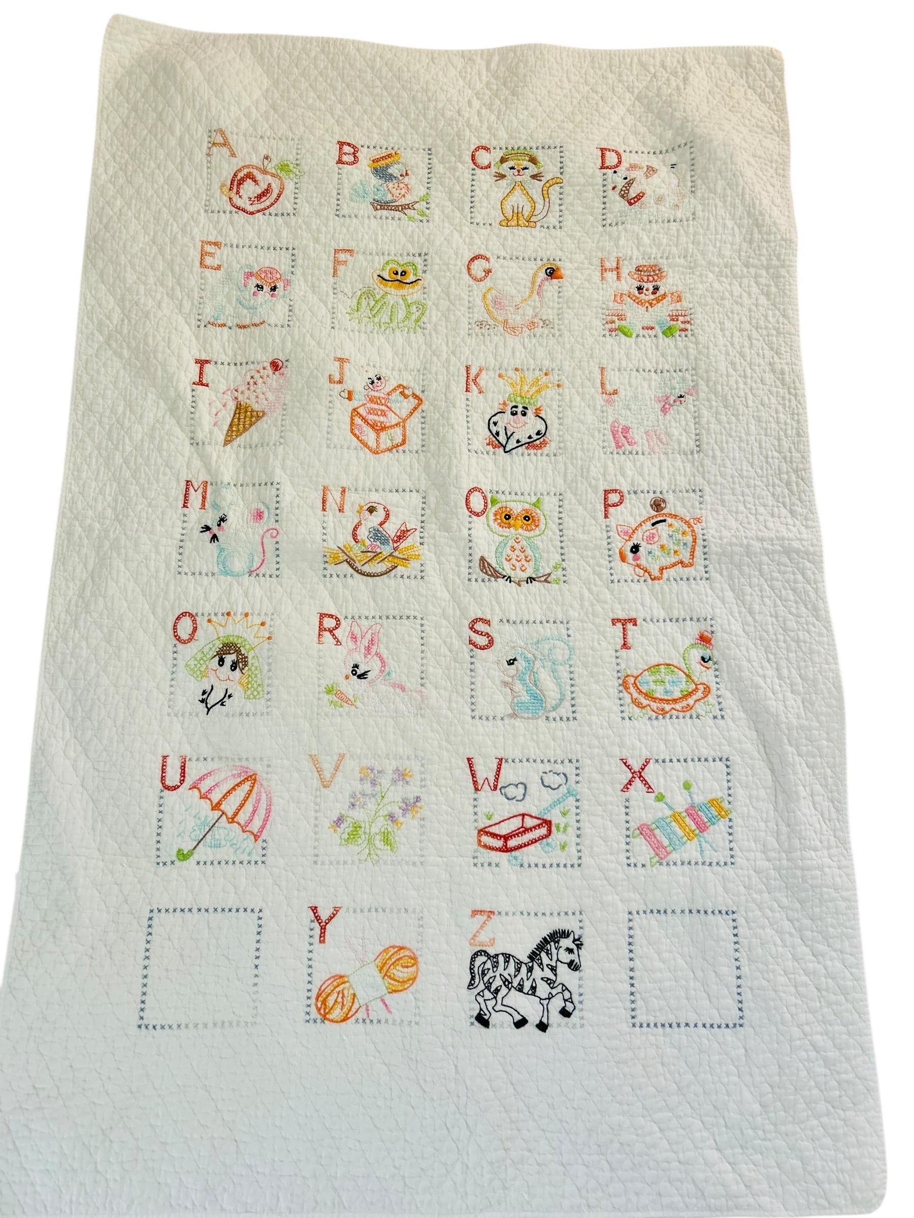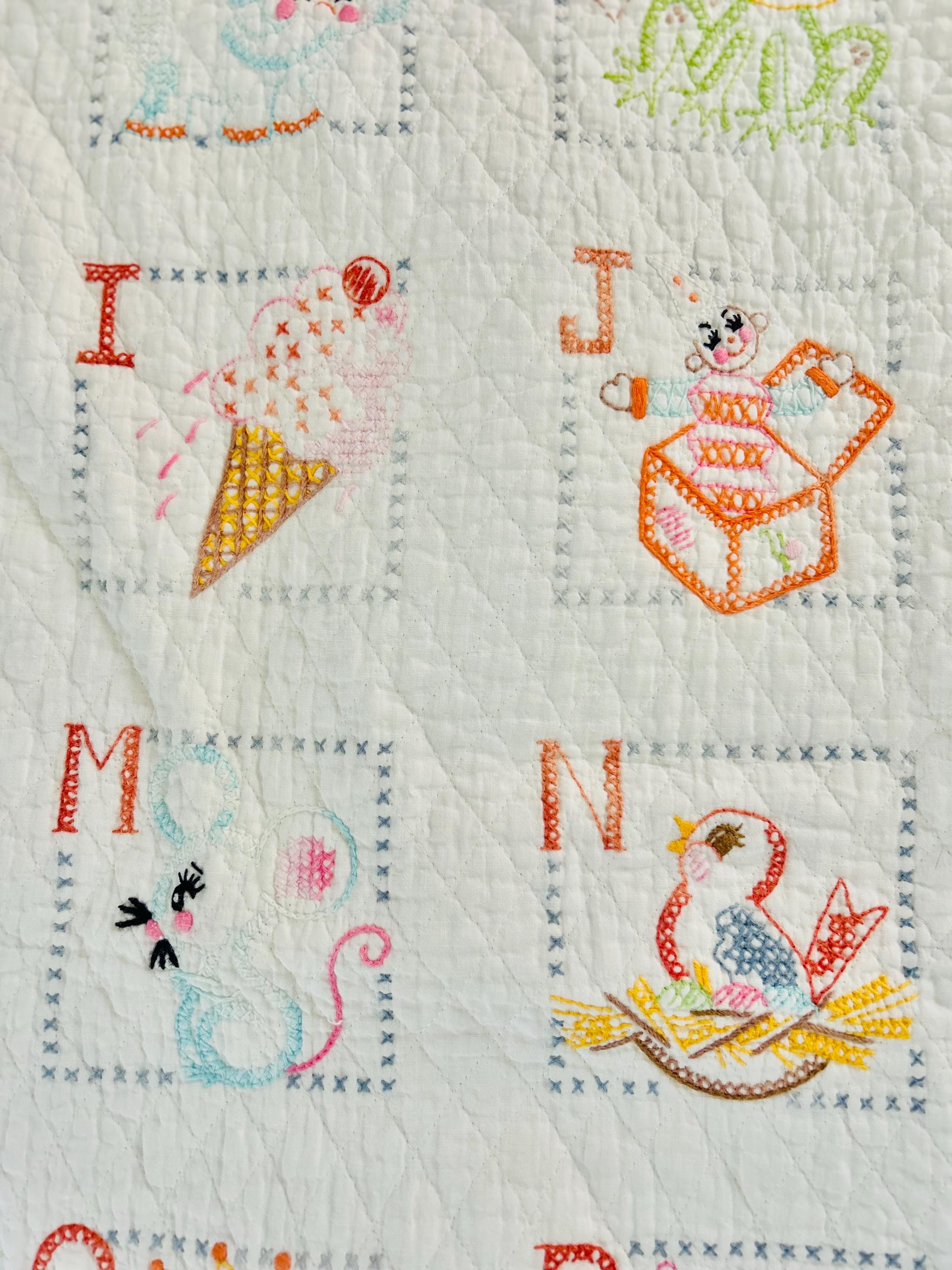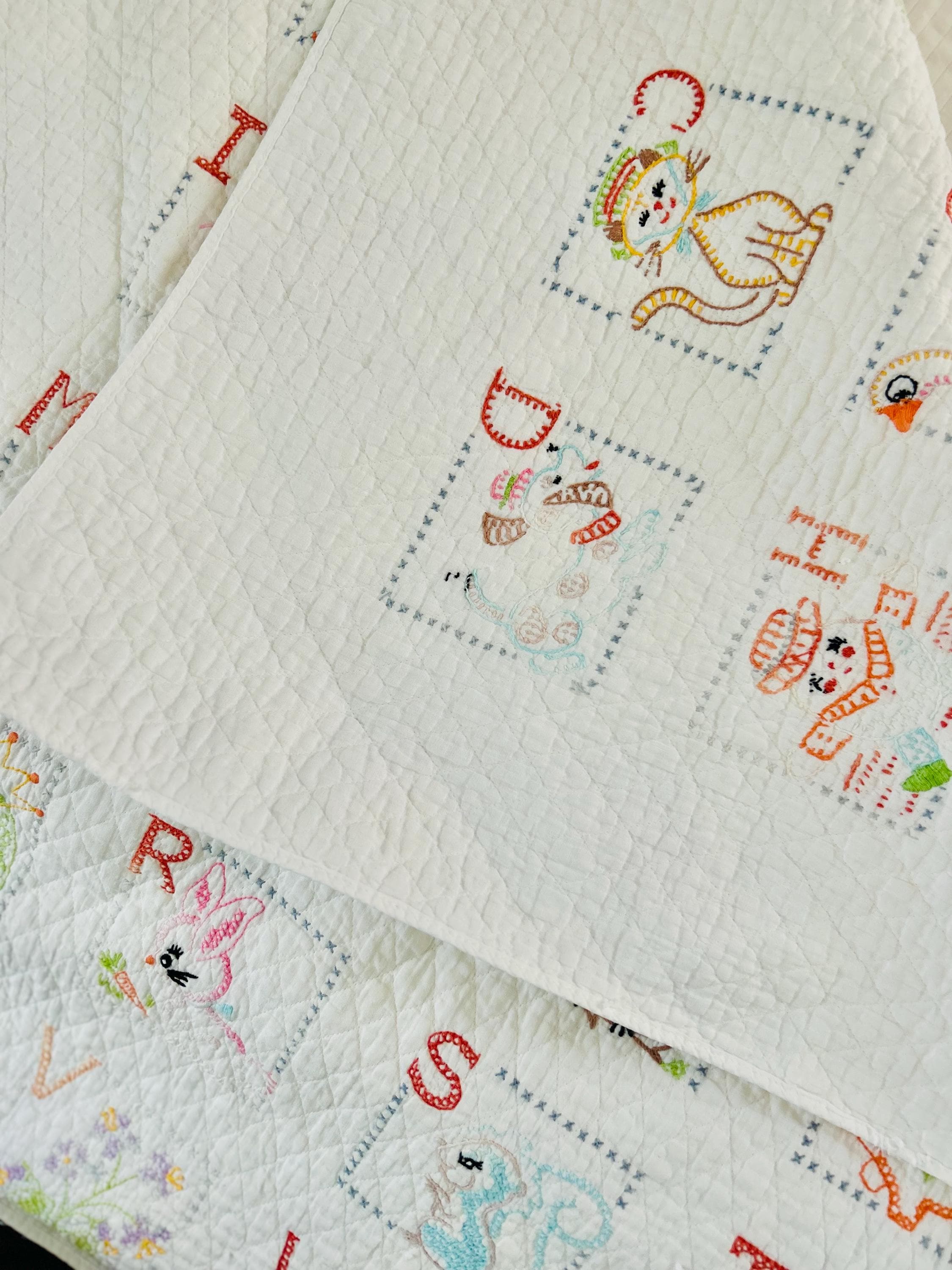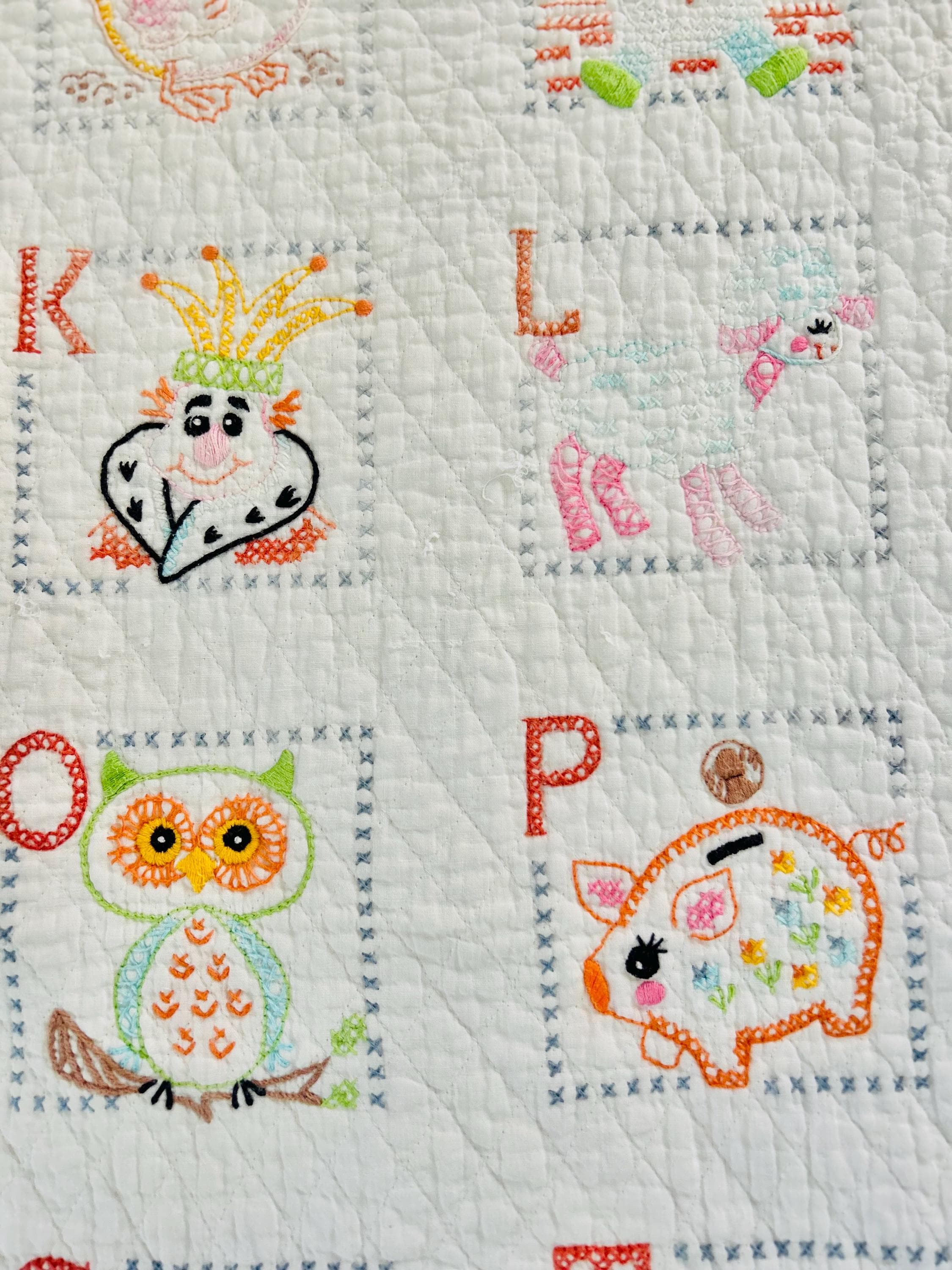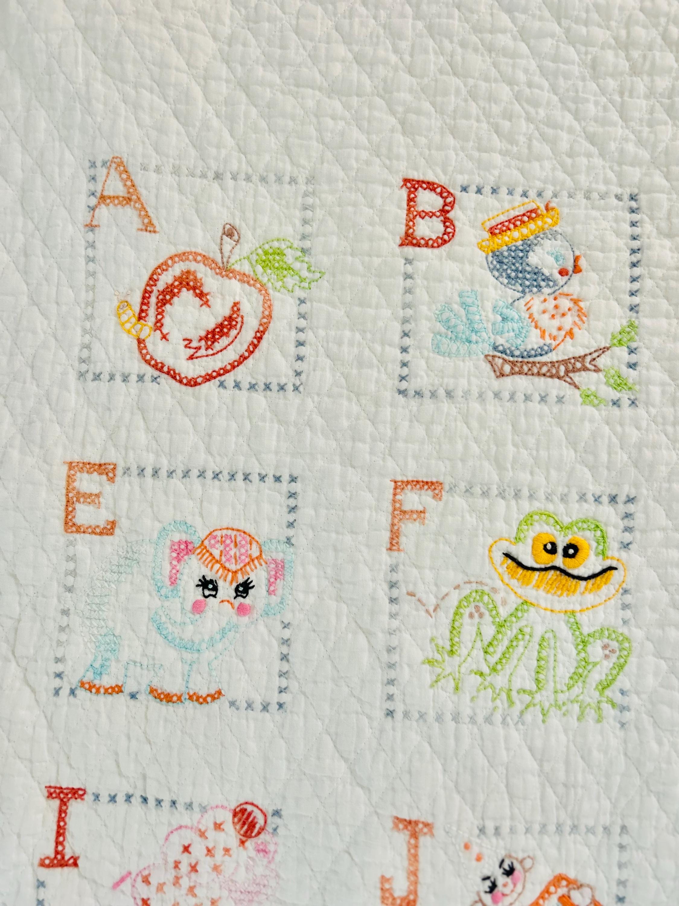 Such a sweet ABC Baby Quilt that has been hand-embroidered with 26 alphabet blocks, each with a vintage illustration: birds, elephants, rabbits, frogs, turtles, a zebra, a piggy bank and more. Made from soft white cotton, it has an all-over diamond-grid quilt pattern.