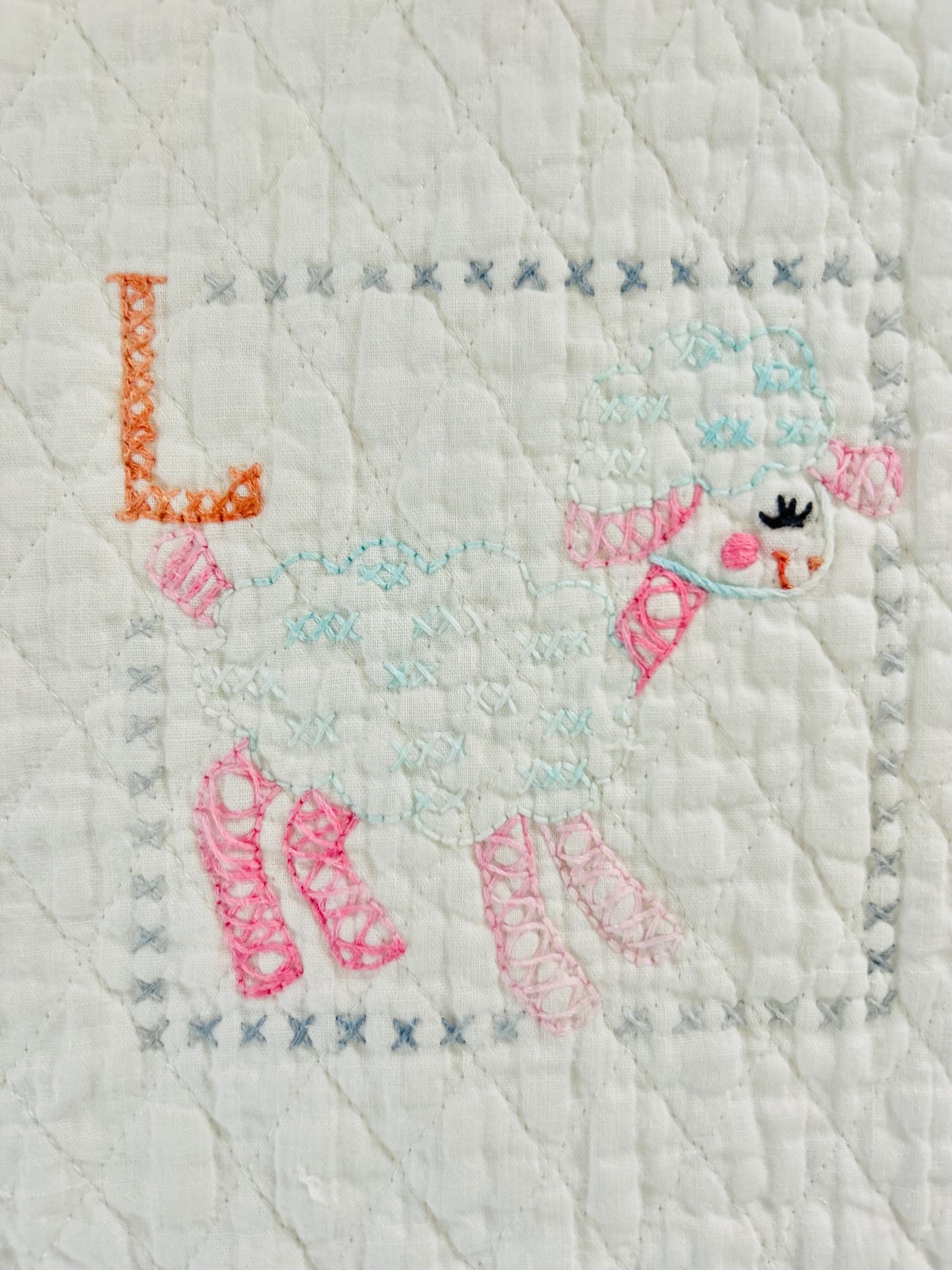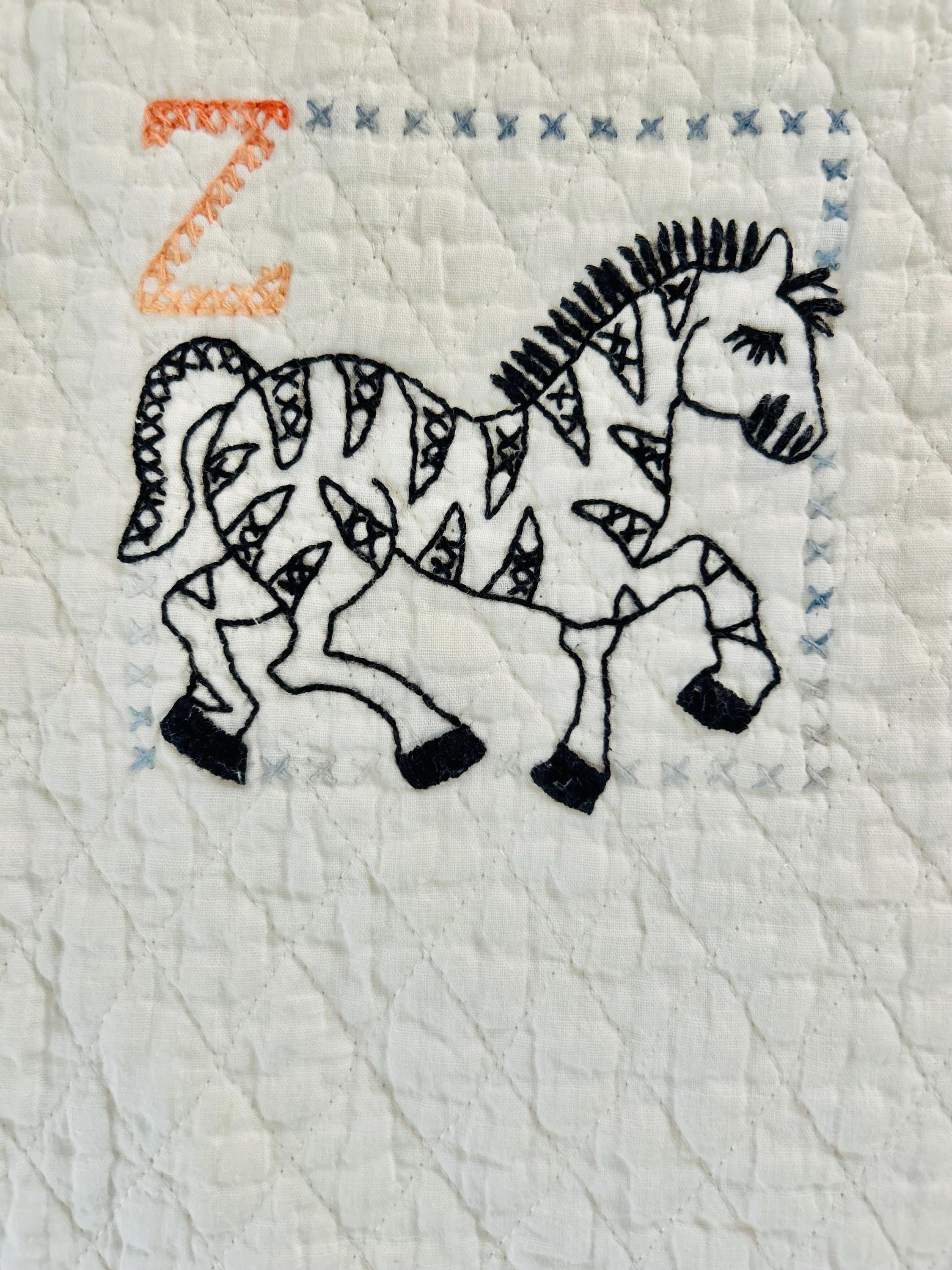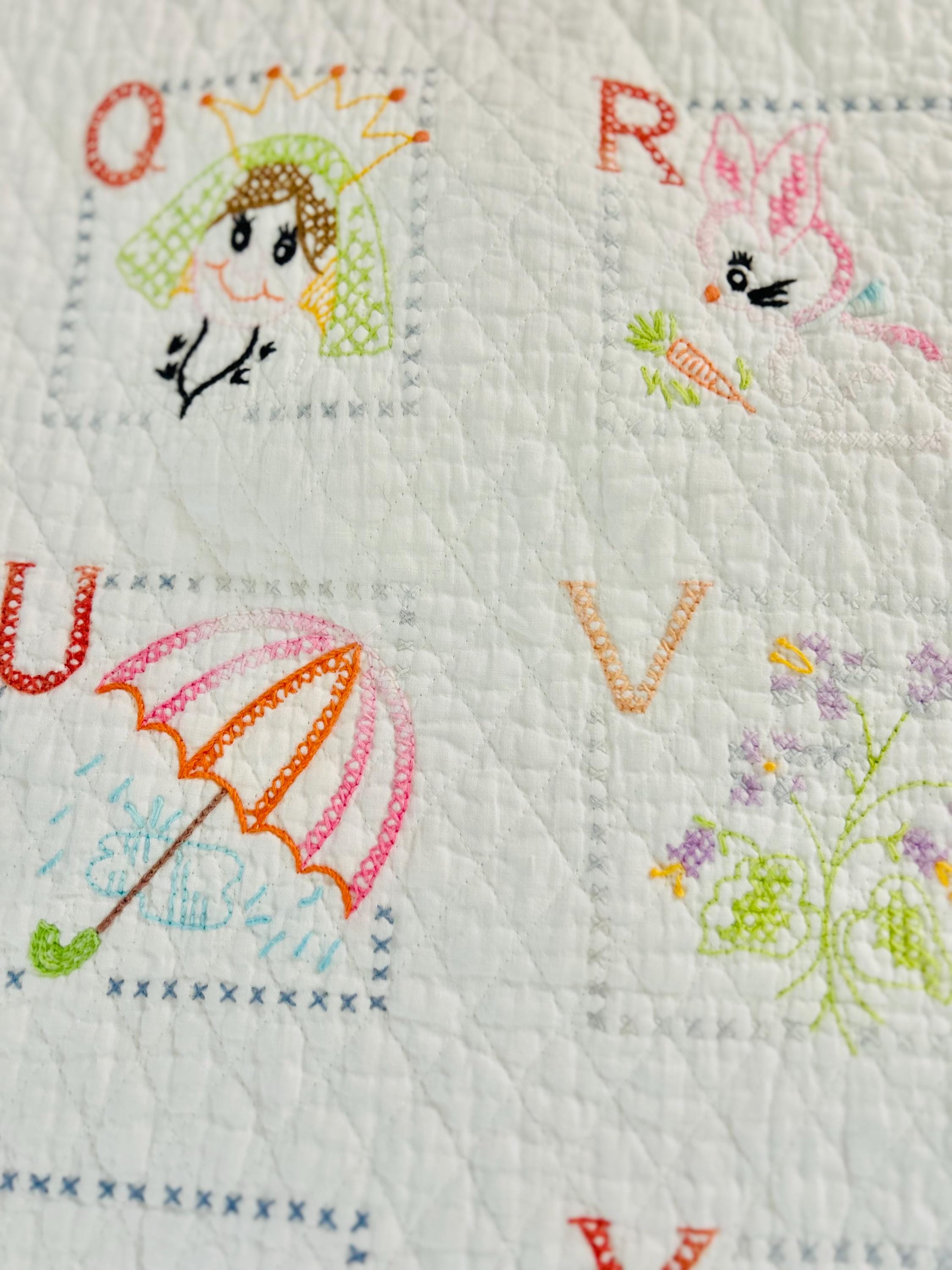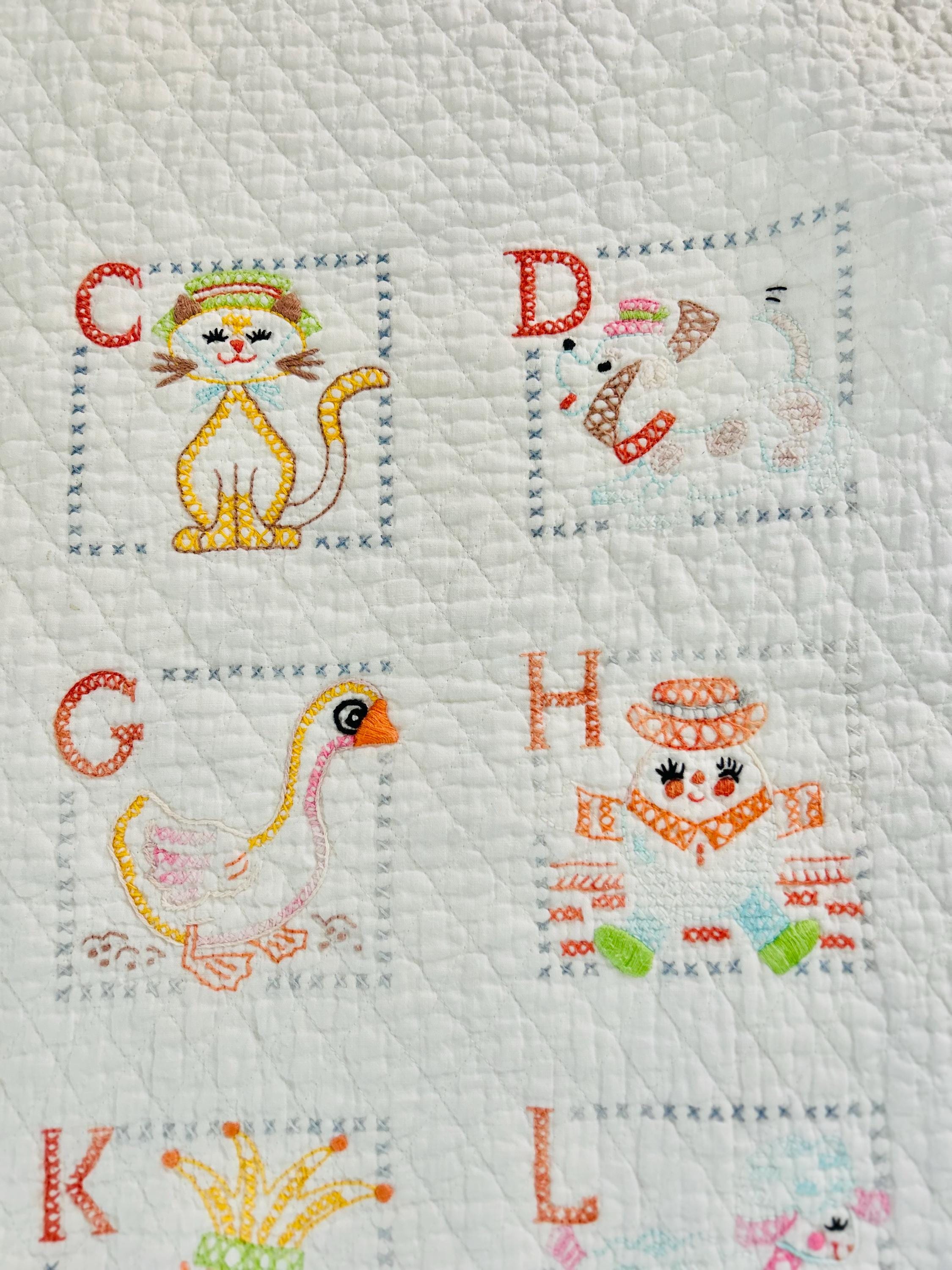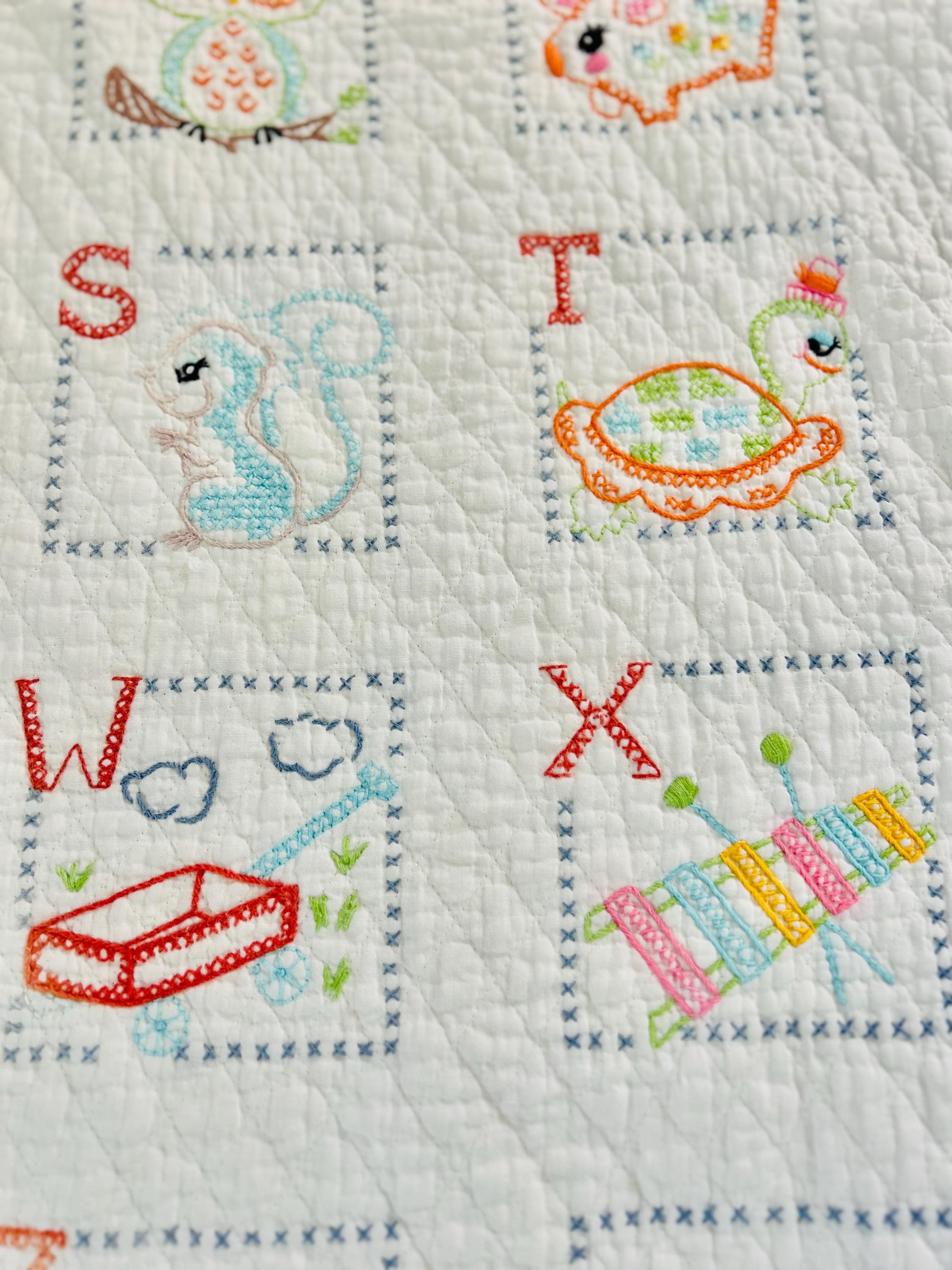 Such a sweet ABC Baby Quilt that has been hand-embroidered with 26 alphabet blocks, each with a vintage illustration: birds, elephants, rabbits, frogs, turtles, a zebra, a piggy bank and more. Made from soft white cotton, it has an all-over diamond-grid quilt pattern.