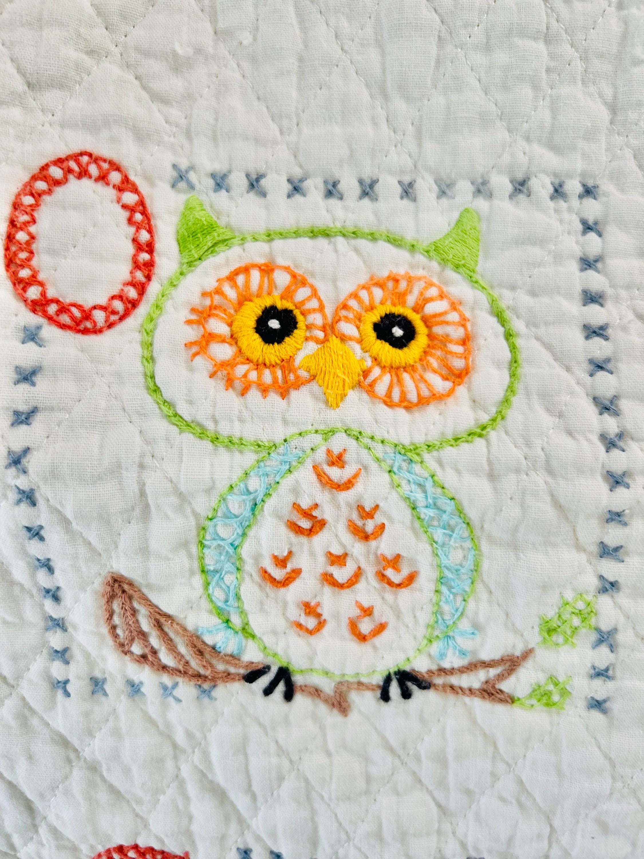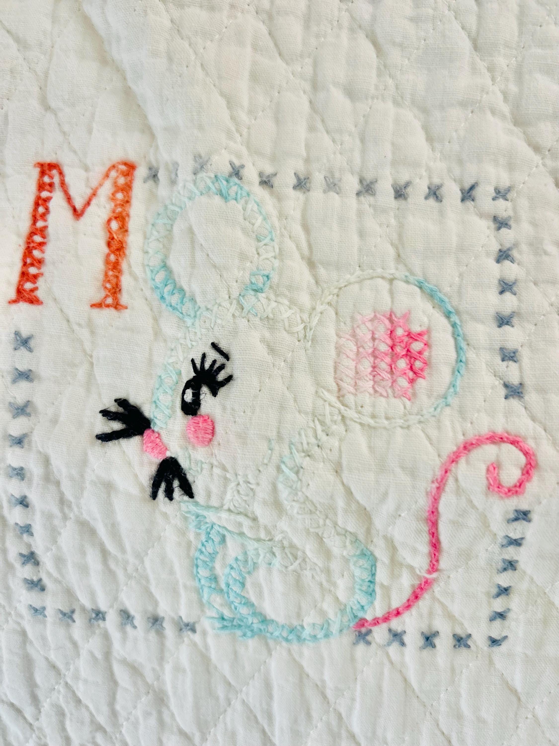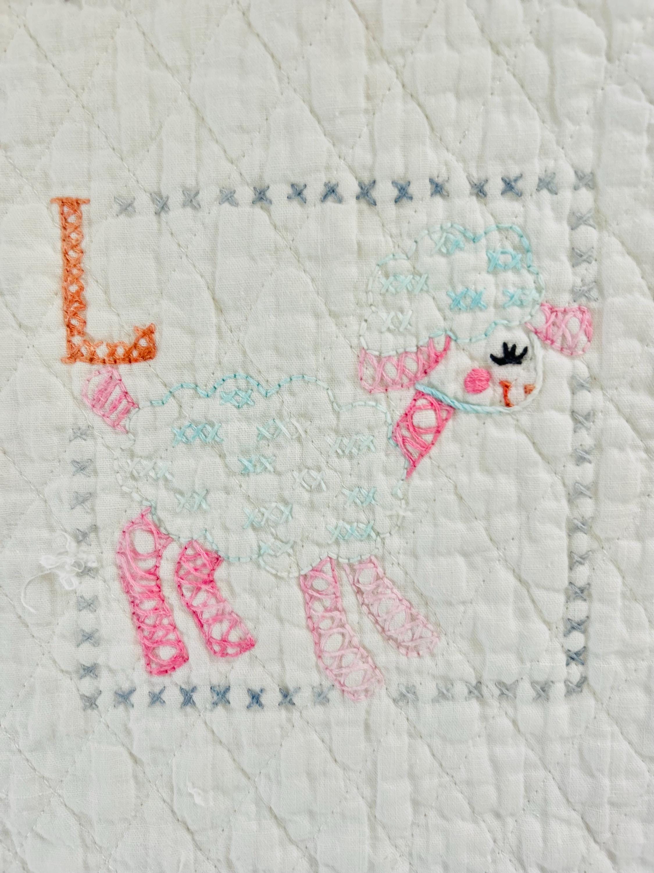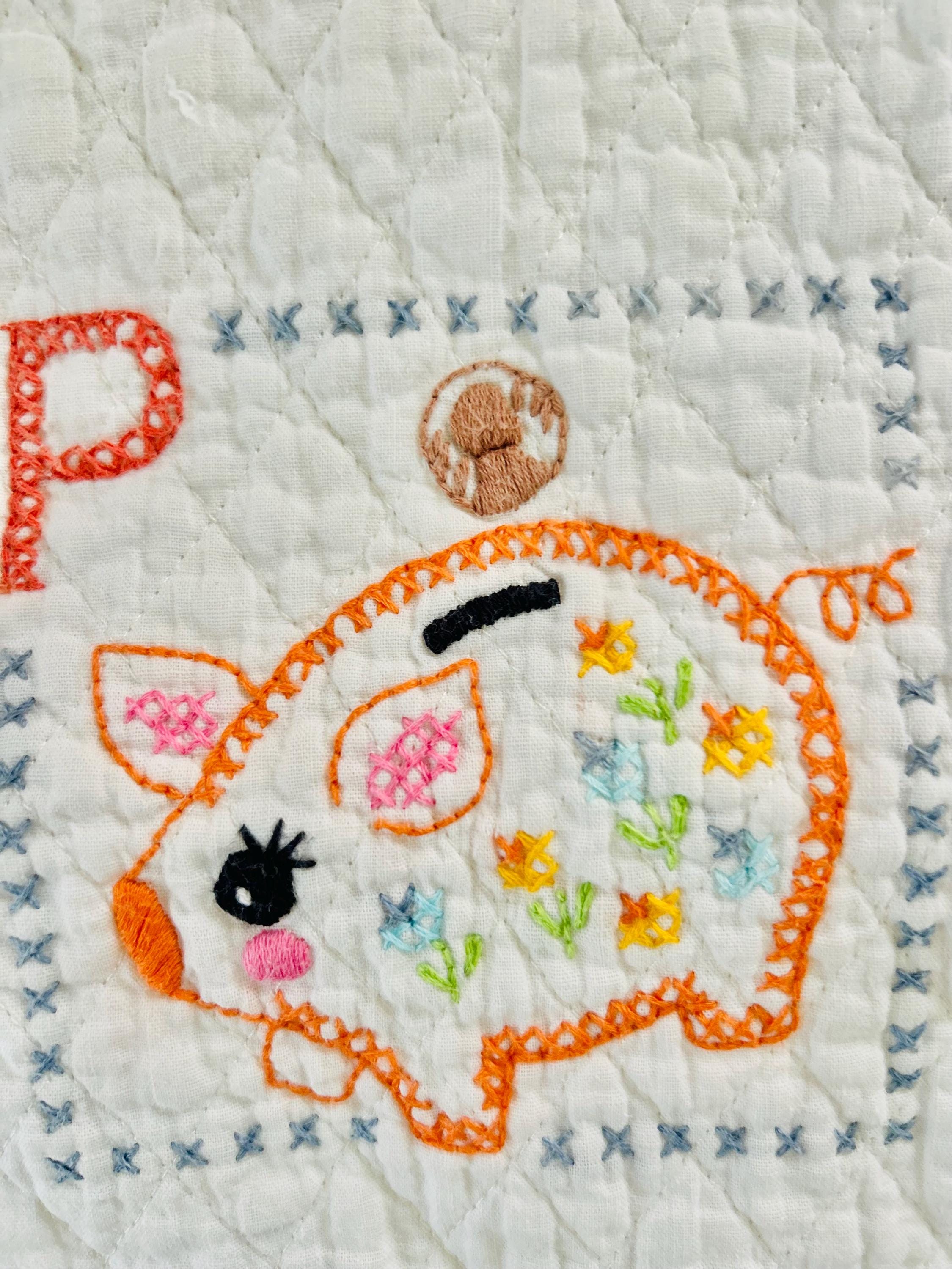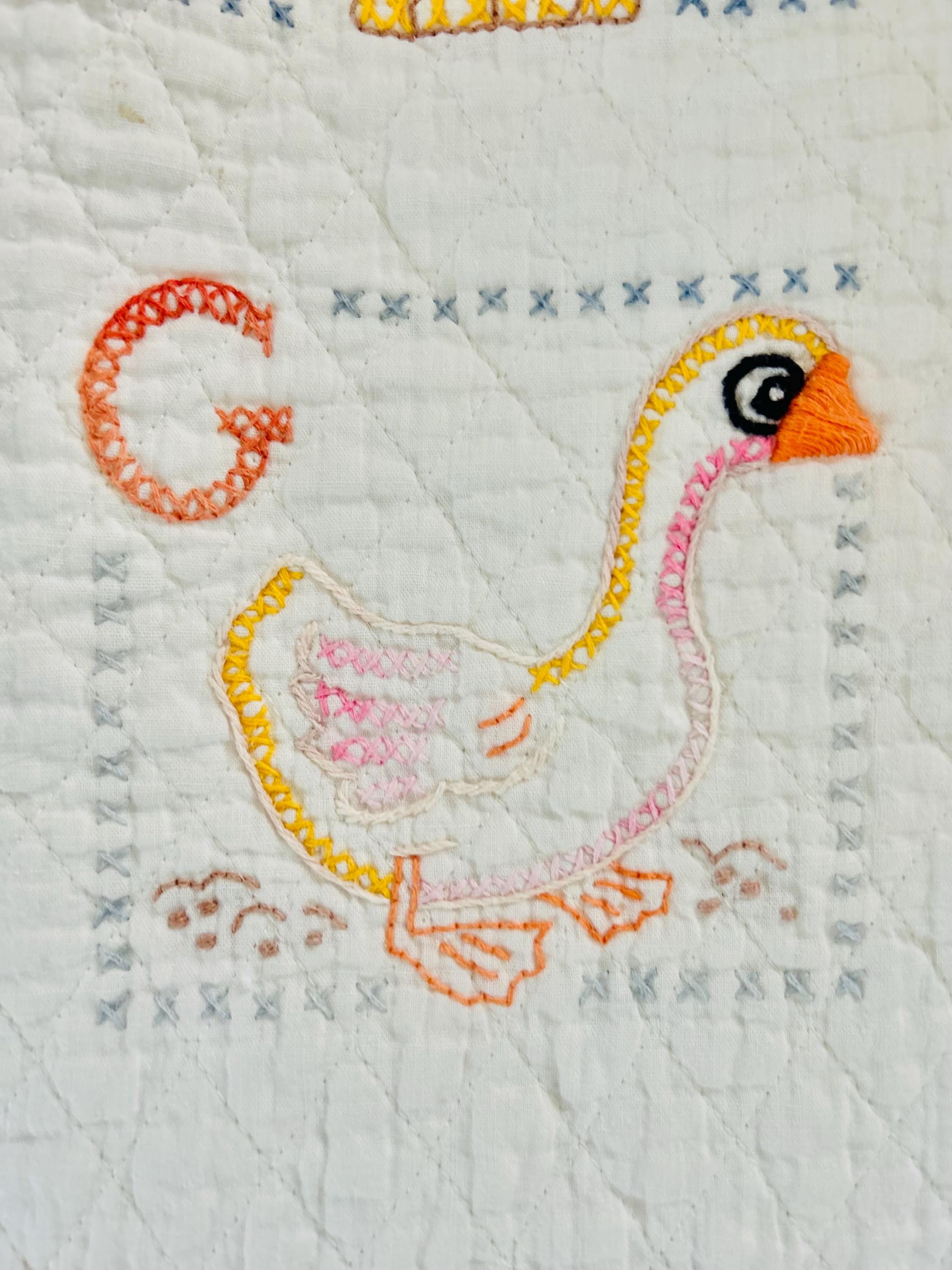 Such a sweet ABC Baby Quilt that has been hand-embroidered with 26 alphabet blocks, each with a vintage illustration: birds, elephants, rabbits, frogs, turtles, a zebra, a piggy bank and more. Made from soft white cotton, it has an all-over diamond-grid quilt pattern.