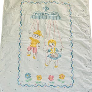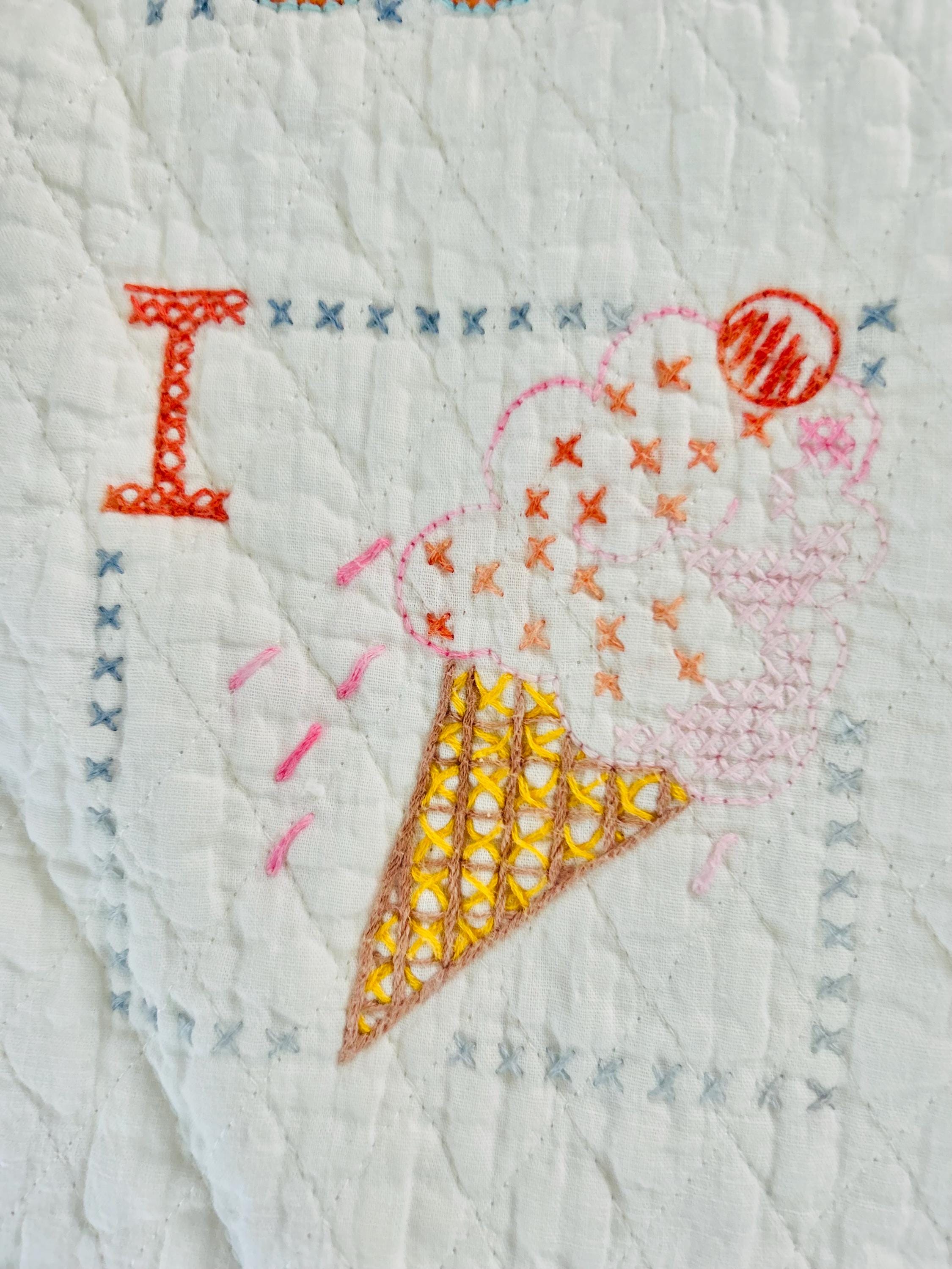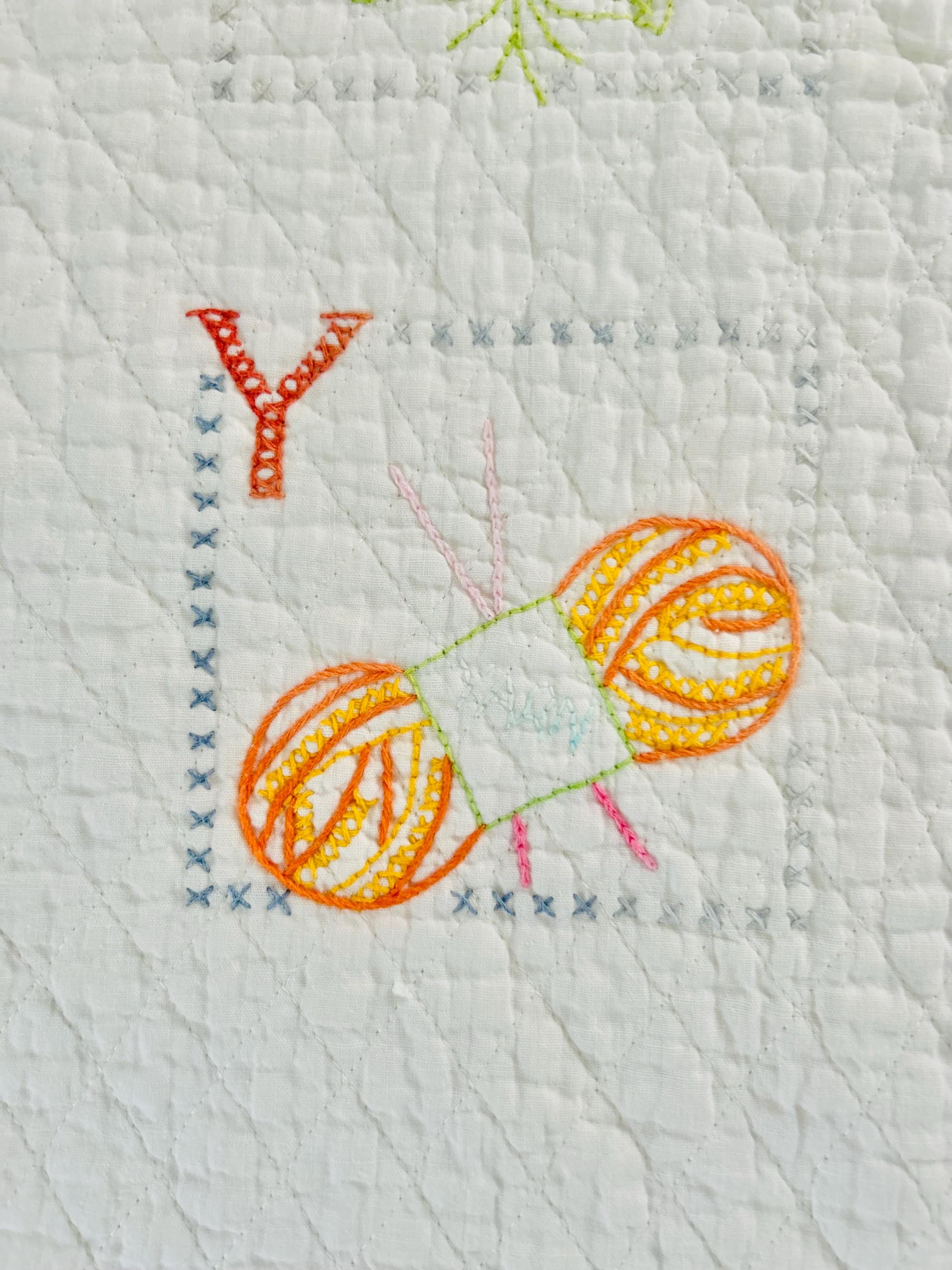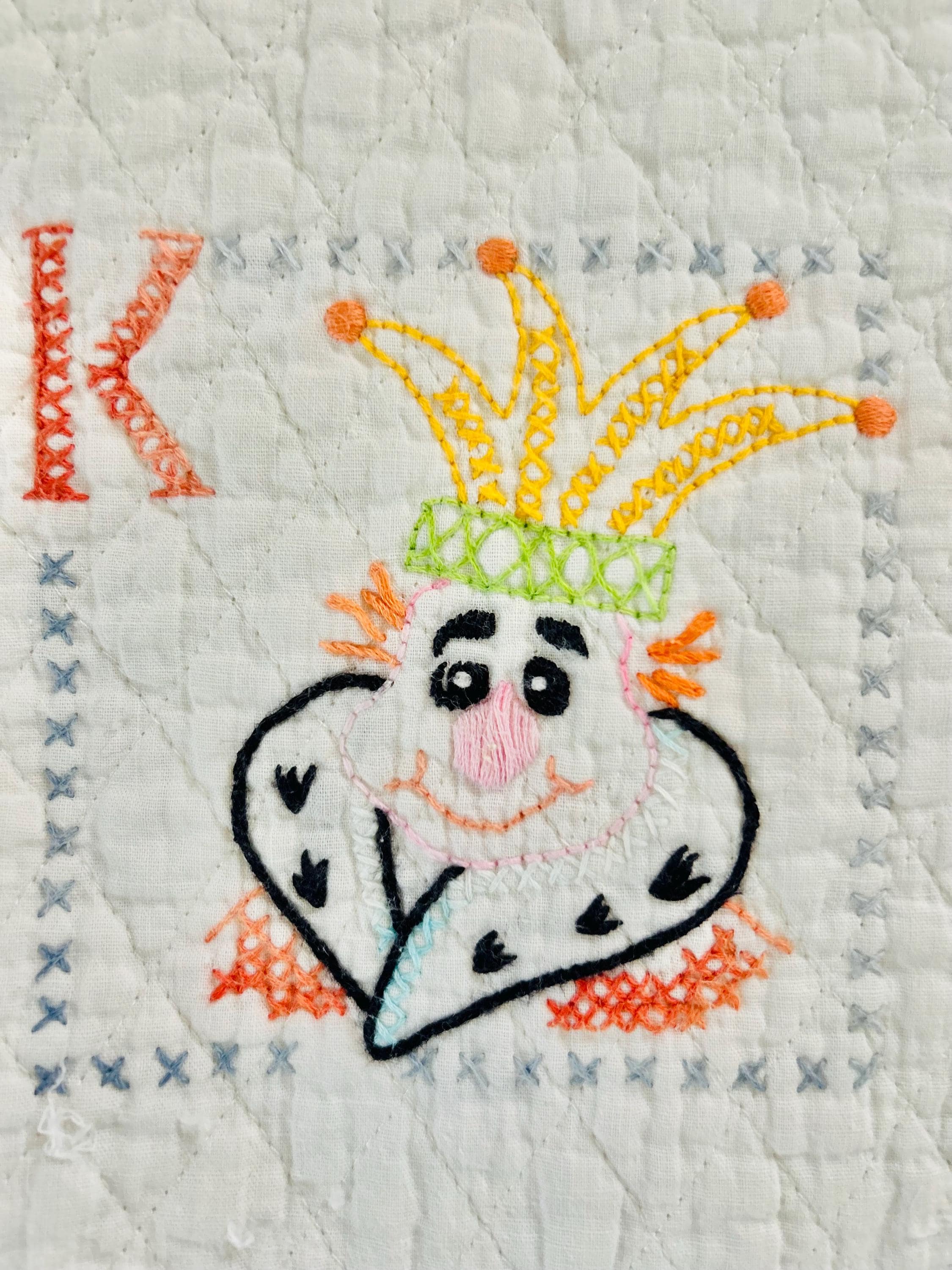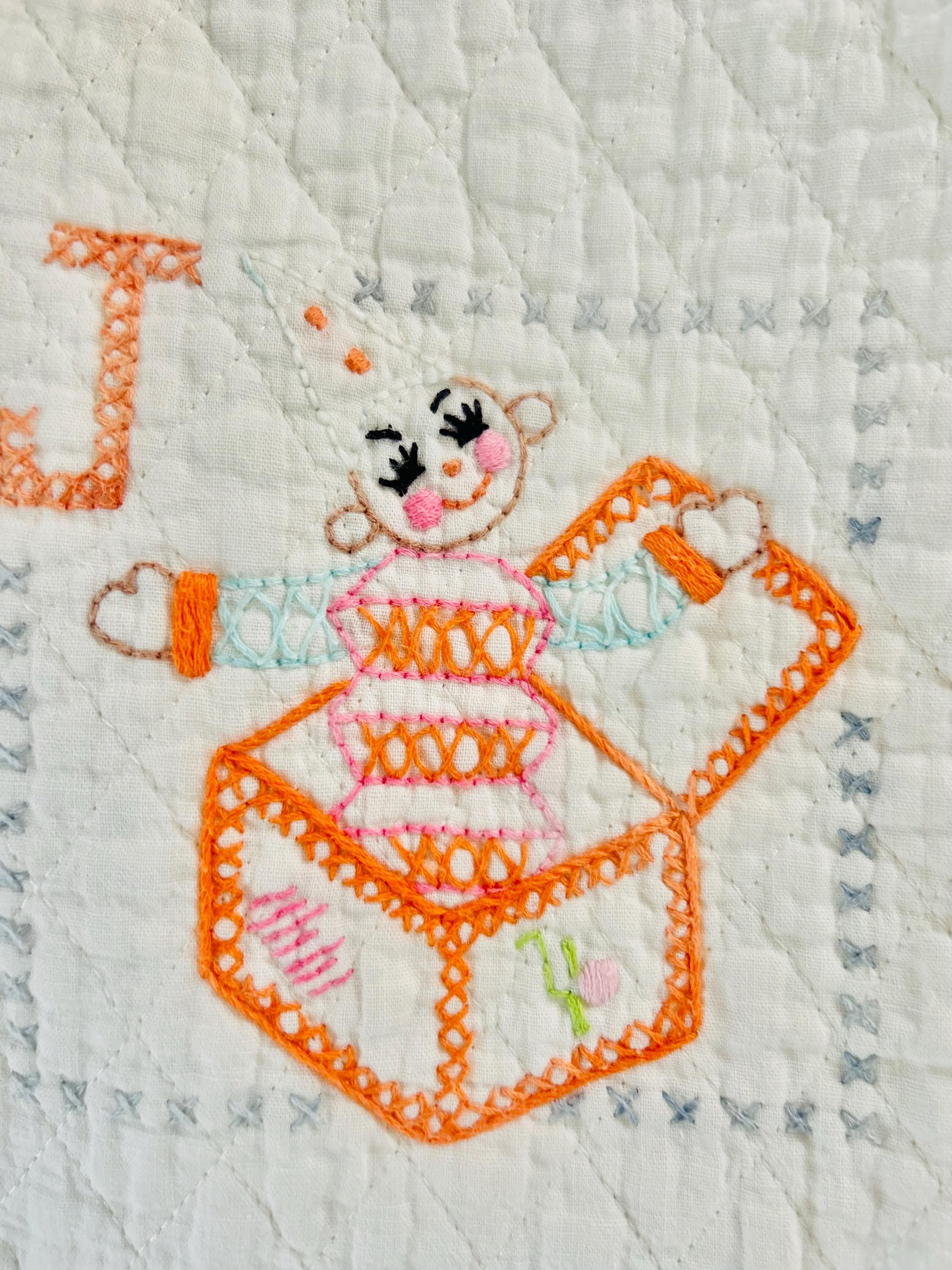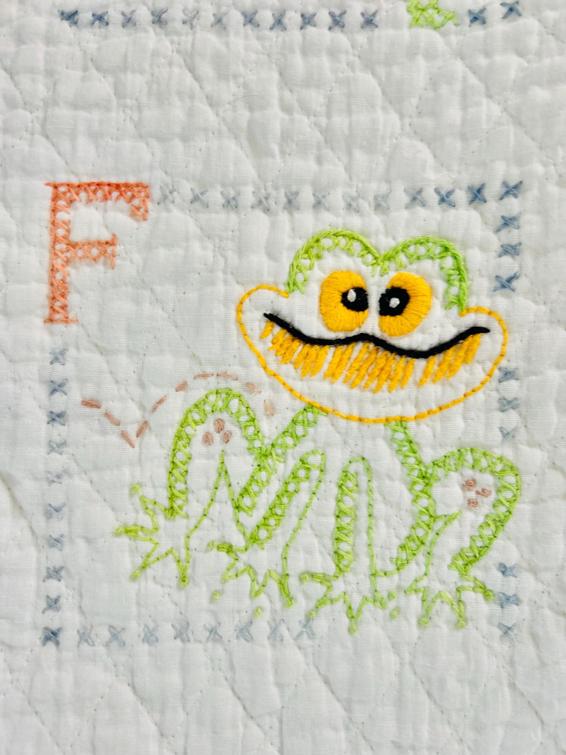 Such a sweet ABC Baby Quilt that has been hand-embroidered with 26 alphabet blocks, each with a vintage illustration: birds, elephants, rabbits, frogs, turtles, a zebra, a piggy bank and more. Made from soft white cotton, it has an all-over diamond-grid quilt pattern.