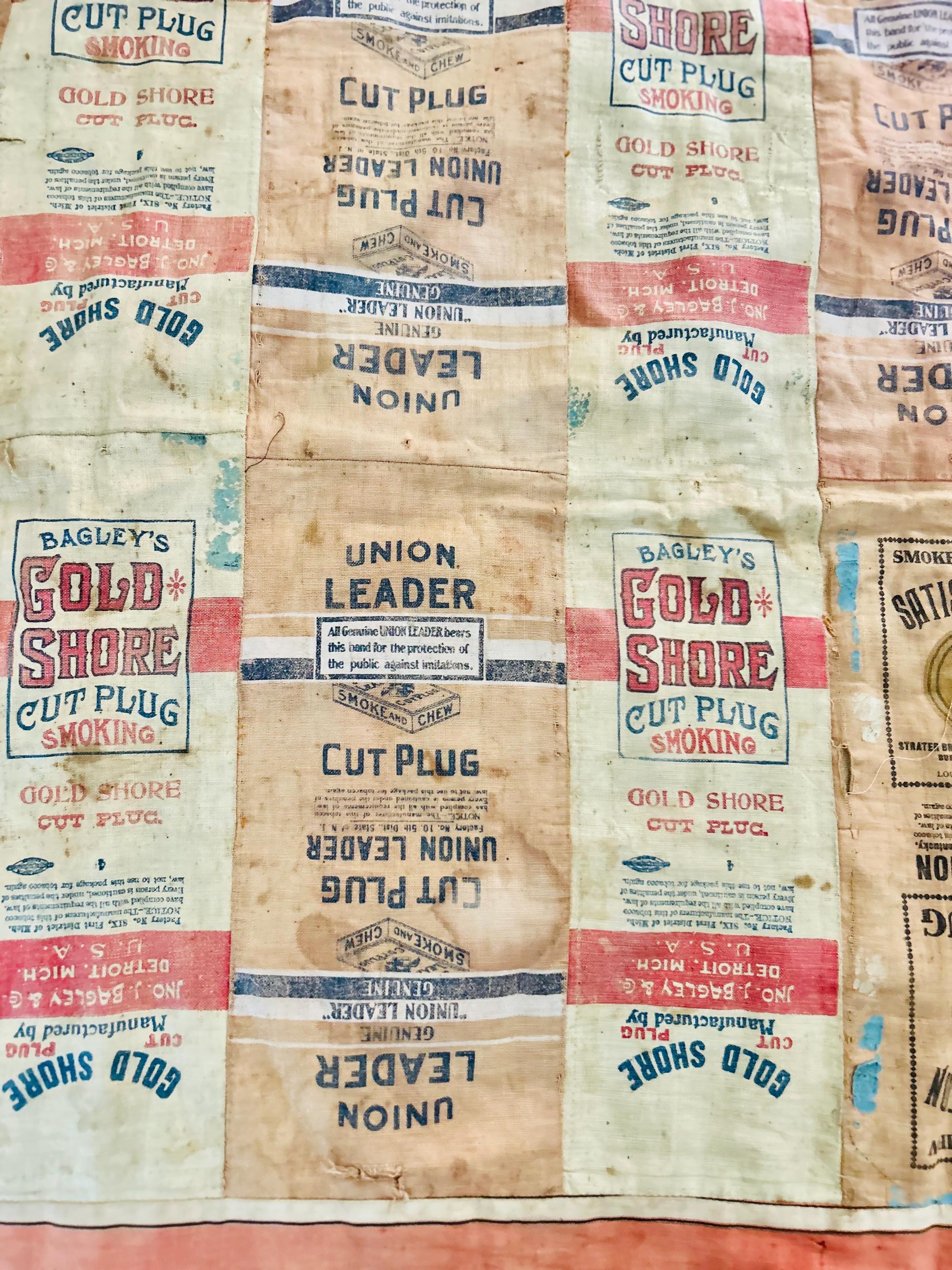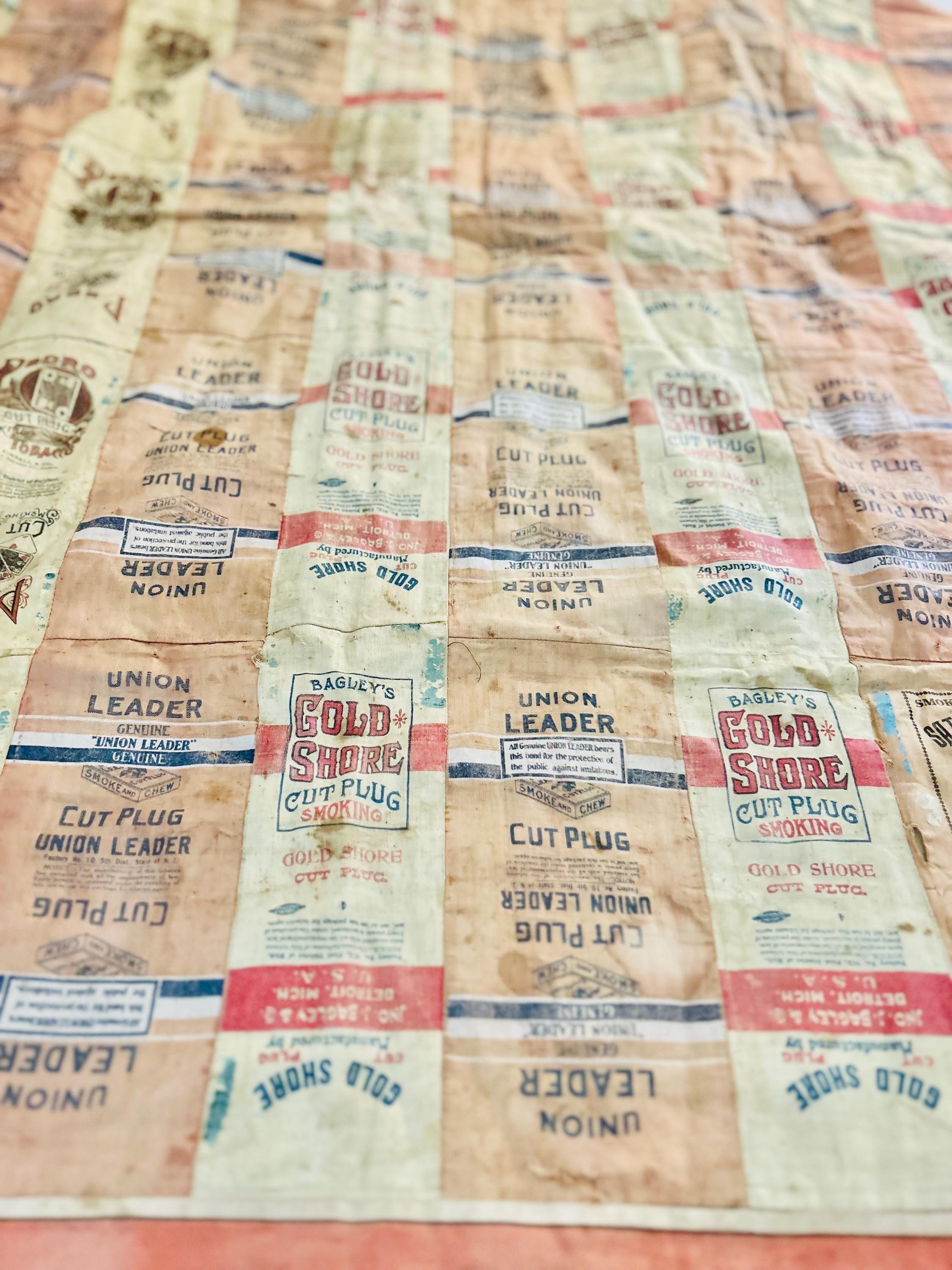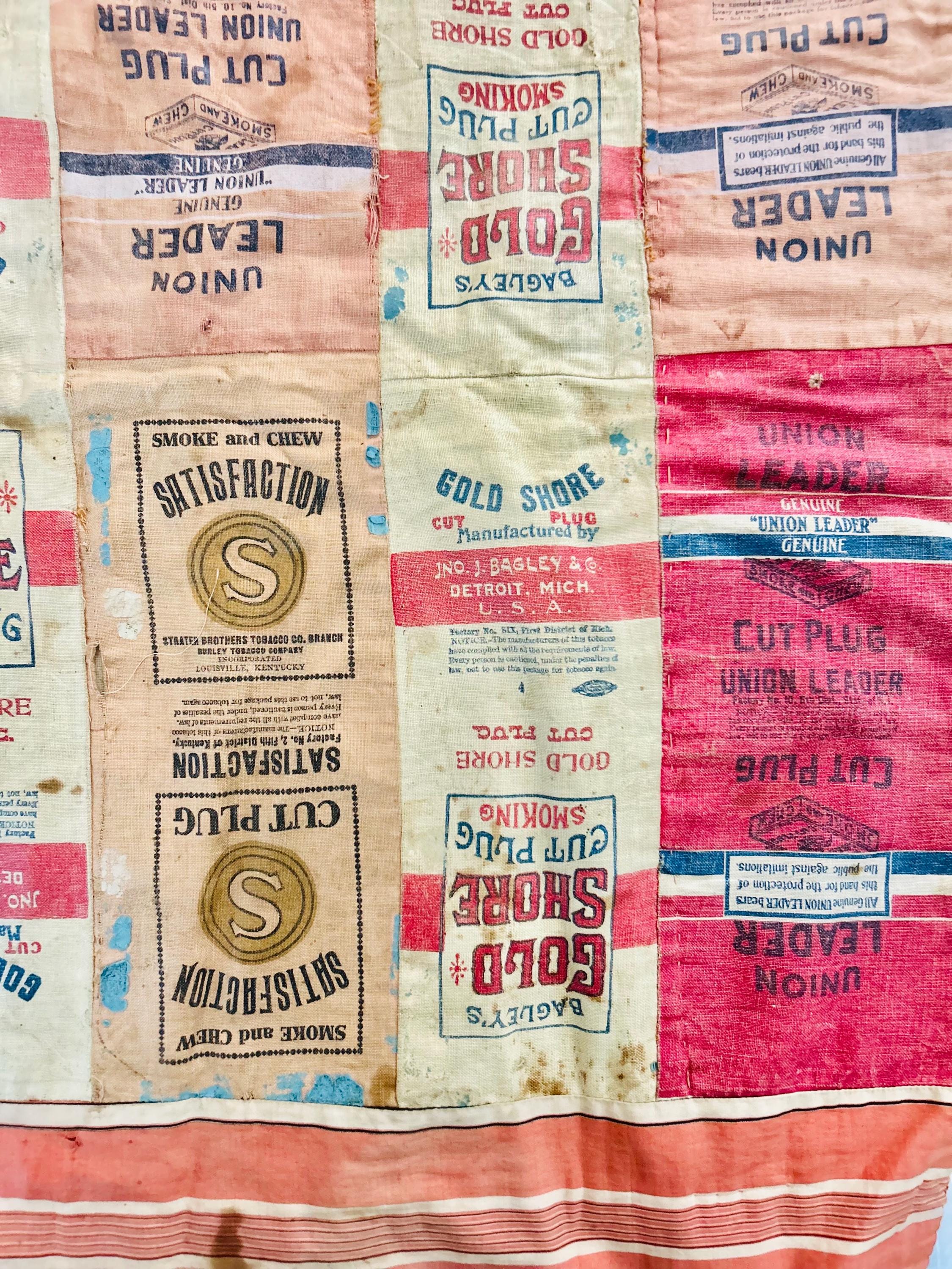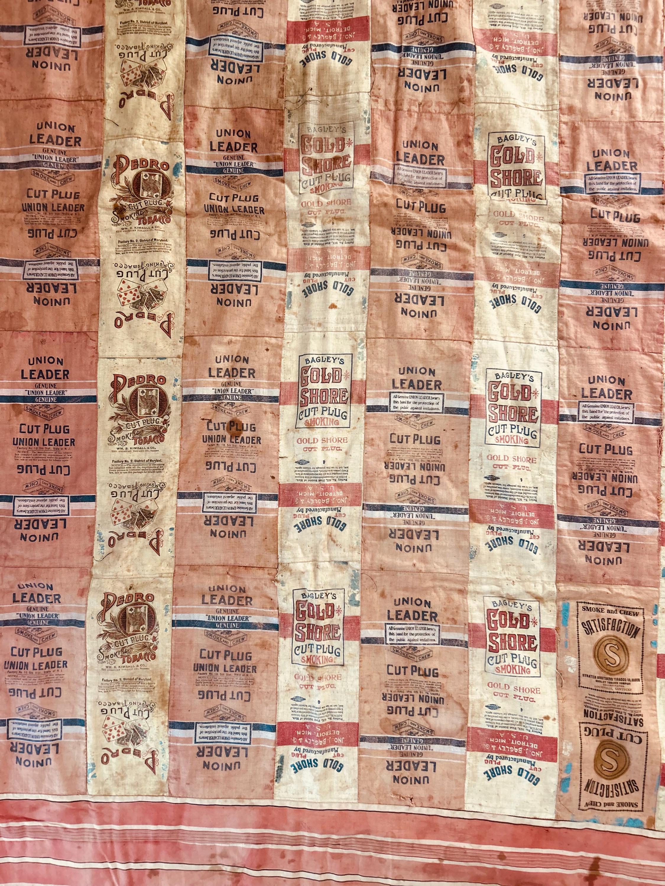 This striking and rare antique Advertising Premium Quilt is pieced entirely from early 1900s tobacco premium flannels that were collected at the time and saved from popular smoking tobacco brands of the era. It features vibrant logos from Union Leader, Bagley's Gold Shore Cut Plug, Pedro, and Satisfaction, some of the most iconic American tobacco advertising imagery of the time. It is entirely hand-stitched with light quilting.