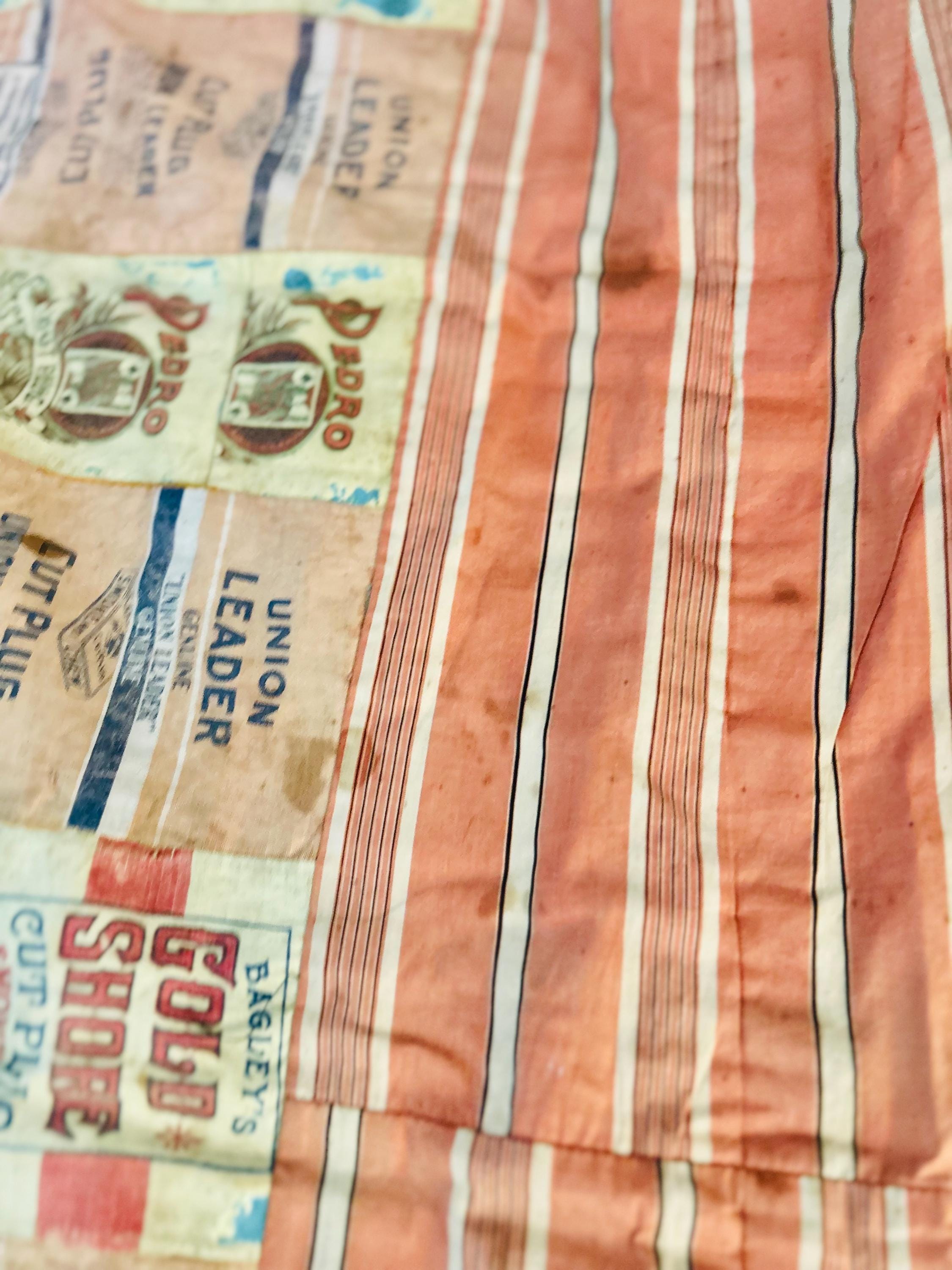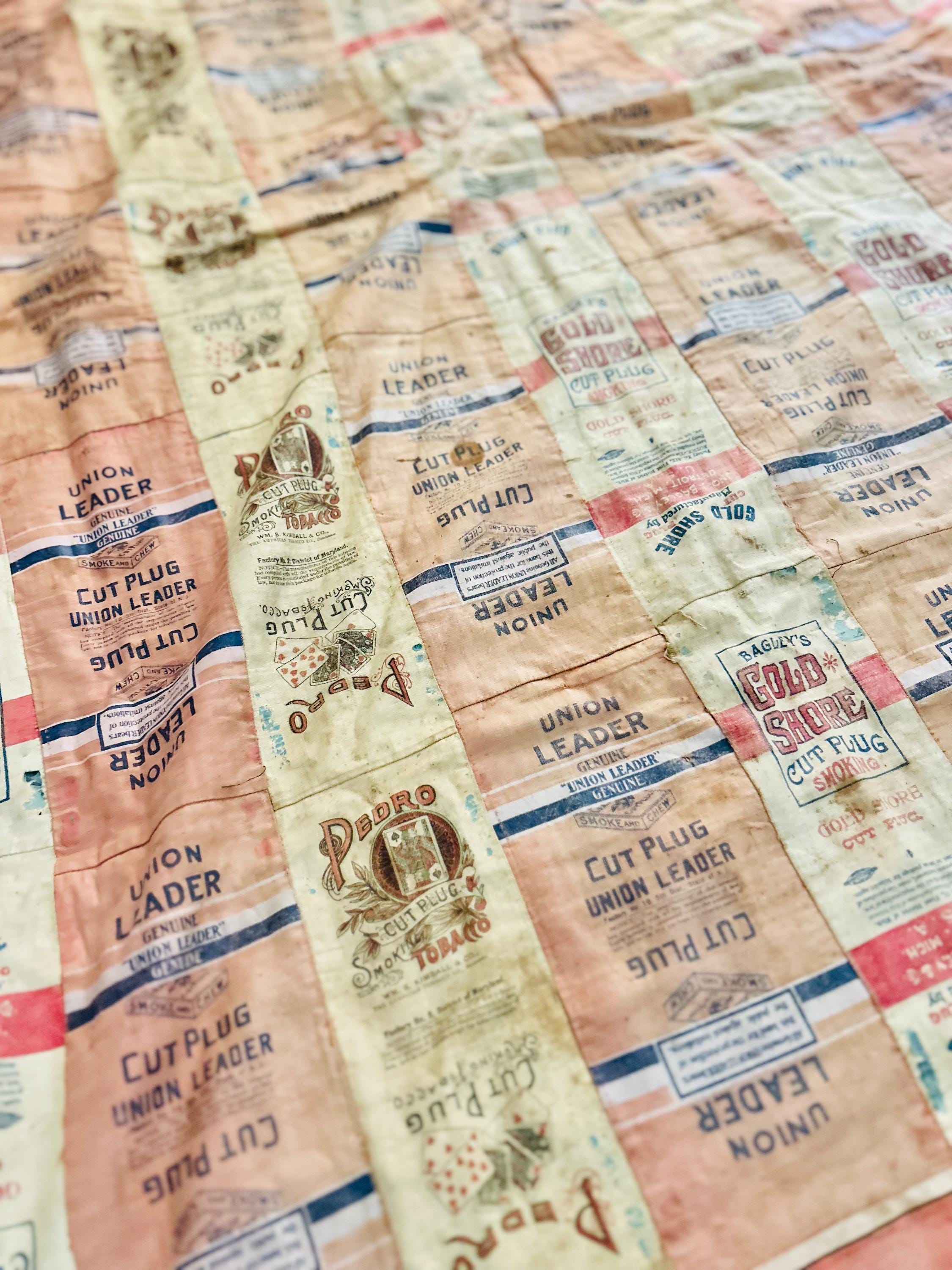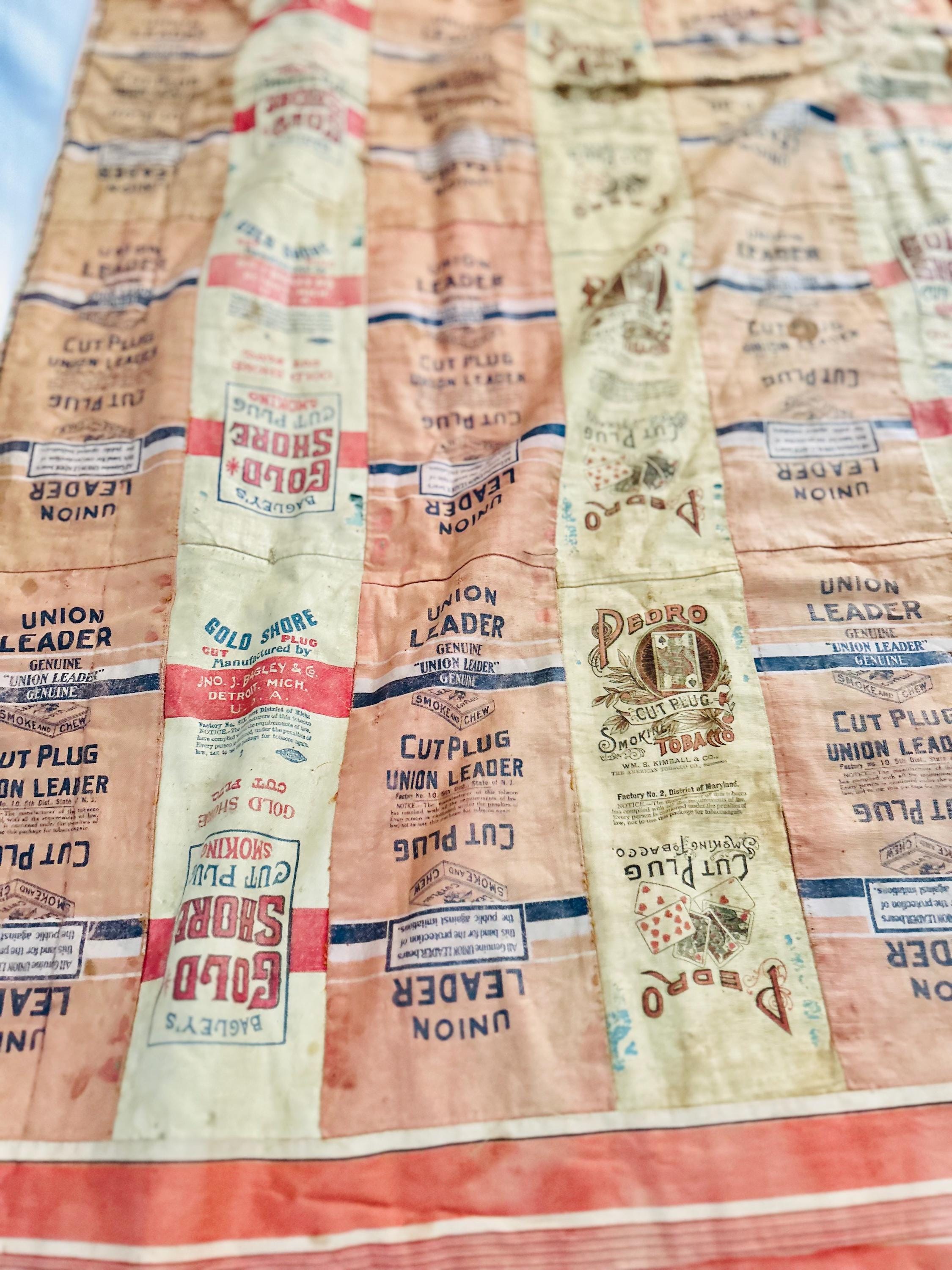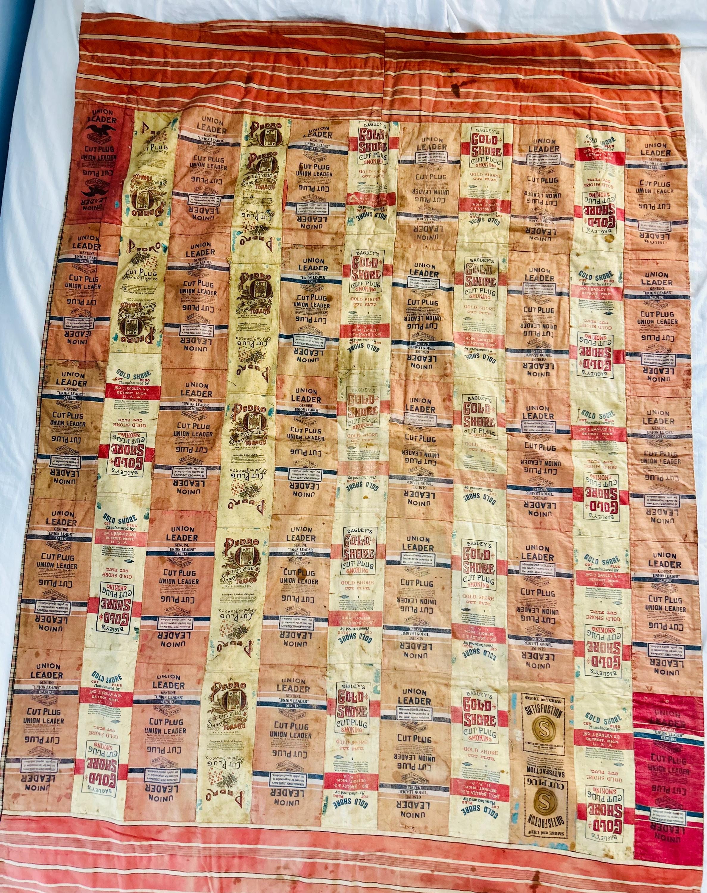 This striking and rare antique Advertising Premium Quilt is pieced entirely from early 1900s tobacco premium flannels that were collected at the time and saved from popular smoking tobacco brands of the era. It features vibrant logos from Union Leader, Bagley's Gold Shore Cut Plug, Pedro, and Satisfaction, some of the most iconic American tobacco advertising imagery of the time. It is entirely hand-stitched with light quilting.