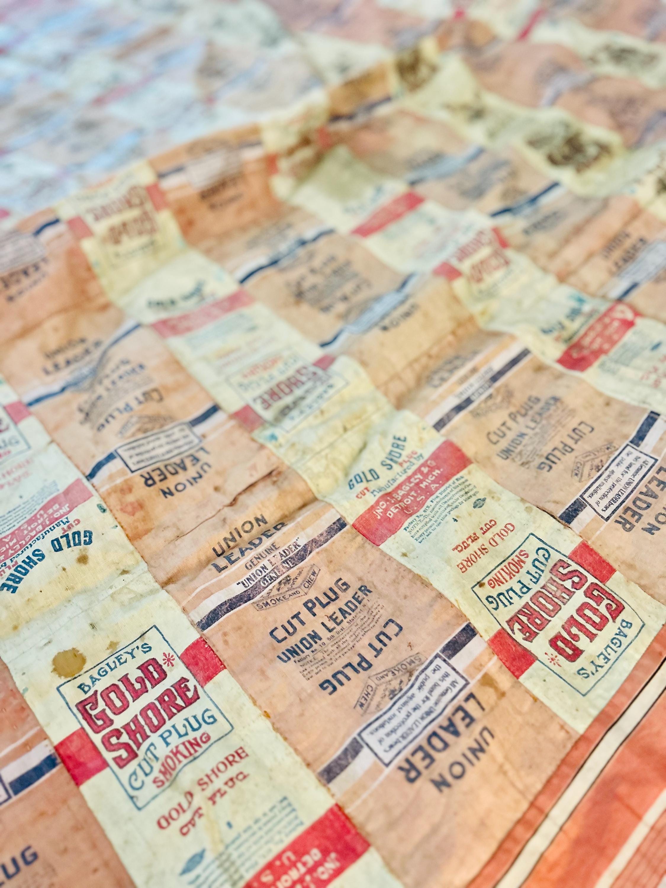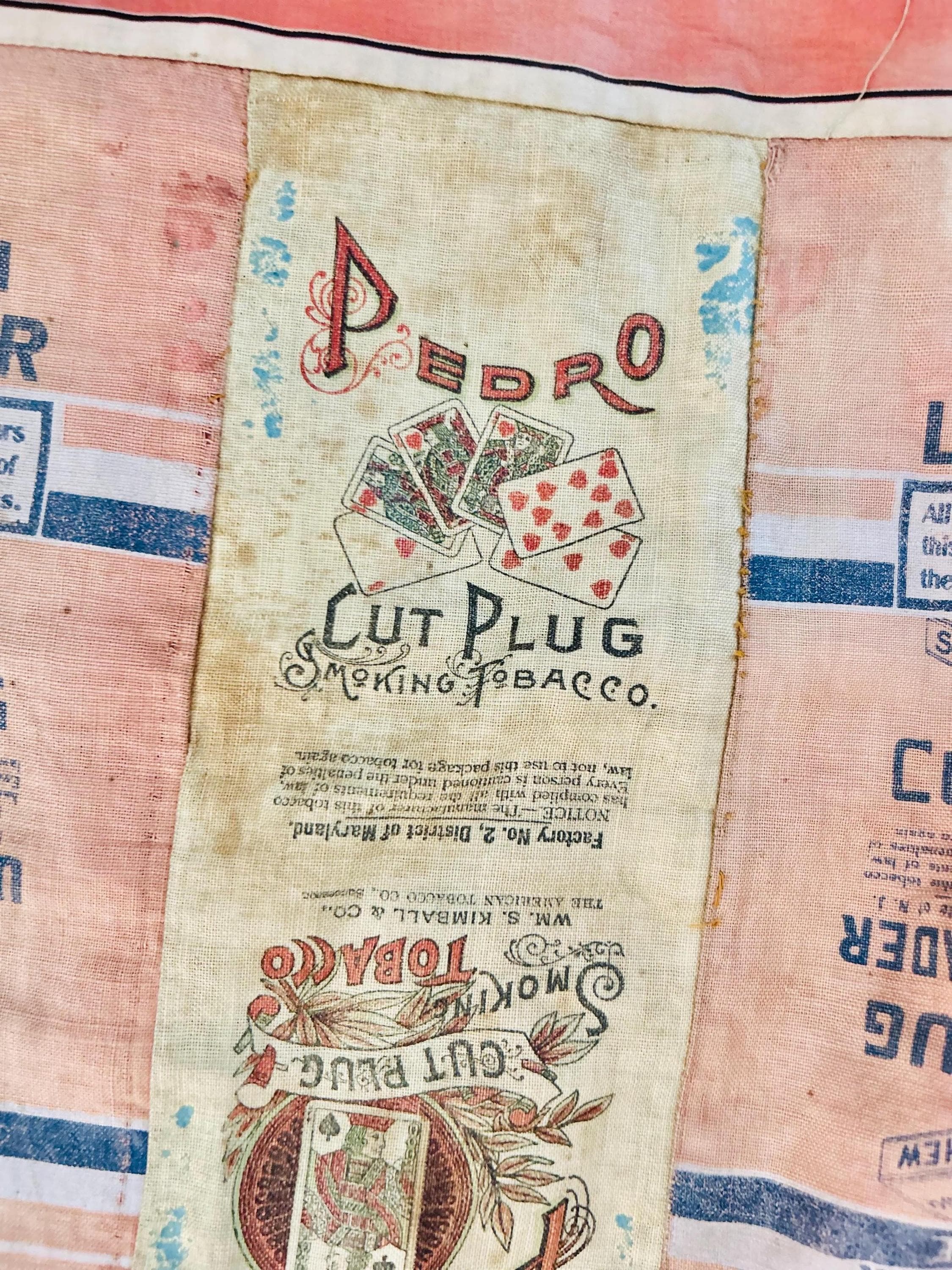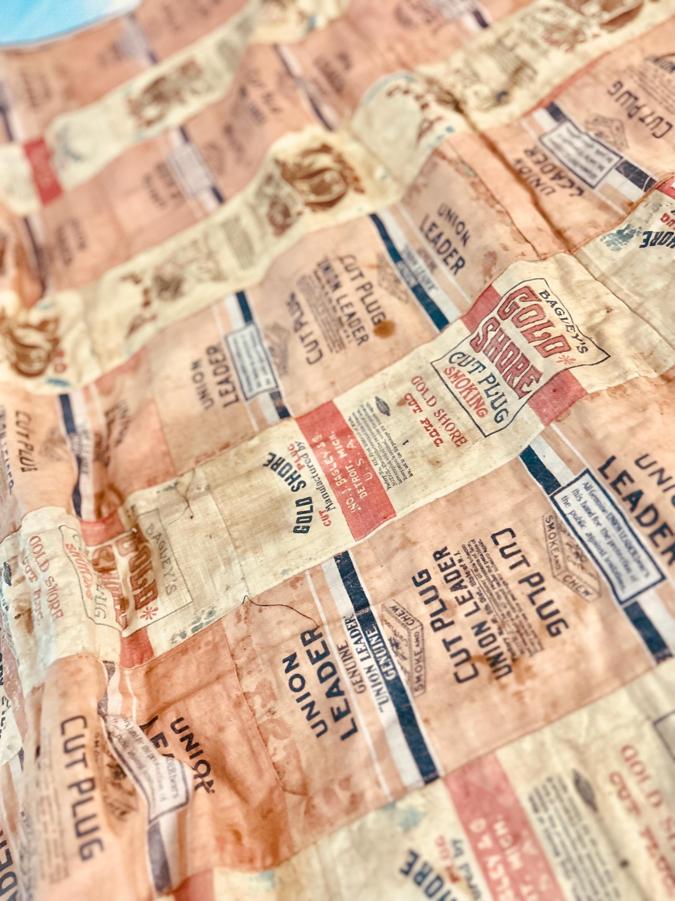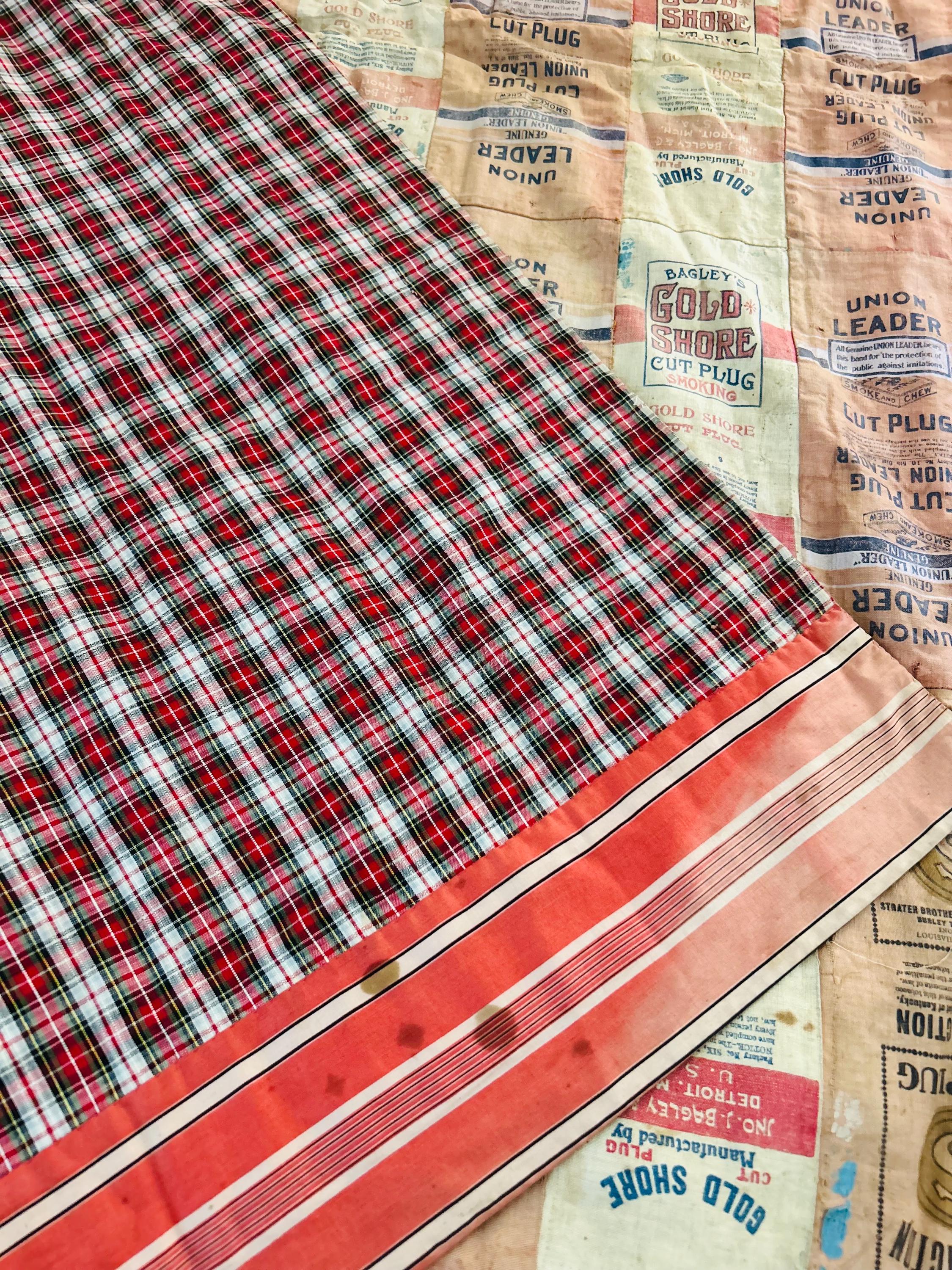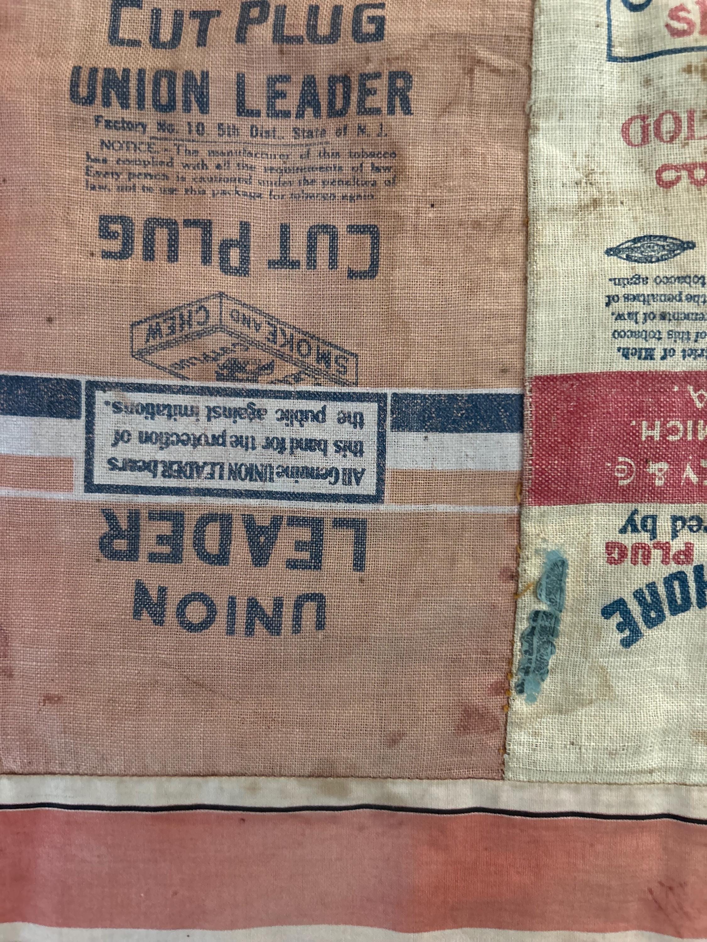 This striking and rare antique Advertising Premium Quilt is pieced entirely from early 1900s tobacco premium flannels that were collected at the time and saved from popular smoking tobacco brands of the era. It features vibrant logos from Union Leader, Bagley's Gold Shore Cut Plug, Pedro, and Satisfaction, some of the most iconic American tobacco advertising imagery of the time. It is entirely hand-stitched with light quilting.
