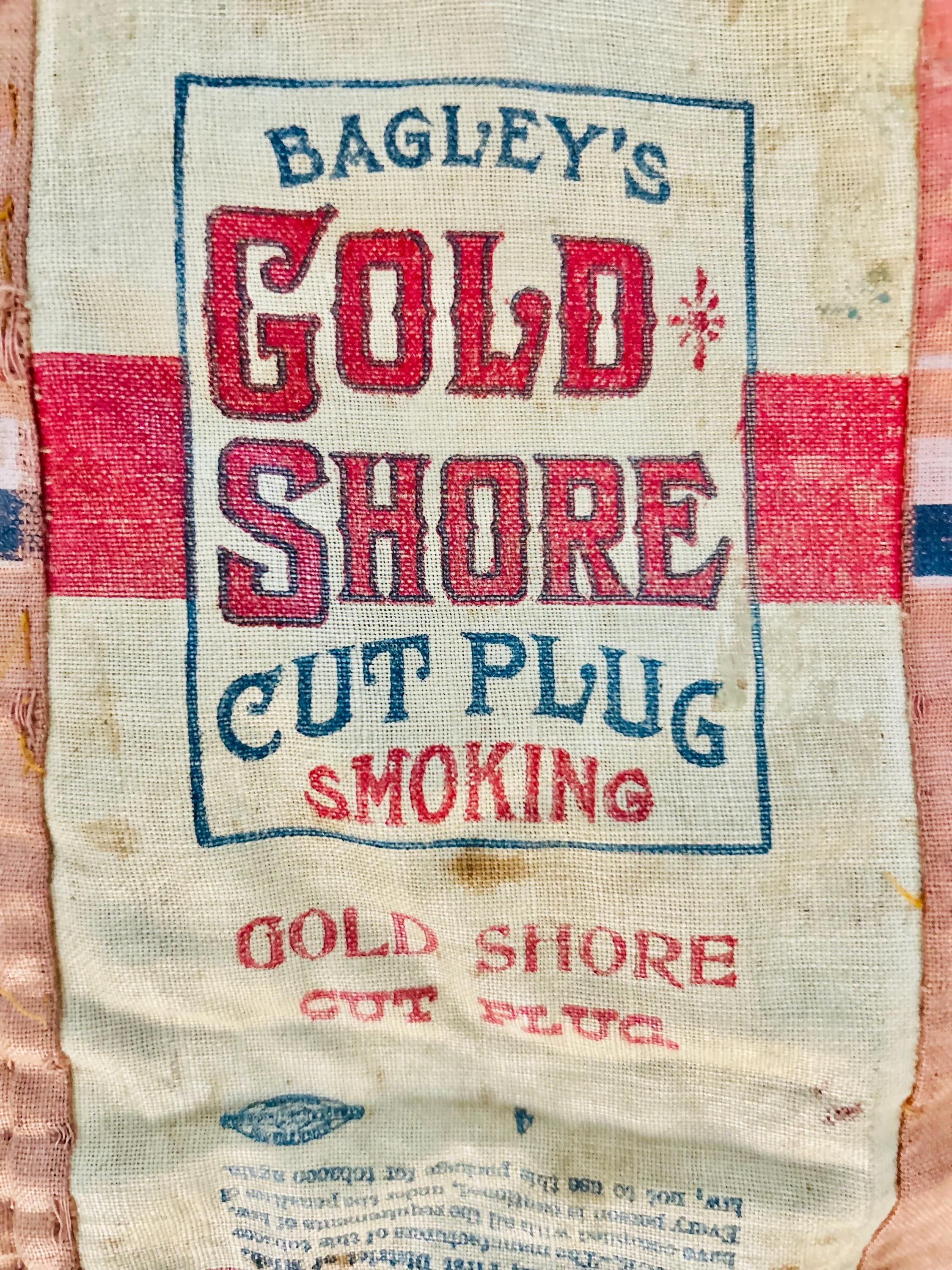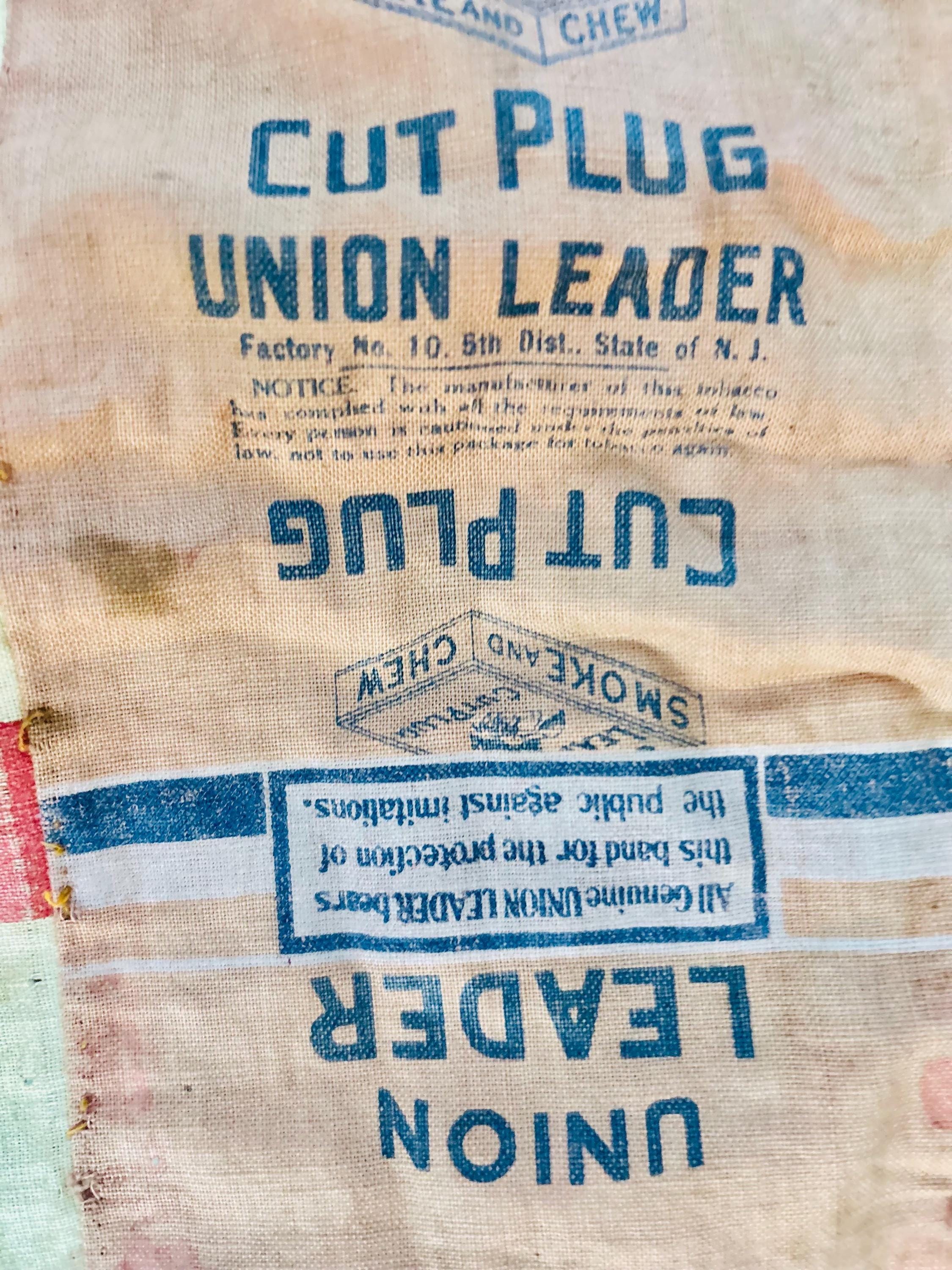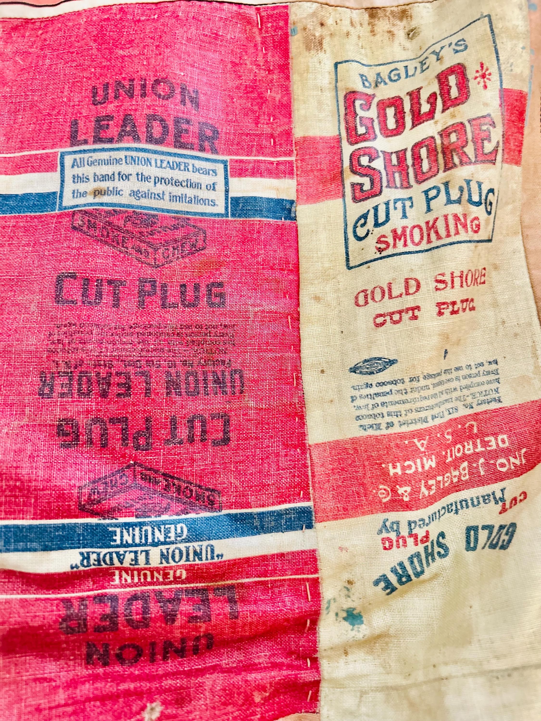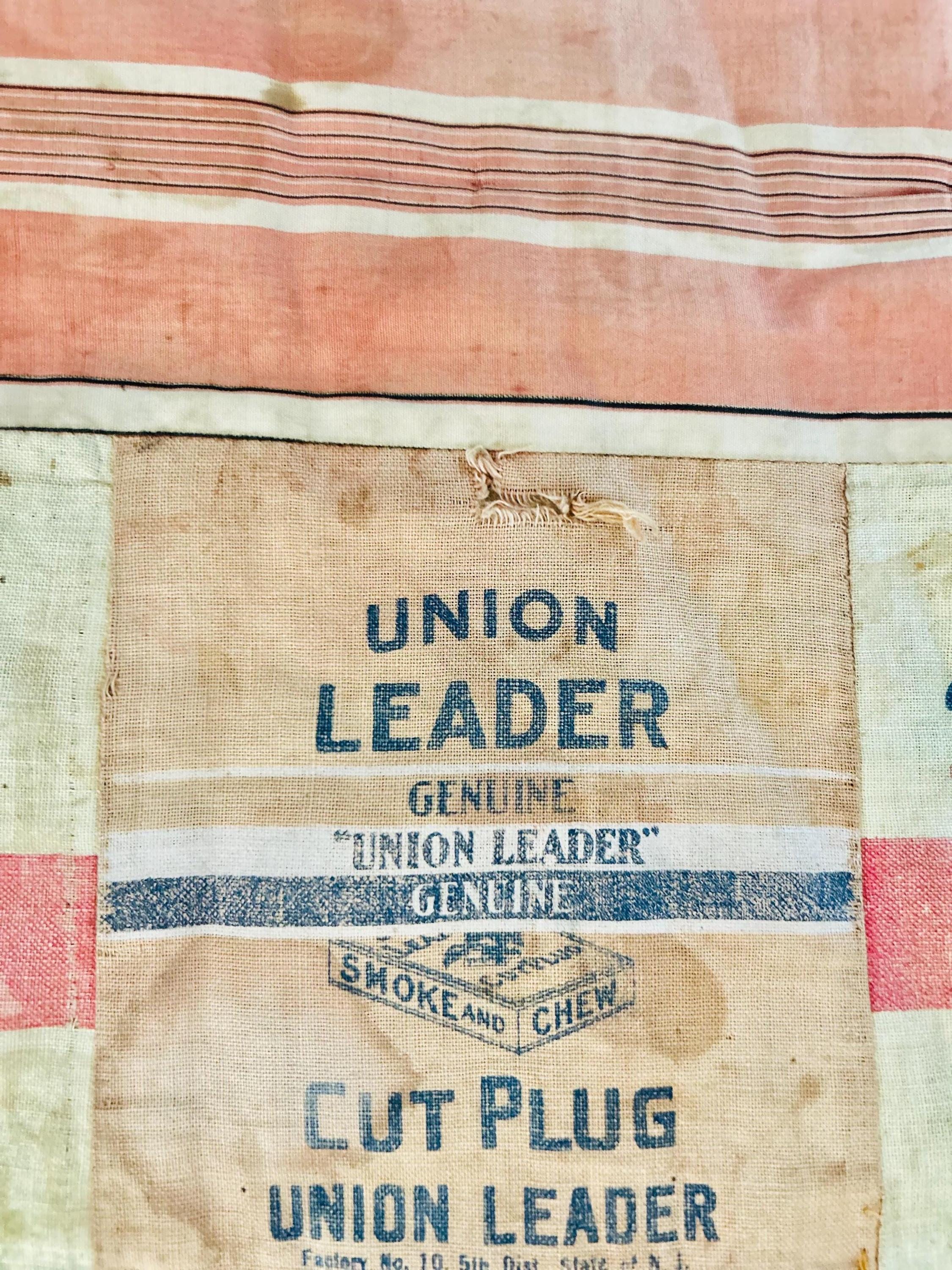 This striking and rare antique Advertising Premium Quilt is pieced entirely from early 1900s tobacco premium flannels that were collected at the time and saved from popular smoking tobacco brands of the era. It features vibrant logos from Union Leader, Bagley's Gold Shore Cut Plug, Pedro, and Satisfaction, some of the most iconic American tobacco advertising imagery of the time. It is entirely hand-stitched with light quilting.