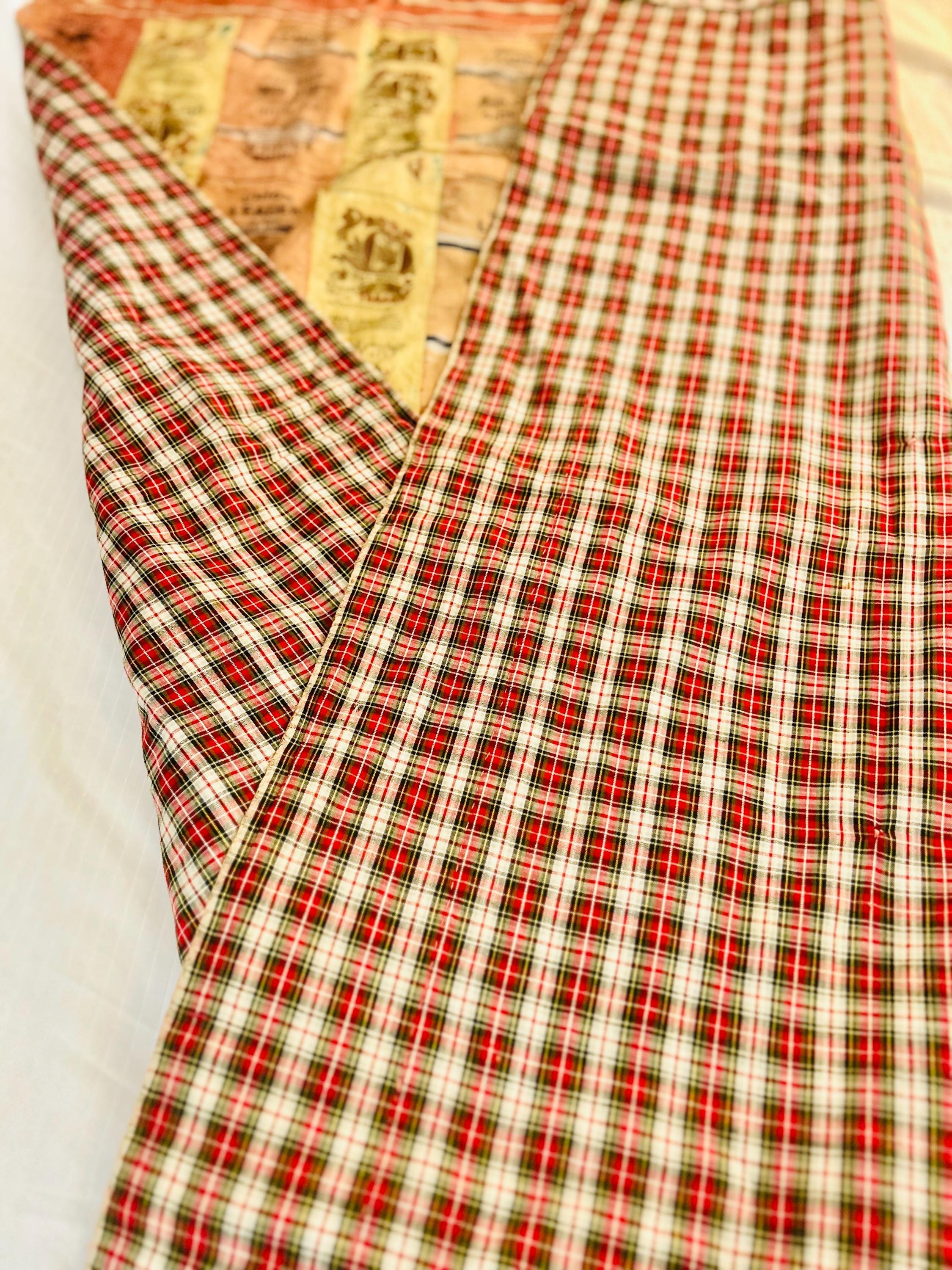 It is backed by early 20th Century plaid shirting fabric that is turned to the front and hand-stitched to form the binding. It does not appear to contain any batting.
