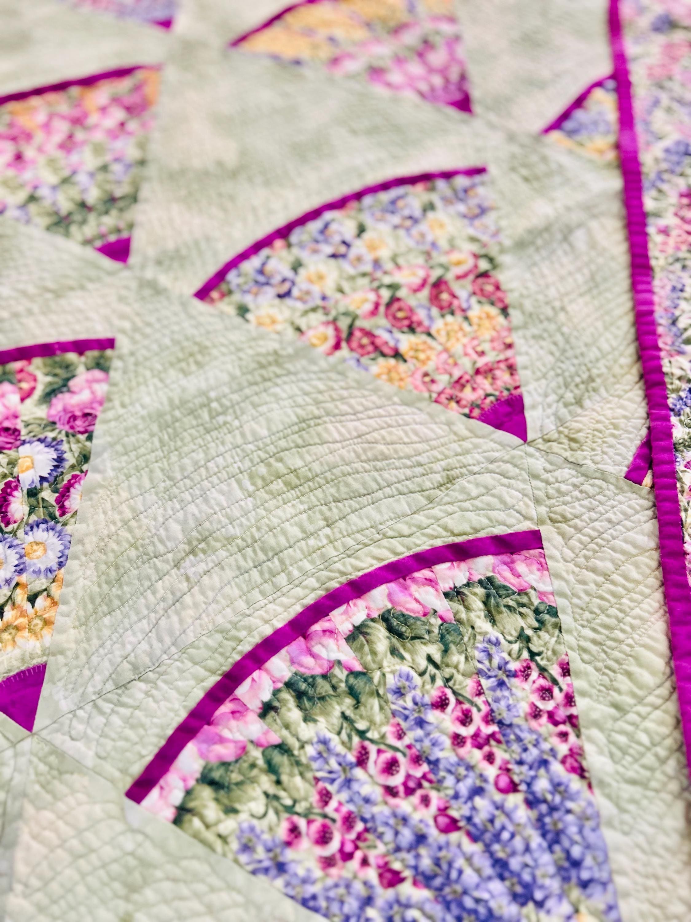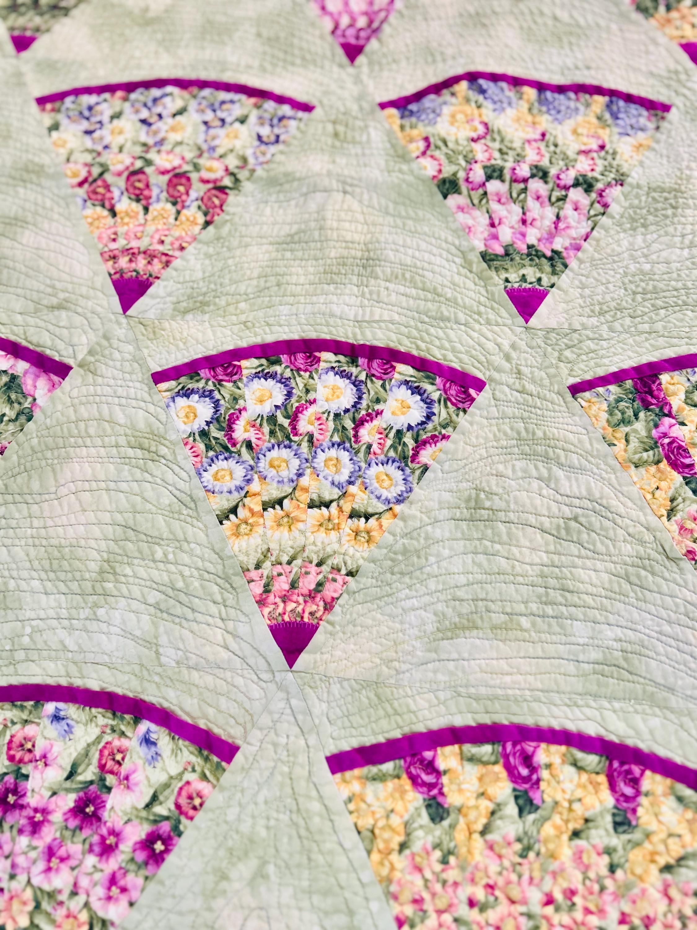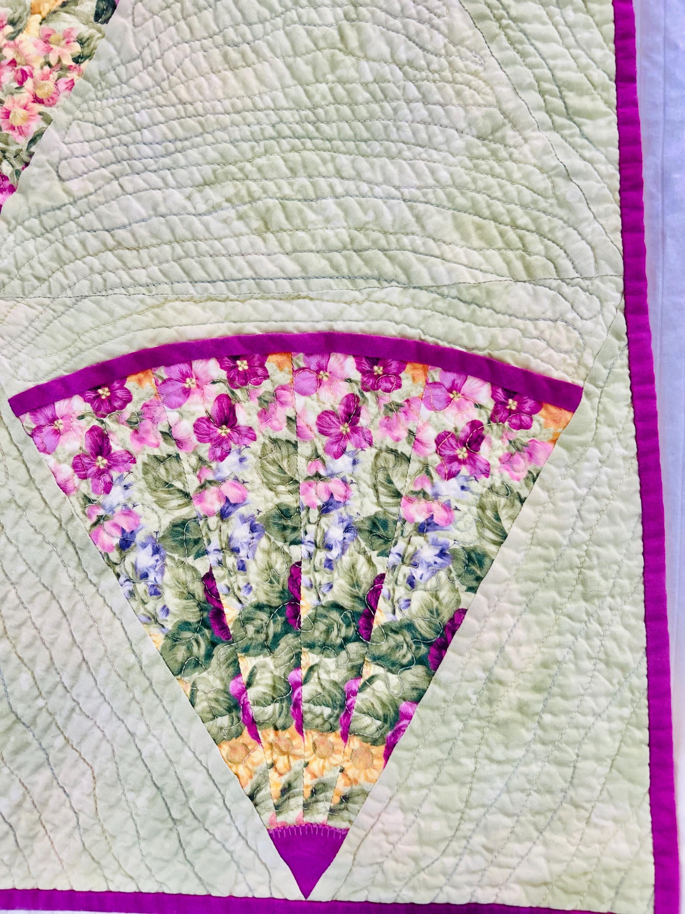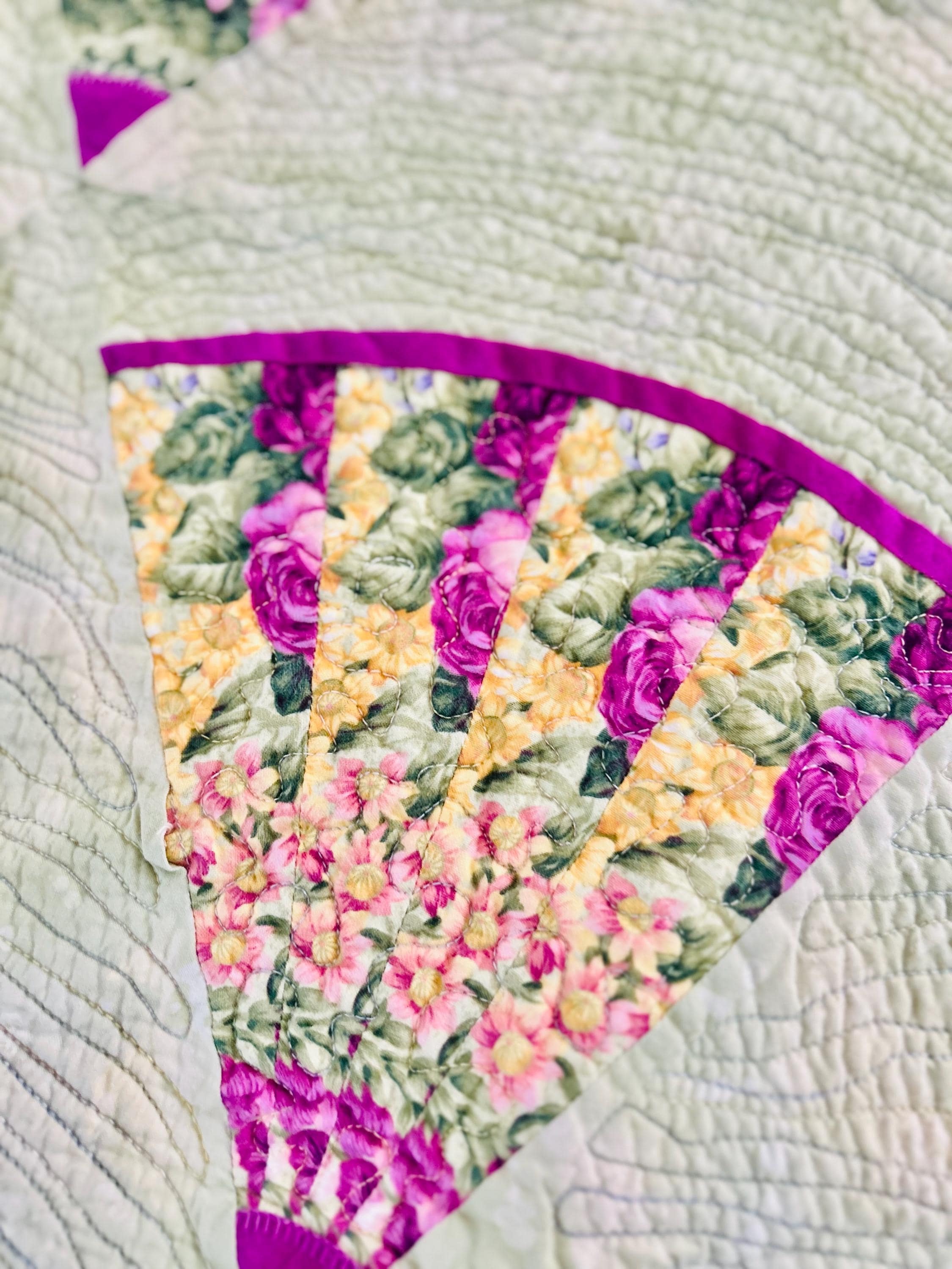 Such a pretty Fan Quilt, circa 1990s, in violet and green high-quality cottons with very dense long-arm quilting. The back is a gorgeous lilac and green floral while the binding is violet/purple cotton that has been machine stitched to the front and hand-stitched to the back. The batting is lightweight.