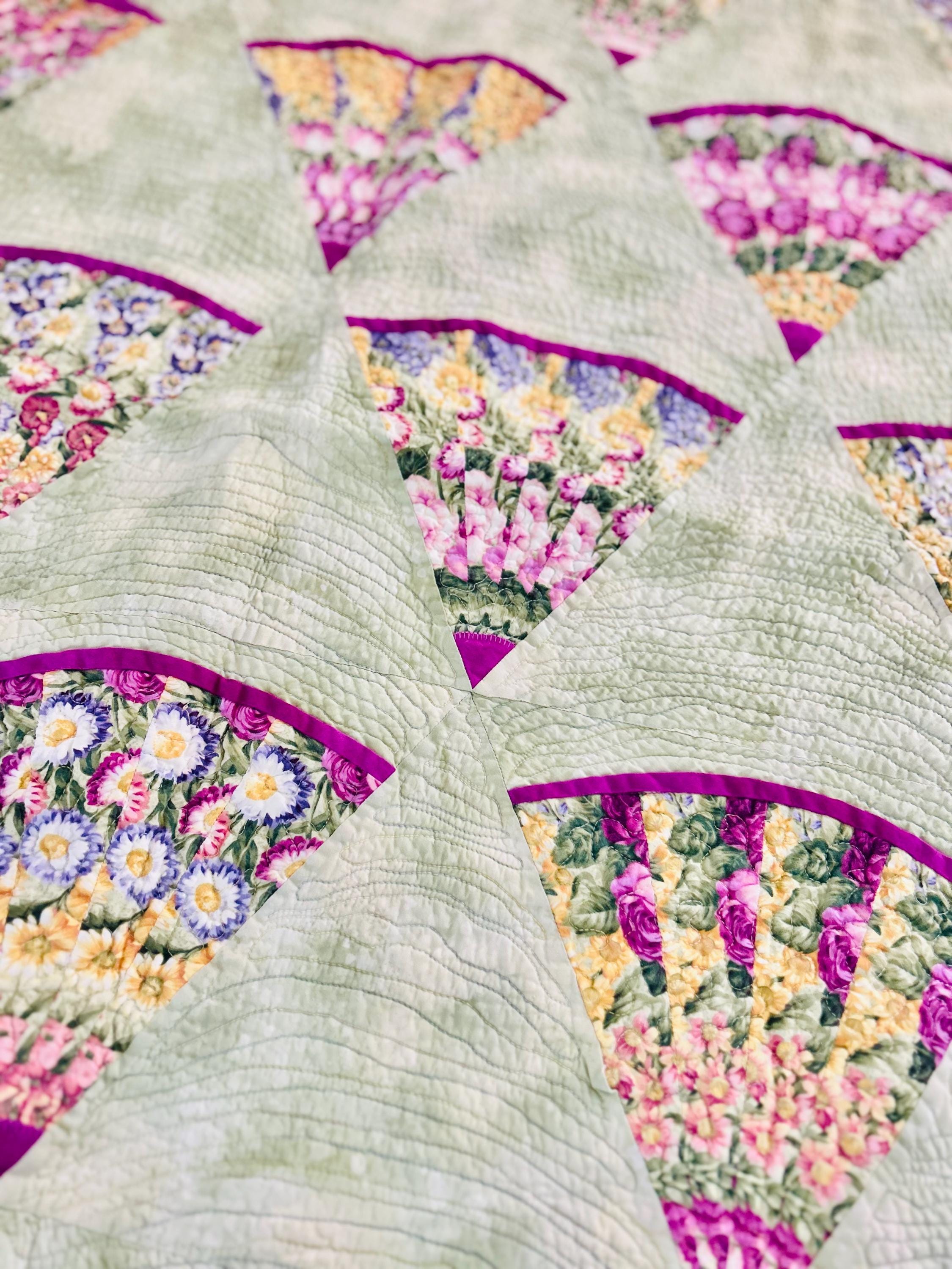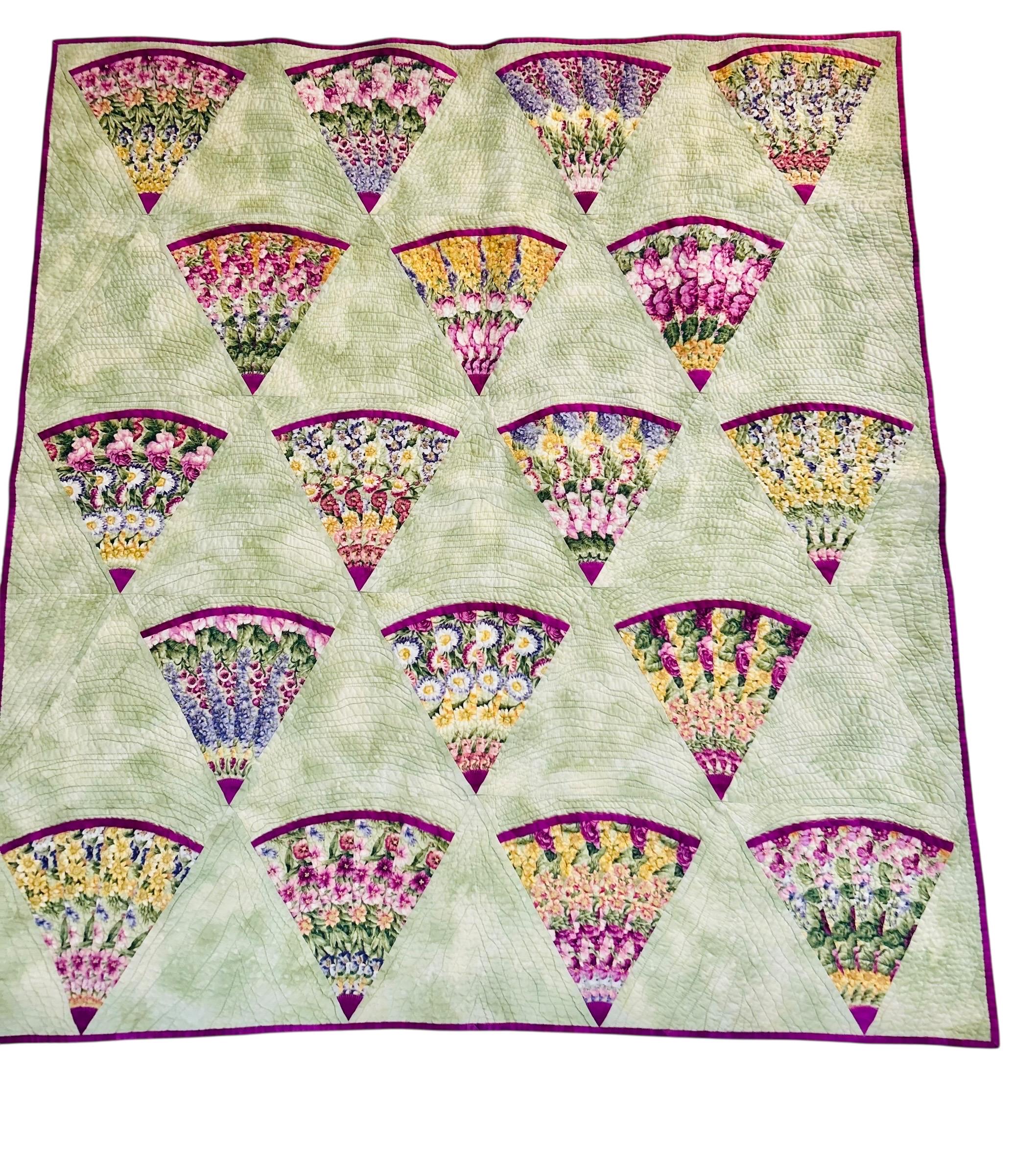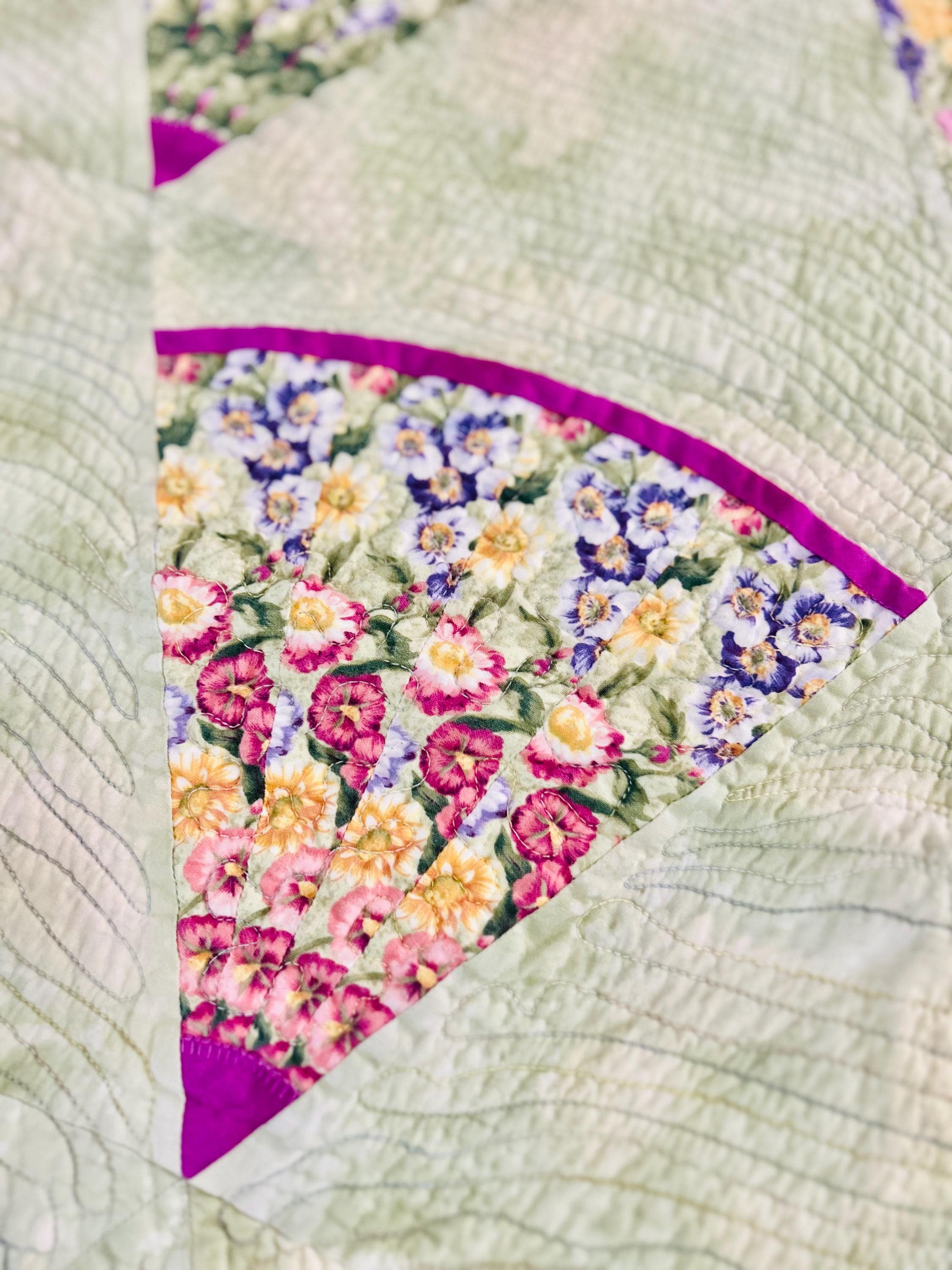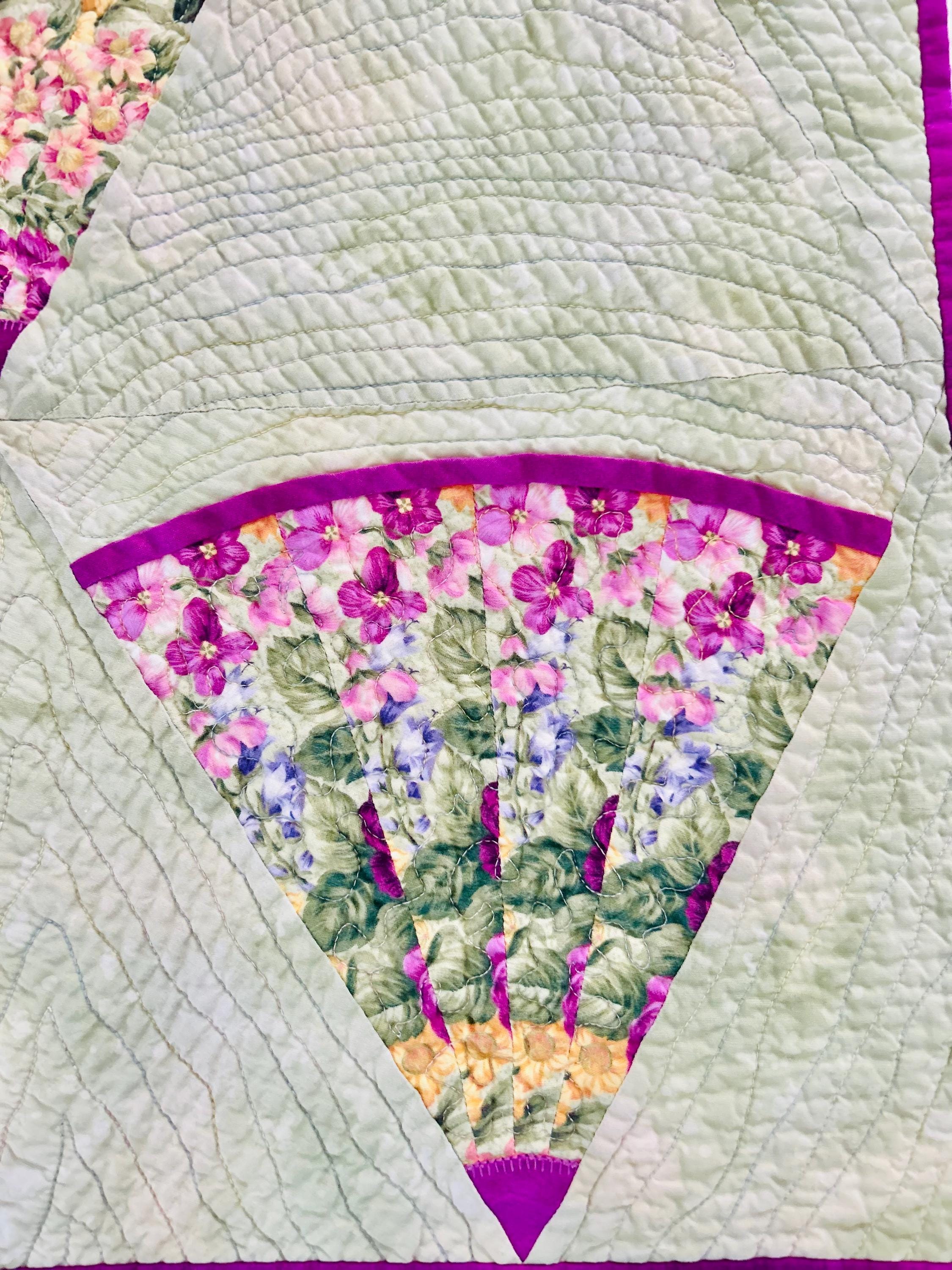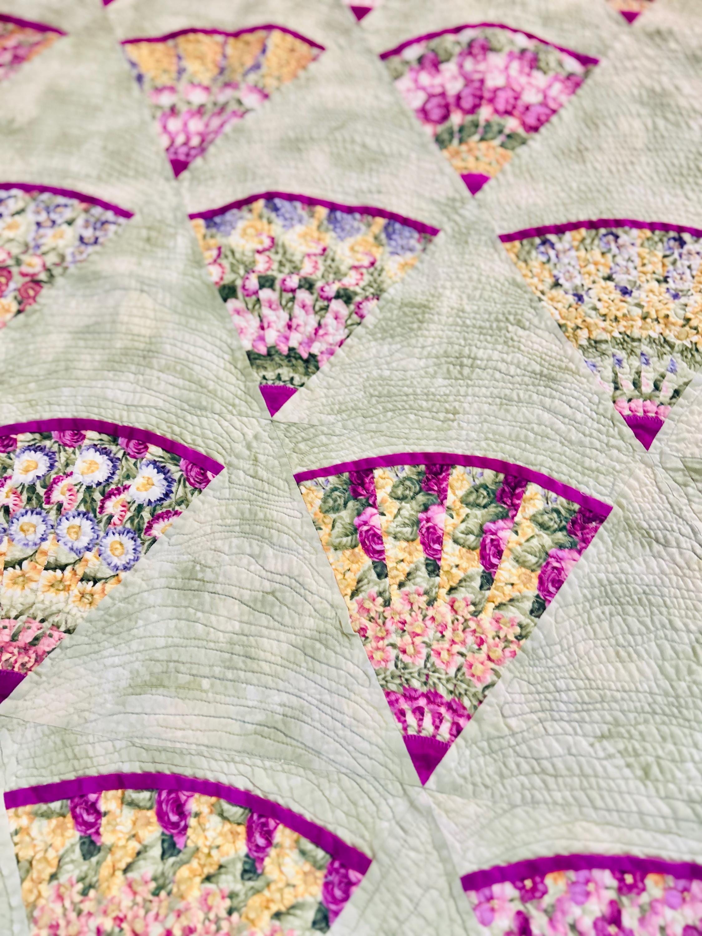Such a pretty Fan Quilt, circa 1990s, in violet and green high-quality cottons with very dense long-arm quilting. The back is a gorgeous lilac and green floral while the binding is violet/purple cotton that has been machine stitched to the front and hand-stitched to the back. The batting is lightweight.
