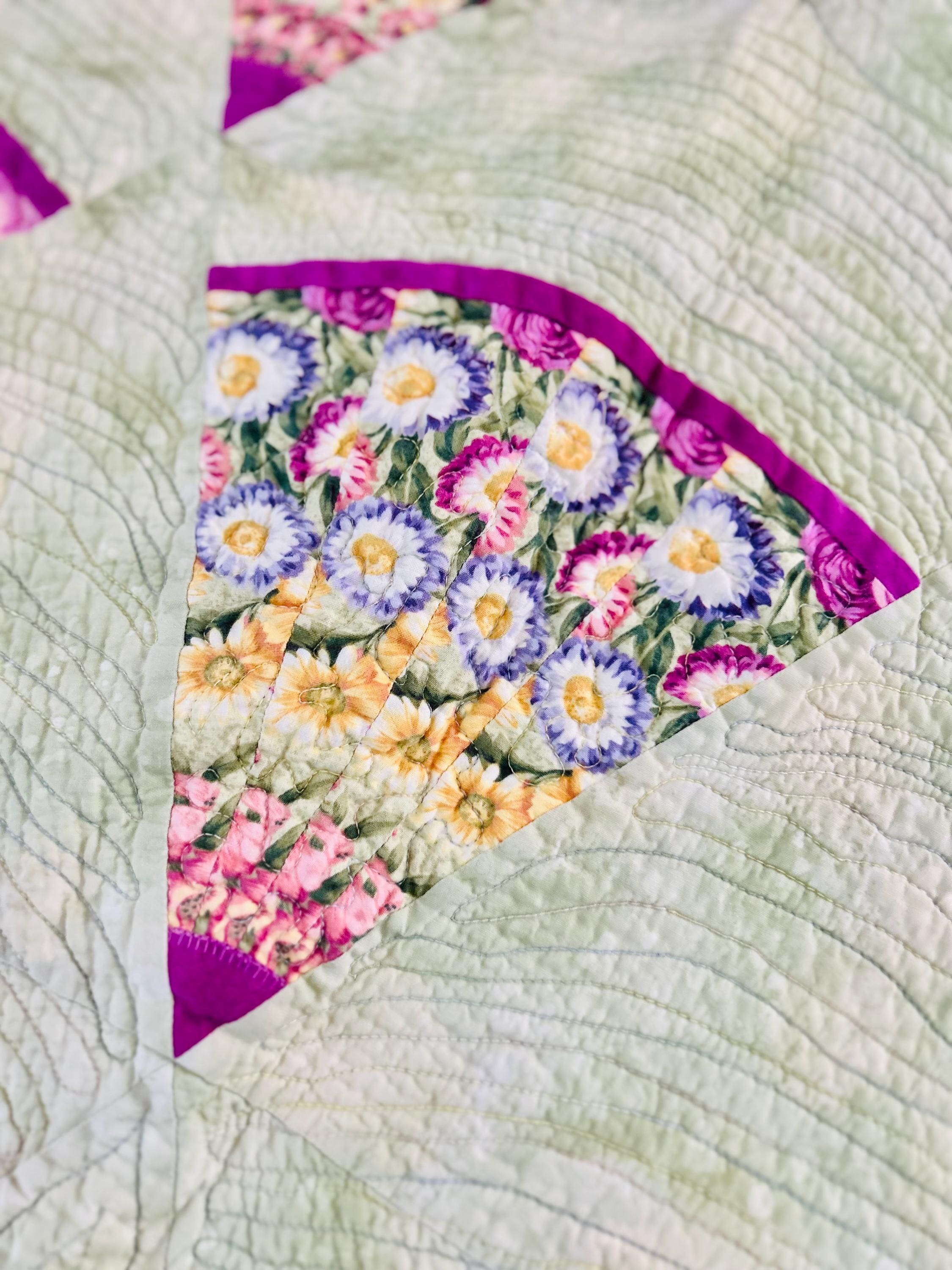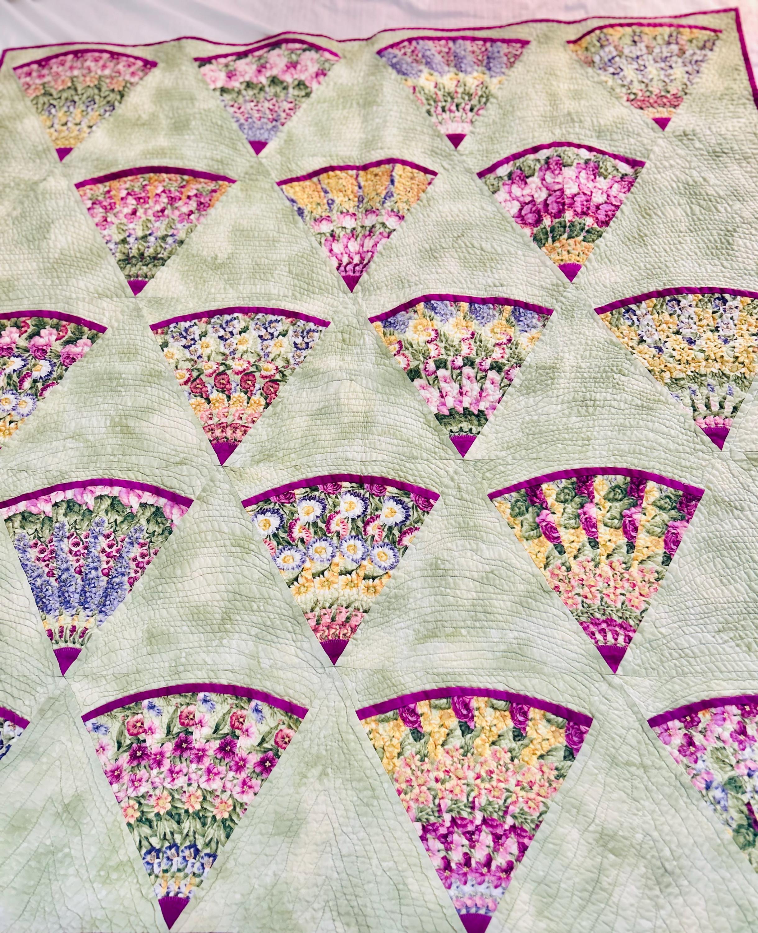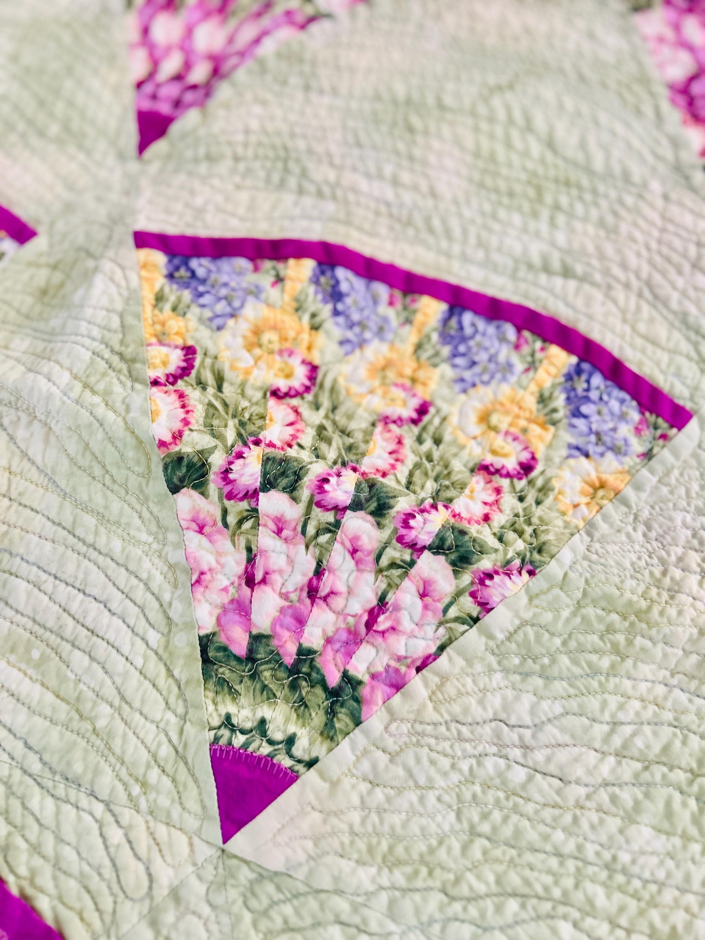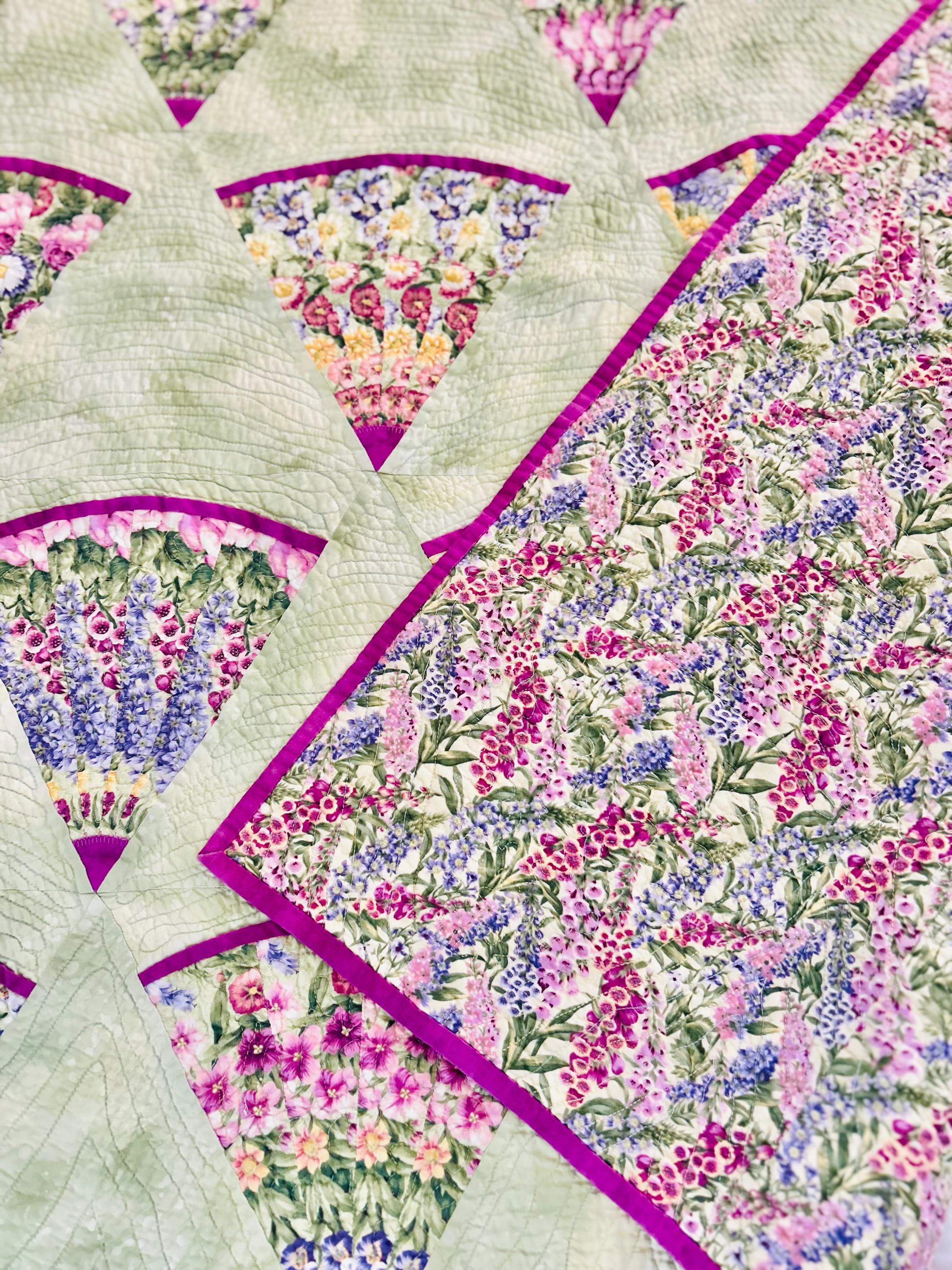 Such a pretty Fan Quilt, circa 1990s, in violet and green high-quality cottons with very dense long-arm quilting. The back is a gorgeous lilac and green floral while the binding is violet/purple cotton that has been machine stitched to the front and hand-stitched to the back. The batting is lightweight.