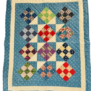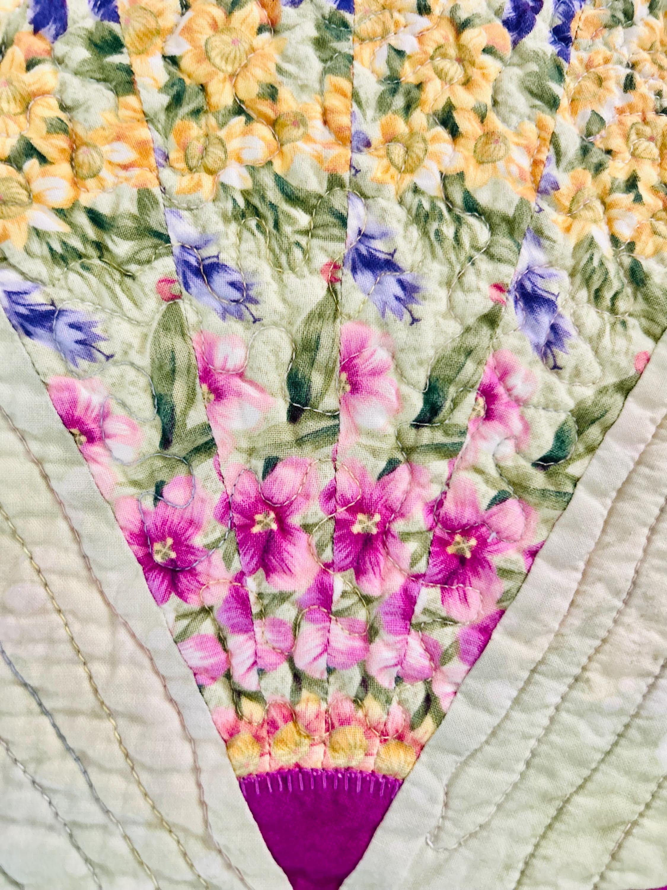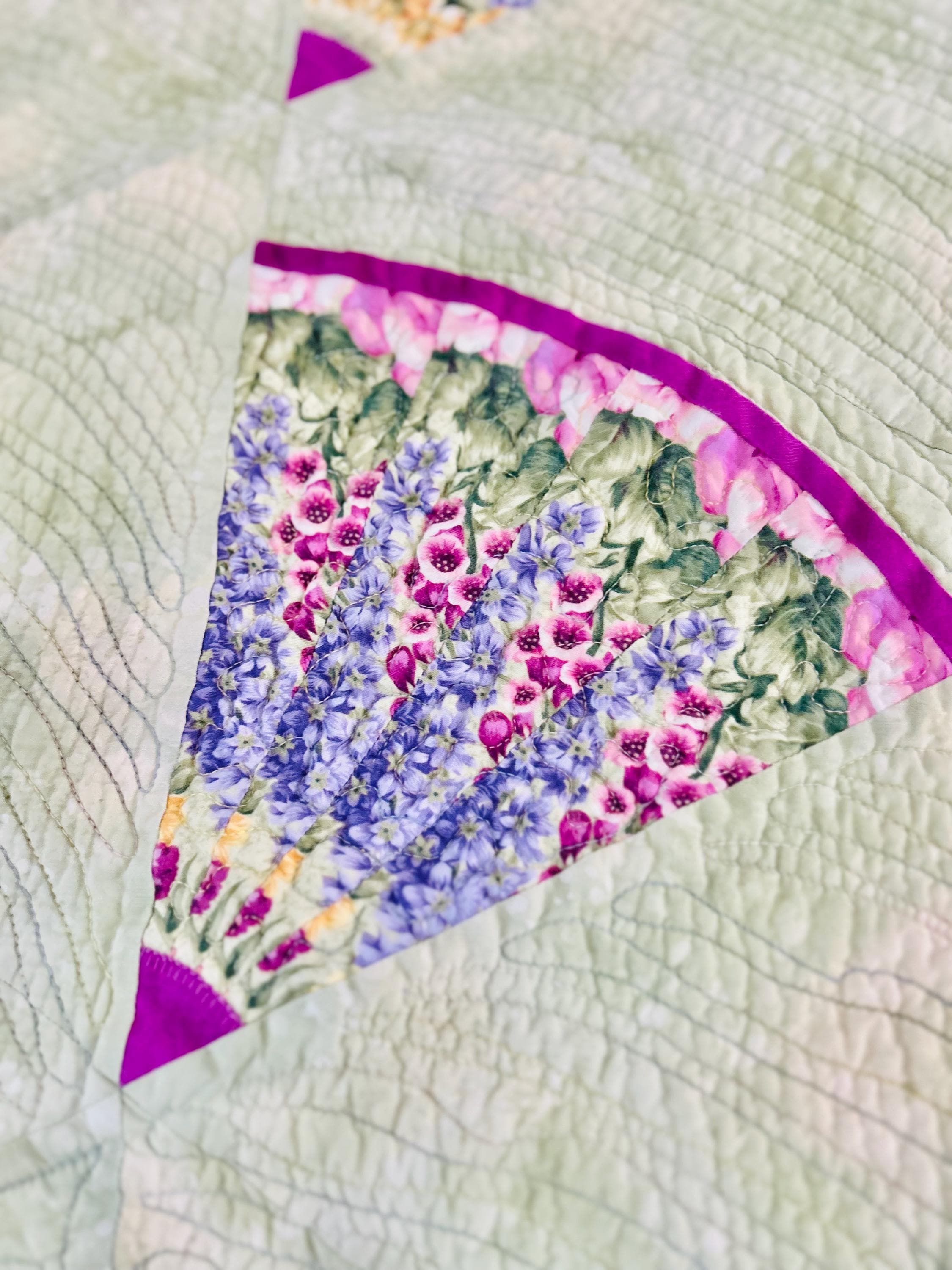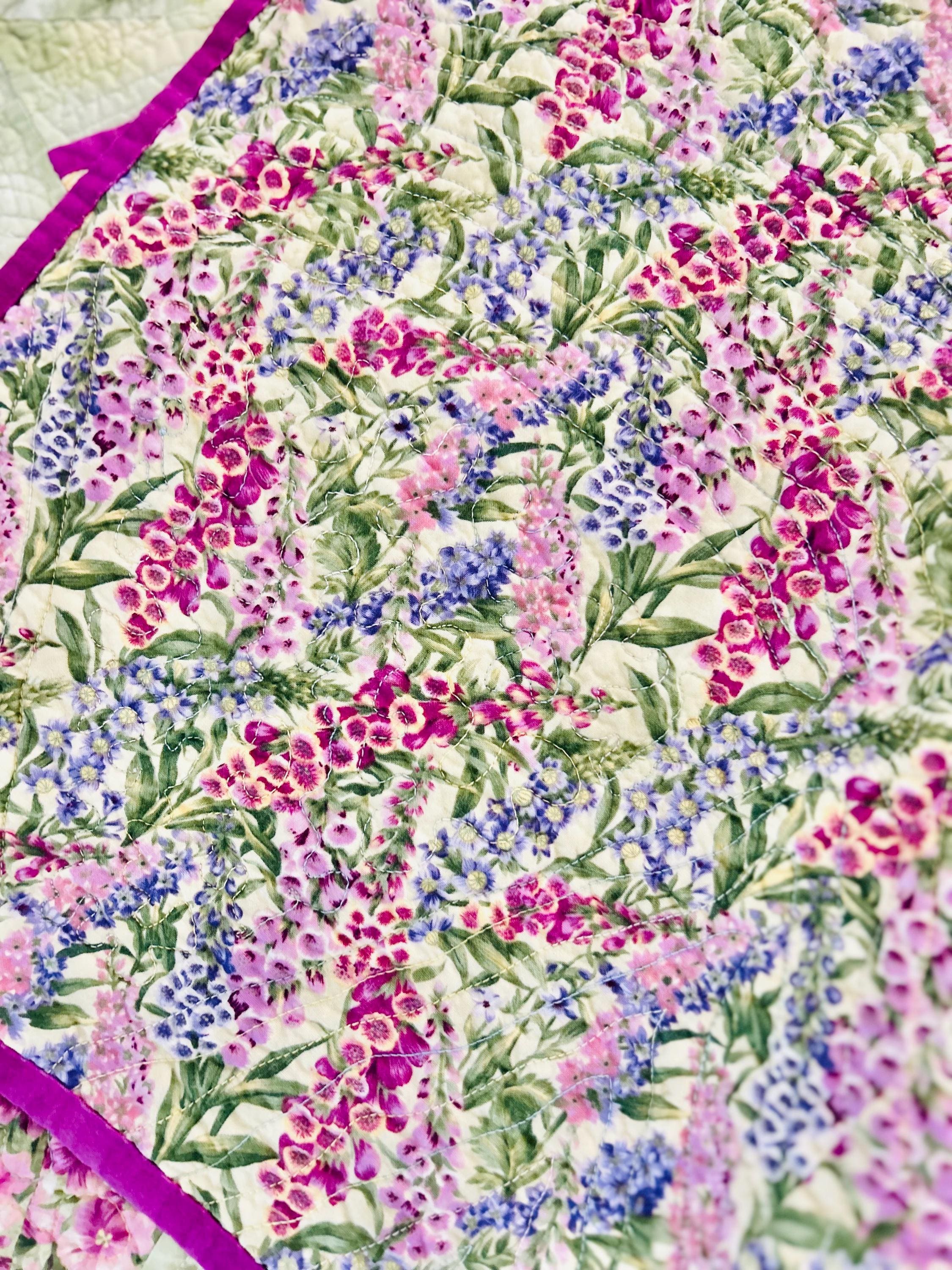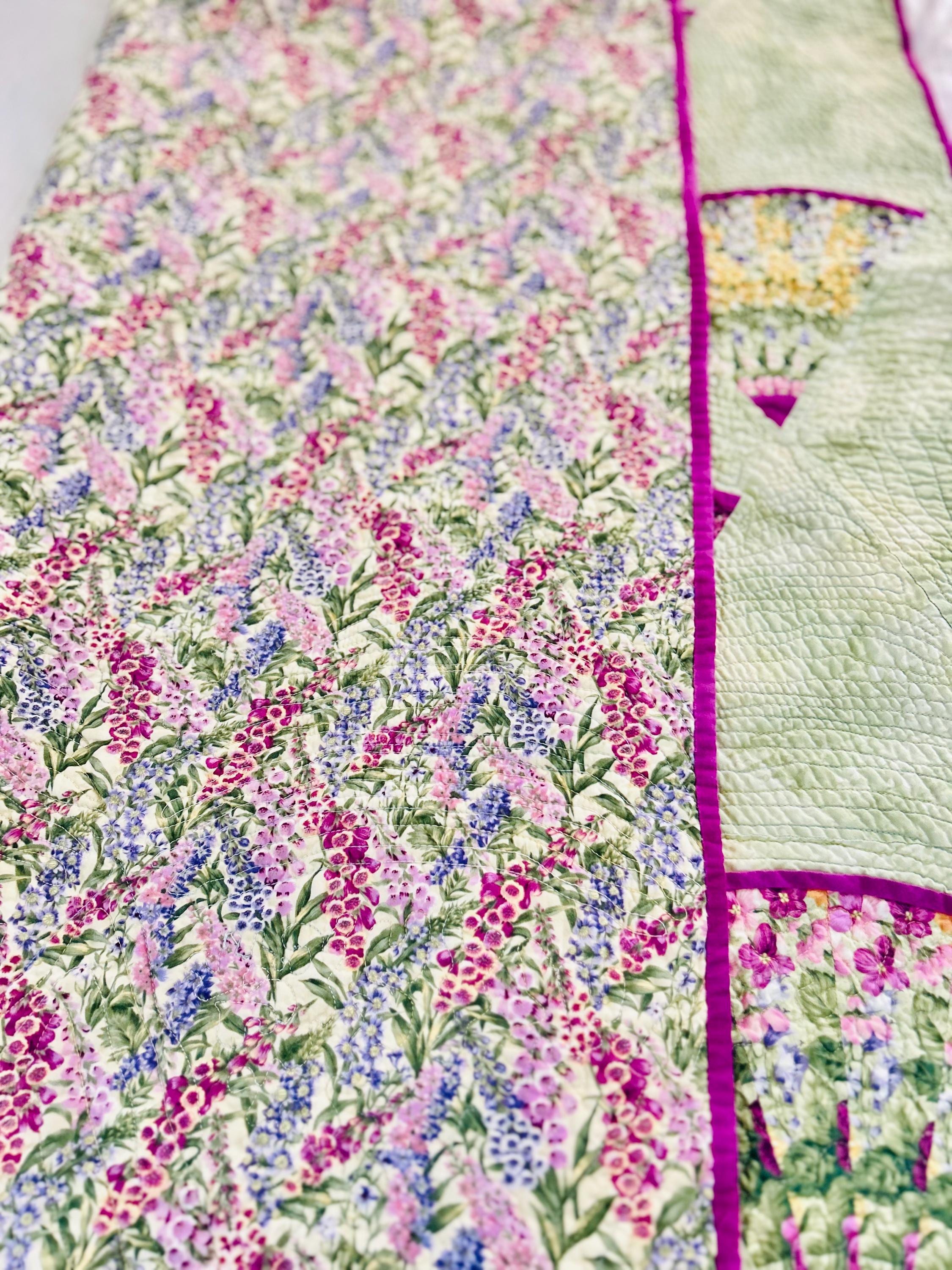 Such a pretty Fan Quilt, circa 1990s, in violet and green high-quality cottons with very dense long-arm quilting. The back is a gorgeous lilac and green floral while the binding is violet/purple cotton that has been machine stitched to the front and hand-stitched to the back. The batting is lightweight.