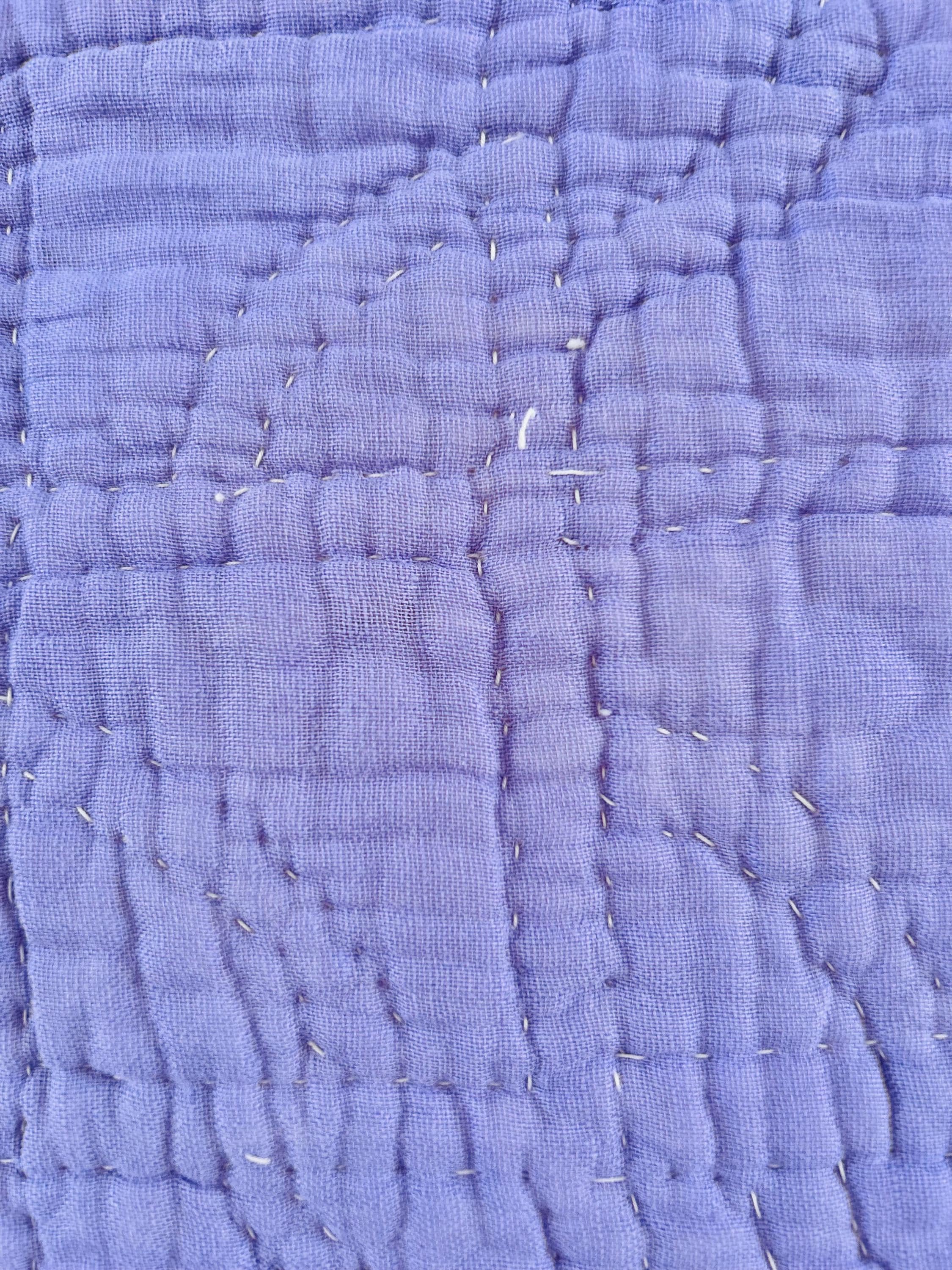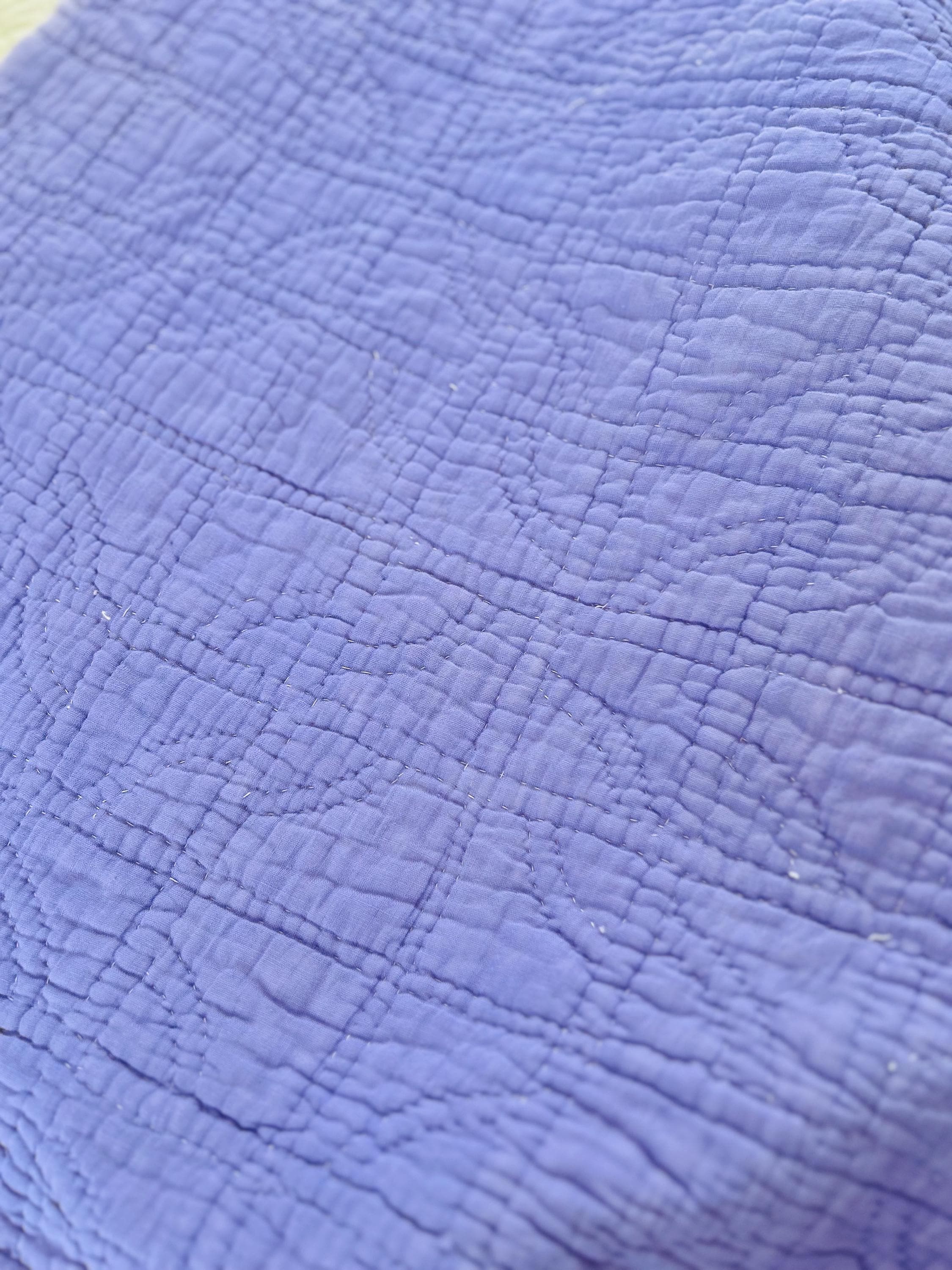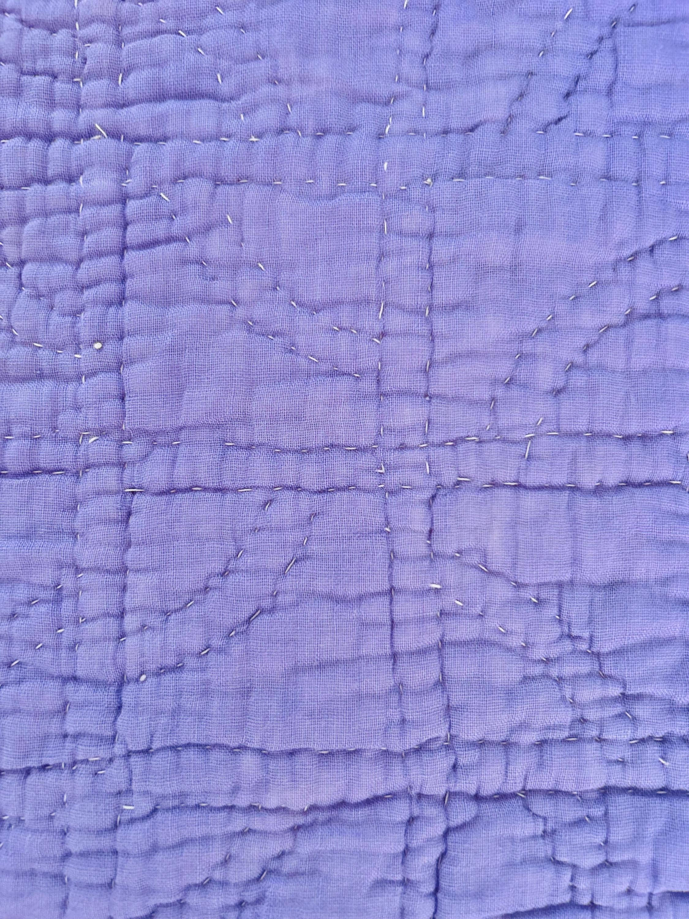 The back is a striking dark lavender cotton that has been turned to the front and hand-stitched to form the binding. The cotton batting is unsized and lightweight.