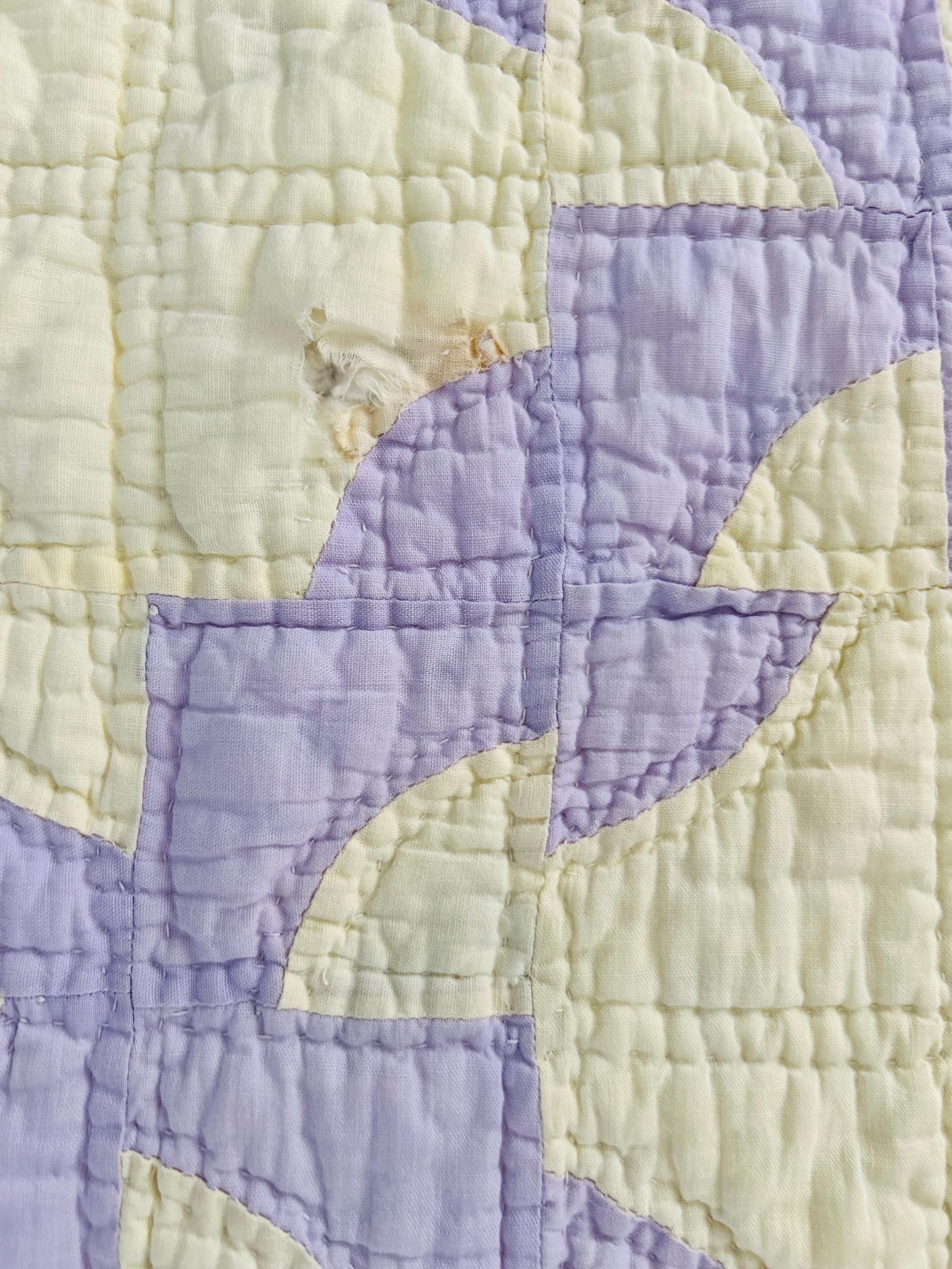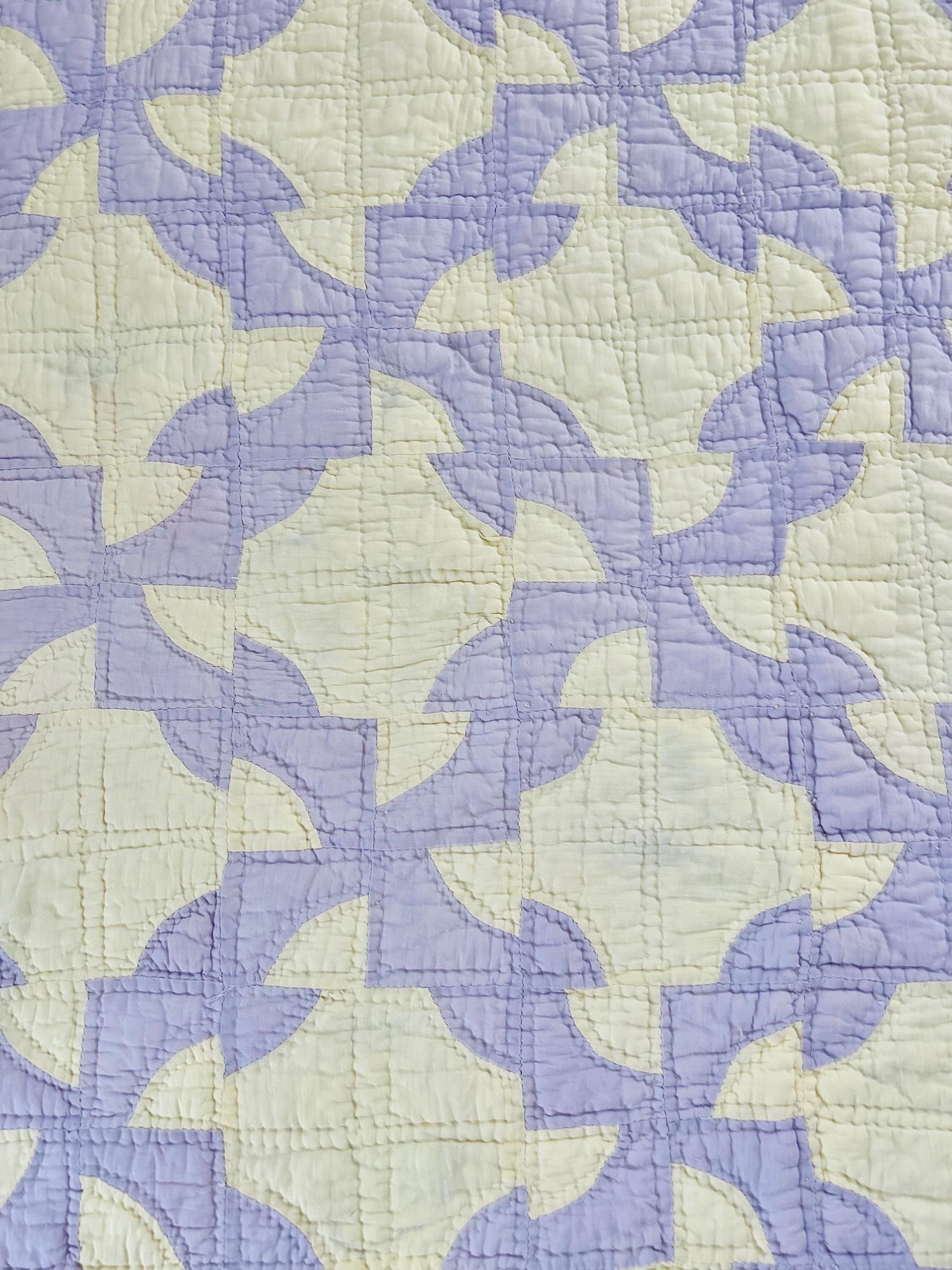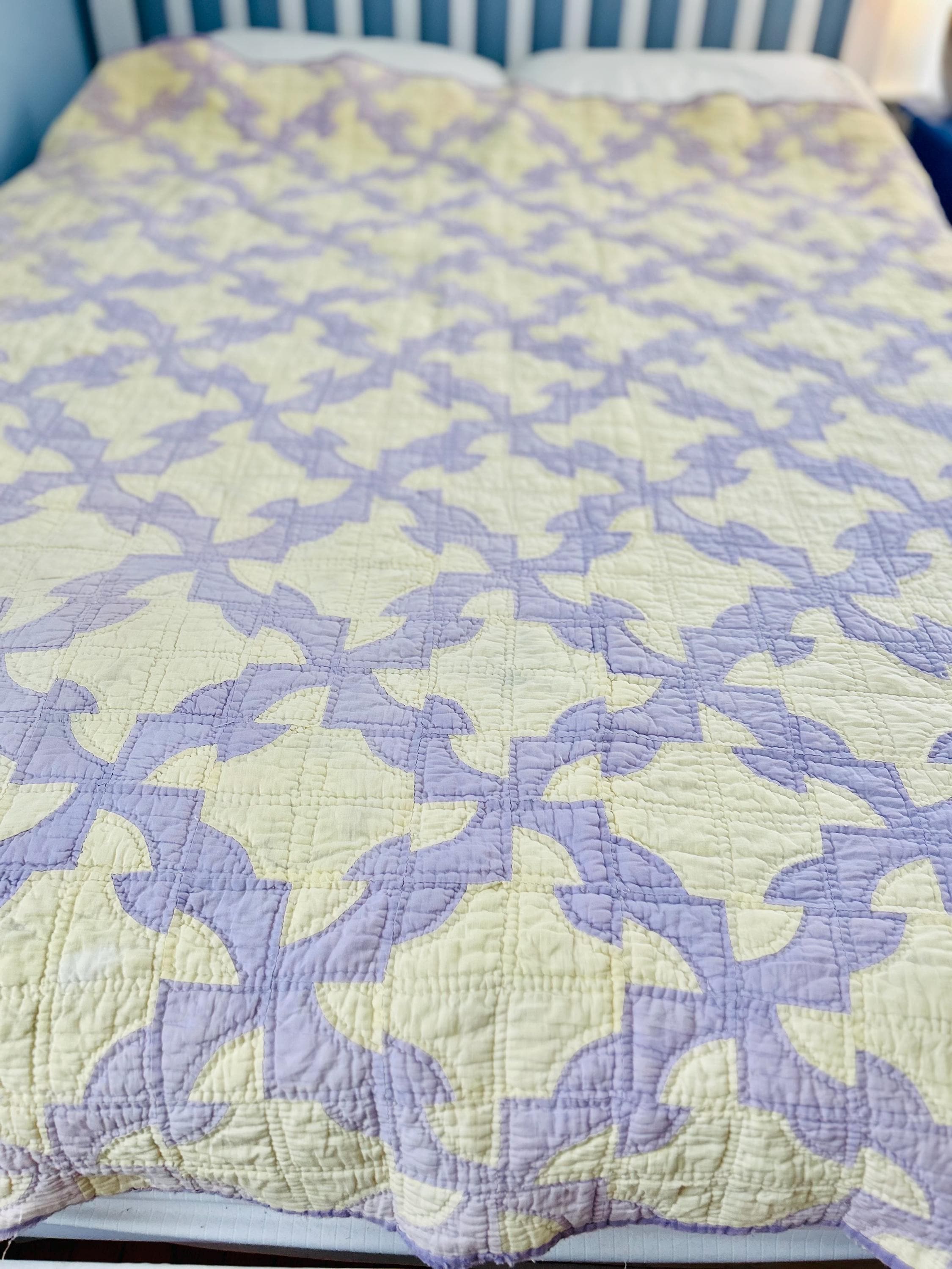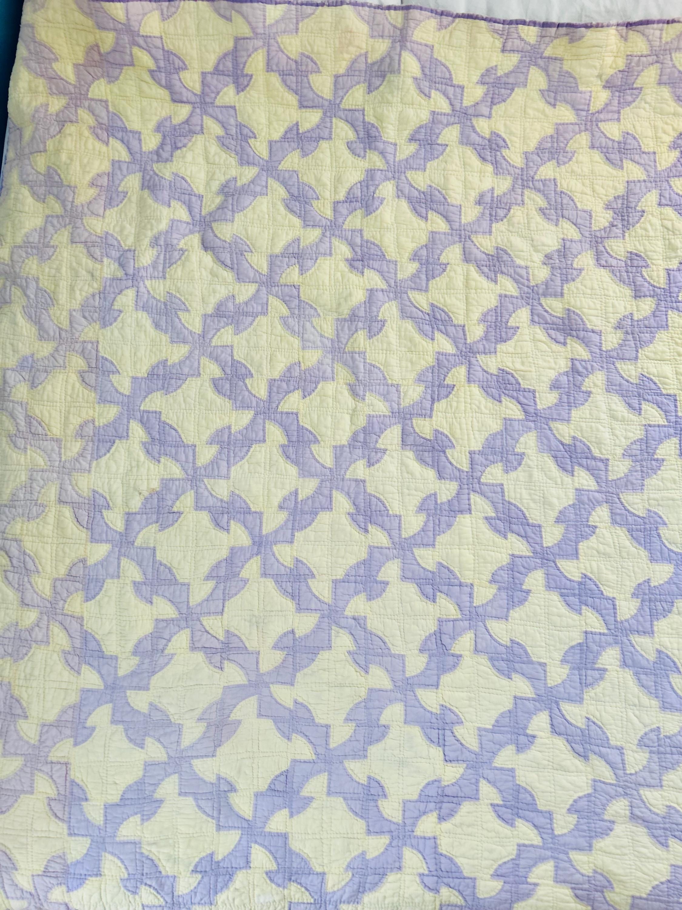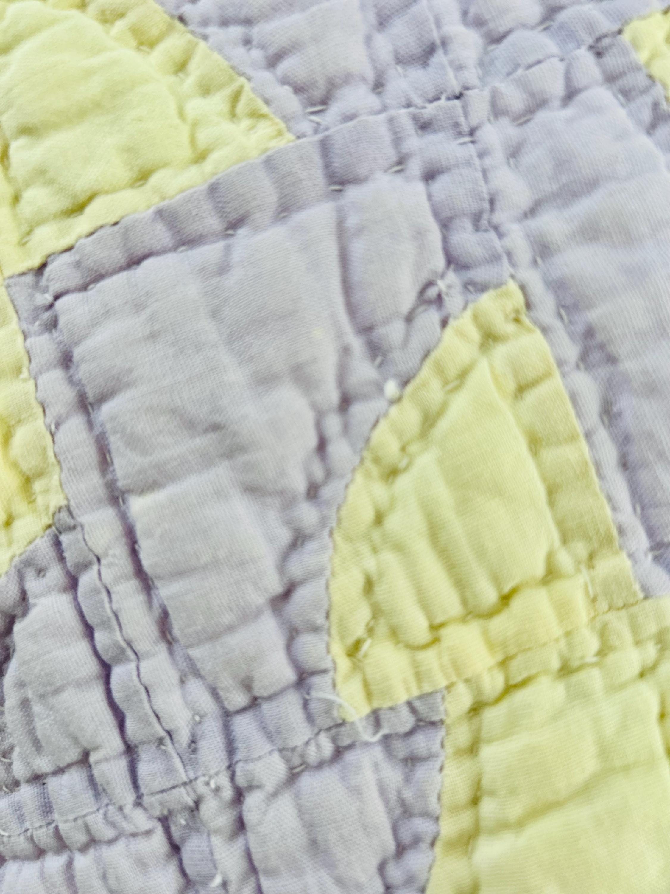 This is a circa 1930s Robbing Peter to Pay Paul Quilt, hand-stitched and hand-quilted and made in a lovely lavender and butter-yellow. The hand-quilting is tiny stitches in outlines of the complex patchwork and in cross-hatches in the larger yellow areas.