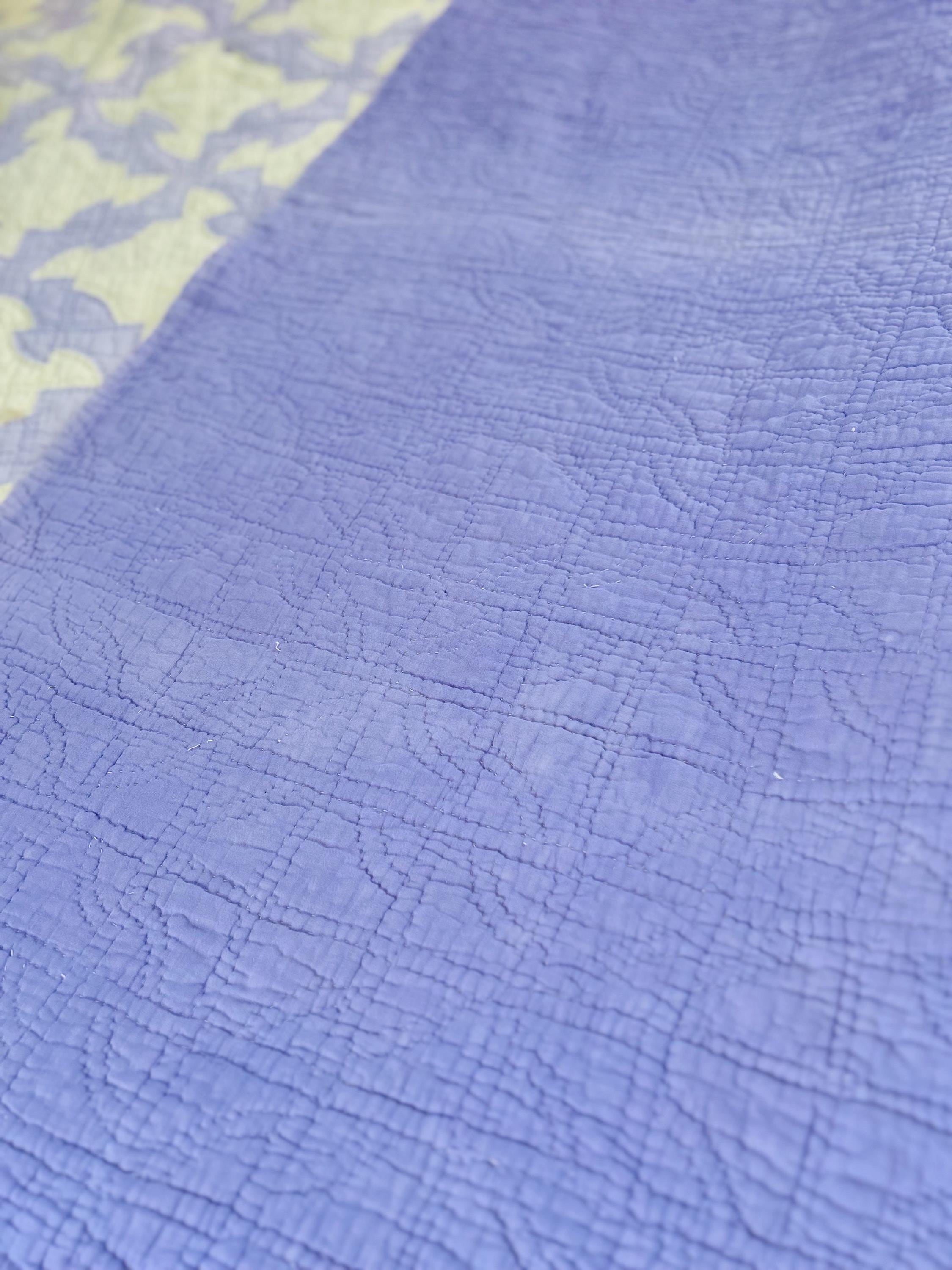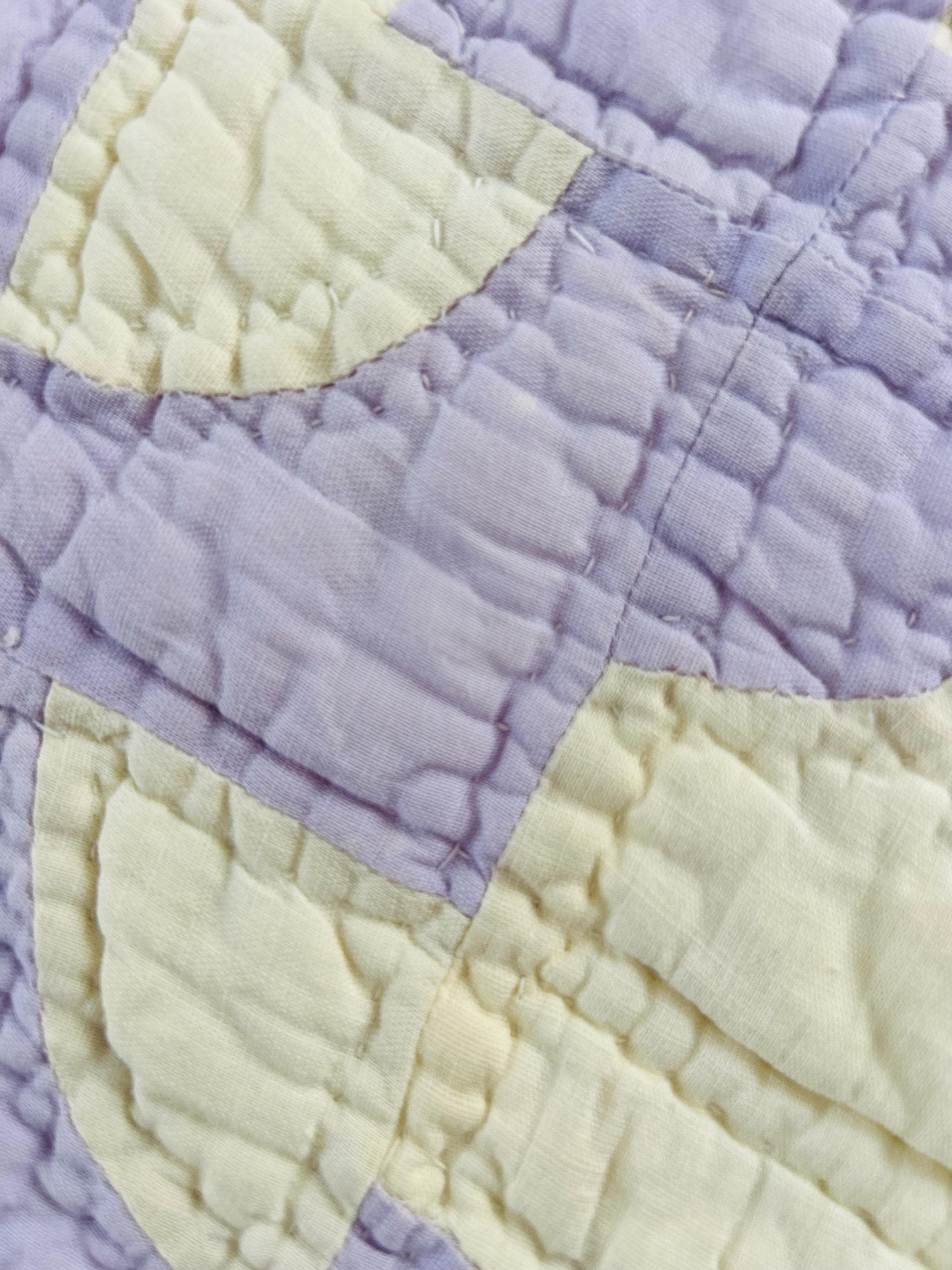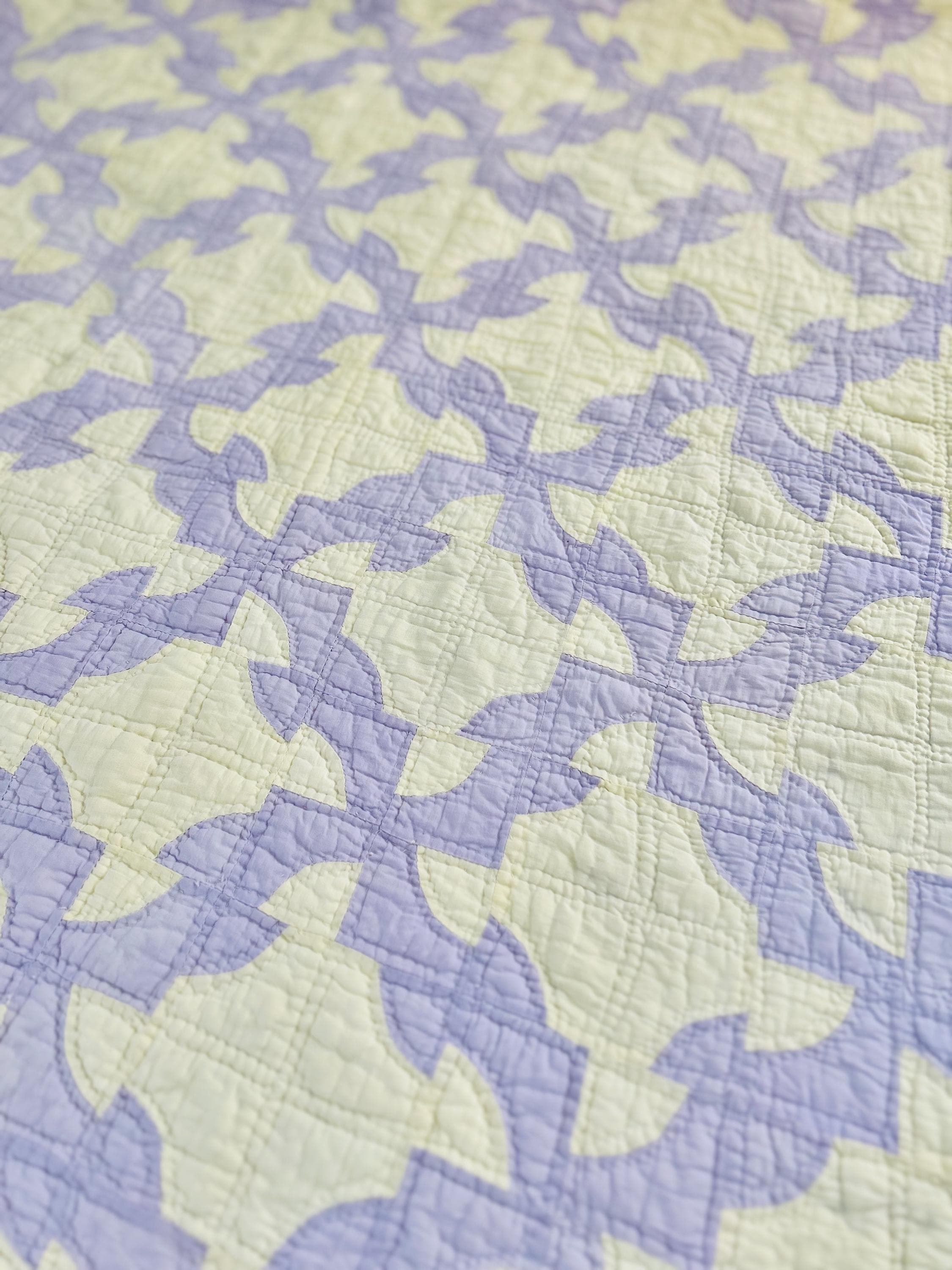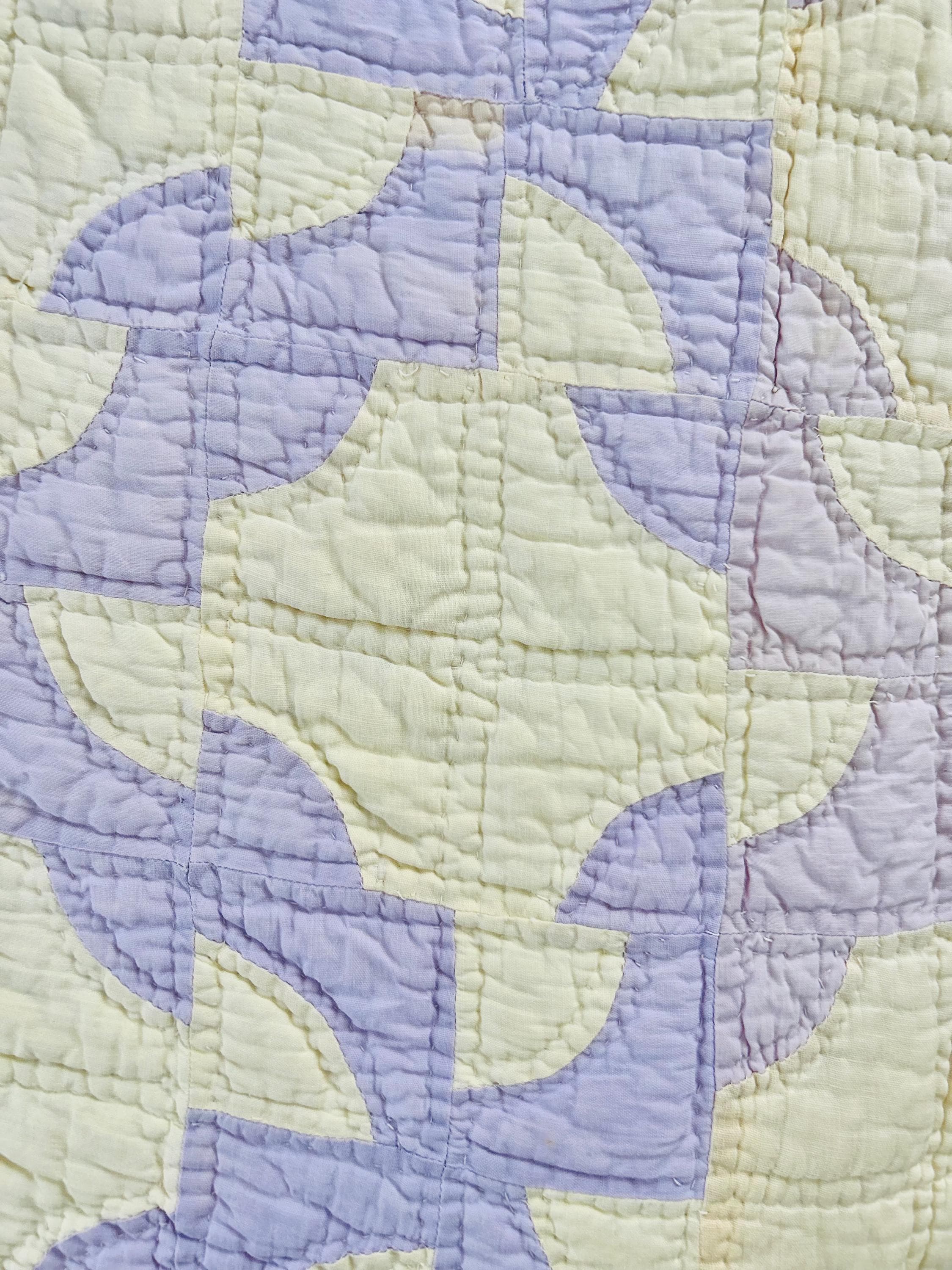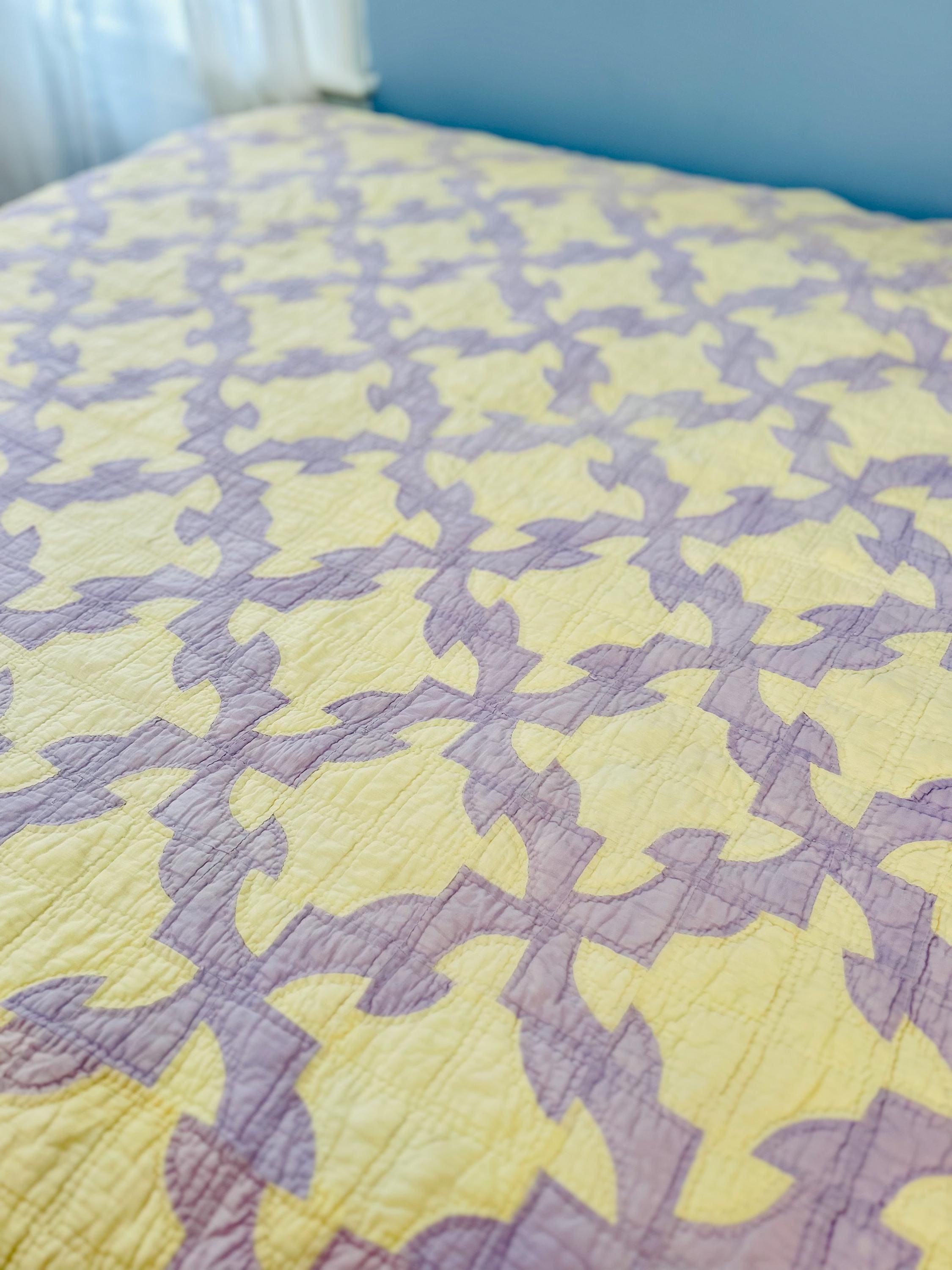 This is a circa 1930s Robbing Peter to Pay Paul Quilt, hand-stitched and hand-quilted and made in a lovely lavender and butter-yellow. The hand-quilting is tiny stitches in outlines of the complex patchwork and in cross-hatches in the larger yellow areas.