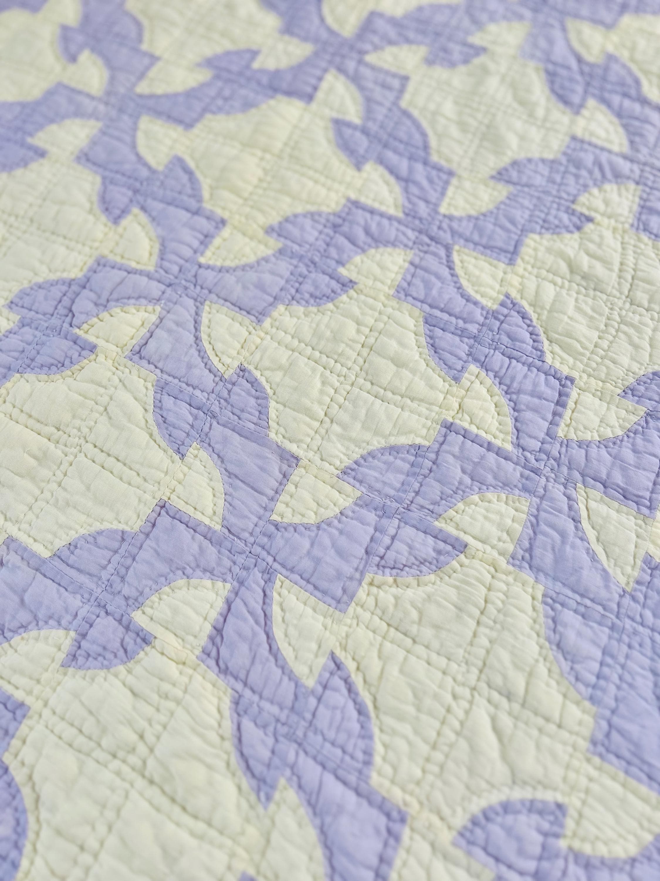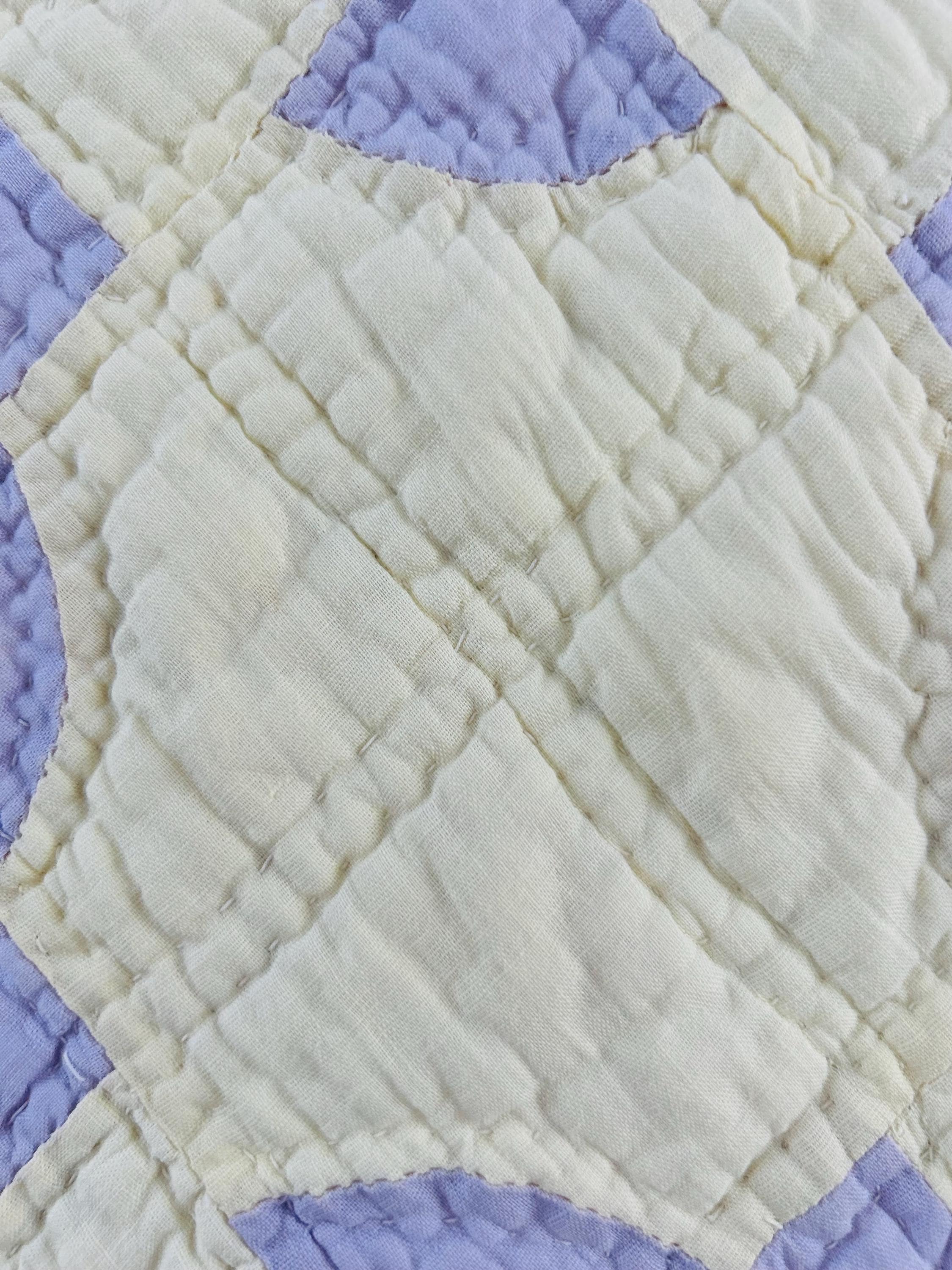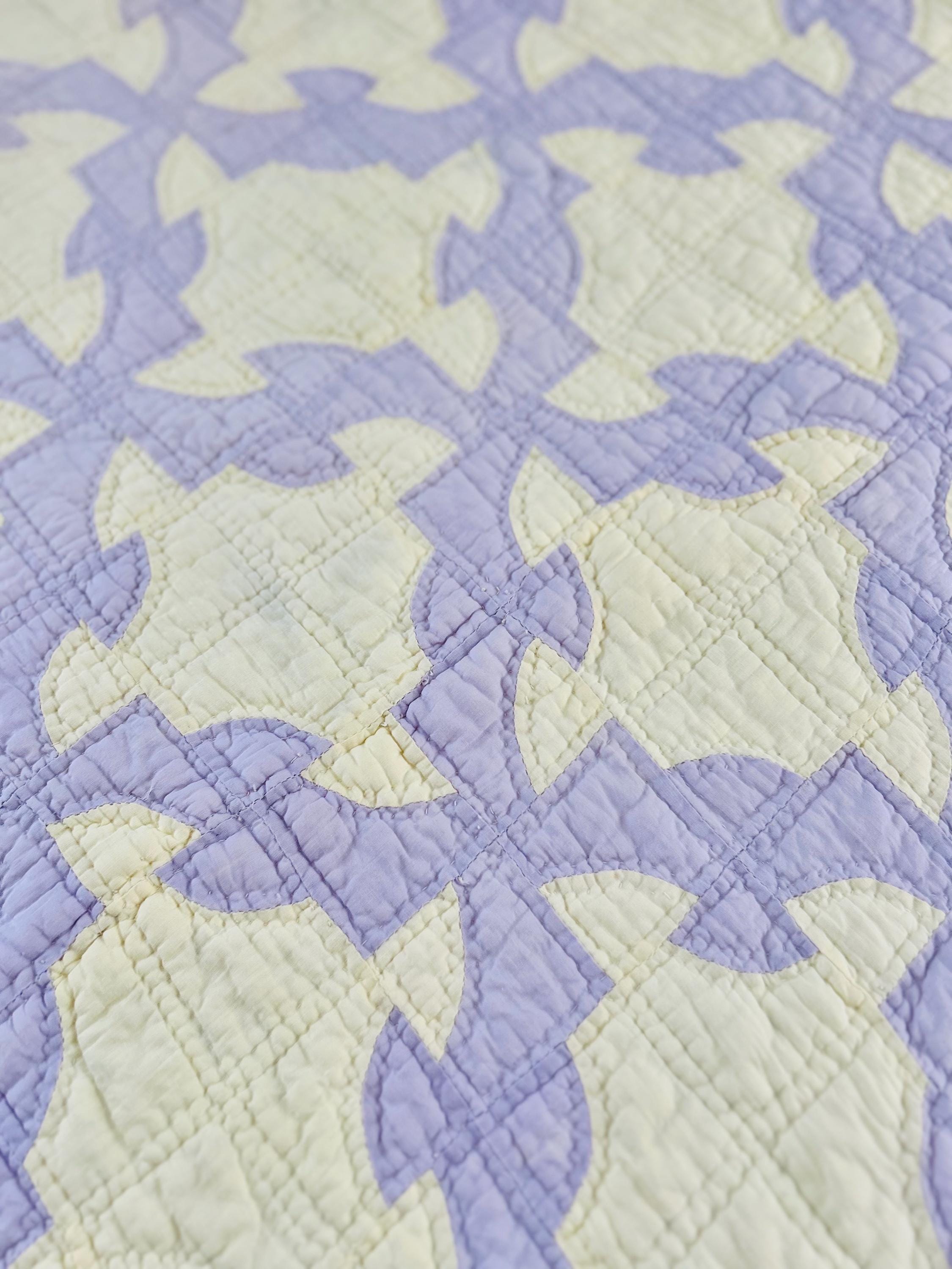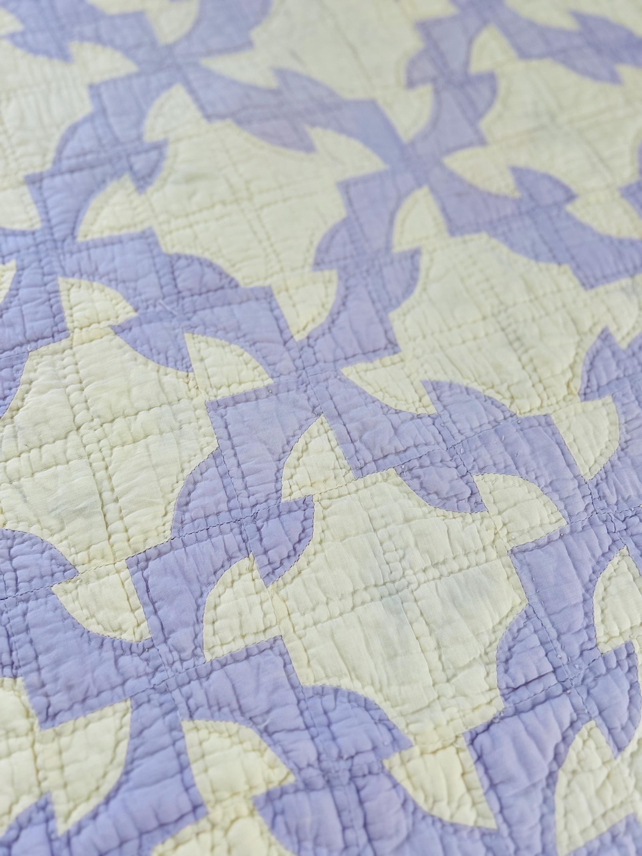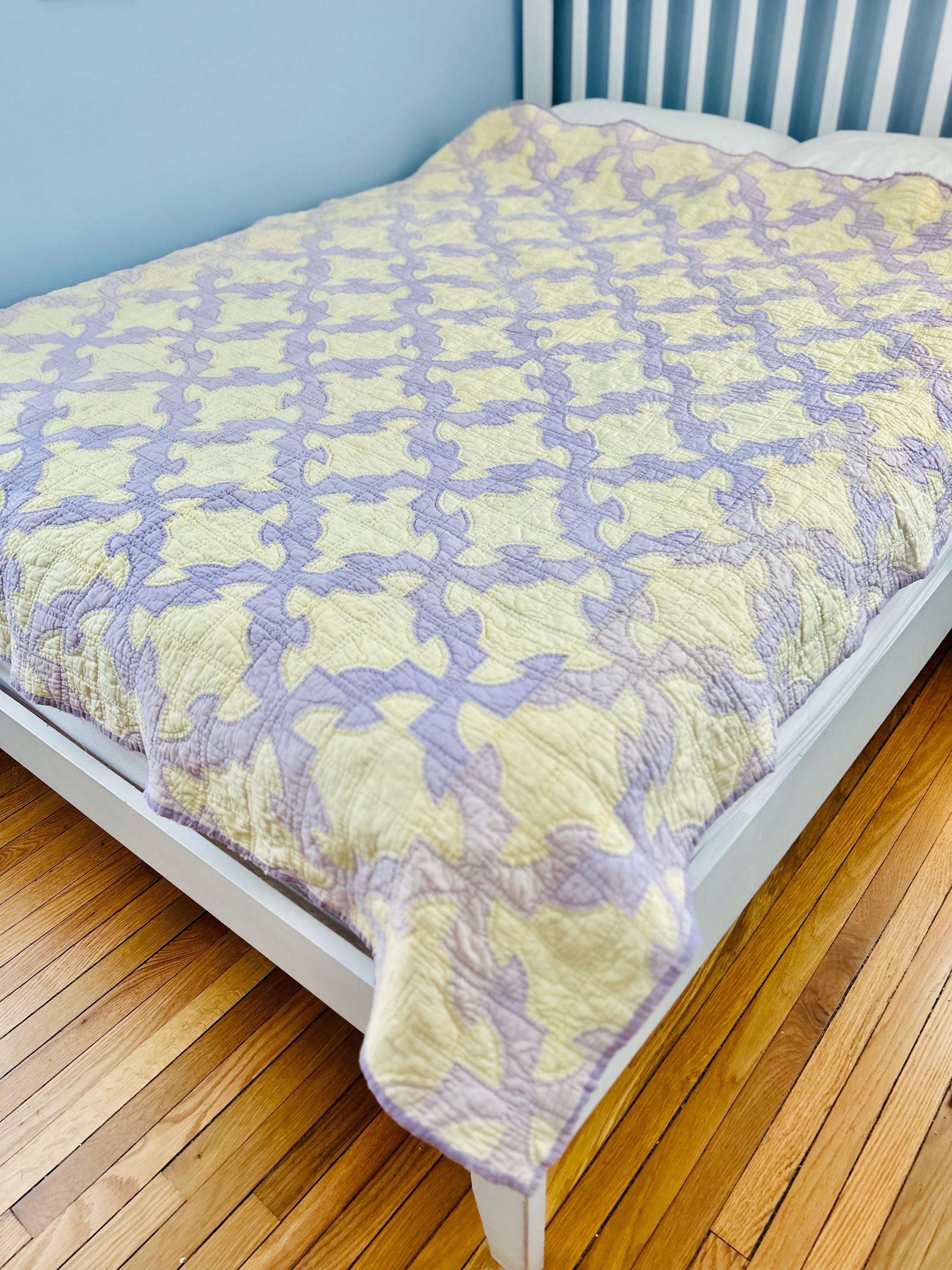 This is a circa 1930s Robbing Peter to Pay Paul Quilt, hand-stitched and hand-quilted and made in a lovely lavender and butter-yellow. The hand-quilting is tiny stitches in outlines of the complex patchwork and in cross-hatches in the larger yellow areas.