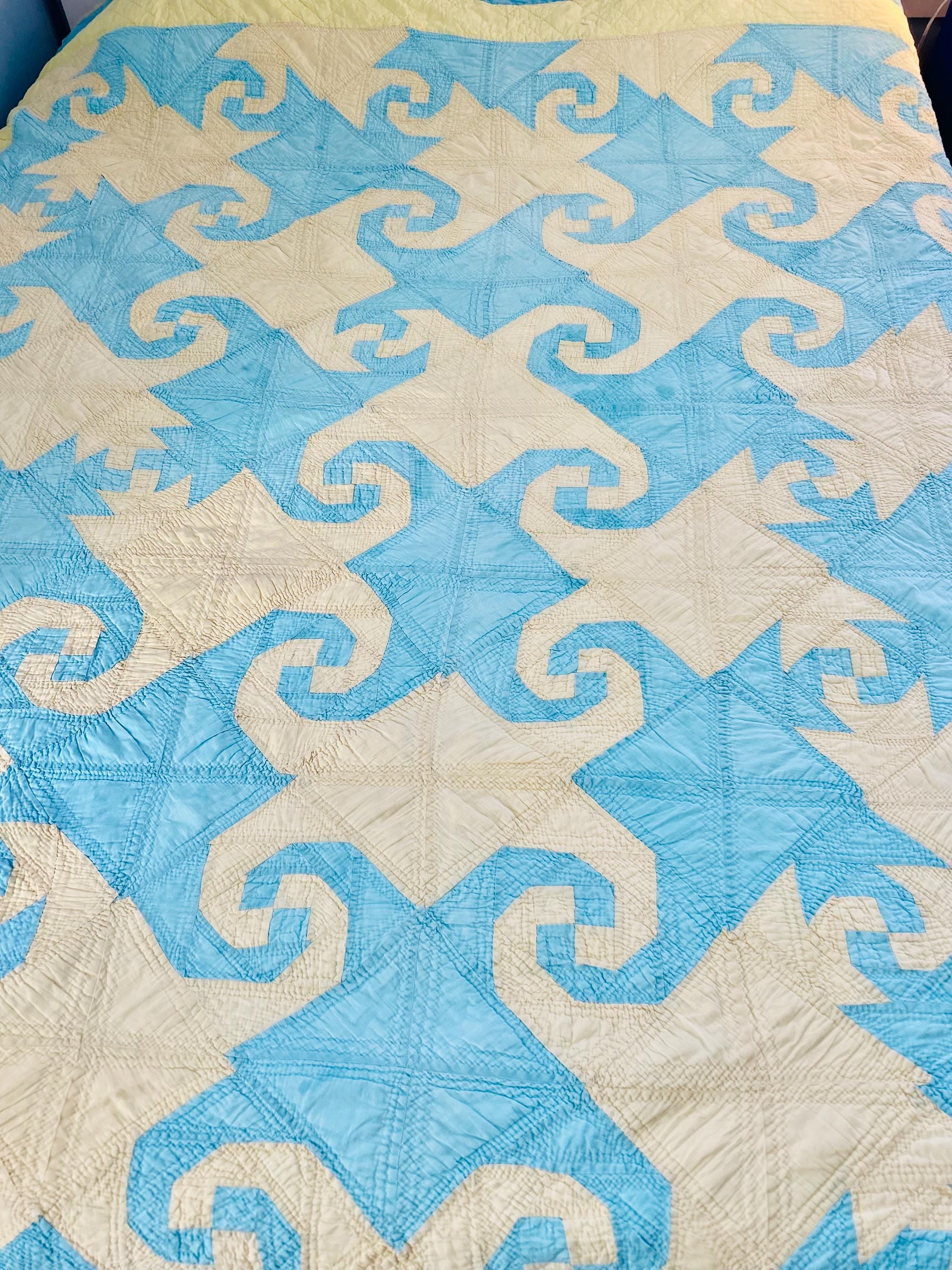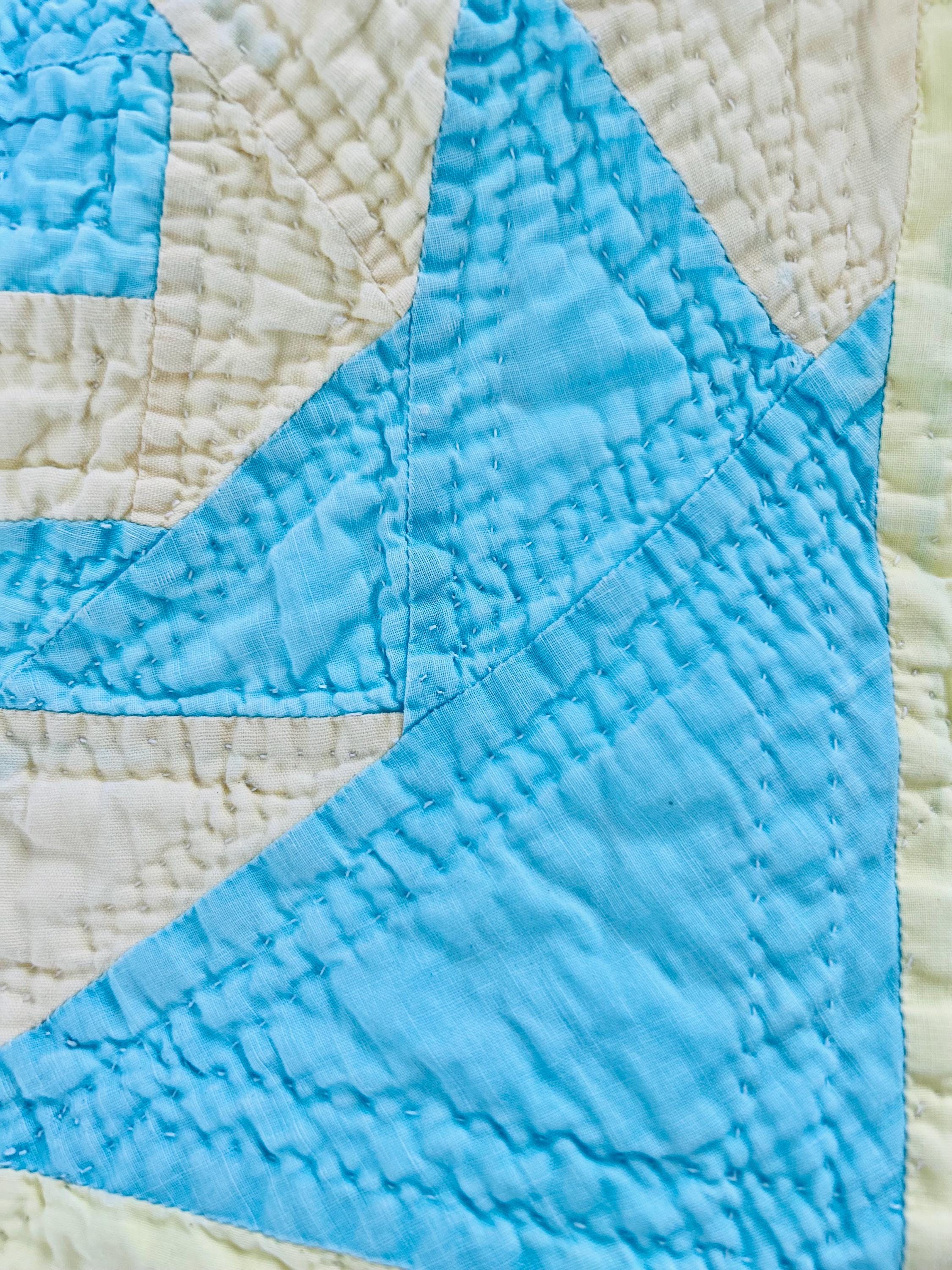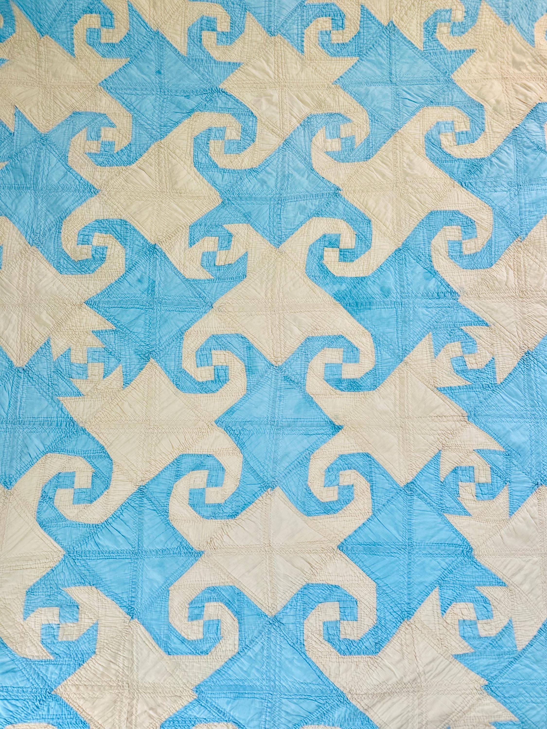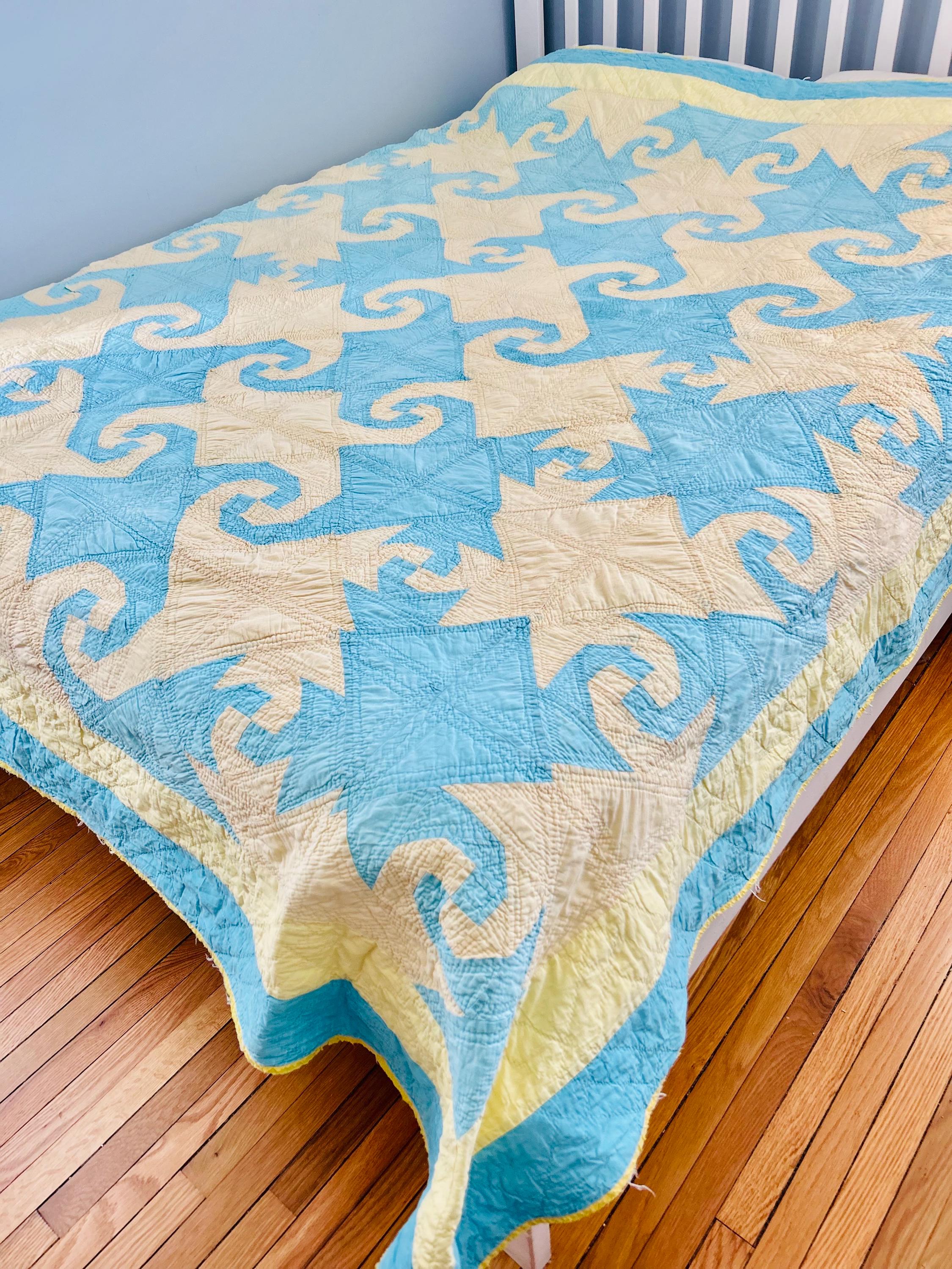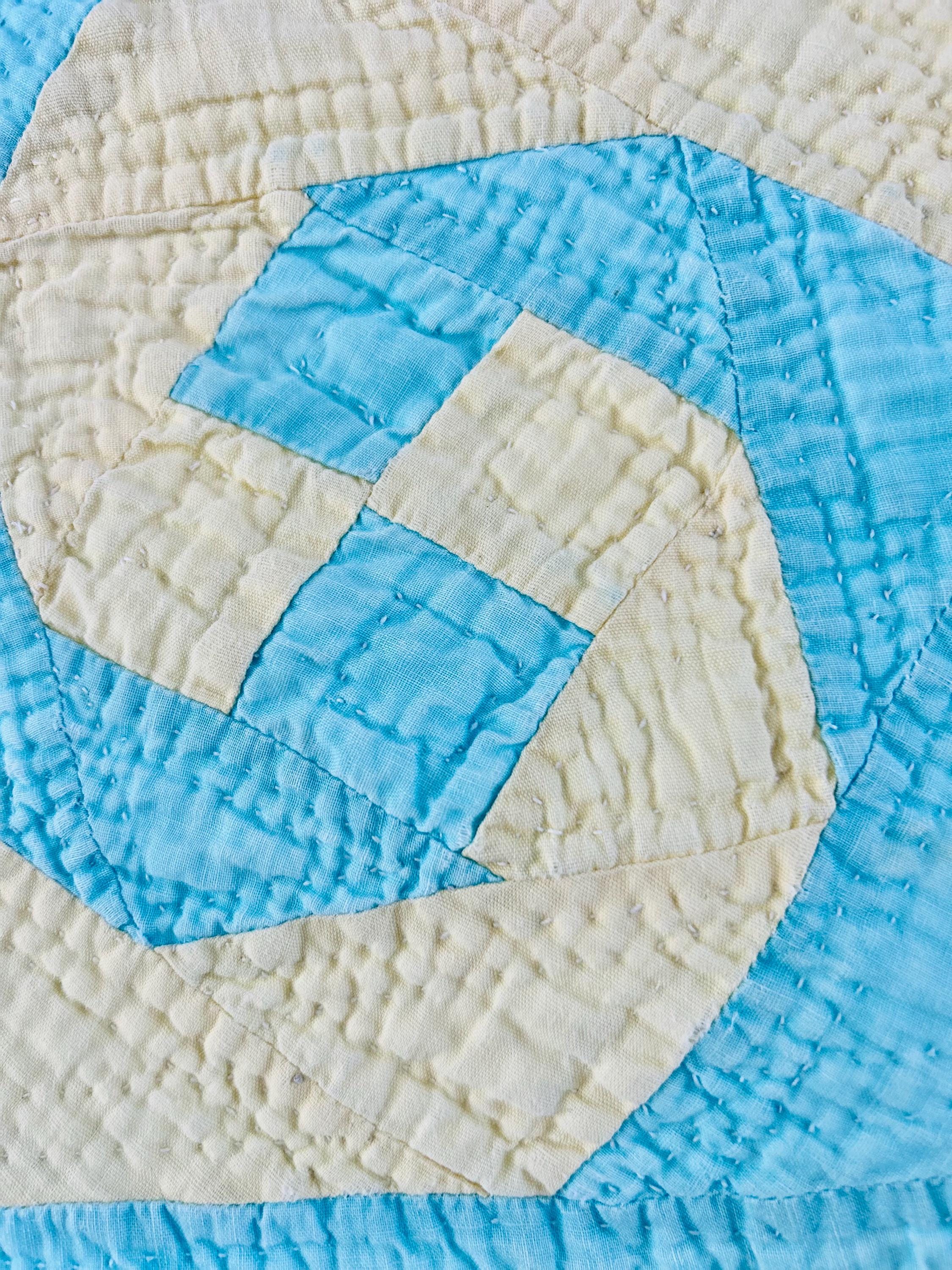 This striking and rare Indiana Puzzle or Snail Trail Quilt, circa 1900, has a whirlwind feel to it, with its sky-blue and buttercream fabrics shaped like waves cresting and breaking. It has been so densely hand-quilted that in some locations it is stippled. The quilting is in double and triple diagonals and repeating outlines of the patchwork. The four-sided border is sky blue and yellow and has been quilted in diamonds.